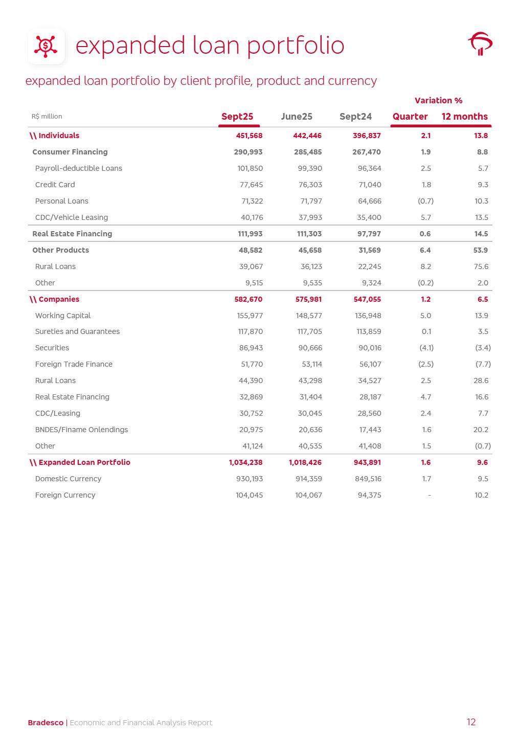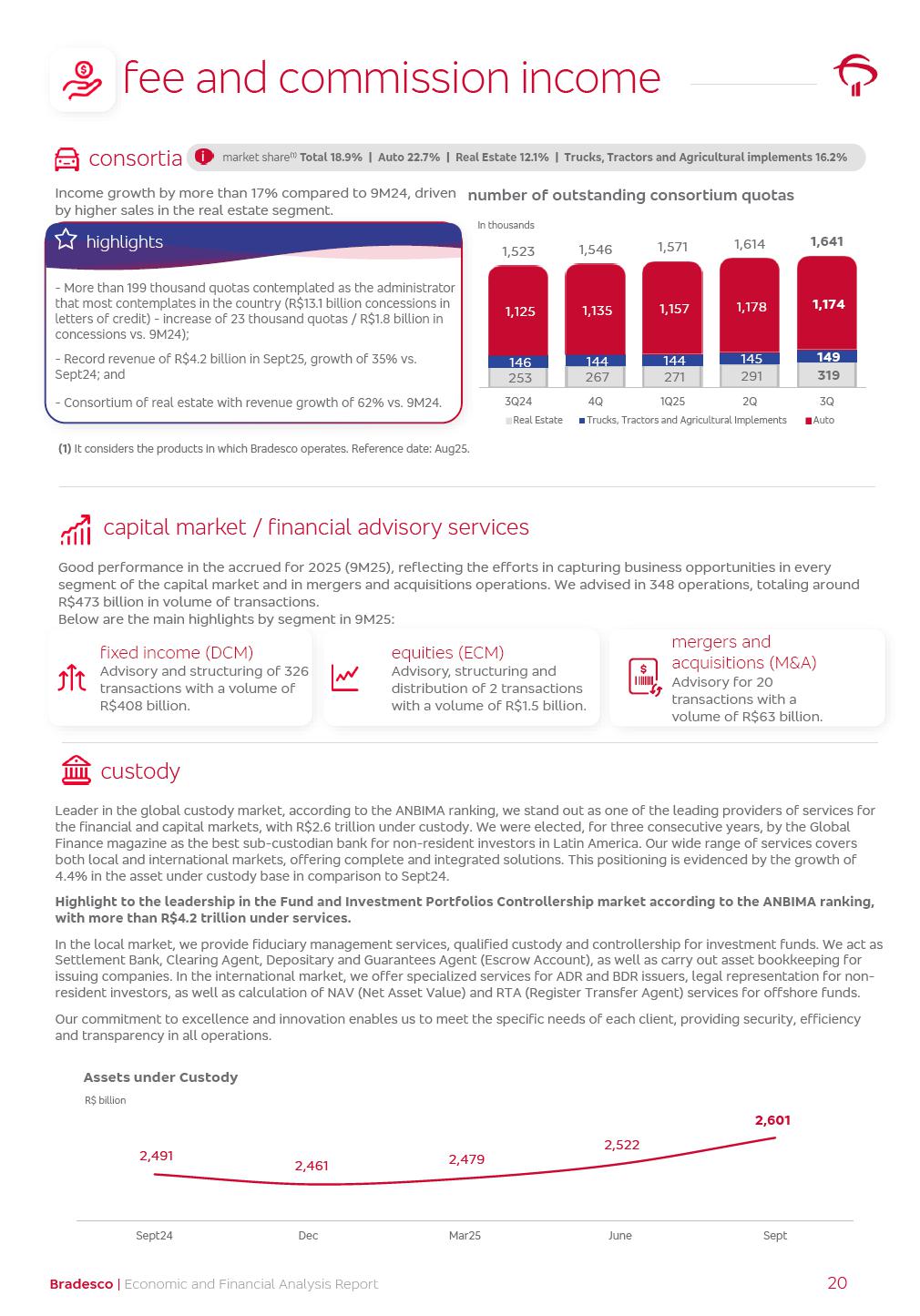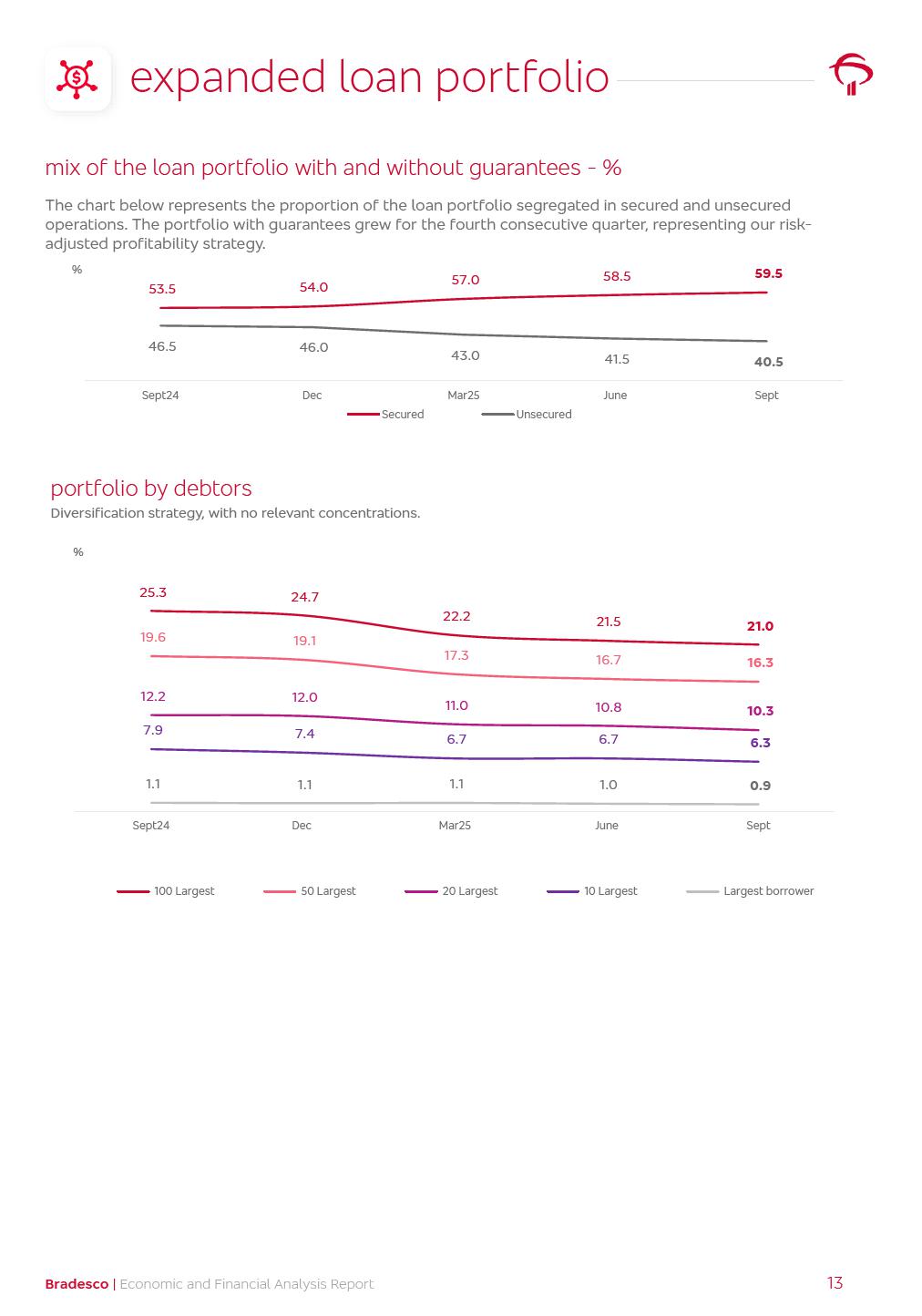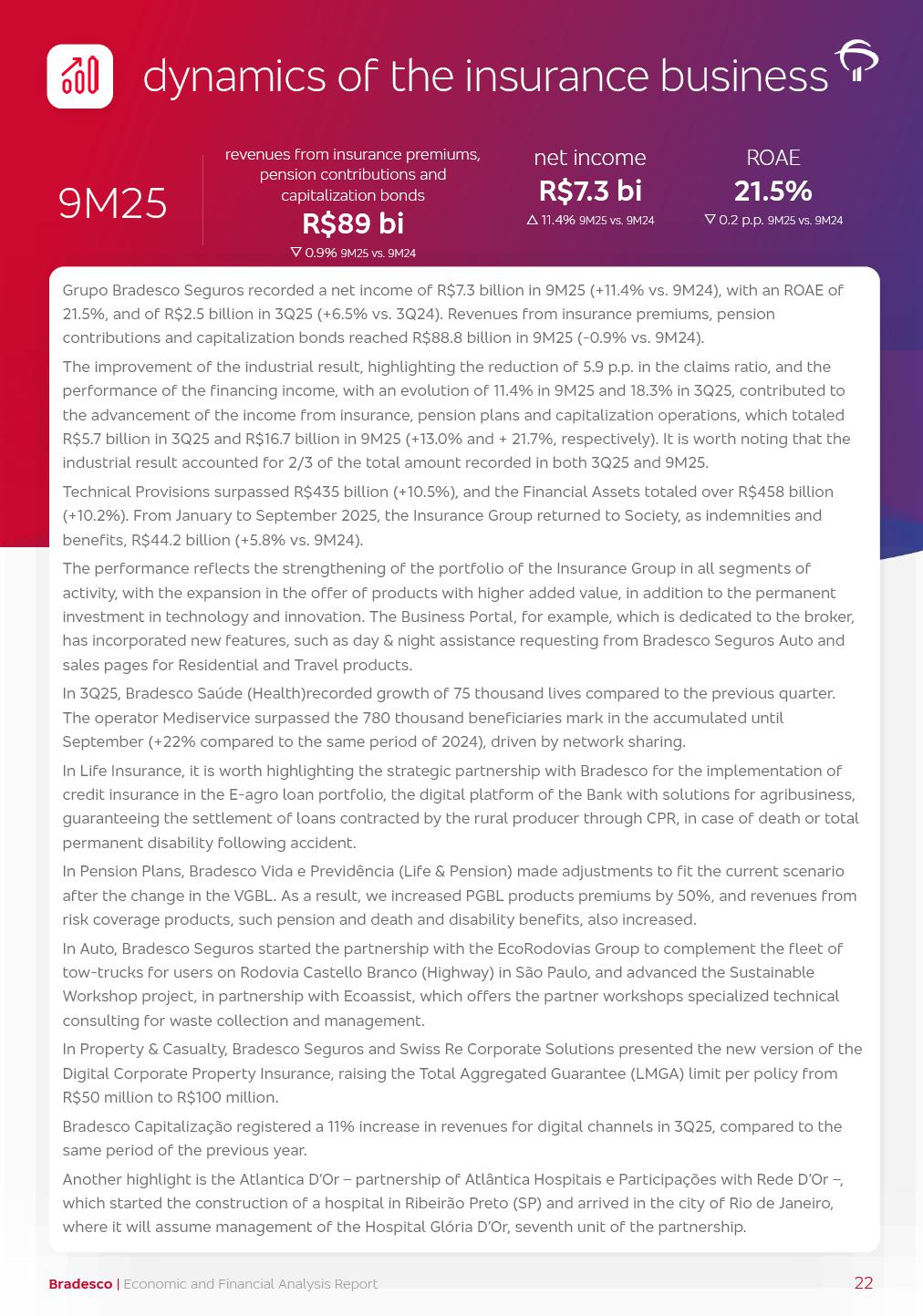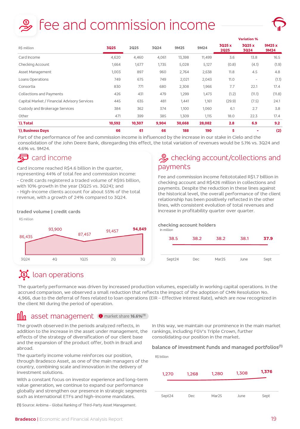 Managerial Analysis of Results Bradesco | Economic and Financial Analysis Report 6 press release Bradesco is undergoing a transformation, fueling a continued positive performance. In the third quarter of the year, we took another step in boosting our profitability. We continue with the same commercial traction, while keeping delinquency indicators under control, prioritizing risk-adjusted returns. The transformation is advancing, supporting our evolution and enhancing our long-term competitiveness. Recurring net income was R$6.2 billion in 3Q25, an increase of 2.3% q/q and 18.8% y/y. As a result, ROAE topped 14.7% in the quarter. Total revenue reached R$35.0 billion in the quarter, increasing by 3.0% q/q and 13.1% y/y, driven by an expressive performance across all lines: net interest income, fee and commission income and income from insurance. The NII reached R$18.7 billion in the quarter, up by 3.7% q/q and 16.9% y/y. Client NII totaled R$18.6 billion, up by 4.8% q/q and 19.0% y/y, mainly driven by the increase in the loan portfolio and the average spread, which improved from 8.8% in 2Q25 to 9.0% in 3Q25, benefiting from higher efficiency in funding. Market NII was R$99 million in 3Q25, decreasing from the previous quarter, as expected. The expanded loan portfolio grew by 9.6% y/y and 1.6% q/q in Sept25, driven by the MSME and Individual segments. It is worth highlighting the increase in the share of secured credit lines, which went from 58.5% in Jun25 to 59.5% in Sept25. In terms of MSME, products such as receivables discounting and working capital loans (FGI and FGO - government-backed guarantee funds) stand out, and for Individuals, in payroll-deductible loans, rural loans, and high-income credit card lines. In September 2025, the delinquency ratio (over 90 days NPL) remained stable at 4.1%. Delinquency in MSME posted an improvement of 0.6 p.p. q/q, reflecting the quality of recent vintages, while Individuals loan indicator was impacted by the higher level of delays in John Deere Bank operations, which are collateralized and subject to a distinct recovery timeline. The cost of credit increased slightly, from 3.2% in 2Q25 to 3.3% in 3Q25, reflecting an increase of provisions for specific wholesale cases and John Deere Bank. We highlight the decrease of R$1.8 billion in the restructured portfolio against the previous quarter and of R$8.2 billion in the annual comparison. The quality of our credit portfolio showed improvement, being that stage 1 loan participation rose 30 bps while stage 3 fell 20 bps, resulting from better originations and the sequential cleanup of problematic assets. Fee and commission income increased by 2.8% q/q and 6.9% y/y. The positive standouts over the quarter included fees from consortia, cards, loan operations and asset management. Once again, the operational performance of insurance activities was significant, with income from insurance operations reaching of R$5.7 billion (1.0% q/q and 13.0% y/y) and net income of R$2.5 billion (10.3% q/q and 6.5% y/y). The ROAE of the insurance company was 22.4% in 3Q25. Operating expenses increased by 3.7% q/q and 9.6% y/y, in line with expectations. This growth rate largely reflects the investments being made in the bank and its affiliates. Analyzing only personnel and administrative expenses, there was a 5.5% y/y growth in 3Q25, which shrinks to 2.5% when we exclude the profit-sharing expenses, below inflation of 5.2% for the period, underlining the strong cost-control measures currently in place within the Organization. With that, we maintained our efficiency ratio stable at about 50% for the quarter and in 12 months. Tier 1 capital ratio remained at 13.4% and the common equity ratio was 11.4% this quarter. Even with the growth of the portfolio, our capital continues to be robust, within the regulatory and management limits. We allocated R$3.8 billion in interest on shareholders’ equity in 3Q25. We are continuing to carry out our transformation plan. In 3Q25, we continued to accelerate footprint adjustments and make changes in the way we serve our clients. We opened 34 new offices in our new Principal segment, intensified the operations of our banking correspondents, and continued to enhance our new Companies & Business App with more features and rising user adoption. We are making the new cash management system available to more companies. In terms of personnel, the cultural evolution program continues to be implemented. The plan will continue to be executed in an accelerated manner. As an important part of our strategic agenda, we remain committed to sustainable business financing and supporting our clients in the transition to a greener and inclusive economy, maintaining the portfolio's decarbonization strategy and keeping a close eye on risks and opportunities. At the end of September 2025, we achieved 100% of our target to allocate up to R$350 billion by year-end to sectors and activities with socio-environmental benefits. The following information details our performance in 3Q25, including results, balance sheet and key performance indicators. enjoy the reading! Bradesco | Economic and Financial Analysis Report 7 highlights 3Q25 consolidated recurring net income R$6.2 bi △ 2.3% q/q △ 18.8% y/y ROAE 3Q25 14.7% △ 0.1 p.p. q/q △ 2.3 p.p. y/y main data selected expanded loan portfolio total revenue R$35.0 bi (1) △ 3.0% q/q △ 13.1% y/y total net interest income △ 3.7% q/q △ 16.9% y/y R$1,034 bi △ 1.6% q/q △ 9.6% y/y fee and commission income △ 2.8% q/q △ 6.9% y/y individuals R$451.6 bi △ 2.1% q/q △ 13.8% y/y insurance, pension plans and capitalization bonds △ 1.0% q/q △ 13.0% y/y companies R$582.7 bi △ 1.2% q/q △ 6.5% y/y cost of risk R$8.6 bi △ 5.1% q/q △ 20.1% y/y MSME △ 4.6% q/q △ 24.8% y/y Large Corporates ▽ 1.2% q/q ▽ 3.5% y/y loan indicators over 90 days ratio 4.1% stable q/q ▽ 0.1 p.p. y/y personnel + administrative expenses (2) R$12.9 bi △ 3.3% q/q △ 5.5