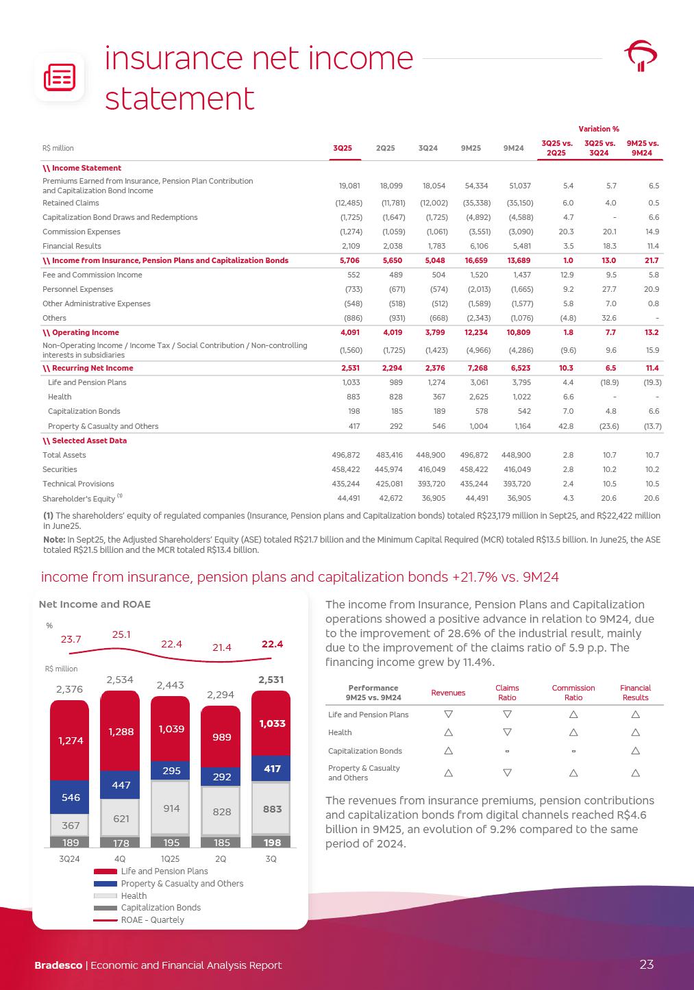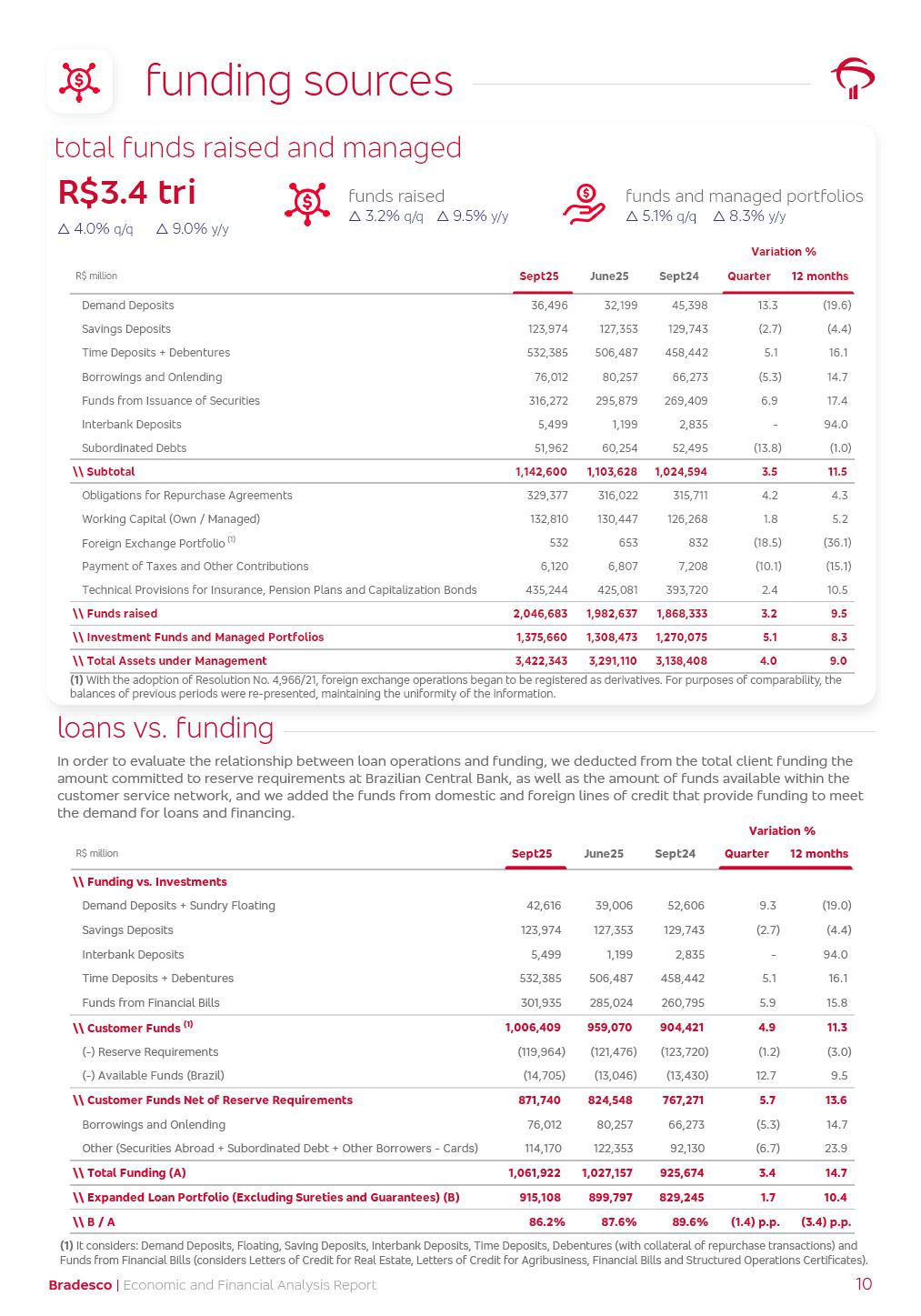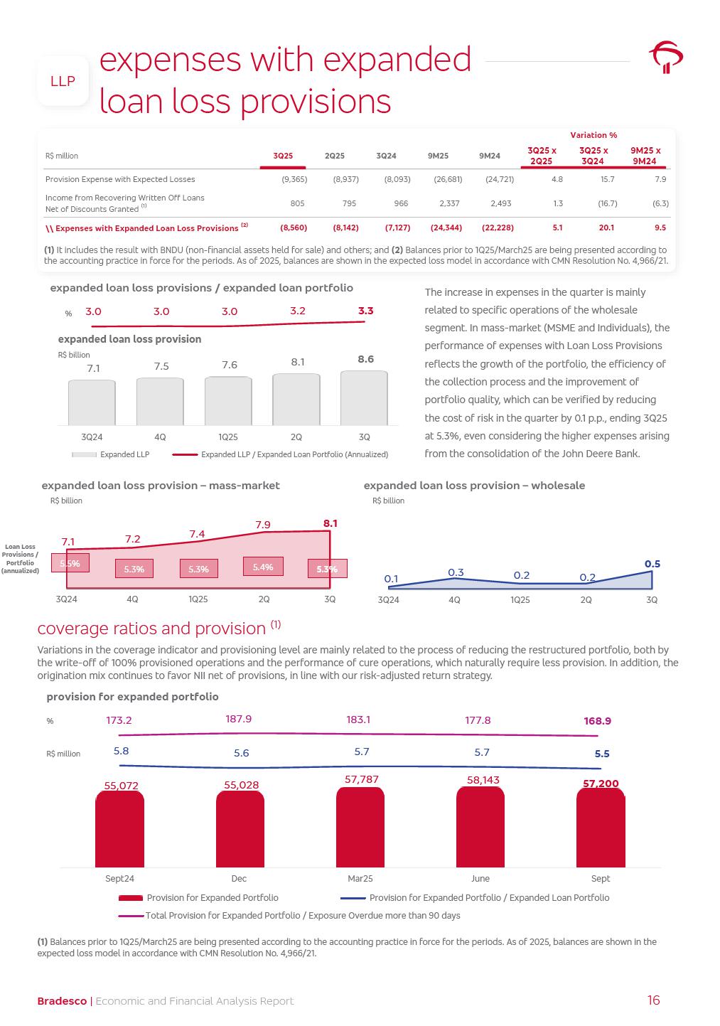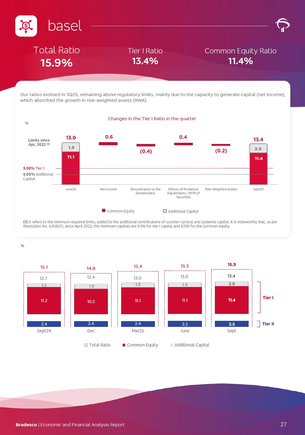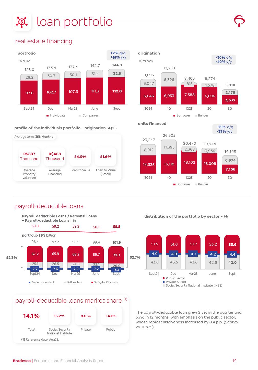 Managerial Analysis of Results Bradesco | Economic and Financial Analysis Report 6 press release Bradesco is undergoing a transformation, fueling a continued positive performance. In the third quarter of the year, we took another step in boosting our profitability. We continue with the same commercial traction, while keeping delinquency indicators under control, prioritizing risk-adjusted returns. The transformation is advancing, supporting our evolution and enhancing our long-term competitiveness. Recurring net income was R$6.2 billion in 3Q25, an increase of 2.3% q/q and 18.8% y/y. As a result, ROAE topped 14.7% in the quarter. Total revenue reached R$35.0 billion in the quarter, increasing by 3.0% q/q and 13.1% y/y, driven by an expressive performance across all lines: net interest income, fee and commission income and income from insurance. The NII reached R$18.7 billion in the quarter, up by 3.7% q/q and 16.9% y/y. Client NII totaled R$18.6 billion, up by 4.8% q/q and 19.0% y/y, mainly driven by the increase in the loan portfolio and the average spread, which improved from 8.8% in 2Q25 to 9.0% in 3Q25, benefiting from higher efficiency in funding. Market NII was R$99 million in 3Q25, decreasing from the previous quarter, as expected. The expanded loan portfolio grew by 9.6% y/y and 1.6% q/q in Sept25, driven by the MSME and Individual segments. It is worth highlighting the increase in the share of secured credit lines, which went from 58.5% in Jun25 to 59.5% in Sept25. In terms of MSME, products such as receivables discounting and working capital loans (FGI and FGO - government-backed guarantee funds) stand out, and for Individuals, in payroll-deductible loans, rural loans, and high-income credit card lines. In September 2025, the delinquency ratio (over 90 days NPL) remained stable at 4.1%. Delinquency in MSME posted an improvement of 0.6 p.p. q/q, reflecting the quality of recent vintages, while Individuals loan indicator was impacted by the higher level of delays in John Deere Bank operations, which are collateralized and subject to a distinct recovery timeline. The cost of credit increased slightly, from 3.2% in 2Q25 to 3.3% in 3Q25, reflecting an increase of provisions for specific wholesale cases and John Deere Bank. We highlight the decrease of R$1.8 billion in the restructured portfolio against the previous quarter and of R$8.2 billion in the annual comparison. The quality of our credit portfolio showed improvement, being that stage 1 loan participation rose 30 bps while stage 3 fell 20 bps, resulting from better originations and the sequential cleanup of problematic assets. Fee and commission income increased by 2.8% q/q and 6.9% y/y. The positive standouts over the quarter included fees from consortia, cards, loan operations and asset management. Once again, the operational performance of insurance activities was significant, with income from insurance operations reaching of R$5.7 billion (1.0% q/q and 13.0% y/y) and net income of R$2.5 billion (10.3% q/q and 6.5% y/y). The ROAE of the insurance company was 22.4% in 3Q25. Operating expenses increased by 3.7% q/q and 9.6% y/y, in line with expectations. This growth rate largely reflects the investments being made in the bank and its affiliates. Analyzing only personnel and administrative expenses, there was a 5.5% y/y growth in 3Q25, which shrinks to 2.5% when we exclude the profit-sharing expenses, below inflation of 5.2% for the period, underlining the strong cost-control measures currently in place within the Organization. With that, we maintained our efficiency ratio stable at about 50% for the quarter and in 12 months. Tier 1 capital ratio remained at 13.4% and the common equity ratio was 11.4% this quarter. Even with the growth of the portfolio, our capital continues to be robust, within the regulatory and management limits. We allocated R$3.8 billion in interest on shareholders’ equity in 3Q25. We are continuing to carry out our transformation plan. In 3Q25, we continued to accelerate footprint adjustments and make changes in the way we serve our clients. We opened 34 new offices in our new Principal segment, intensified the operations of our banking correspondents, and continued to enhance our new Companies & Business App with more features and rising user adoption. We are making the new cash management system available to more companies. In terms of personnel, the cultural evolution program continues to be implemented. The plan will continue to be executed in an accelerated manner. As an important part of our strategic agenda, we remain committed to sustainable business financing and supporting our clients in the transition to a greener and inclusive economy, maintaining the portfolio's decarbonization strategy and keeping a close eye on risks and opportunities. At the end of September 2025, we achieved 100% of our target to allocate up to R$350 billion by year-end to sectors and activities with socio-environmental benefits. The following information details our performance in 3Q25, including results, balance sheet and key performance indicators. enjoy the reading! Bradesco | Economic and Financial Analysis Report 7 highlights 3Q25 consolidated recurring net income R$6.2 bi △ 2.3% q/q △ 18.8% y/y ROAE 3Q25 14.7% △ 0.1 p.p. q/q △ 2.3 p.p. y/y main data selected expanded loan portfolio total revenue R$35.0 bi (1) △ 3.0% q/q △ 13.1% y/y total net interest income △ 3.7% q/q △ 16.9% y/y R$1,034 bi △ 1.6% q/q △ 9.6% y/y fee and commission income △ 2.8% q/q △ 6.9% y/y individuals R$451.6 bi △ 2.1% q/q △ 13.8% y/y insurance, pension plans and capitalization bonds △ 1.0% q/q △ 13.0% y/y companies R$582.7 bi △ 1.2% q/q △ 6.5% y/y cost of risk R$8.6 bi △ 5.1% q/q △ 20.1% y/y MSME △ 4.6% q/q △ 24.8% y/y Large Corporates ▽ 1.2% q/q ▽ 3.5% y/y loan indicators over 90 days ratio 4.1% stable q/q ▽ 0.1 p.p. y/y personnel + administrative expenses (2) R$12.9 bi △ 3.3% q/q △ 5.5