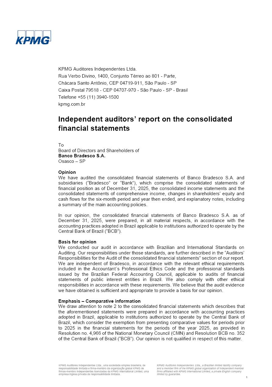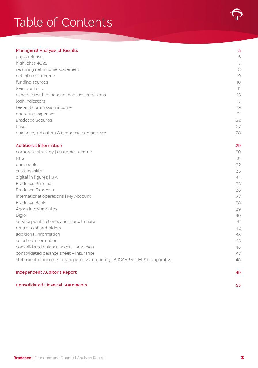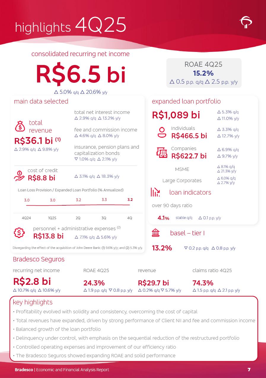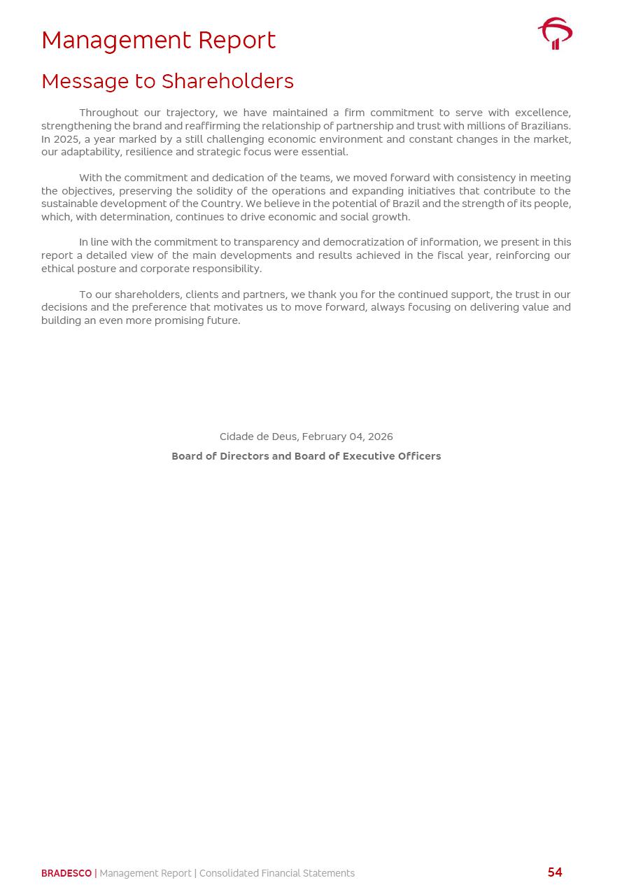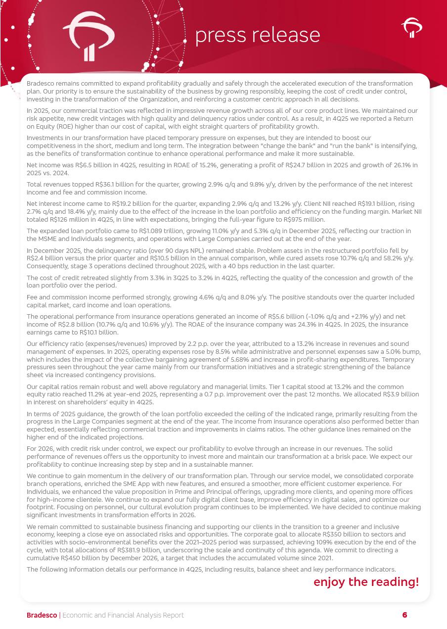 click on the items below to navigate through the document: 4Q 25 managerial analysis of results management report consolidated financial statements videoconference commenting on the results February 6th at 8:30 AM (US Eastern Time) economic and financial analysis reportBradesco | Economic and Financial Analysis Report 3 Table of Contents Managerial Analysis of Results 5 press release 6 highlights 4Q25 7 recurring net income statement 8 net interest income 9 funding sources 10 loan portfolio 11 expenses with expanded loan loss provisions 16 loan indicators 17 fee and commission income 19 operating expenses 21 Bradesco Seguros 22 basel 27 guidance, indicators & economic perspectives 28 Additional Information 29 corporate strategy | customer-centric 30 NPS 31 our people 32 sustainability 33 digital in figures | BIA 34 Bradesco Principal 35 Bradesco Expresso 36 international operations | My Account 37 Bradesco Bank 38 Ágora Investimentos 39 Digio 40 service points, clients and market share 41 return to shareholders 42 additional information 43 selected information 45 consolidated balance sheet – Bradesco 46 consolidated balance sheet – Insurance 47 statement of income – managerial vs. recurring | BRGAAP vs. IFRS comparative 48 Independent Auditor’s Report 49 Consolidated Financial Statements 53 Bradesco | Economic and Financial Analysis Report 4 Some numbers included in this Report have been subjected to rounding adjustments. As a result, some amounts indicated as total amounts in some charts may not be the arithmetic sum of the preceding numbers. Percentage variations not presented in the framework of this report, are related, in their majority, to the low value balances compared with the other periods presented. As of January 2025, we adopted in our Financial Statements the new accounting practices established by CMN Resolutions No. 4,966 and No. 4,975. For management purposes, we kept the information of the previous periods as already disclosed, which do not present relevant differences in the historical analysis of the results. For some credit indicators, when mentioned, we carry out historical data for comparability purposes on a pro-forma basis. In our financial statements the Organization opted for the exemption provided by the Standard not to resubmit comparative information from previous periods resulting from the changes. Managerial Analysis of Results Bradesco | Economic and Financial Analysis Report 6 press release Bradesco remains committed to expand profitability gradually and safely through the accelerated execution of the transformation plan. Our priority is to ensure the sustainability of the business by growing responsibly, keeping the cost of credit under control, investing in the transformation of the Organization, and reinforcing a customer centric approach in all decisions. In 2025, our commercial traction was reflected in impressive revenue growth across all of our core product lines. We maintained our risk appetite, new credit vintages with high quality and delinquency ratios under control. As a result, in 4Q25 we reported a Return on Equity (ROE) higher than our cost of capital, with eight straight quarters of profitability growth. Investments in our transformation have placed temporary pressure on expenses, but they are intended to boost our competitiveness in the short, medium and long term. The integration between "change the bank" and "run the bank" is intensifying, as the benefits of transformation continue to enhance operational performance and make it more sustainable. Net income was R$6.5 billion in 4Q25, resulting in ROAE of 15.2%, generating a profit of R$24.7 billion in 2025 and growth of 26.1% in 2025 vs. 2024. Total revenues topped R$36.1 billion for the quarter, growing 2.9% q/q and 9.8% y/y, driven by the performance of the net interest income and fee and commission income. Net interest income came to R$19.2 billion for the quarter, expanding 2.9% q/q and 13.2% y/y. Client NII reached R$19.1 billion, rising 2.7% q/q and 18.4% y/y, mainly due to the effect of the increase in the loan portfolio and efficiency on the funding margin. Market NII totaled R$126 million in 4Q25, in line with expectations, bringing the full-year figure to R$975 million. The expanded loan portfolio came to R$1.089 trillion, growing 11.0% y/y and 5.3% q/q in December 2025, reflecting our traction in the MSME and Individuals segments, and operations with Large Companies carried out at the end of the year. In December 2025, the delinquency ratio (over 90 days NPL) remained stable. Problem assets in the restructured portfolio fell by R$2.4 billion versus the prior quarter and R$10.5 billion in the annual comparison, while cured assets rose 10.7% q/q and 58.2% y/y. Consequently, stage 3 operations declined throughout 2025, with a 40 bps reduction in the last quarter. The cost of credit retreated slightly from 3.3% in 3Q25 to 3.2% in 4Q25, reflecting the quality of the concession and growth of the loan portfolio over the period. Fee and commission income performed strongly, growing 4.6% q/q and 8.0% y/y. The positive standouts over the quarter included capital market, card income and loan operations. The operational performance from insurance operations generated an income of R$5.6 billion (-1.0% q/q and +2.1% y/y) and net income of R$2.8 billion (10.7% q/q and 10.6% y/y). The ROAE of the insurance company was 24.3% in 4Q25. In 2025, the insurance earnings came to R$10.1 billion. Our efficiency ratio (expenses/revenues) improved by 2.2 p.p. over the year, attributed to a 13.2% increase in revenues and sound management of expenses. In 2025, operating expenses rose by 8.5% while administrative and personnel expenses saw a 5.0% bump, which includes the impact of the collective bargaining agreement of 5.68% and increase in profit-sharing expenditures. Temporary pressures seen throughout the year came mainly from our transformation initiatives and a strategic strengthening of the 