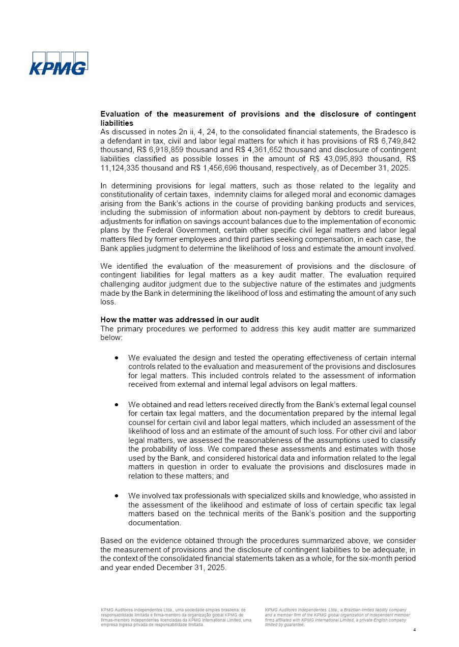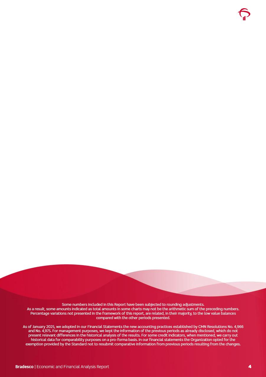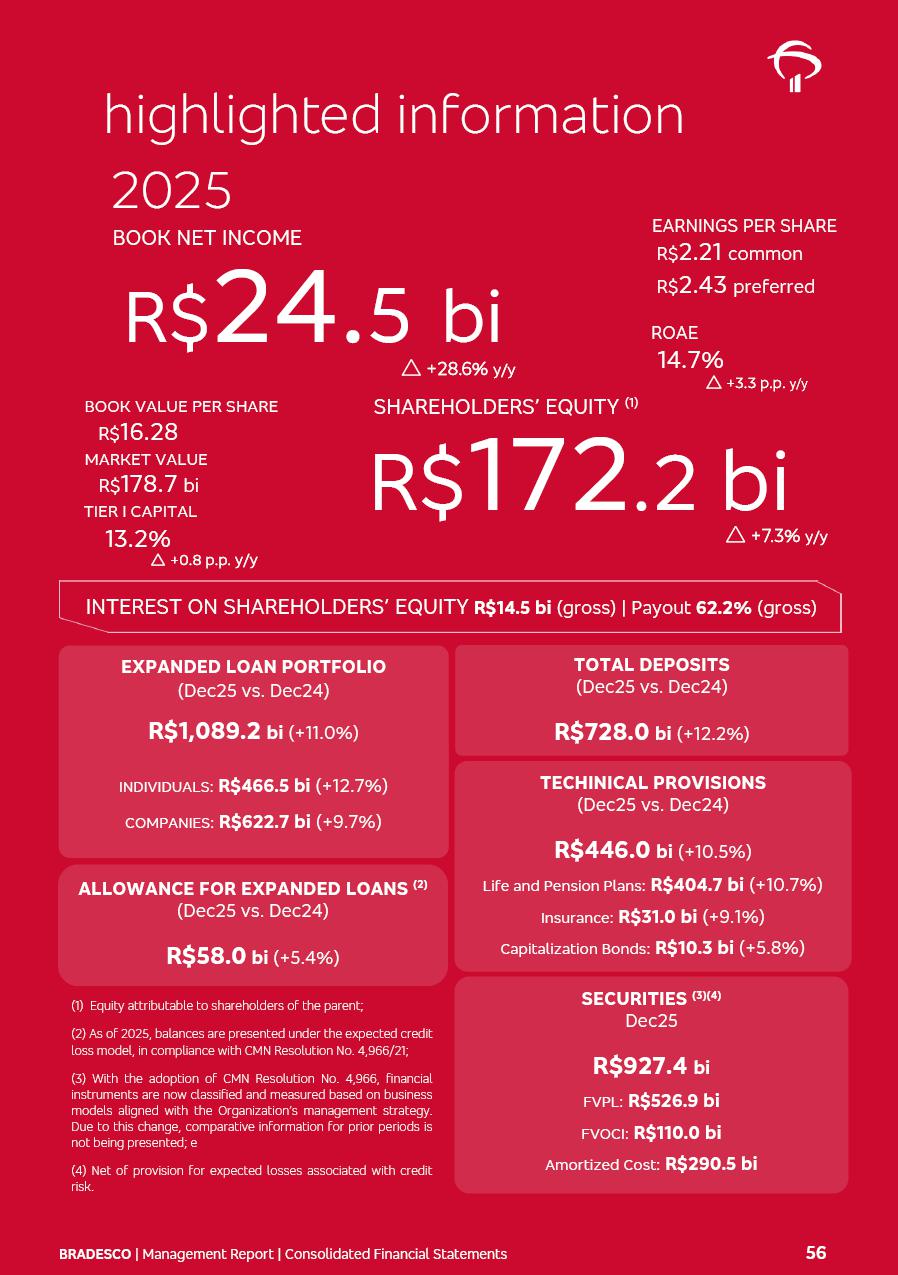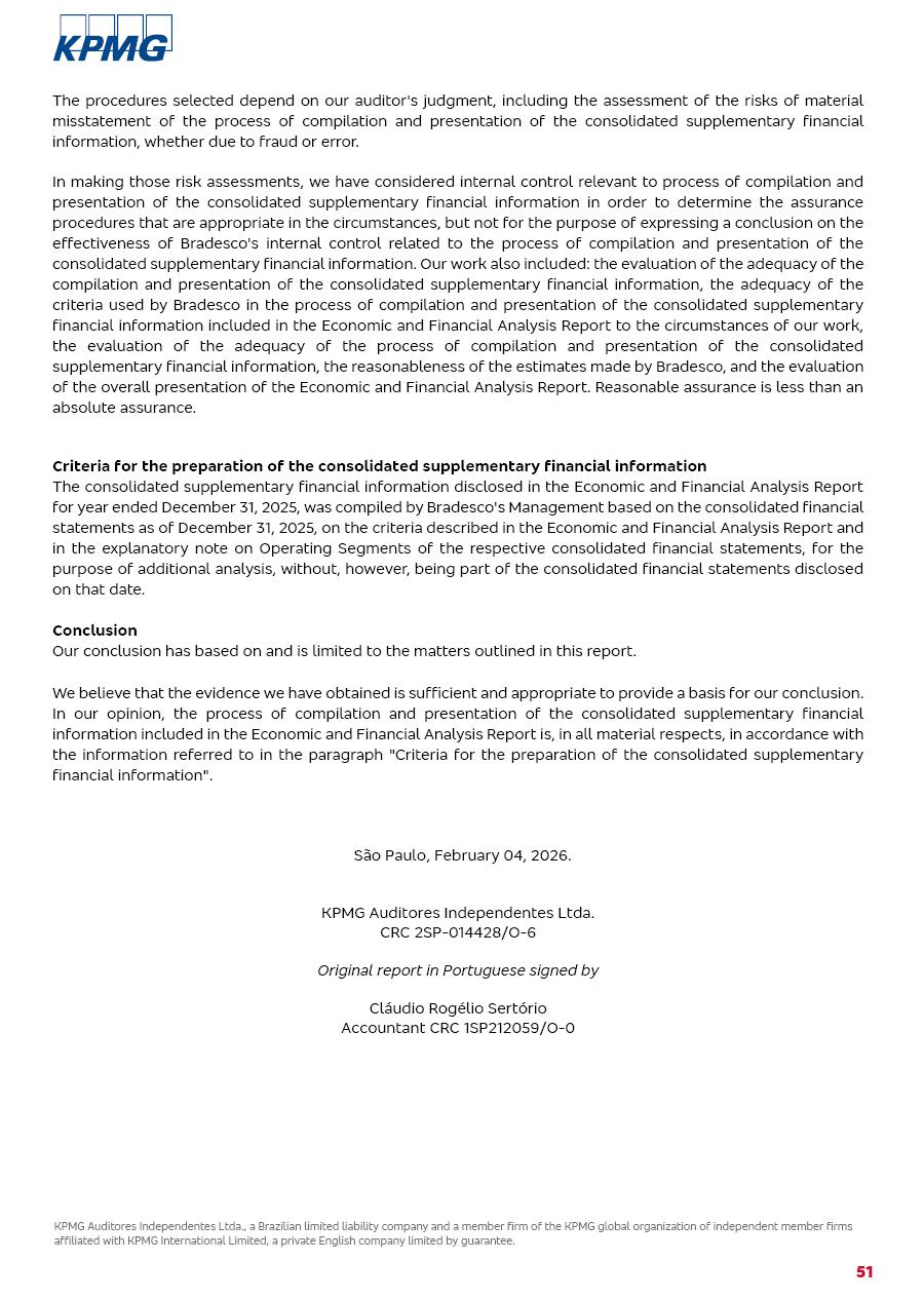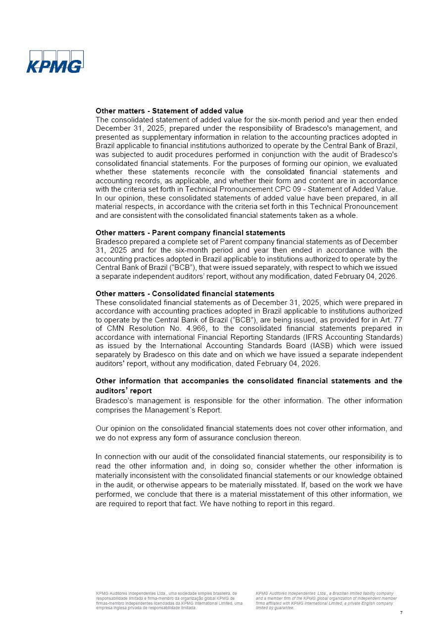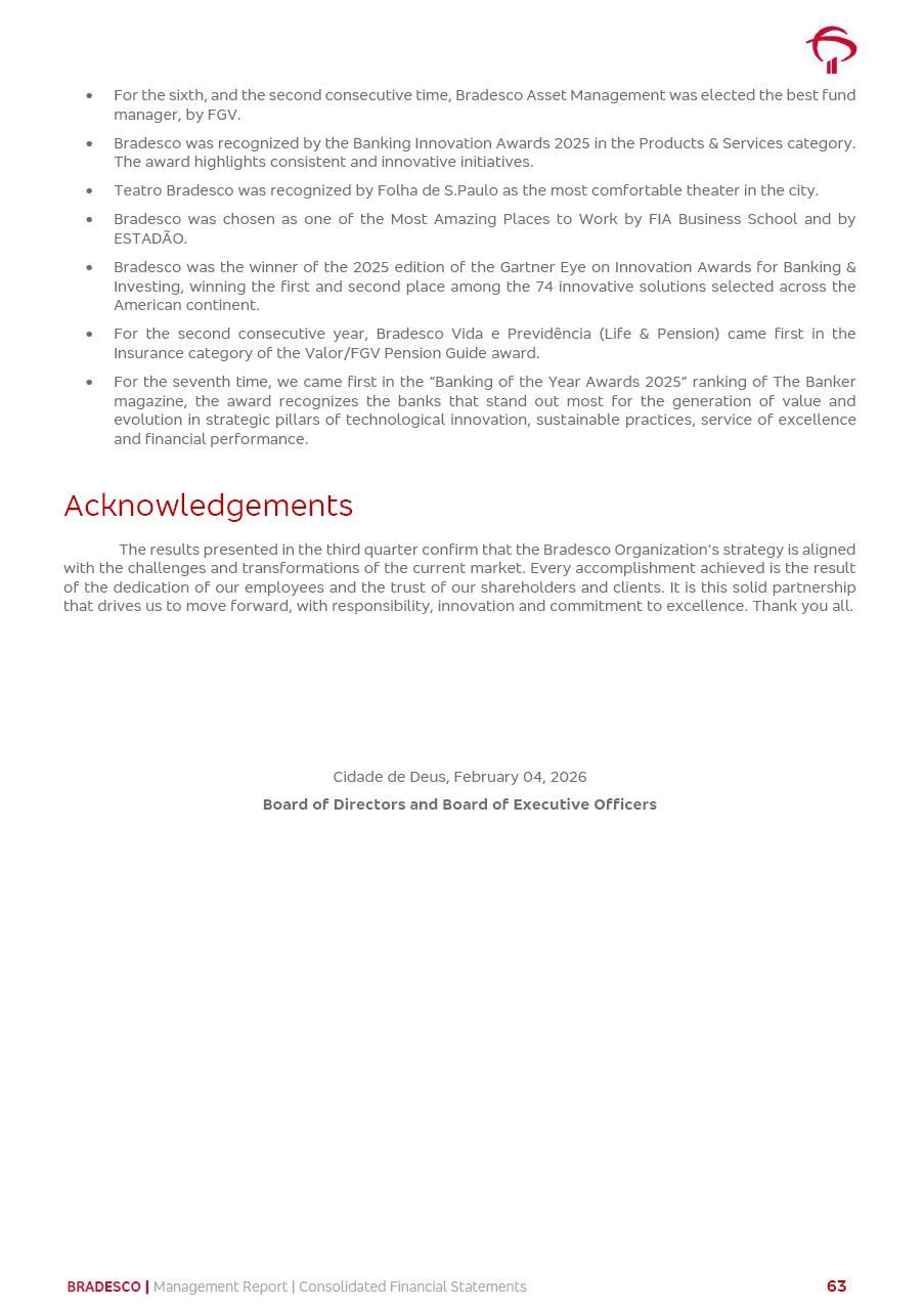click on the items below to navigate through the document: 4Q 25 managerial analysis of results management report consolidated financial statements videoconference commenting on the results February 6th at 8:30 AM (US Eastern Time) economic and financial analysis reportBradesco | Economic and Financial Analysis Report 3 Table of Contents Managerial Analysis of Results 5 press release 6 highlights 4Q25 7 recurring net income statement 8 net interest income 9 funding sources 10 loan portfolio 11 expenses with expanded loan loss provisions 16 loan indicators 17 fee and commission income 19 operating expenses 21 Bradesco Seguros 22 basel 27 guidance, indicators & economic perspectives 28 Additional Information 29 corporate strategy | customer-centric 30 NPS 31 our people 32 sustainability 33 digital in figures | BIA 34 Bradesco Principal 35 Bradesco Expresso 36 international operations | My Account 37 Bradesco Bank 38 Ágora Investimentos 39 Digio 40 service points, clients and market share 41 return to shareholders 42 additional information 43 selected information 45 consolidated balance sheet – Bradesco 46 consolidated balance sheet – Insurance 47 statement of income – managerial vs. recurring | BRGAAP vs. IFRS comparative 48 Independent Auditor’s Report 49 Consolidated Financial Statements 53 Bradesco | Economic and Financial Analysis Report 4 Some numbers included in this Report have been subjected to rounding adjustments. As a result, some amounts indicated as total amounts in some charts may not be the arithmetic sum of the preceding numbers. Percentage variations not presented in the framework of this report, are related, in their majority, to the low value balances compared with the other periods presented. As of January 2025, we adopted in our Financial Statements the new accounting practices established by CMN Resolutions No. 4,966 and No. 4,975. For management purposes, we kept the information of the previous periods as already disclosed, which do not present relevant differences in the historical analysis of the results. For some credit indicators, when mentioned, we carry out historical data for comparability purposes on a pro-forma basis. In our financial statements the Organization opted for the exemption provided by the Standard not to resubmit comparative information from previous periods resulting from the changes. Managerial Analysis of Results Bradesco | Economic and Financial Analysis Report 6 press release Bradesco remains committed to expand profitability gradually and safely through the accelerated execution of the transformation plan. Our priority is to ensure the sustainability of the business by growing responsibly, keeping the cost of credit under control, investing in the transformation of the Organization, and reinforcing a customer centric approach in all decisions. In 2025, our commercial traction was reflected in impressive revenue growth across all of our core product lines. We maintained our risk appetite, new credit vintages with high quality and delinquency ratios under control. As a result, in 4Q25 we reported a Return on Equity (ROE) higher than our cost of capital, with eight straight quarters of profitability growth. Investments in our transformation have placed temporary pressure on expenses, but they are intended to boost our competitiveness in the short, medium and long term. The integration between "change the bank" and "run the bank" is intensifying, as the benefits of transformation continue to enhance operational performance and make it more sustainable. Net income was R$6.5 billion in 4Q25, resulting in ROAE of 15.2%, generating a profit of R$24.7 billion in 2025 and growth of 26.1% in 2025 vs. 2024. Total revenues topped R$36.1 billion for the quarter, growing 2.9% q/q and 9.8% y/y, driven by the performance of the net interest income and fee and commission income. Net interest income came to R$19.2 billion for the quarter, expanding 2.9% q/q and 13.2% y/y. Client NII reached R$19.1 billion, rising 2.7% q/q and 18.4% y/y, mainly due to the effect of the increase in the loan portfolio and efficiency on the funding margin. Market NII totaled R$126 million in 4Q25, in line with expectations, bringing the full-year figure to R$975 million. The expanded loan portfolio came to R$1.089 trillion, growing 11.0% y/y and 5.3% q/q in December 2025, reflecting our traction in the MSME and Individuals segments, and operations with Large Companies carried out at the end of the year. In December 2025, the delinquency ratio (over 90 days NPL) remained stable. Problem assets in the restructured portfolio fell by R$2.4 billion versus the prior quarter and R$10.5 billion in the annual comparison, while cured assets rose 10.7% q/q and 58.2% y/y. Consequently, stage 3 operations declined throughout 2025, with a 40 bps reduction in the last quarter. The cost of credit retreated slightly from 3.3% in 3Q25 to 3.2% in 4Q25, reflecting the quality of the concession and growth of the loan portfolio over the period. Fee and commission income performed strongly, growing 4.6% q/q and 8.0% y/y. The positive standouts over the quarter included capital market, card income and loan operations. The operational performance from insurance operations generated an income of R$5.6 billion (-1.0% q/q and +2.1% y/y) and net income of R$2.8 billion (10.7% q/q and 10.6% y/y). The ROAE of the insurance company was 24.3% in 4Q25. In 2025, the insurance earnings came to R$10.1 billion. Our efficiency ratio (expenses/revenues) improved by 2.2 p.p. over the year, attributed to a 13.2% increase in revenues and sound management of expenses. In 2025, operating expenses rose by 8.5% while administrative and personnel expenses saw a 5.0% bump, which includes the impact of the collective bargaining agreement of 5.68% and increase in profit-sharing expenditures. Temporary pressures seen throughout the year came mainly from our transformation initiatives and a strategic strengthening of the 