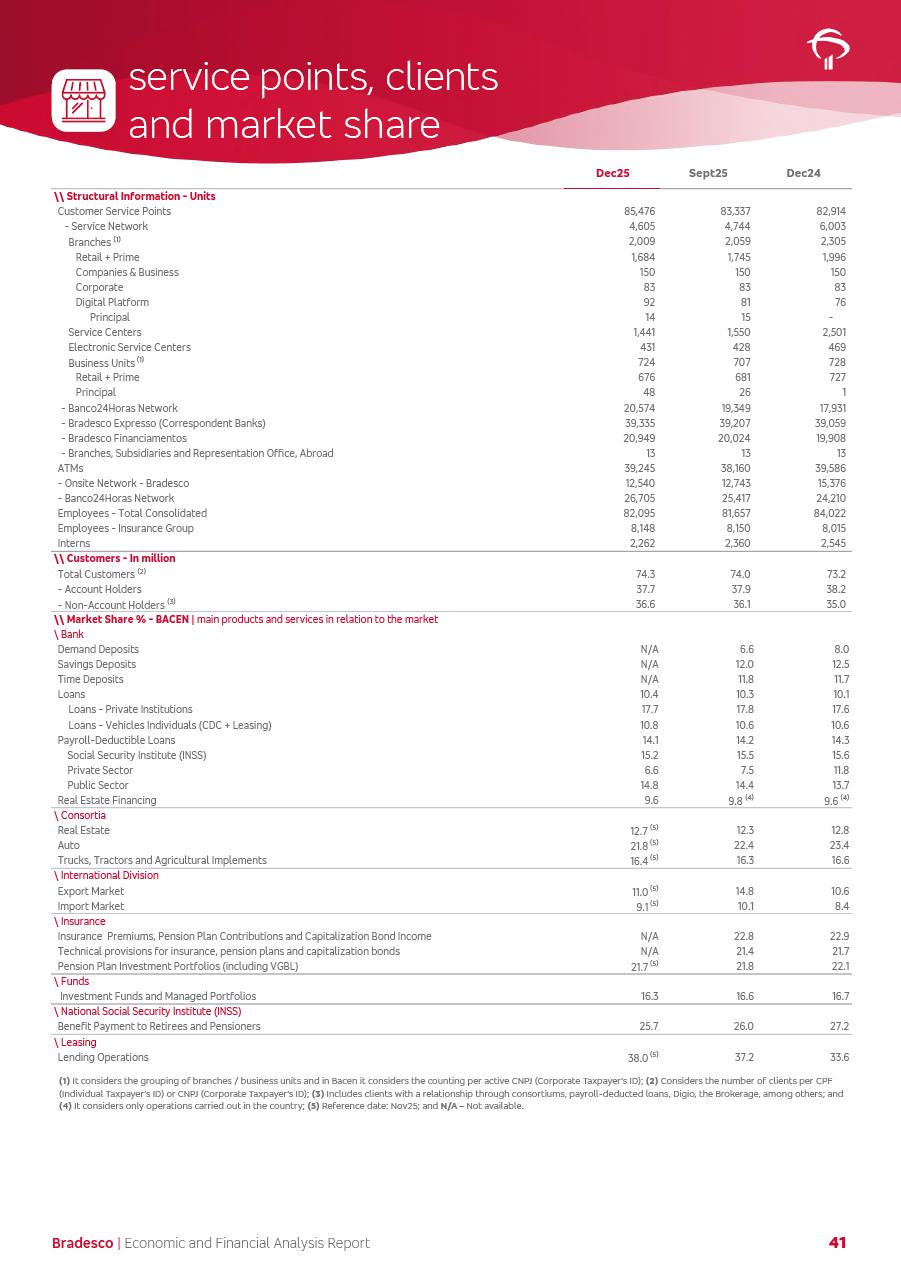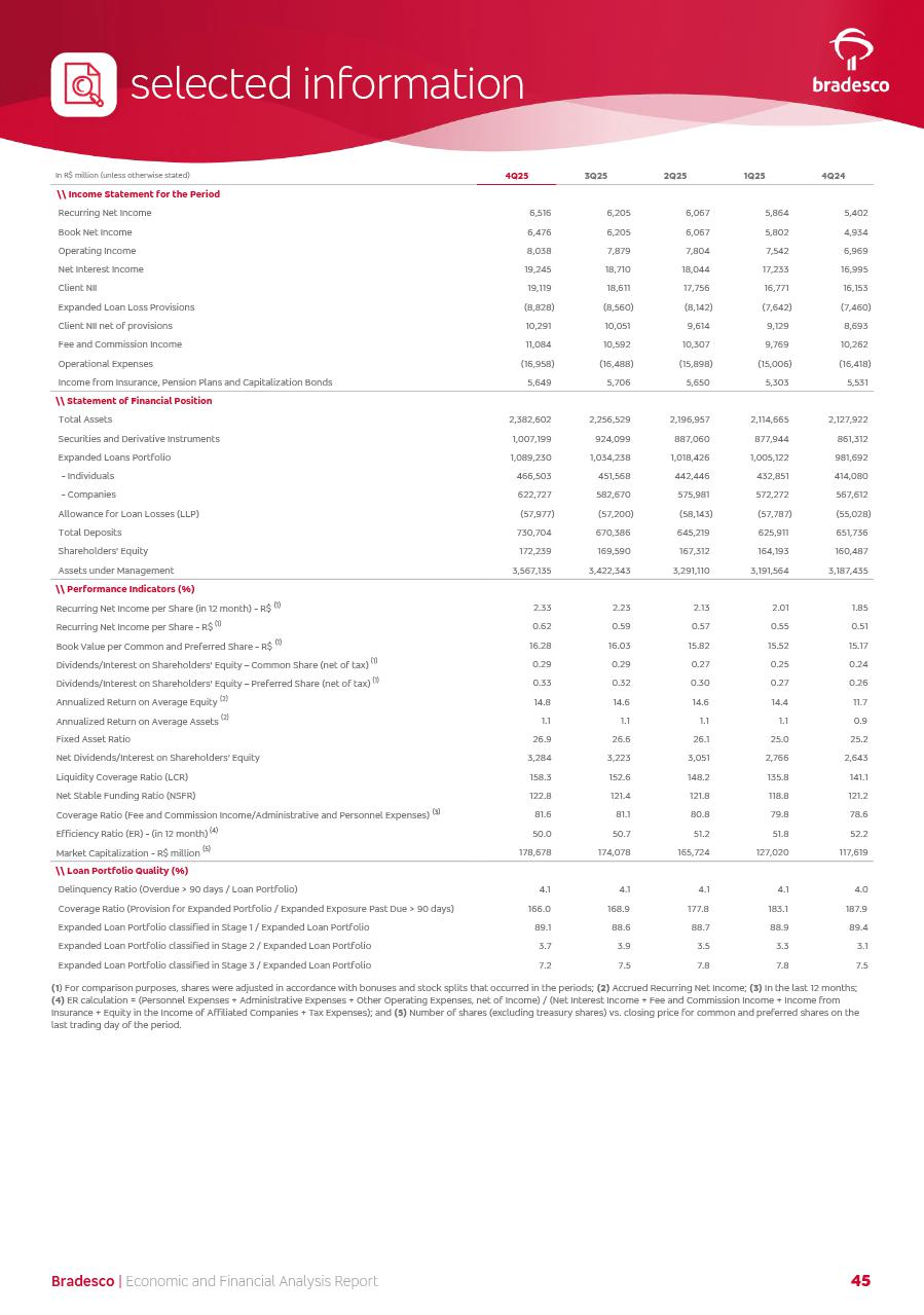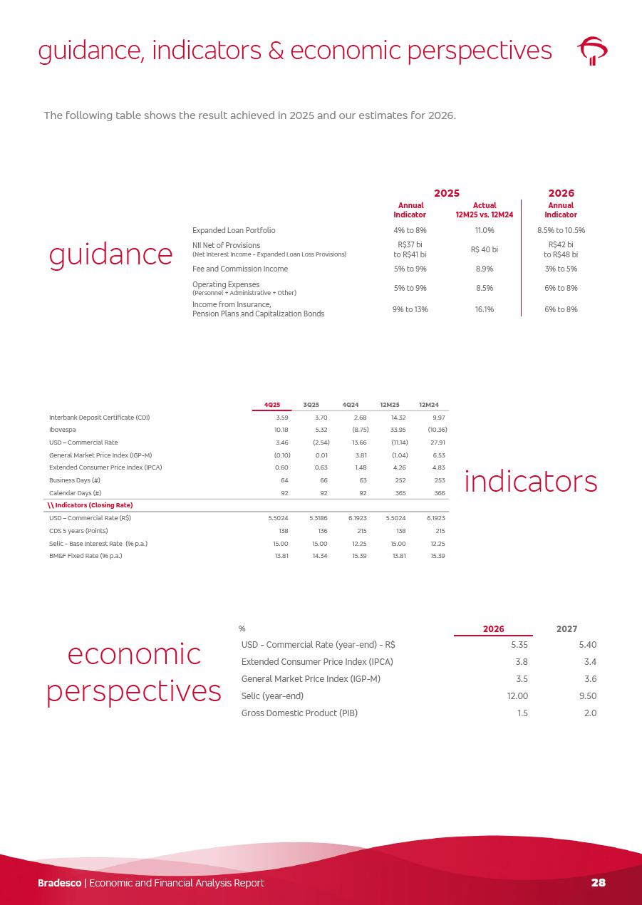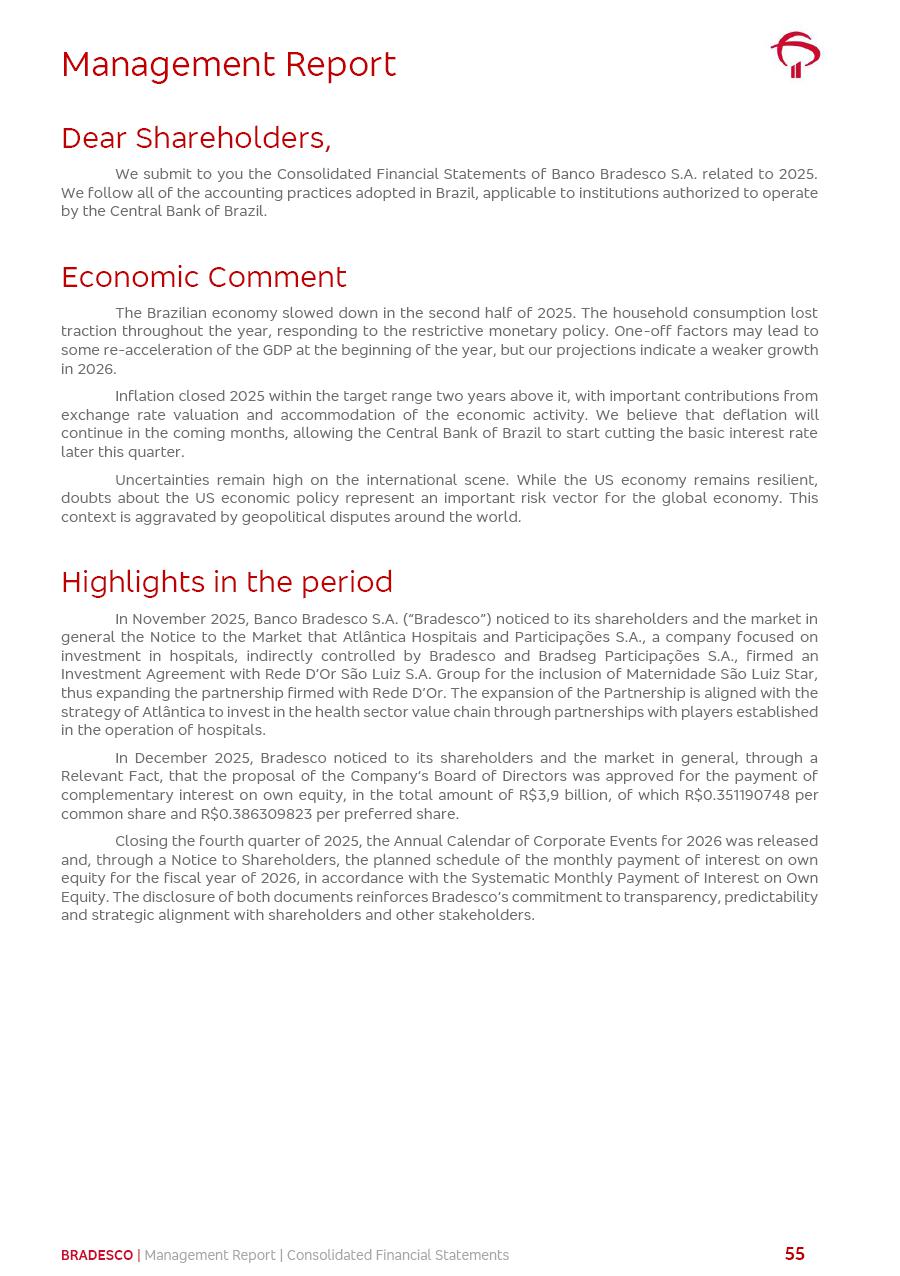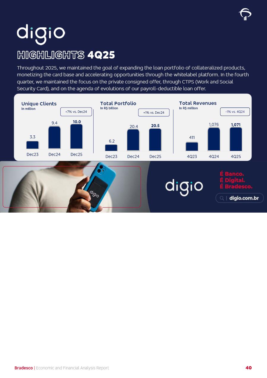 click on the items below to navigate through the document: 4Q 25 managerial analysis of results management report consolidated financial statements videoconference commenting on the results February 6th at 8:30 AM (US Eastern Time) economic and financial analysis reportBradesco | Economic and Financial Analysis Report 3 Table of Contents Managerial Analysis of Results 5 press release 6 highlights 4Q25 7 recurring net income statement 8 net interest income 9 funding sources 10 loan portfolio 11 expenses with expanded loan loss provisions 16 loan indicators 17 fee and commission income 19 operating expenses 21 Bradesco Seguros 22 basel 27 guidance, indicators & economic perspectives 28 Additional Information 29 corporate strategy | customer-centric 30 NPS 31 our people 32 sustainability 33 digital in figures | BIA 34 Bradesco Principal 35 Bradesco Expresso 36 international operations | My Account 37 Bradesco Bank 38 Ágora Investimentos 39 Digio 40 service points, clients and market share 41 return to shareholders 42 additional information 43 selected information 45 consolidated balance sheet – Bradesco 46 consolidated balance sheet – Insurance 47 statement of income – managerial vs. recurring | BRGAAP vs. IFRS comparative 48 Independent Auditor’s Report 49 Consolidated Financial Statements 53 Bradesco | Economic and Financial Analysis Report 4 Some numbers included in this Report have been subjected to rounding adjustments. As a result, some amounts indicated as total amounts in some charts may not be the arithmetic sum of the preceding numbers. Percentage variations not presented in the framework of this report, are related, in their majority, to the low value balances compared with the other periods presented. As of January 2025, we adopted in our Financial Statements the new accounting practices established by CMN Resolutions No. 4,966 and No. 4,975. For management purposes, we kept the information of the previous periods as already disclosed, which do not present relevant differences in the historical analysis of the results. For some credit indicators, when mentioned, we carry out historical data for comparability purposes on a pro-forma basis. In our financial statements the Organization opted for the exemption provided by the Standard not to resubmit comparative information from previous periods resulting from the changes. Managerial Analysis of Results Bradesco | Economic and Financial Analysis Report 6 press release Bradesco remains committed to expand profitability gradually and safely through the accelerated execution of the transformation plan. Our priority is to ensure the sustainability of the business by growing responsibly, keeping the cost of credit under control, investing in the transformation of the Organization, and reinforcing a customer centric approach in all decisions. In 2025, our commercial traction was reflected in impressive revenue growth across all of our core product lines. We maintained our risk appetite, new credit vintages with high quality and delinquency ratios under control. As a result, in 4Q25 we reported a Return on Equity (ROE) higher than our cost of capital, with eight straight quarters of profitability growth. Investments in our transformation have placed temporary pressure on expenses, but they are intended to boost our competitiveness in the short, medium and long term. The integration between "change the bank" and "run the bank" is intensifying, as the benefits of transformation continue to enhance operational performance and make it more sustainable. Net income was R$6.5 billion in 4Q25, resulting in ROAE of 15.2%, generating a profit of R$24.7 billion in 2025 and growth of 26.1% in 2025 vs. 2024. Total revenues topped R$36.1 billion for the quarter, growing 2.9% q/q and 9.8% y/y, driven by the performance of the net interest income and fee and commission income. Net interest income came to R$19.2 billion for the quarter, expanding 2.9% q/q and 13.2% y/y. Client NII reached R$19.1 billion, rising 2.7% q/q and 18.4% y/y, mainly due to the effect of the increase in the loan portfolio and efficiency on the funding margin. Market NII totaled R$126 million in 4Q25, in line with expectations, bringing the full-year figure to R$975 million. The expanded loan portfolio came to R$1.089 trillion, growing 11.0% y/y and 5.3% q/q in December 2025, reflecting our traction in the MSME and Individuals segments, and operations with Large Companies carried out at the end of the year. In December 2025, the delinquency ratio (over 90 days NPL) remained stable. Problem assets in the restructured portfolio fell by R$2.4 billion versus the prior quarter and R$10.5 billion in the annual comparison, while cured assets rose 10.7% q/q and 58.2% y/y. Consequently, stage 3 operations declined throughout 2025, with a 40 bps reduction in the last quarter. The cost of credit retreated slightly from 3.3% in 3Q25 to 3.2% in 4Q25, reflecting the quality of the concession and growth of the loan portfolio over the period. Fee and commission income performed strongly, growing 4.6% q/q and 8.0% y/y. The positive standouts over the quarter included capital market, card income and loan operations. The operational performance from insurance operations generated an income of R$5.6 billion (-1.0% q/q and +2.1% y/y) and net income of R$2.8 billion (10.7% q/q and 10.6% y/y). The ROAE of the insurance company was 24.3% in 4Q25. In 2025, the insurance earnings came to R$10.1 billion. Our efficiency ratio (expenses/revenues) improved by 2.2 p.p. over the year, attributed to a 13.2% increase in revenues and sound management of expenses. In 2025, operating expenses rose by 8.5% while administrative and personnel expenses saw a 5.0% bump, which includes the impact of the collective bargaining agreement of 5.68% and increase in profit-sharing expenditures. Temporary pressures seen throughout the year came mainly from our transformation initiatives and a strategic strengthening of the 