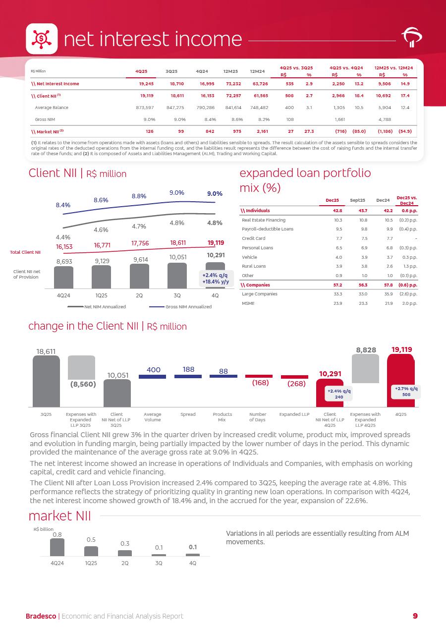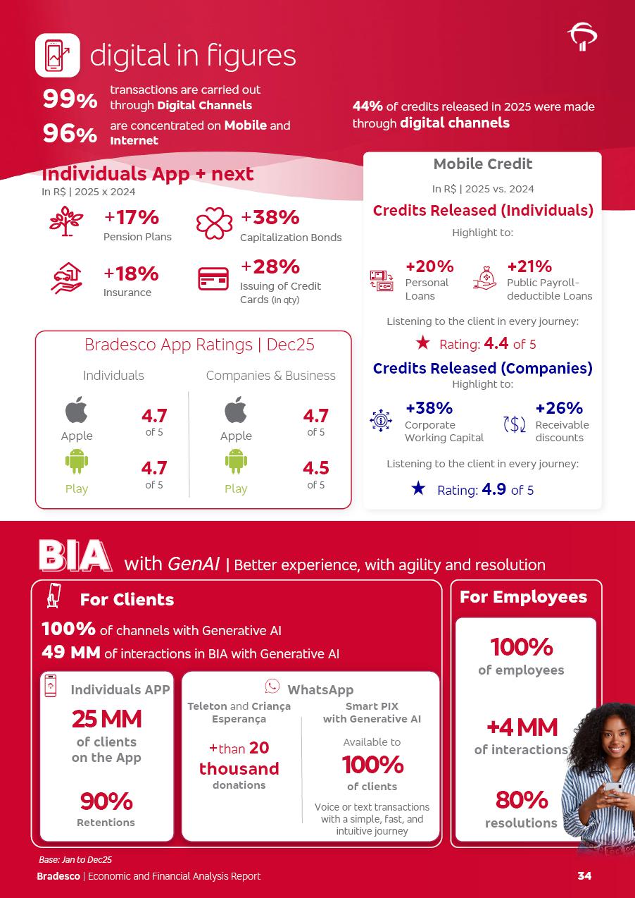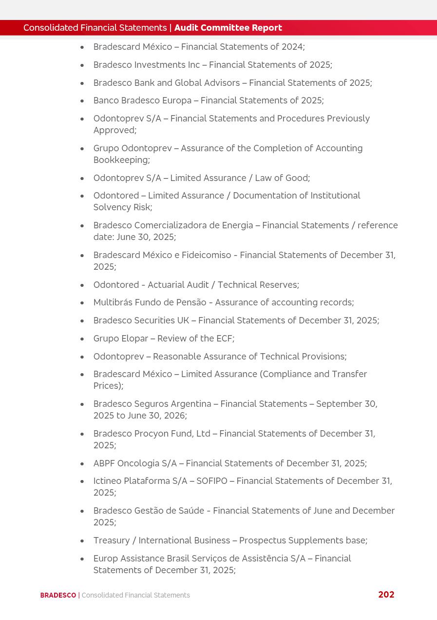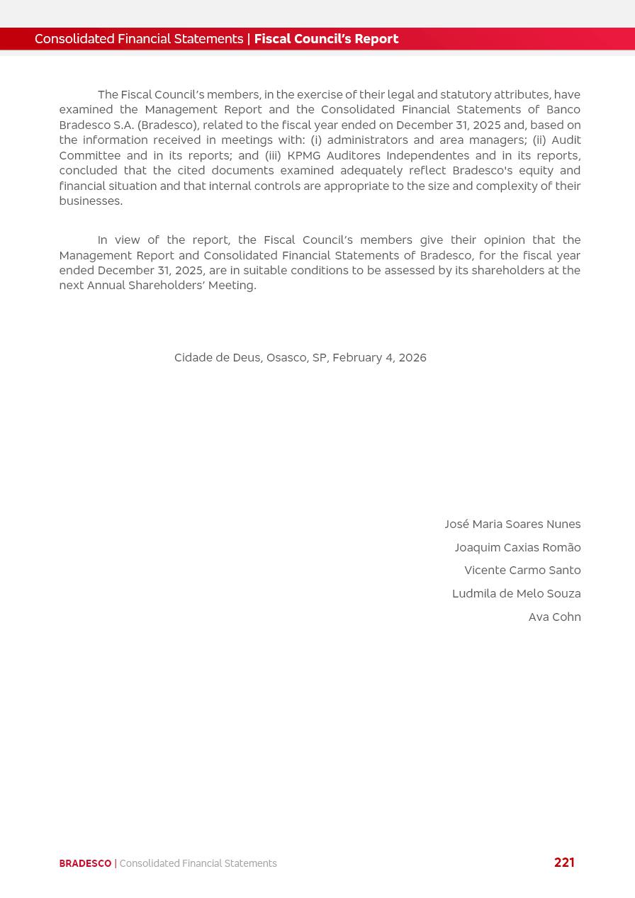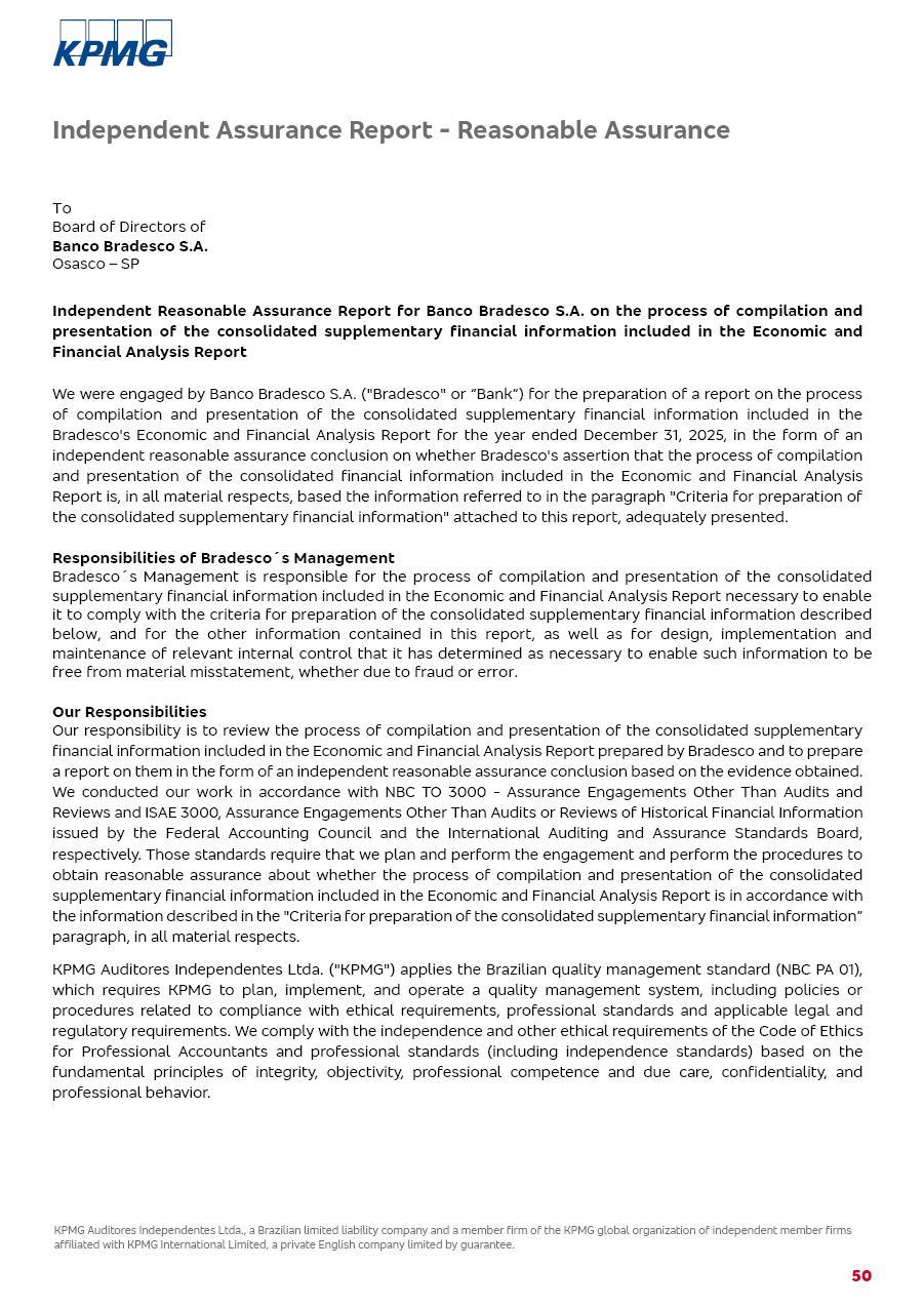 click on the items below to navigate through the document: 4Q 25 managerial analysis of results management report consolidated financial statements videoconference commenting on the results February 6th at 8:30 AM (US Eastern Time) economic and financial analysis reportBradesco | Economic and Financial Analysis Report 3 Table of Contents Managerial Analysis of Results 5 press release 6 highlights 4Q25 7 recurring net income statement 8 net interest income 9 funding sources 10 loan portfolio 11 expenses with expanded loan loss provisions 16 loan indicators 17 fee and commission income 19 operating expenses 21 Bradesco Seguros 22 basel 27 guidance, indicators & economic perspectives 28 Additional Information 29 corporate strategy | customer-centric 30 NPS 31 our people 32 sustainability 33 digital in figures | BIA 34 Bradesco Principal 35 Bradesco Expresso 36 international operations | My Account 37 Bradesco Bank 38 Ágora Investimentos 39 Digio 40 service points, clients and market share 41 return to shareholders 42 additional information 43 selected information 45 consolidated balance sheet – Bradesco 46 consolidated balance sheet – Insurance 47 statement of income – managerial vs. recurring | BRGAAP vs. IFRS comparative 48 Independent Auditor’s Report 49 Consolidated Financial Statements 53 Bradesco | Economic and Financial Analysis Report 4 Some numbers included in this Report have been subjected to rounding adjustments. As a result, some amounts indicated as total amounts in some charts may not be the arithmetic sum of the preceding numbers. Percentage variations not presented in the framework of this report, are related, in their majority, to the low value balances compared with the other periods presented. As of January 2025, we adopted in our Financial Statements the new accounting practices established by CMN Resolutions No. 4,966 and No. 4,975. For management purposes, we kept the information of the previous periods as already disclosed, which do not present relevant differences in the historical analysis of the results. For some credit indicators, when mentioned, we carry out historical data for comparability purposes on a pro-forma basis. In our financial statements the Organization opted for the exemption provided by the Standard not to resubmit comparative information from previous periods resulting from the changes. Managerial Analysis of Results Bradesco | Economic and Financial Analysis Report 6 press release Bradesco remains committed to expand profitability gradually and safely through the accelerated execution of the transformation plan. Our priority is to ensure the sustainability of the business by growing responsibly, keeping the cost of credit under control, investing in the transformation of the Organization, and reinforcing a customer centric approach in all decisions. In 2025, our commercial traction was reflected in impressive revenue growth across all of our core product lines. We maintained our risk appetite, new credit vintages with high quality and delinquency ratios under control. As a result, in 4Q25 we reported a Return on Equity (ROE) higher than our cost of capital, with eight straight quarters of profitability growth. Investments in our transformation have placed temporary pressure on expenses, but they are intended to boost our competitiveness in the short, medium and long term. The integration between "change the bank" and "run the bank" is intensifying, as the benefits of transformation continue to enhance operational performance and make it more sustainable. Net income was R$6.5 billion in 4Q25, resulting in ROAE of 15.2%, generating a profit of R$24.7 billion in 2025 and growth of 26.1% in 2025 vs. 2024. Total revenues topped R$36.1 billion for the quarter, growing 2.9% q/q and 9.8% y/y, driven by the performance of the net interest income and fee and commission income. Net interest income came to R$19.2 billion for the quarter, expanding 2.9% q/q and 13.2% y/y. Client NII reached R$19.1 billion, rising 2.7% q/q and 18.4% y/y, mainly due to the effect of the increase in the loan portfolio and efficiency on the funding margin. Market NII totaled R$126 million in 4Q25, in line with expectations, bringing the full-year figure to R$975 million. The expanded loan portfolio came to R$1.089 trillion, growing 11.0% y/y and 5.3% q/q in December 2025, reflecting our traction in the MSME and Individuals segments, and operations with Large Companies carried out at the end of the year. In December 2025, the delinquency ratio (over 90 days NPL) remained stable. Problem assets in the restructured portfolio fell by R$2.4 billion versus the prior quarter and R$10.5 billion in the annual comparison, while cured assets rose 10.7% q/q and 58.2% y/y. Consequently, stage 3 operations declined throughout 2025, with a 40 bps reduction in the last quarter. The cost of credit retreated slightly from 3.3% in 3Q25 to 3.2% in 4Q25, reflecting the quality of the concession and growth of the loan portfolio over the period. Fee and commission income performed strongly, growing 4.6% q/q and 8.0% y/y. The positive standouts over the quarter included capital market, card income and loan operations. The operational performance from insurance operations generated an income of R$5.6 billion (-1.0% q/q and +2.1% y/y) and net income of R$2.8 billion (10.7% q/q and 10.6% y/y). The ROAE of the insurance company was 24.3% in 4Q25. In 2025, the insurance earnings came to R$10.1 billion. Our efficiency ratio (expenses/revenues) improved by 2.2 p.p. over the year, attributed to a 13.2% increase in revenues and sound management of expenses. In 2025, operating expenses rose by 8.5% while administrative and personnel expenses saw a 5.0% bump, which includes the impact of the collective bargaining agreement of 5.68% and increase in profit-sharing expenditures. Temporary pressures seen throughout the year came mainly from our transformation initiatives and a strategic strengthening of the 