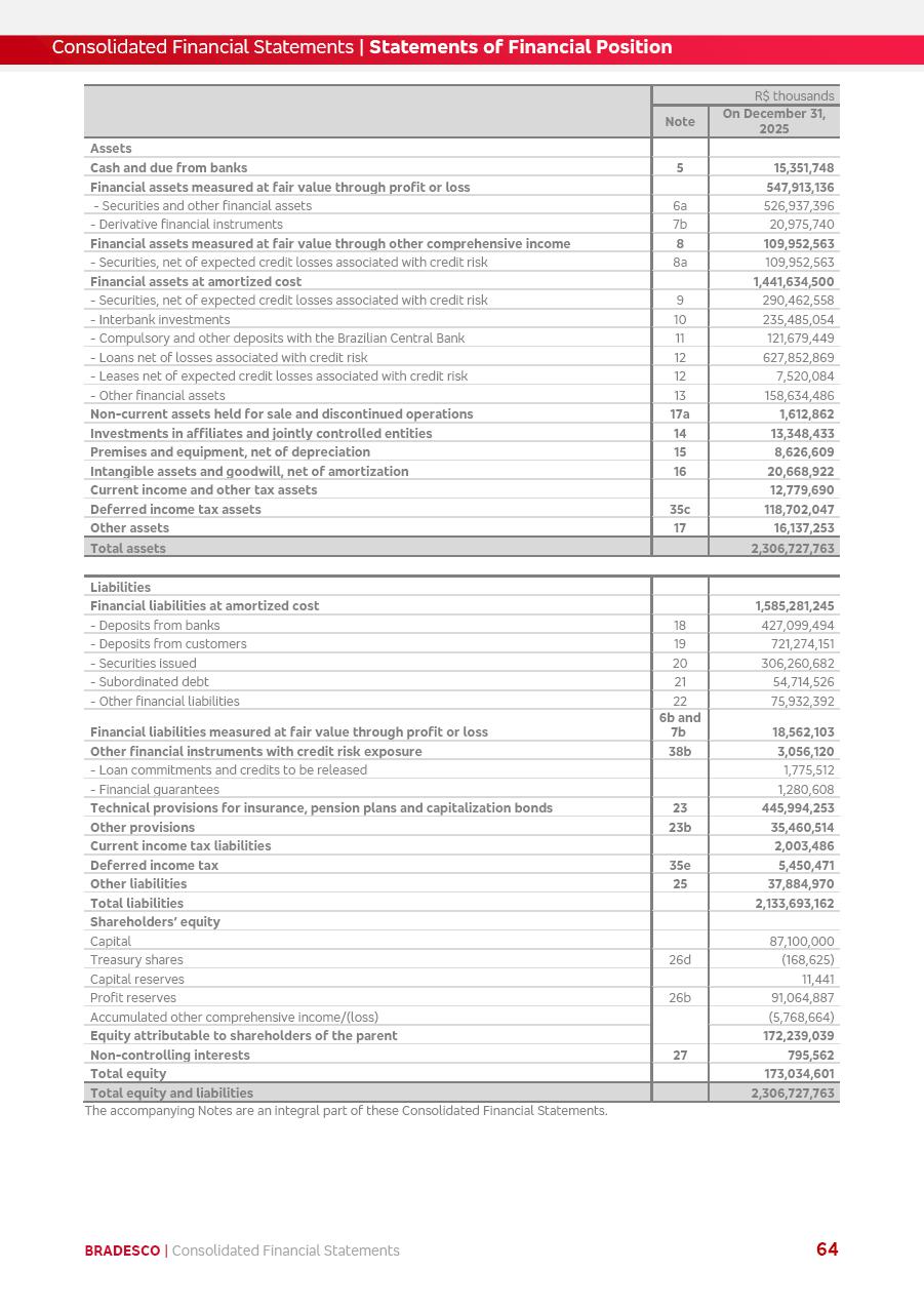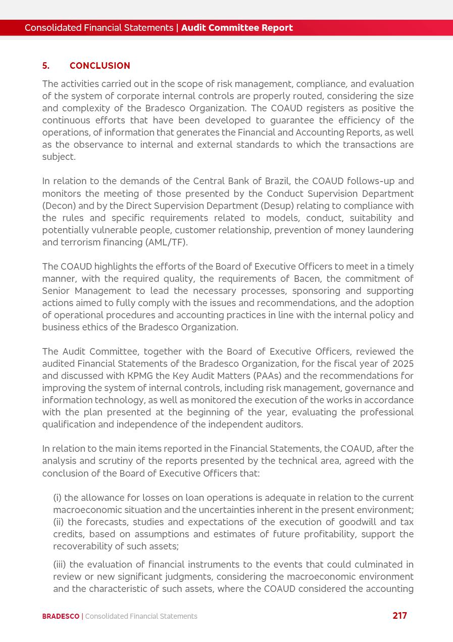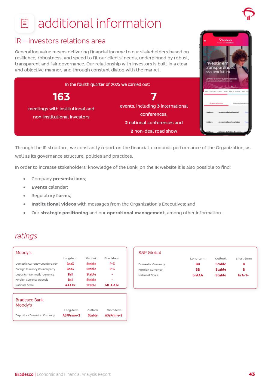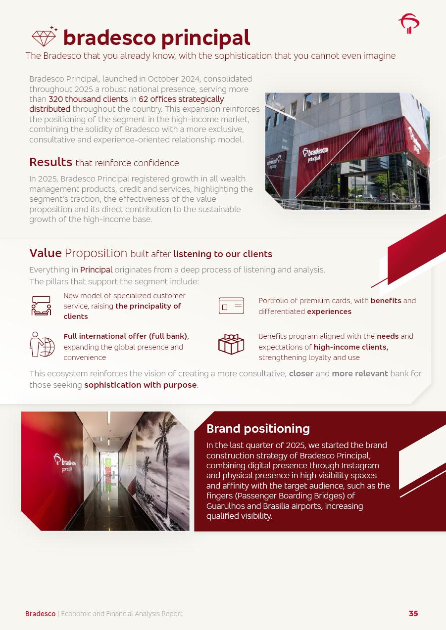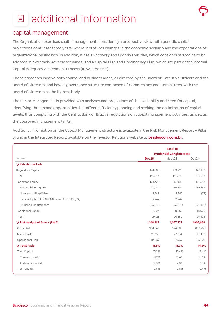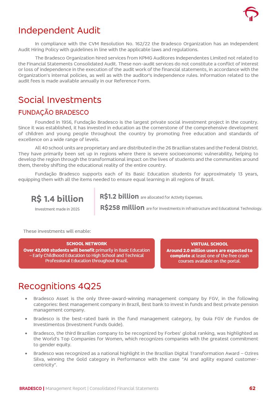 click on the items below to navigate through the document: 4Q 25 managerial analysis of results management report consolidated financial statements videoconference commenting on the results February 6th at 8:30 AM (US Eastern Time) economic and financial analysis reportBradesco | Economic and Financial Analysis Report 3 Table of Contents Managerial Analysis of Results 5 press release 6 highlights 4Q25 7 recurring net income statement 8 net interest income 9 funding sources 10 loan portfolio 11 expenses with expanded loan loss provisions 16 loan indicators 17 fee and commission income 19 operating expenses 21 Bradesco Seguros 22 basel 27 guidance, indicators & economic perspectives 28 Additional Information 29 corporate strategy | customer-centric 30 NPS 31 our people 32 sustainability 33 digital in figures | BIA 34 Bradesco Principal 35 Bradesco Expresso 36 international operations | My Account 37 Bradesco Bank 38 Ágora Investimentos 39 Digio 40 service points, clients and market share 41 return to shareholders 42 additional information 43 selected information 45 consolidated balance sheet – Bradesco 46 consolidated balance sheet – Insurance 47 statement of income – managerial vs. recurring | BRGAAP vs. IFRS comparative 48 Independent Auditor’s Report 49 Consolidated Financial Statements 53 Bradesco | Economic and Financial Analysis Report 4 Some numbers included in this Report have been subjected to rounding adjustments. As a result, some amounts indicated as total amounts in some charts may not be the arithmetic sum of the preceding numbers. Percentage variations not presented in the framework of this report, are related, in their majority, to the low value balances compared with the other periods presented. As of January 2025, we adopted in our Financial Statements the new accounting practices established by CMN Resolutions No. 4,966 and No. 4,975. For management purposes, we kept the information of the previous periods as already disclosed, which do not present relevant differences in the historical analysis of the results. For some credit indicators, when mentioned, we carry out historical data for comparability purposes on a pro-forma basis. In our financial statements the Organization opted for the exemption provided by the Standard not to resubmit comparative information from previous periods resulting from the changes. Managerial Analysis of Results Bradesco | Economic and Financial Analysis Report 6 press release Bradesco remains committed to expand profitability gradually and safely through the accelerated execution of the transformation plan. Our priority is to ensure the sustainability of the business by growing responsibly, keeping the cost of credit under control, investing in the transformation of the Organization, and reinforcing a customer centric approach in all decisions. In 2025, our commercial traction was reflected in impressive revenue growth across all of our core product lines. We maintained our risk appetite, new credit vintages with high quality and delinquency ratios under control. As a result, in 4Q25 we reported a Return on Equity (ROE) higher than our cost of capital, with eight straight quarters of profitability growth. Investments in our transformation have placed temporary pressure on expenses, but they are intended to boost our competitiveness in the short, medium and long term. The integration between "change the bank" and "run the bank" is intensifying, as the benefits of transformation continue to enhance operational performance and make it more sustainable. Net income was R$6.5 billion in 4Q25, resulting in ROAE of 15.2%, generating a profit of R$24.7 billion in 2025 and growth of 26.1% in 2025 vs. 2024. Total revenues topped R$36.1 billion for the quarter, growing 2.9% q/q and 9.8% y/y, driven by the performance of the net interest income and fee and commission income. Net interest income came to R$19.2 billion for the quarter, expanding 2.9% q/q and 13.2% y/y. Client NII reached R$19.1 billion, rising 2.7% q/q and 18.4% y/y, mainly due to the effect of the increase in the loan portfolio and efficiency on the funding margin. Market NII totaled R$126 million in 4Q25, in line with expectations, bringing the full-year figure to R$975 million. The expanded loan portfolio came to R$1.089 trillion, growing 11.0% y/y and 5.3% q/q in December 2025, reflecting our traction in the MSME and Individuals segments, and operations with Large Companies carried out at the end of the year. In December 2025, the delinquency ratio (over 90 days NPL) remained stable. Problem assets in the restructured portfolio fell by R$2.4 billion versus the prior quarter and R$10.5 billion in the annual comparison, while cured assets rose 10.7% q/q and 58.2% y/y. Consequently, stage 3 operations declined throughout 2025, with a 40 bps reduction in the last quarter. The cost of credit retreated slightly from 3.3% in 3Q25 to 3.2% in 4Q25, reflecting the quality of the concession and growth of the loan portfolio over the period. Fee and commission income performed strongly, growing 4.6% q/q and 8.0% y/y. The positive standouts over the quarter included capital market, card income and loan operations. The operational performance from insurance operations generated an income of R$5.6 billion (-1.0% q/q and +2.1% y/y) and net income of R$2.8 billion (10.7% q/q and 10.6% y/y). The ROAE of the insurance company was 24.3% in 4Q25. In 2025, the insurance earnings came to R$10.1 billion. Our efficiency ratio (expenses/revenues) improved by 2.2 p.p. over the year, attributed to a 13.2% increase in revenues and sound management of expenses. In 2025, operating expenses rose by 8.5% while administrative and personnel expenses saw a 5.0% bump, which includes the impact of the collective bargaining agreement of 5.68% and increase in profit-sharing expenditures. Temporary pressures seen throughout the year came mainly from our transformation initiatives and a strategic strengthening of the 