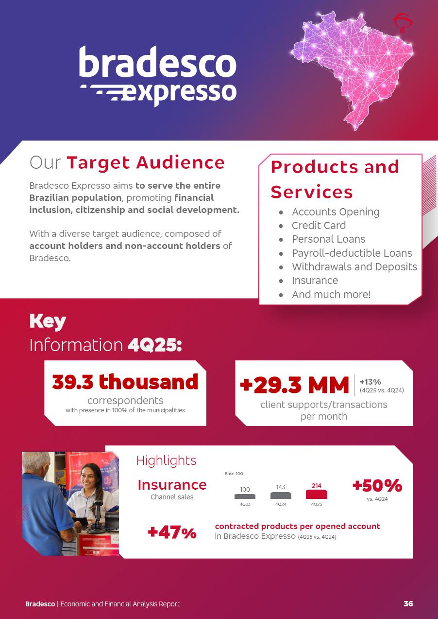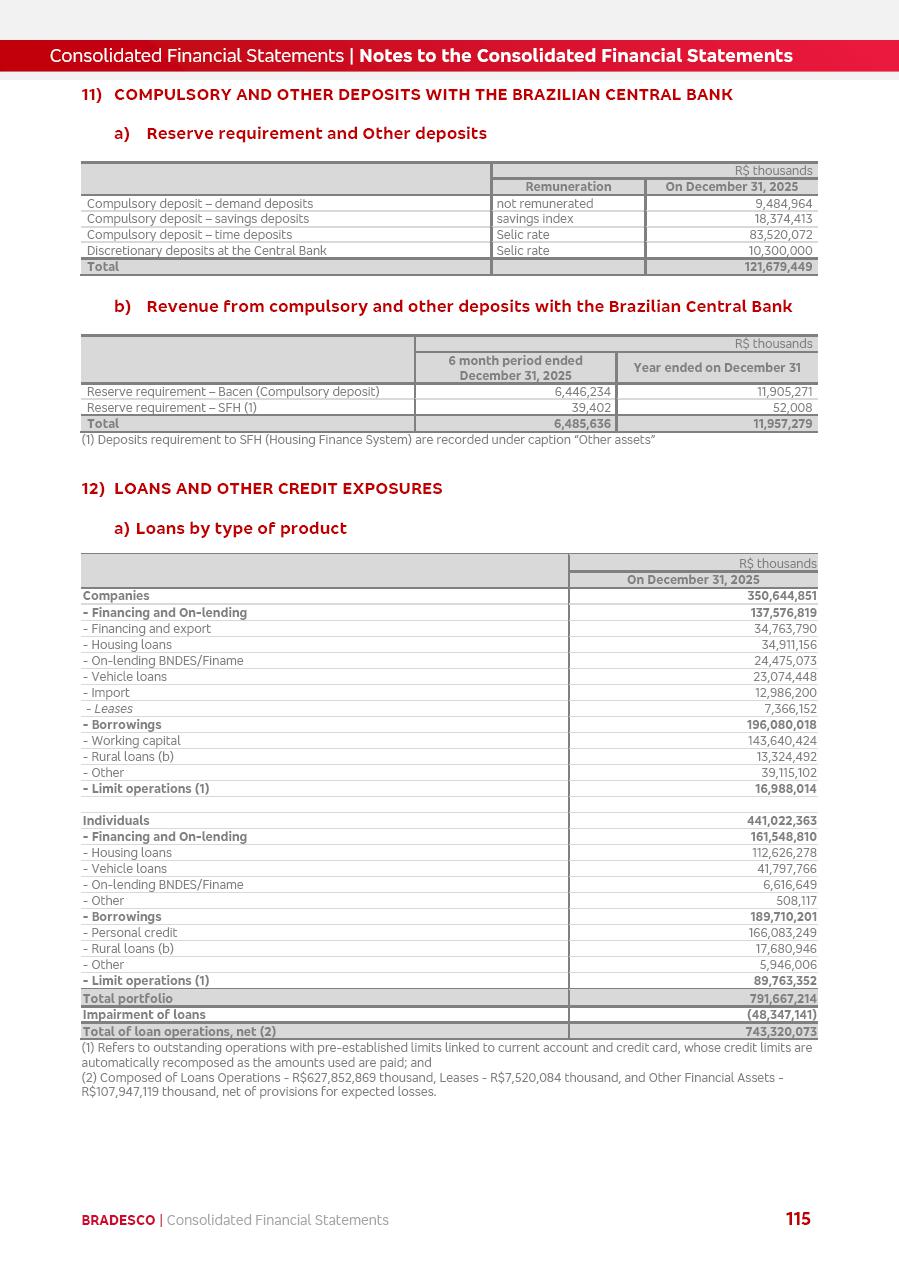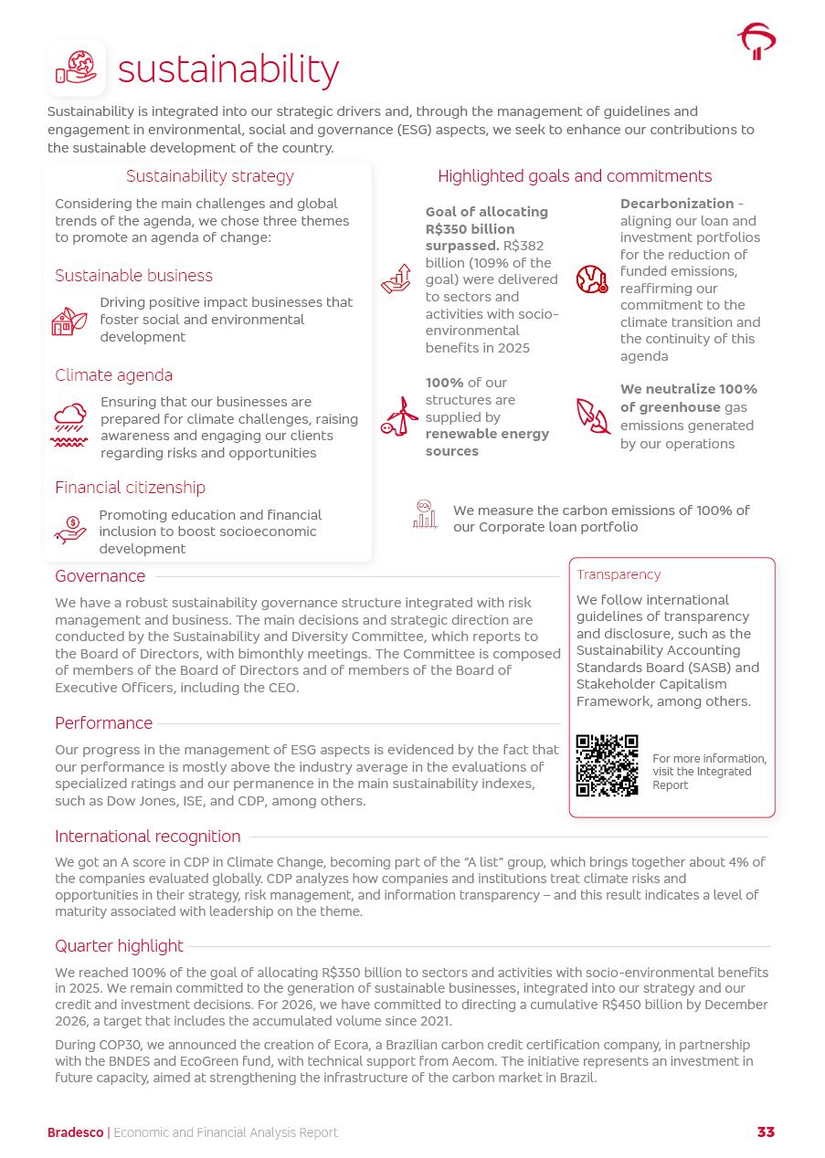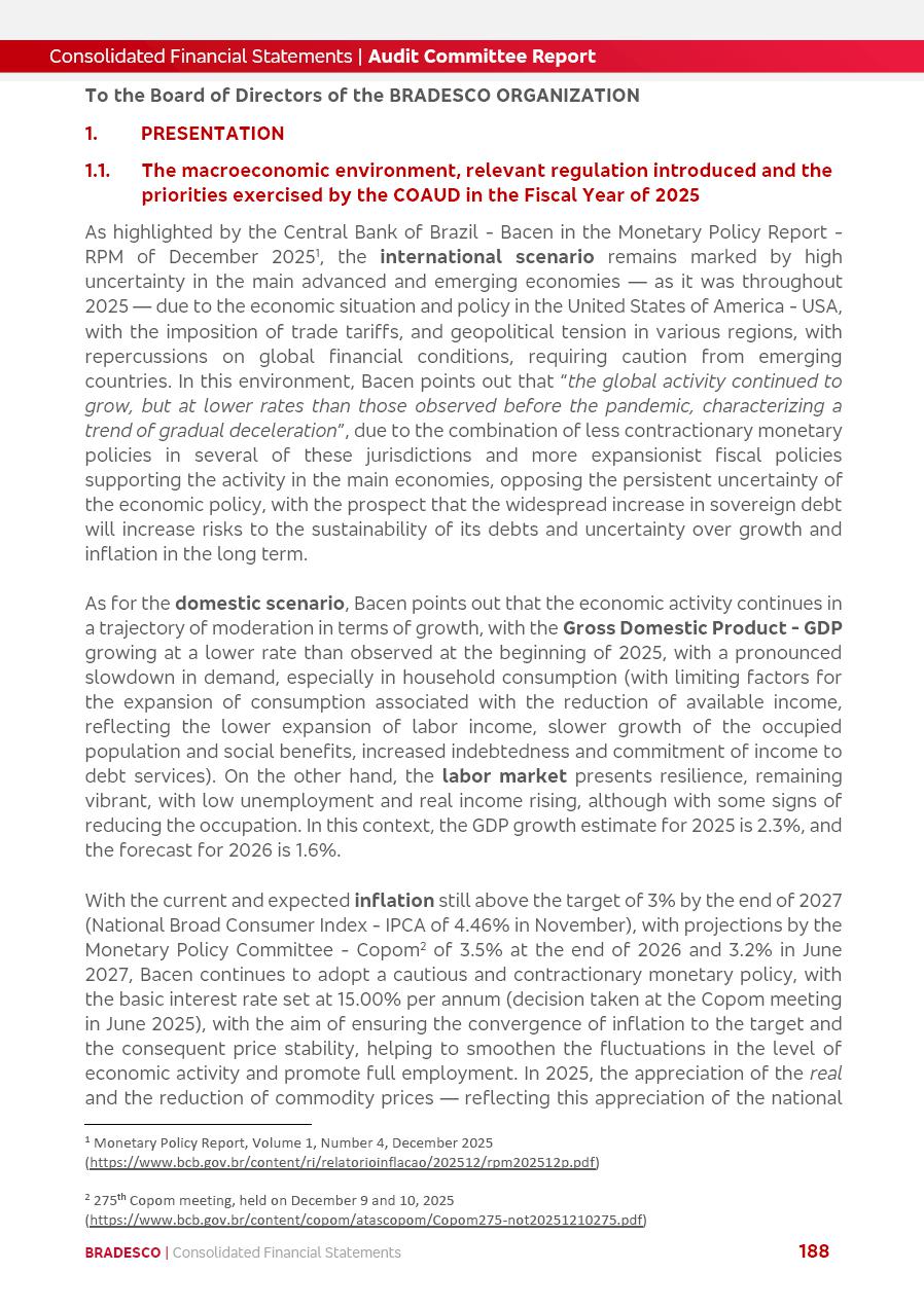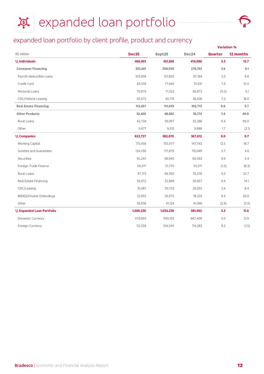 click on the items below to navigate through the document: 4Q 25 managerial analysis of results management report consolidated financial statements videoconference commenting on the results February 6th at 8:30 AM (US Eastern Time) economic and financial analysis reportBradesco | Economic and Financial Analysis Report 3 Table of Contents Managerial Analysis of Results 5 press release 6 highlights 4Q25 7 recurring net income statement 8 net interest income 9 funding sources 10 loan portfolio 11 expenses with expanded loan loss provisions 16 loan indicators 17 fee and commission income 19 operating expenses 21 Bradesco Seguros 22 basel 27 guidance, indicators & economic perspectives 28 Additional Information 29 corporate strategy | customer-centric 30 NPS 31 our people 32 sustainability 33 digital in figures | BIA 34 Bradesco Principal 35 Bradesco Expresso 36 international operations | My Account 37 Bradesco Bank 38 Ágora Investimentos 39 Digio 40 service points, clients and market share 41 return to shareholders 42 additional information 43 selected information 45 consolidated balance sheet – Bradesco 46 consolidated balance sheet – Insurance 47 statement of income – managerial vs. recurring | BRGAAP vs. IFRS comparative 48 Independent Auditor’s Report 49 Consolidated Financial Statements 53 Bradesco | Economic and Financial Analysis Report 4 Some numbers included in this Report have been subjected to rounding adjustments. As a result, some amounts indicated as total amounts in some charts may not be the arithmetic sum of the preceding numbers. Percentage variations not presented in the framework of this report, are related, in their majority, to the low value balances compared with the other periods presented. As of January 2025, we adopted in our Financial Statements the new accounting practices established by CMN Resolutions No. 4,966 and No. 4,975. For management purposes, we kept the information of the previous periods as already disclosed, which do not present relevant differences in the historical analysis of the results. For some credit indicators, when mentioned, we carry out historical data for comparability purposes on a pro-forma basis. In our financial statements the Organization opted for the exemption provided by the Standard not to resubmit comparative information from previous periods resulting from the changes. Managerial Analysis of Results Bradesco | Economic and Financial Analysis Report 6 press release Bradesco remains committed to expand profitability gradually and safely through the accelerated execution of the transformation plan. Our priority is to ensure the sustainability of the business by growing responsibly, keeping the cost of credit under control, investing in the transformation of the Organization, and reinforcing a customer centric approach in all decisions. In 2025, our commercial traction was reflected in impressive revenue growth across all of our core product lines. We maintained our risk appetite, new credit vintages with high quality and delinquency ratios under control. As a result, in 4Q25 we reported a Return on Equity (ROE) higher than our cost of capital, with eight straight quarters of profitability growth. Investments in our transformation have placed temporary pressure on expenses, but they are intended to boost our competitiveness in the short, medium and long term. The integration between "change the bank" and "run the bank" is intensifying, as the benefits of transformation continue to enhance operational performance and make it more sustainable. Net income was R$6.5 billion in 4Q25, resulting in ROAE of 15.2%, generating a profit of R$24.7 billion in 2025 and growth of 26.1% in 2025 vs. 2024. Total revenues topped R$36.1 billion for the quarter, growing 2.9% q/q and 9.8% y/y, driven by the performance of the net interest income and fee and commission income. Net interest income came to R$19.2 billion for the quarter, expanding 2.9% q/q and 13.2% y/y. Client NII reached R$19.1 billion, rising 2.7% q/q and 18.4% y/y, mainly due to the effect of the increase in the loan portfolio and efficiency on the funding margin. Market NII totaled R$126 million in 4Q25, in line with expectations, bringing the full-year figure to R$975 million. The expanded loan portfolio came to R$1.089 trillion, growing 11.0% y/y and 5.3% q/q in December 2025, reflecting our traction in the MSME and Individuals segments, and operations with Large Companies carried out at the end of the year. In December 2025, the delinquency ratio (over 90 days NPL) remained stable. Problem assets in the restructured portfolio fell by R$2.4 billion versus the prior quarter and R$10.5 billion in the annual comparison, while cured assets rose 10.7% q/q and 58.2% y/y. Consequently, stage 3 operations declined throughout 2025, with a 40 bps reduction in the last quarter. The cost of credit retreated slightly from 3.3% in 3Q25 to 3.2% in 4Q25, reflecting the quality of the concession and growth of the loan portfolio over the period. Fee and commission income performed strongly, growing 4.6% q/q and 8.0% y/y. The positive standouts over the quarter included capital market, card income and loan operations. The operational performance from insurance operations generated an income of R$5.6 billion (-1.0% q/q and +2.1% y/y) and net income of R$2.8 billion (10.7% q/q and 10.6% y/y). The ROAE of the insurance company was 24.3% in 4Q25. In 2025, the insurance earnings came to R$10.1 billion. Our efficiency ratio (expenses/revenues) improved by 2.2 p.p. over the year, attributed to a 13.2% increase in revenues and sound management of expenses. In 2025, operating expenses rose by 8.5% while administrative and personnel expenses saw a 5.0% bump, which includes the impact of the collective bargaining agreement of 5.68% and increase in profit-sharing expenditures. Temporary pressures seen throughout the year came mainly from our transformation initiatives and a strategic strengthening of the 