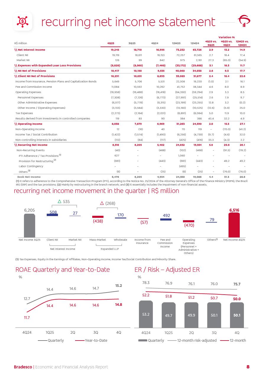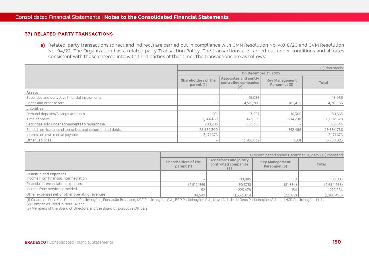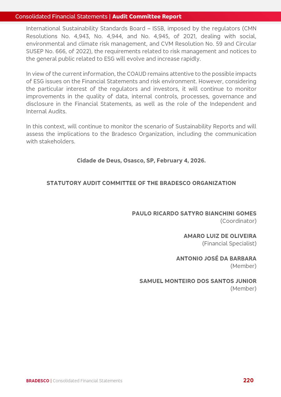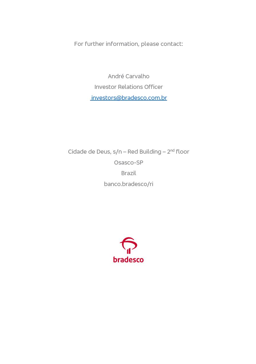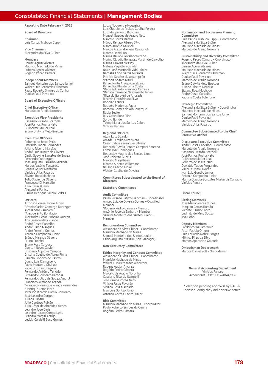 click on the items below to navigate through the document: 4Q 25 managerial analysis of results management report consolidated financial statements videoconference commenting on the results February 6th at 8:30 AM (US Eastern Time) economic and financial analysis reportBradesco | Economic and Financial Analysis Report 3 Table of Contents Managerial Analysis of Results 5 press release 6 highlights 4Q25 7 recurring net income statement 8 net interest income 9 funding sources 10 loan portfolio 11 expenses with expanded loan loss provisions 16 loan indicators 17 fee and commission income 19 operating expenses 21 Bradesco Seguros 22 basel 27 guidance, indicators & economic perspectives 28 Additional Information 29 corporate strategy | customer-centric 30 NPS 31 our people 32 sustainability 33 digital in figures | BIA 34 Bradesco Principal 35 Bradesco Expresso 36 international operations | My Account 37 Bradesco Bank 38 Ágora Investimentos 39 Digio 40 service points, clients and market share 41 return to shareholders 42 additional information 43 selected information 45 consolidated balance sheet – Bradesco 46 consolidated balance sheet – Insurance 47 statement of income – managerial vs. recurring | BRGAAP vs. IFRS comparative 48 Independent Auditor’s Report 49 Consolidated Financial Statements 53 Bradesco | Economic and Financial Analysis Report 4 Some numbers included in this Report have been subjected to rounding adjustments. As a result, some amounts indicated as total amounts in some charts may not be the arithmetic sum of the preceding numbers. Percentage variations not presented in the framework of this report, are related, in their majority, to the low value balances compared with the other periods presented. As of January 2025, we adopted in our Financial Statements the new accounting practices established by CMN Resolutions No. 4,966 and No. 4,975. For management purposes, we kept the information of the previous periods as already disclosed, which do not present relevant differences in the historical analysis of the results. For some credit indicators, when mentioned, we carry out historical data for comparability purposes on a pro-forma basis. In our financial statements the Organization opted for the exemption provided by the Standard not to resubmit comparative information from previous periods resulting from the changes. Managerial Analysis of Results Bradesco | Economic and Financial Analysis Report 6 press release Bradesco remains committed to expand profitability gradually and safely through the accelerated execution of the transformation plan. Our priority is to ensure the sustainability of the business by growing responsibly, keeping the cost of credit under control, investing in the transformation of the Organization, and reinforcing a customer centric approach in all decisions. In 2025, our commercial traction was reflected in impressive revenue growth across all of our core product lines. We maintained our risk appetite, new credit vintages with high quality and delinquency ratios under control. As a result, in 4Q25 we reported a Return on Equity (ROE) higher than our cost of capital, with eight straight quarters of profitability growth. Investments in our transformation have placed temporary pressure on expenses, but they are intended to boost our competitiveness in the short, medium and long term. The integration between "change the bank" and "run the bank" is intensifying, as the benefits of transformation continue to enhance operational performance and make it more sustainable. Net income was R$6.5 billion in 4Q25, resulting in ROAE of 15.2%, generating a profit of R$24.7 billion in 2025 and growth of 26.1% in 2025 vs. 2024. Total revenues topped R$36.1 billion for the quarter, growing 2.9% q/q and 9.8% y/y, driven by the performance of the net interest income and fee and commission income. Net interest income came to R$19.2 billion for the quarter, expanding 2.9% q/q and 13.2% y/y. Client NII reached R$19.1 billion, rising 2.7% q/q and 18.4% y/y, mainly due to the effect of the increase in the loan portfolio and efficiency on the funding margin. Market NII totaled R$126 million in 4Q25, in line with expectations, bringing the full-year figure to R$975 million. The expanded loan portfolio came to R$1.089 trillion, growing 11.0% y/y and 5.3% q/q in December 2025, reflecting our traction in the MSME and Individuals segments, and operations with Large Companies carried out at the end of the year. In December 2025, the delinquency ratio (over 90 days NPL) remained stable. Problem assets in the restructured portfolio fell by R$2.4 billion versus the prior quarter and R$10.5 billion in the annual comparison, while cured assets rose 10.7% q/q and 58.2% y/y. Consequently, stage 3 operations declined throughout 2025, with a 40 bps reduction in the last quarter. The cost of credit retreated slightly from 3.3% in 3Q25 to 3.2% in 4Q25, reflecting the quality of the concession and growth of the loan portfolio over the period. Fee and commission income performed strongly, growing 4.6% q/q and 8.0% y/y. The positive standouts over the quarter included capital market, card income and loan operations. The operational performance from insurance operations generated an income of R$5.6 billion (-1.0% q/q and +2.1% y/y) and net income of R$2.8 billion (10.7% q/q and 10.6% y/y). The ROAE of the insurance company was 24.3% in 4Q25. In 2025, the insurance earnings came to R$10.1 billion. Our efficiency ratio (expenses/revenues) improved by 2.2 p.p. over the year, attributed to a 13.2% increase in revenues and sound management of expenses. In 2025, operating expenses rose by 8.5% while administrative and personnel expenses saw a 5.0% bump, which includes the impact of the collective bargaining agreement of 5.68% and increase in profit-sharing expenditures. Temporary pressures seen throughout the year came mainly from our transformation initiatives and a strategic strengthening of the 