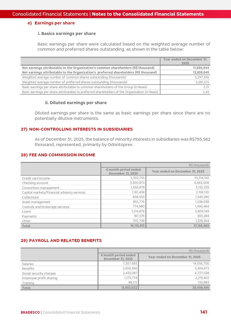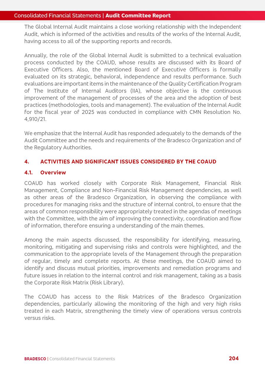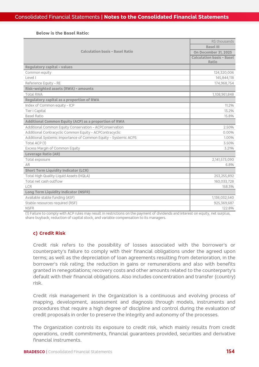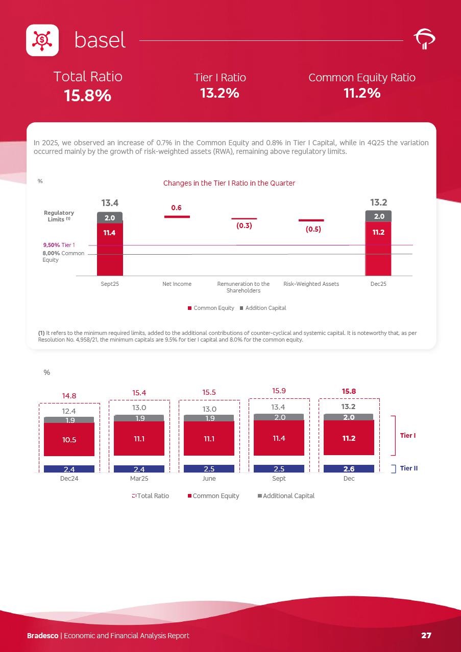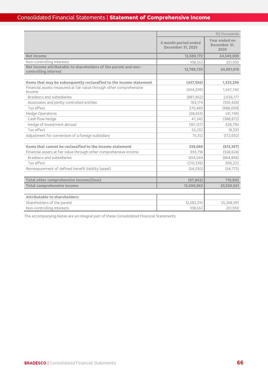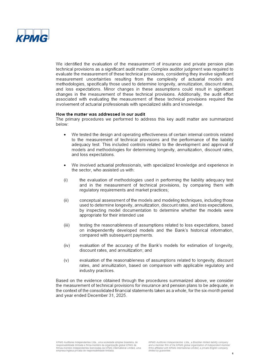 click on the items below to navigate through the document: 4Q 25 managerial analysis of results management report consolidated financial statements videoconference commenting on the results February 6th at 8:30 AM (US Eastern Time) economic and financial analysis reportBradesco | Economic and Financial Analysis Report 3 Table of Contents Managerial Analysis of Results 5 press release 6 highlights 4Q25 7 recurring net income statement 8 net interest income 9 funding sources 10 loan portfolio 11 expenses with expanded loan loss provisions 16 loan indicators 17 fee and commission income 19 operating expenses 21 Bradesco Seguros 22 basel 27 guidance, indicators & economic perspectives 28 Additional Information 29 corporate strategy | customer-centric 30 NPS 31 our people 32 sustainability 33 digital in figures | BIA 34 Bradesco Principal 35 Bradesco Expresso 36 international operations | My Account 37 Bradesco Bank 38 Ágora Investimentos 39 Digio 40 service points, clients and market share 41 return to shareholders 42 additional information 43 selected information 45 consolidated balance sheet – Bradesco 46 consolidated balance sheet – Insurance 47 statement of income – managerial vs. recurring | BRGAAP vs. IFRS comparative 48 Independent Auditor’s Report 49 Consolidated Financial Statements 53 Bradesco | Economic and Financial Analysis Report 4 Some numbers included in this Report have been subjected to rounding adjustments. As a result, some amounts indicated as total amounts in some charts may not be the arithmetic sum of the preceding numbers. Percentage variations not presented in the framework of this report, are related, in their majority, to the low value balances compared with the other periods presented. As of January 2025, we adopted in our Financial Statements the new accounting practices established by CMN Resolutions No. 4,966 and No. 4,975. For management purposes, we kept the information of the previous periods as already disclosed, which do not present relevant differences in the historical analysis of the results. For some credit indicators, when mentioned, we carry out historical data for comparability purposes on a pro-forma basis. In our financial statements the Organization opted for the exemption provided by the Standard not to resubmit comparative information from previous periods resulting from the changes. Managerial Analysis of Results Bradesco | Economic and Financial Analysis Report 6 press release Bradesco remains committed to expand profitability gradually and safely through the accelerated execution of the transformation plan. Our priority is to ensure the sustainability of the business by growing responsibly, keeping the cost of credit under control, investing in the transformation of the Organization, and reinforcing a customer centric approach in all decisions. In 2025, our commercial traction was reflected in impressive revenue growth across all of our core product lines. We maintained our risk appetite, new credit vintages with high quality and delinquency ratios under control. As a result, in 4Q25 we reported a Return on Equity (ROE) higher than our cost of capital, with eight straight quarters of profitability growth. Investments in our transformation have placed temporary pressure on expenses, but they are intended to boost our competitiveness in the short, medium and long term. The integration between "change the bank" and "run the bank" is intensifying, as the benefits of transformation continue to enhance operational performance and make it more sustainable. Net income was R$6.5 billion in 4Q25, resulting in ROAE of 15.2%, generating a profit of R$24.7 billion in 2025 and growth of 26.1% in 2025 vs. 2024. Total revenues topped R$36.1 billion for the quarter, growing 2.9% q/q and 9.8% y/y, driven by the performance of the net interest income and fee and commission income. Net interest income came to R$19.2 billion for the quarter, expanding 2.9% q/q and 13.2% y/y. Client NII reached R$19.1 billion, rising 2.7% q/q and 18.4% y/y, mainly due to the effect of the increase in the loan portfolio and efficiency on the funding margin. Market NII totaled R$126 million in 4Q25, in line with expectations, bringing the full-year figure to R$975 million. The expanded loan portfolio came to R$1.089 trillion, growing 11.0% y/y and 5.3% q/q in December 2025, reflecting our traction in the MSME and Individuals segments, and operations with Large Companies carried out at the end of the year. In December 2025, the delinquency ratio (over 90 days NPL) remained stable. Problem assets in the restructured portfolio fell by R$2.4 billion versus the prior quarter and R$10.5 billion in the annual comparison, while cured assets rose 10.7% q/q and 58.2% y/y. Consequently, stage 3 operations declined throughout 2025, with a 40 bps reduction in the last quarter. The cost of credit retreated slightly from 3.3% in 3Q25 to 3.2% in 4Q25, reflecting the quality of the concession and growth of the loan portfolio over the period. Fee and commission income performed strongly, growing 4.6% q/q and 8.0% y/y. The positive standouts over the quarter included capital market, card income and loan operations. The operational performance from insurance operations generated an income of R$5.6 billion (-1.0% q/q and +2.1% y/y) and net income of R$2.8 billion (10.7% q/q and 10.6% y/y). The ROAE of the insurance company was 24.3% in 4Q25. In 2025, the insurance earnings came to R$10.1 billion. Our efficiency ratio (expenses/revenues) improved by 2.2 p.p. over the year, attributed to a 13.2% increase in revenues and sound management of expenses. In 2025, operating expenses rose by 8.5% while administrative and personnel expenses saw a 5.0% bump, which includes the impact of the collective bargaining agreement of 5.68% and increase in profit-sharing expenditures. Temporary pressures seen throughout the year came mainly from our transformation initiatives and a strategic strengthening of the 