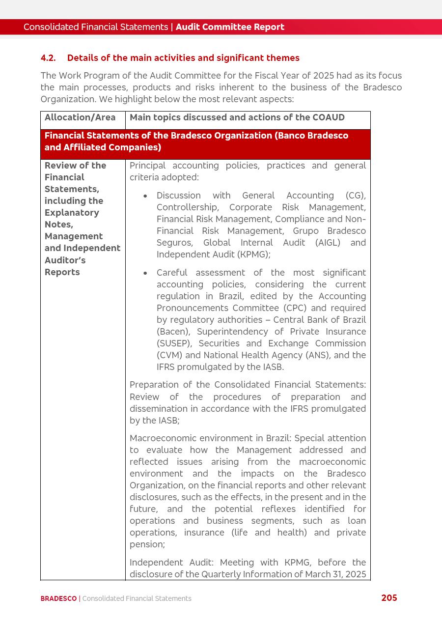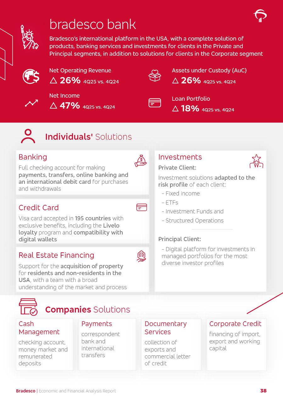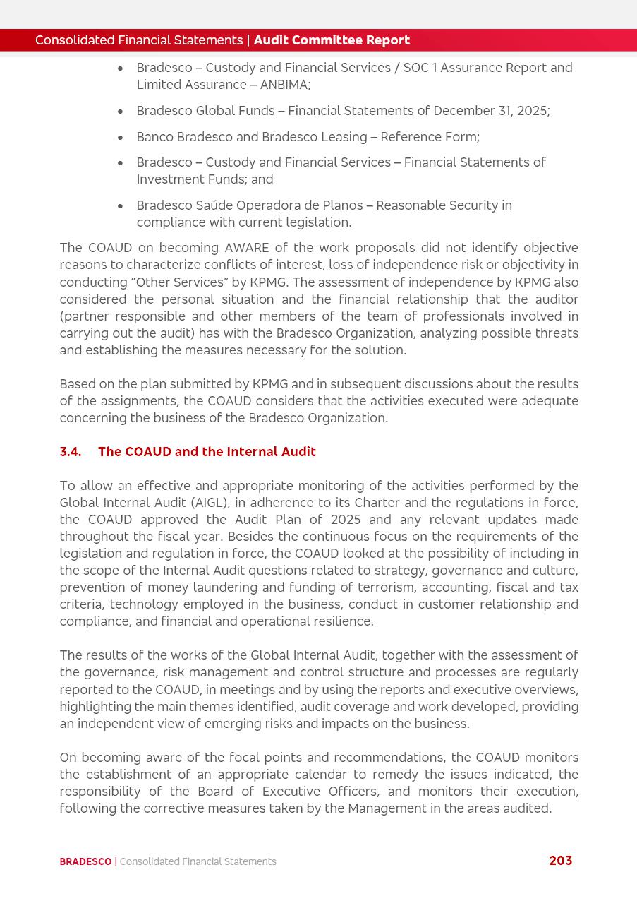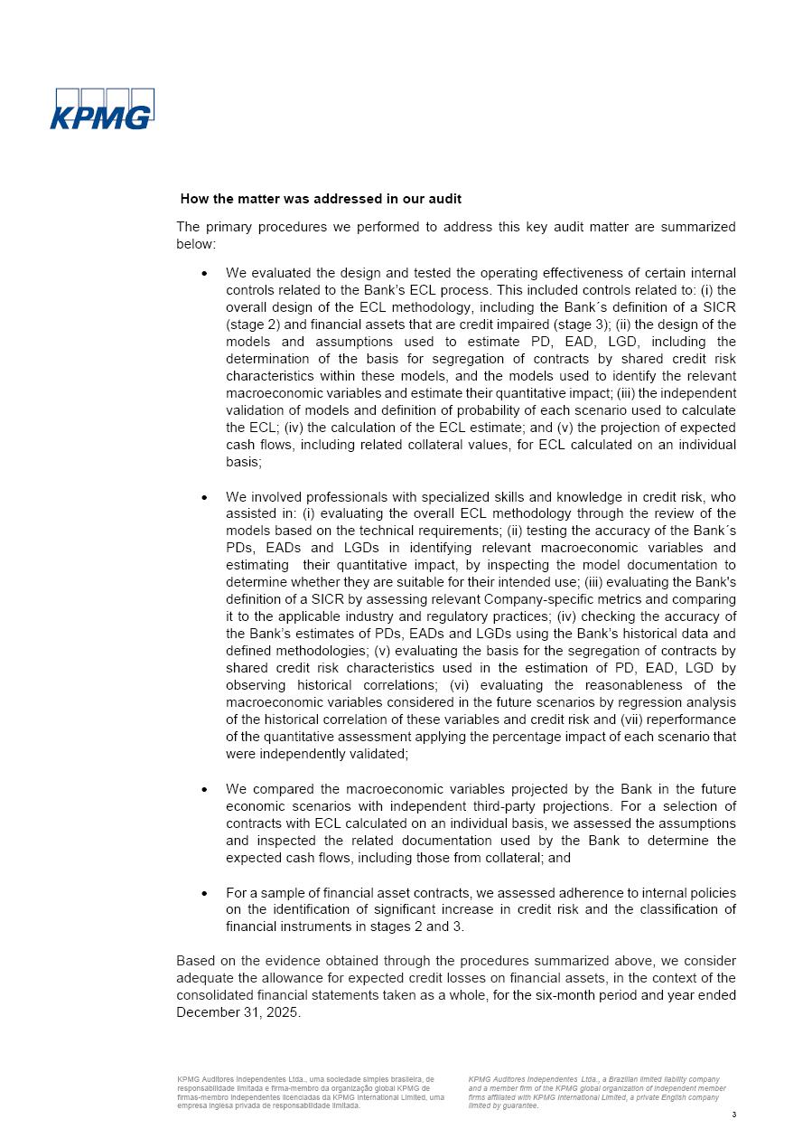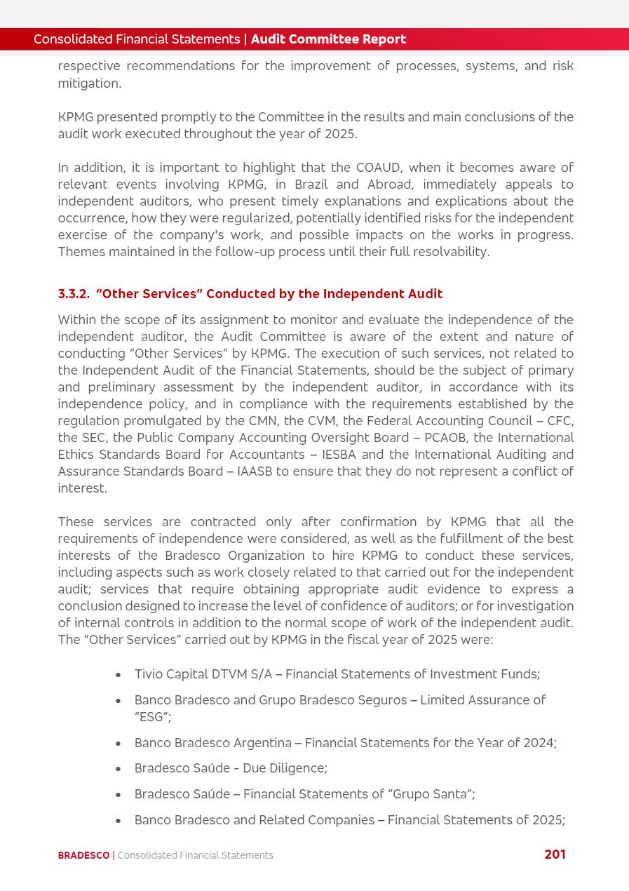 click on the items below to navigate through the document: 4Q 25 managerial analysis of results management report consolidated financial statements videoconference commenting on the results February 6th at 8:30 AM (US Eastern Time) economic and financial analysis reportBradesco | Economic and Financial Analysis Report 3 Table of Contents Managerial Analysis of Results 5 press release 6 highlights 4Q25 7 recurring net income statement 8 net interest income 9 funding sources 10 loan portfolio 11 expenses with expanded loan loss provisions 16 loan indicators 17 fee and commission income 19 operating expenses 21 Bradesco Seguros 22 basel 27 guidance, indicators & economic perspectives 28 Additional Information 29 corporate strategy | customer-centric 30 NPS 31 our people 32 sustainability 33 digital in figures | BIA 34 Bradesco Principal 35 Bradesco Expresso 36 international operations | My Account 37 Bradesco Bank 38 Ágora Investimentos 39 Digio 40 service points, clients and market share 41 return to shareholders 42 additional information 43 selected information 45 consolidated balance sheet – Bradesco 46 consolidated balance sheet – Insurance 47 statement of income – managerial vs. recurring | BRGAAP vs. IFRS comparative 48 Independent Auditor’s Report 49 Consolidated Financial Statements 53 Bradesco | Economic and Financial Analysis Report 4 Some numbers included in this Report have been subjected to rounding adjustments. As a result, some amounts indicated as total amounts in some charts may not be the arithmetic sum of the preceding numbers. Percentage variations not presented in the framework of this report, are related, in their majority, to the low value balances compared with the other periods presented. As of January 2025, we adopted in our Financial Statements the new accounting practices established by CMN Resolutions No. 4,966 and No. 4,975. For management purposes, we kept the information of the previous periods as already disclosed, which do not present relevant differences in the historical analysis of the results. For some credit indicators, when mentioned, we carry out historical data for comparability purposes on a pro-forma basis. In our financial statements the Organization opted for the exemption provided by the Standard not to resubmit comparative information from previous periods resulting from the changes. Managerial Analysis of Results Bradesco | Economic and Financial Analysis Report 6 press release Bradesco remains committed to expand profitability gradually and safely through the accelerated execution of the transformation plan. Our priority is to ensure the sustainability of the business by growing responsibly, keeping the cost of credit under control, investing in the transformation of the Organization, and reinforcing a customer centric approach in all decisions. In 2025, our commercial traction was reflected in impressive revenue growth across all of our core product lines. We maintained our risk appetite, new credit vintages with high quality and delinquency ratios under control. As a result, in 4Q25 we reported a Return on Equity (ROE) higher than our cost of capital, with eight straight quarters of profitability growth. Investments in our transformation have placed temporary pressure on expenses, but they are intended to boost our competitiveness in the short, medium and long term. The integration between "change the bank" and "run the bank" is intensifying, as the benefits of transformation continue to enhance operational performance and make it more sustainable. Net income was R$6.5 billion in 4Q25, resulting in ROAE of 15.2%, generating a profit of R$24.7 billion in 2025 and growth of 26.1% in 2025 vs. 2024. Total revenues topped R$36.1 billion for the quarter, growing 2.9% q/q and 9.8% y/y, driven by the performance of the net interest income and fee and commission income. Net interest income came to R$19.2 billion for the quarter, expanding 2.9% q/q and 13.2% y/y. Client NII reached R$19.1 billion, rising 2.7% q/q and 18.4% y/y, mainly due to the effect of the increase in the loan portfolio and efficiency on the funding margin. Market NII totaled R$126 million in 4Q25, in line with expectations, bringing the full-year figure to R$975 million. The expanded loan portfolio came to R$1.089 trillion, growing 11.0% y/y and 5.3% q/q in December 2025, reflecting our traction in the MSME and Individuals segments, and operations with Large Companies carried out at the end of the year. In December 2025, the delinquency ratio (over 90 days NPL) remained stable. Problem assets in the restructured portfolio fell by R$2.4 billion versus the prior quarter and R$10.5 billion in the annual comparison, while cured assets rose 10.7% q/q and 58.2% y/y. Consequently, stage 3 operations declined throughout 2025, with a 40 bps reduction in the last quarter. The cost of credit retreated slightly from 3.3% in 3Q25 to 3.2% in 4Q25, reflecting the quality of the concession and growth of the loan portfolio over the period. Fee and commission income performed strongly, growing 4.6% q/q and 8.0% y/y. The positive standouts over the quarter included capital market, card income and loan operations. The operational performance from insurance operations generated an income of R$5.6 billion (-1.0% q/q and +2.1% y/y) and net income of R$2.8 billion (10.7% q/q and 10.6% y/y). The ROAE of the insurance company was 24.3% in 4Q25. In 2025, the insurance earnings came to R$10.1 billion. Our efficiency ratio (expenses/revenues) improved by 2.2 p.p. over the year, attributed to a 13.2% increase in revenues and sound management of expenses. In 2025, operating expenses rose by 8.5% while administrative and personnel expenses saw a 5.0% bump, which includes the impact of the collective bargaining agreement of 5.68% and increase in profit-sharing expenditures. Temporary pressures seen throughout the year came mainly from our transformation initiatives and a strategic strengthening of the 