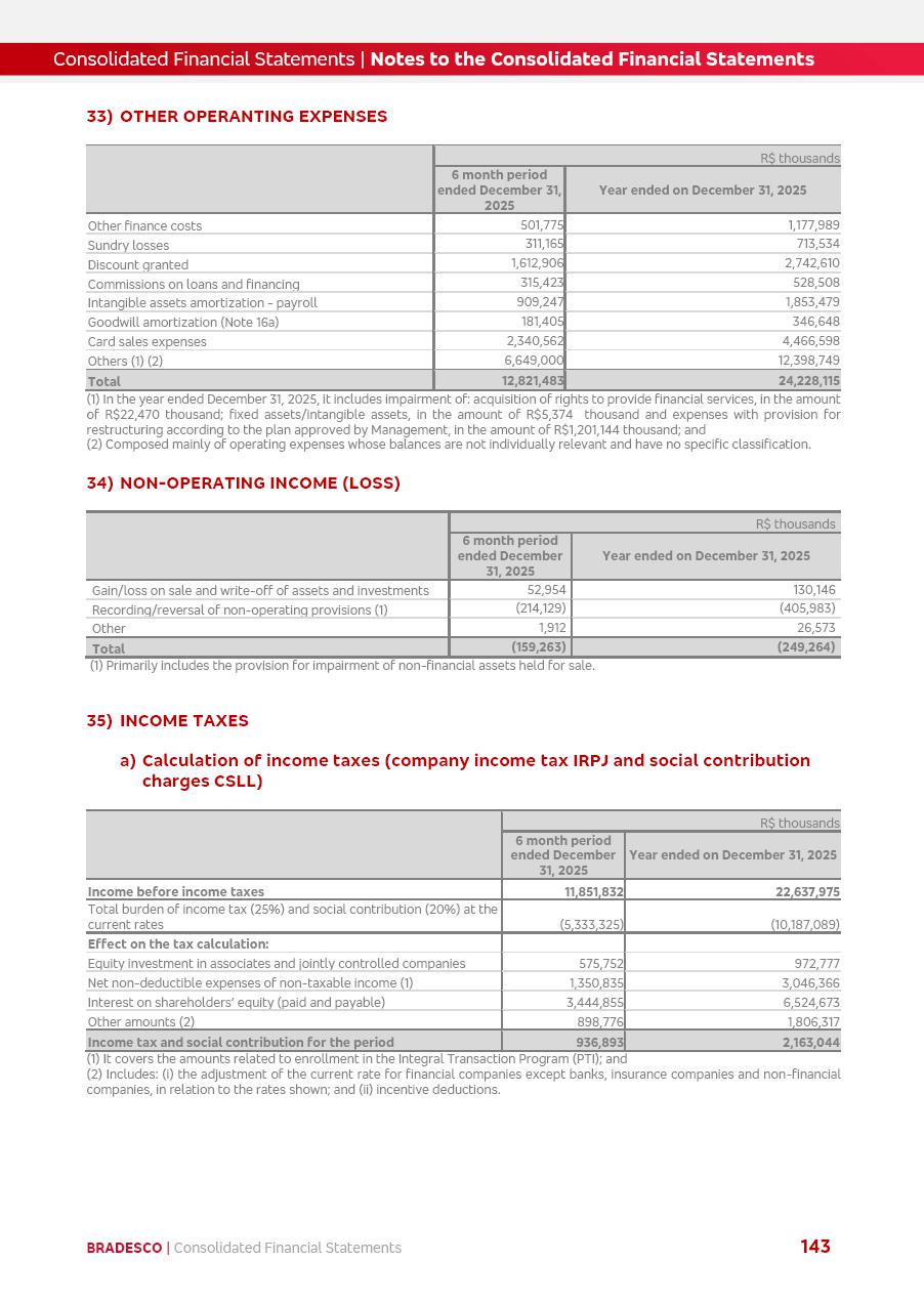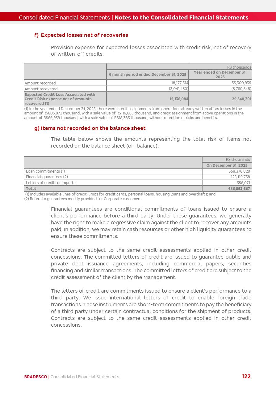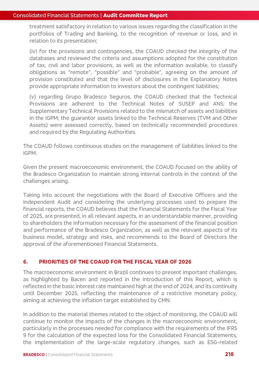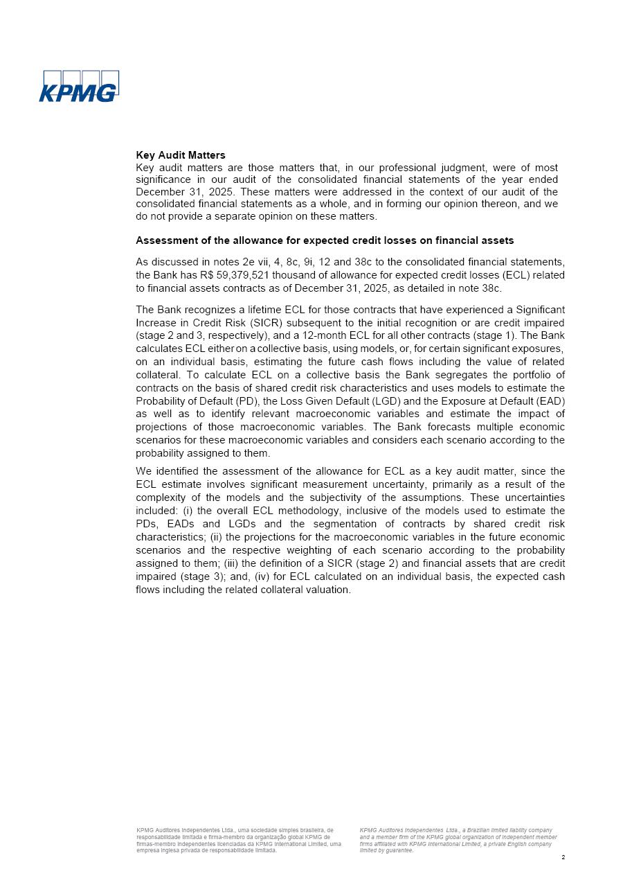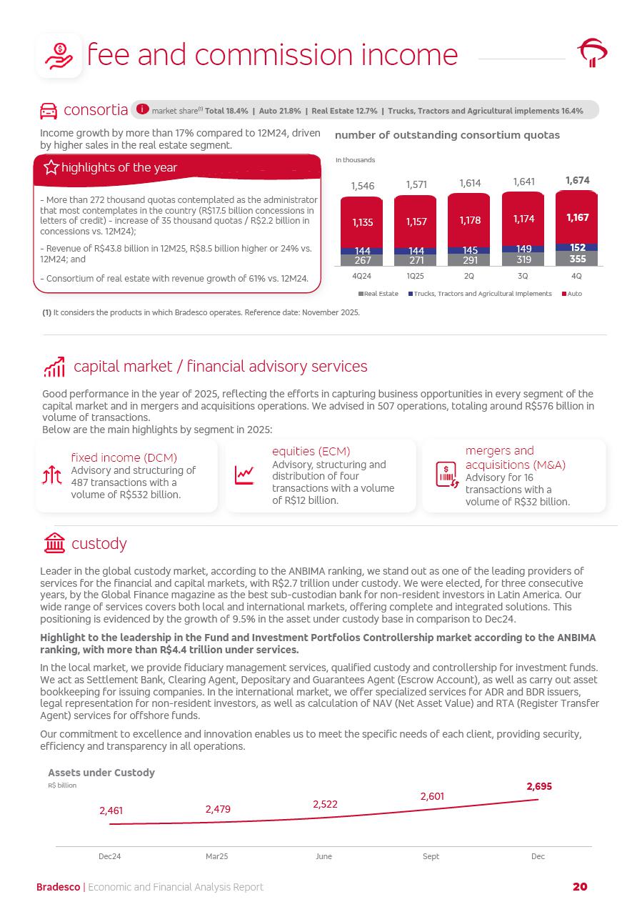 click on the items below to navigate through the document: 4Q 25 managerial analysis of results management report consolidated financial statements videoconference commenting on the results February 6th at 8:30 AM (US Eastern Time) economic and financial analysis reportBradesco | Economic and Financial Analysis Report 3 Table of Contents Managerial Analysis of Results 5 press release 6 highlights 4Q25 7 recurring net income statement 8 net interest income 9 funding sources 10 loan portfolio 11 expenses with expanded loan loss provisions 16 loan indicators 17 fee and commission income 19 operating expenses 21 Bradesco Seguros 22 basel 27 guidance, indicators & economic perspectives 28 Additional Information 29 corporate strategy | customer-centric 30 NPS 31 our people 32 sustainability 33 digital in figures | BIA 34 Bradesco Principal 35 Bradesco Expresso 36 international operations | My Account 37 Bradesco Bank 38 Ágora Investimentos 39 Digio 40 service points, clients and market share 41 return to shareholders 42 additional information 43 selected information 45 consolidated balance sheet – Bradesco 46 consolidated balance sheet – Insurance 47 statement of income – managerial vs. recurring | BRGAAP vs. IFRS comparative 48 Independent Auditor’s Report 49 Consolidated Financial Statements 53 Bradesco | Economic and Financial Analysis Report 4 Some numbers included in this Report have been subjected to rounding adjustments. As a result, some amounts indicated as total amounts in some charts may not be the arithmetic sum of the preceding numbers. Percentage variations not presented in the framework of this report, are related, in their majority, to the low value balances compared with the other periods presented. As of January 2025, we adopted in our Financial Statements the new accounting practices established by CMN Resolutions No. 4,966 and No. 4,975. For management purposes, we kept the information of the previous periods as already disclosed, which do not present relevant differences in the historical analysis of the results. For some credit indicators, when mentioned, we carry out historical data for comparability purposes on a pro-forma basis. In our financial statements the Organization opted for the exemption provided by the Standard not to resubmit comparative information from previous periods resulting from the changes. Managerial Analysis of Results Bradesco | Economic and Financial Analysis Report 6 press release Bradesco remains committed to expand profitability gradually and safely through the accelerated execution of the transformation plan. Our priority is to ensure the sustainability of the business by growing responsibly, keeping the cost of credit under control, investing in the transformation of the Organization, and reinforcing a customer centric approach in all decisions. In 2025, our commercial traction was reflected in impressive revenue growth across all of our core product lines. We maintained our risk appetite, new credit vintages with high quality and delinquency ratios under control. As a result, in 4Q25 we reported a Return on Equity (ROE) higher than our cost of capital, with eight straight quarters of profitability growth. Investments in our transformation have placed temporary pressure on expenses, but they are intended to boost our competitiveness in the short, medium and long term. The integration between "change the bank" and "run the bank" is intensifying, as the benefits of transformation continue to enhance operational performance and make it more sustainable. Net income was R$6.5 billion in 4Q25, resulting in ROAE of 15.2%, generating a profit of R$24.7 billion in 2025 and growth of 26.1% in 2025 vs. 2024. Total revenues topped R$36.1 billion for the quarter, growing 2.9% q/q and 9.8% y/y, driven by the performance of the net interest income and fee and commission income. Net interest income came to R$19.2 billion for the quarter, expanding 2.9% q/q and 13.2% y/y. Client NII reached R$19.1 billion, rising 2.7% q/q and 18.4% y/y, mainly due to the effect of the increase in the loan portfolio and efficiency on the funding margin. Market NII totaled R$126 million in 4Q25, in line with expectations, bringing the full-year figure to R$975 million. The expanded loan portfolio came to R$1.089 trillion, growing 11.0% y/y and 5.3% q/q in December 2025, reflecting our traction in the MSME and Individuals segments, and operations with Large Companies carried out at the end of the year. In December 2025, the delinquency ratio (over 90 days NPL) remained stable. Problem assets in the restructured portfolio fell by R$2.4 billion versus the prior quarter and R$10.5 billion in the annual comparison, while cured assets rose 10.7% q/q and 58.2% y/y. Consequently, stage 3 operations declined throughout 2025, with a 40 bps reduction in the last quarter. The cost of credit retreated slightly from 3.3% in 3Q25 to 3.2% in 4Q25, reflecting the quality of the concession and growth of the loan portfolio over the period. Fee and commission income performed strongly, growing 4.6% q/q and 8.0% y/y. The positive standouts over the quarter included capital market, card income and loan operations. The operational performance from insurance operations generated an income of R$5.6 billion (-1.0% q/q and +2.1% y/y) and net income of R$2.8 billion (10.7% q/q and 10.6% y/y). The ROAE of the insurance company was 24.3% in 4Q25. In 2025, the insurance earnings came to R$10.1 billion. Our efficiency ratio (expenses/revenues) improved by 2.2 p.p. over the year, attributed to a 13.2% increase in revenues and sound management of expenses. In 2025, operating expenses rose by 8.5% while administrative and personnel expenses saw a 5.0% bump, which includes the impact of the collective bargaining agreement of 5.68% and increase in profit-sharing expenditures. Temporary pressures seen throughout the year came mainly from our transformation initiatives and a strategic strengthening of the 