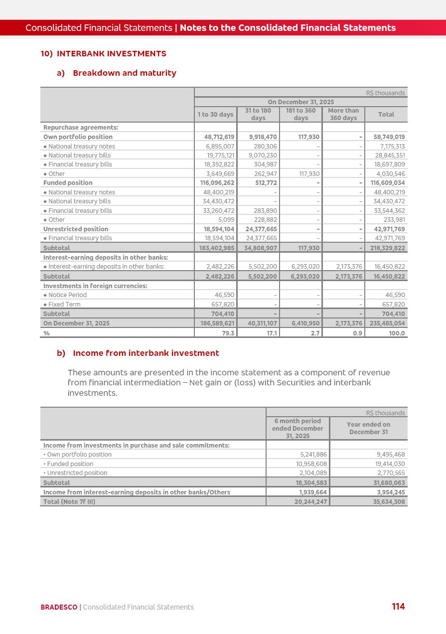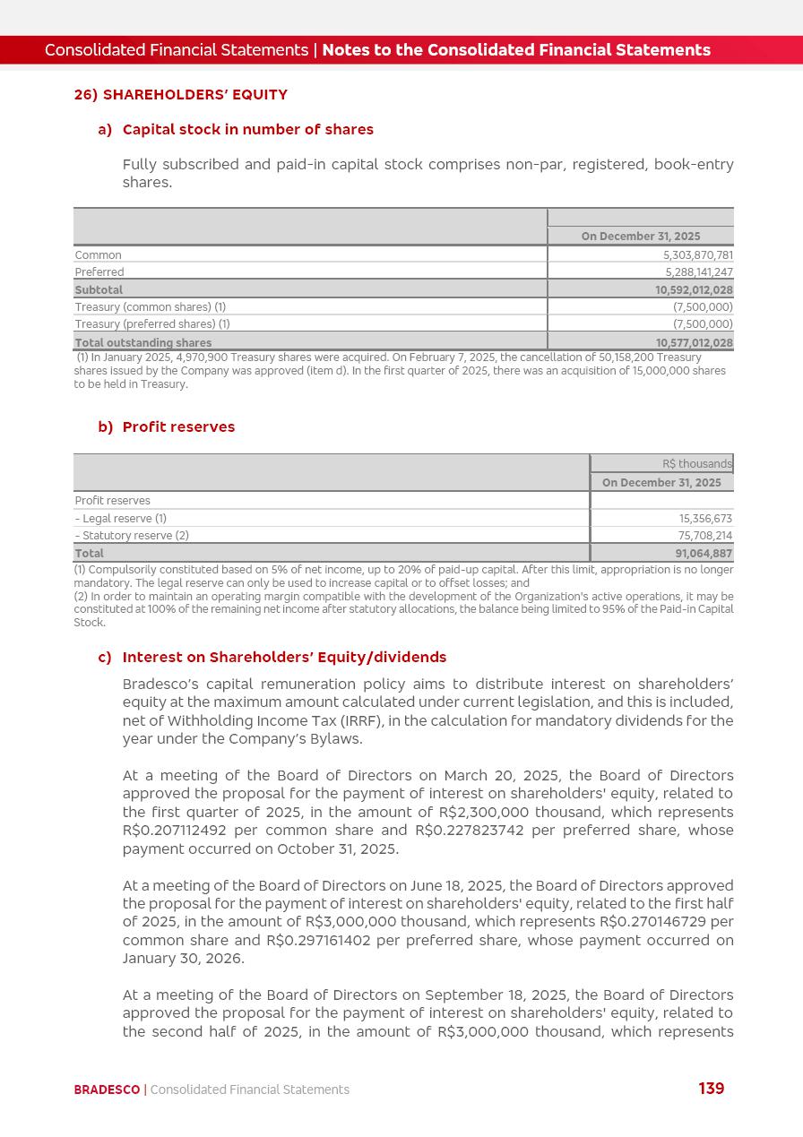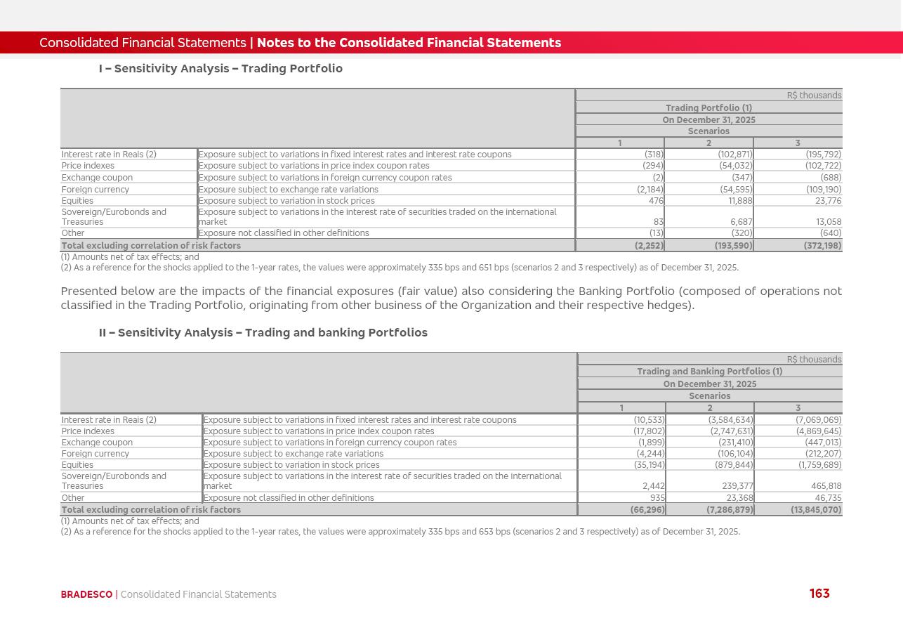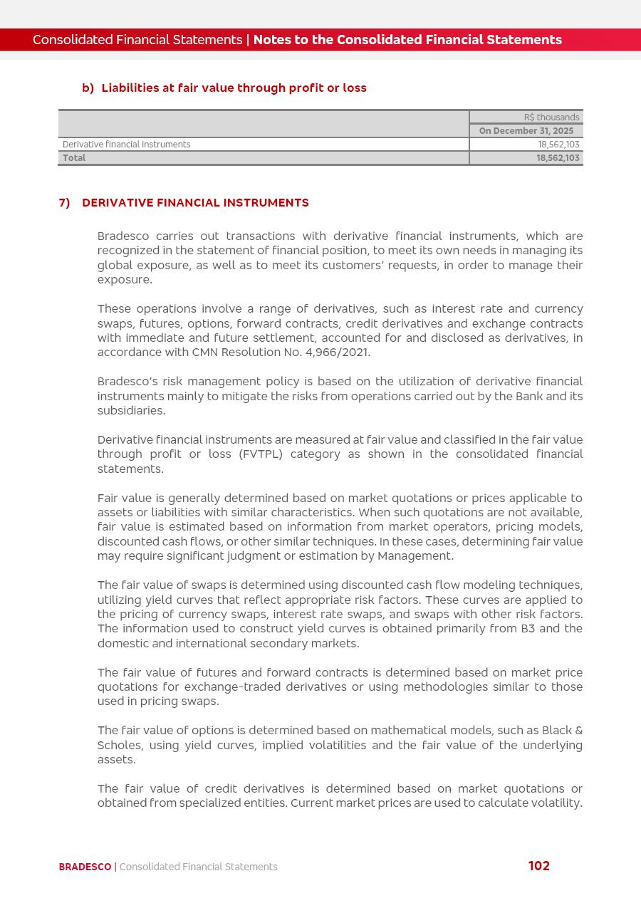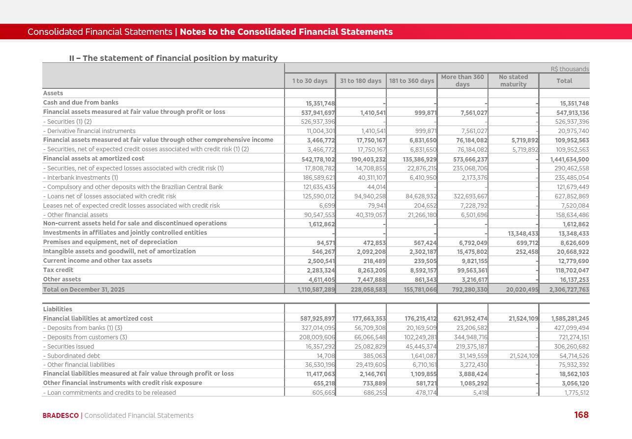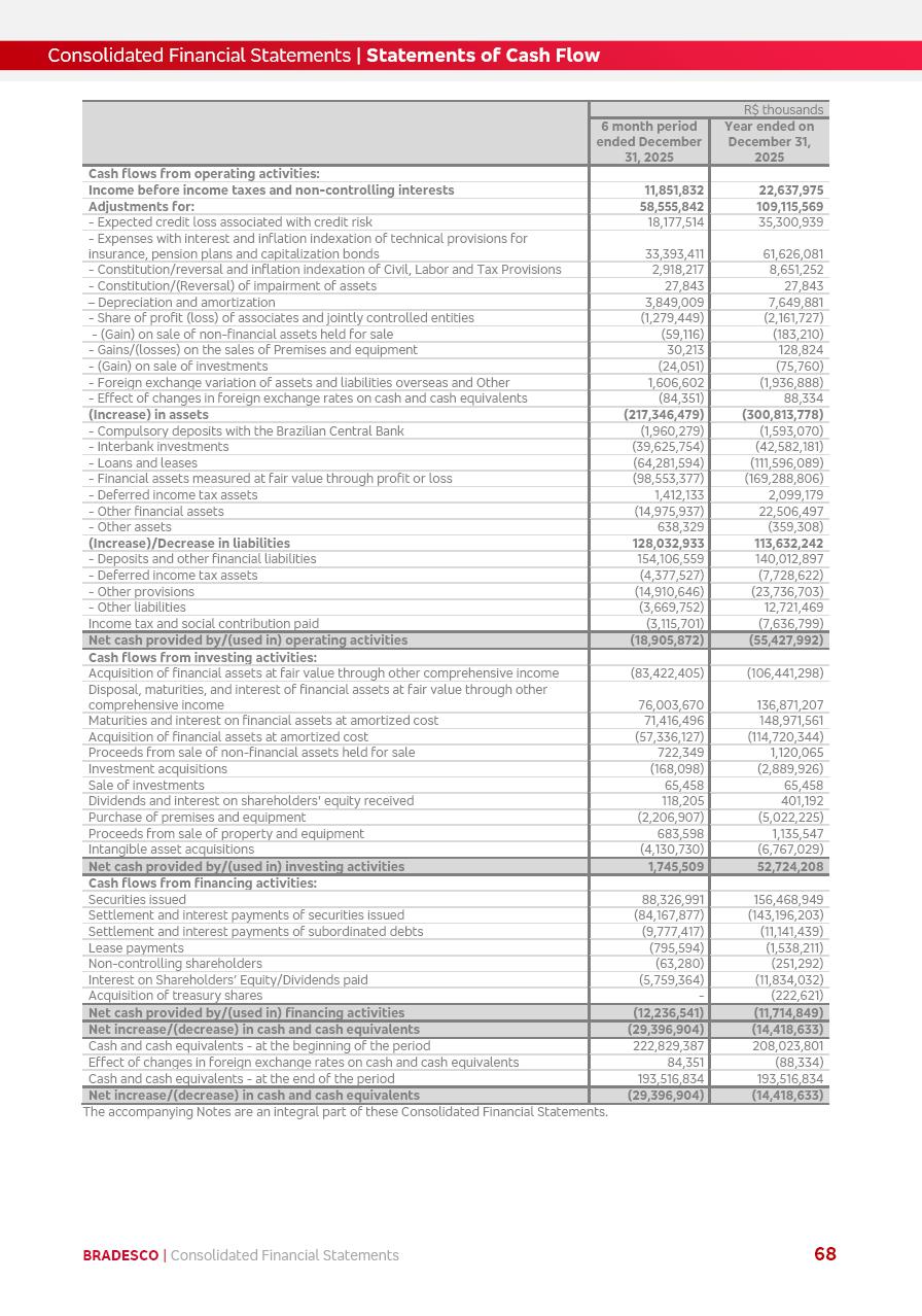 click on the items below to navigate through the document: 4Q 25 managerial analysis of results management report consolidated financial statements videoconference commenting on the results February 6th at 8:30 AM (US Eastern Time) economic and financial analysis reportBradesco | Economic and Financial Analysis Report 3 Table of Contents Managerial Analysis of Results 5 press release 6 highlights 4Q25 7 recurring net income statement 8 net interest income 9 funding sources 10 loan portfolio 11 expenses with expanded loan loss provisions 16 loan indicators 17 fee and commission income 19 operating expenses 21 Bradesco Seguros 22 basel 27 guidance, indicators & economic perspectives 28 Additional Information 29 corporate strategy | customer-centric 30 NPS 31 our people 32 sustainability 33 digital in figures | BIA 34 Bradesco Principal 35 Bradesco Expresso 36 international operations | My Account 37 Bradesco Bank 38 Ágora Investimentos 39 Digio 40 service points, clients and market share 41 return to shareholders 42 additional information 43 selected information 45 consolidated balance sheet – Bradesco 46 consolidated balance sheet – Insurance 47 statement of income – managerial vs. recurring | BRGAAP vs. IFRS comparative 48 Independent Auditor’s Report 49 Consolidated Financial Statements 53 Bradesco | Economic and Financial Analysis Report 4 Some numbers included in this Report have been subjected to rounding adjustments. As a result, some amounts indicated as total amounts in some charts may not be the arithmetic sum of the preceding numbers. Percentage variations not presented in the framework of this report, are related, in their majority, to the low value balances compared with the other periods presented. As of January 2025, we adopted in our Financial Statements the new accounting practices established by CMN Resolutions No. 4,966 and No. 4,975. For management purposes, we kept the information of the previous periods as already disclosed, which do not present relevant differences in the historical analysis of the results. For some credit indicators, when mentioned, we carry out historical data for comparability purposes on a pro-forma basis. In our financial statements the Organization opted for the exemption provided by the Standard not to resubmit comparative information from previous periods resulting from the changes. Managerial Analysis of Results Bradesco | Economic and Financial Analysis Report 6 press release Bradesco remains committed to expand profitability gradually and safely through the accelerated execution of the transformation plan. Our priority is to ensure the sustainability of the business by growing responsibly, keeping the cost of credit under control, investing in the transformation of the Organization, and reinforcing a customer centric approach in all decisions. In 2025, our commercial traction was reflected in impressive revenue growth across all of our core product lines. We maintained our risk appetite, new credit vintages with high quality and delinquency ratios under control. As a result, in 4Q25 we reported a Return on Equity (ROE) higher than our cost of capital, with eight straight quarters of profitability growth. Investments in our transformation have placed temporary pressure on expenses, but they are intended to boost our competitiveness in the short, medium and long term. The integration between "change the bank" and "run the bank" is intensifying, as the benefits of transformation continue to enhance operational performance and make it more sustainable. Net income was R$6.5 billion in 4Q25, resulting in ROAE of 15.2%, generating a profit of R$24.7 billion in 2025 and growth of 26.1% in 2025 vs. 2024. Total revenues topped R$36.1 billion for the quarter, growing 2.9% q/q and 9.8% y/y, driven by the performance of the net interest income and fee and commission income. Net interest income came to R$19.2 billion for the quarter, expanding 2.9% q/q and 13.2% y/y. Client NII reached R$19.1 billion, rising 2.7% q/q and 18.4% y/y, mainly due to the effect of the increase in the loan portfolio and efficiency on the funding margin. Market NII totaled R$126 million in 4Q25, in line with expectations, bringing the full-year figure to R$975 million. The expanded loan portfolio came to R$1.089 trillion, growing 11.0% y/y and 5.3% q/q in December 2025, reflecting our traction in the MSME and Individuals segments, and operations with Large Companies carried out at the end of the year. In December 2025, the delinquency ratio (over 90 days NPL) remained stable. Problem assets in the restructured portfolio fell by R$2.4 billion versus the prior quarter and R$10.5 billion in the annual comparison, while cured assets rose 10.7% q/q and 58.2% y/y. Consequently, stage 3 operations declined throughout 2025, with a 40 bps reduction in the last quarter. The cost of credit retreated slightly from 3.3% in 3Q25 to 3.2% in 4Q25, reflecting the quality of the concession and growth of the loan portfolio over the period. Fee and commission income performed strongly, growing 4.6% q/q and 8.0% y/y. The positive standouts over the quarter included capital market, card income and loan operations. The operational performance from insurance operations generated an income of R$5.6 billion (-1.0% q/q and +2.1% y/y) and net income of R$2.8 billion (10.7% q/q and 10.6% y/y). The ROAE of the insurance company was 24.3% in 4Q25. In 2025, the insurance earnings came to R$10.1 billion. Our efficiency ratio (expenses/revenues) improved by 2.2 p.p. over the year, attributed to a 13.2% increase in revenues and sound management of expenses. In 2025, operating expenses rose by 8.5% while administrative and personnel expenses saw a 5.0% bump, which includes the impact of the collective bargaining agreement of 5.68% and increase in profit-sharing expenditures. Temporary pressures seen throughout the year came mainly from our transformation initiatives and a strategic strengthening of the 