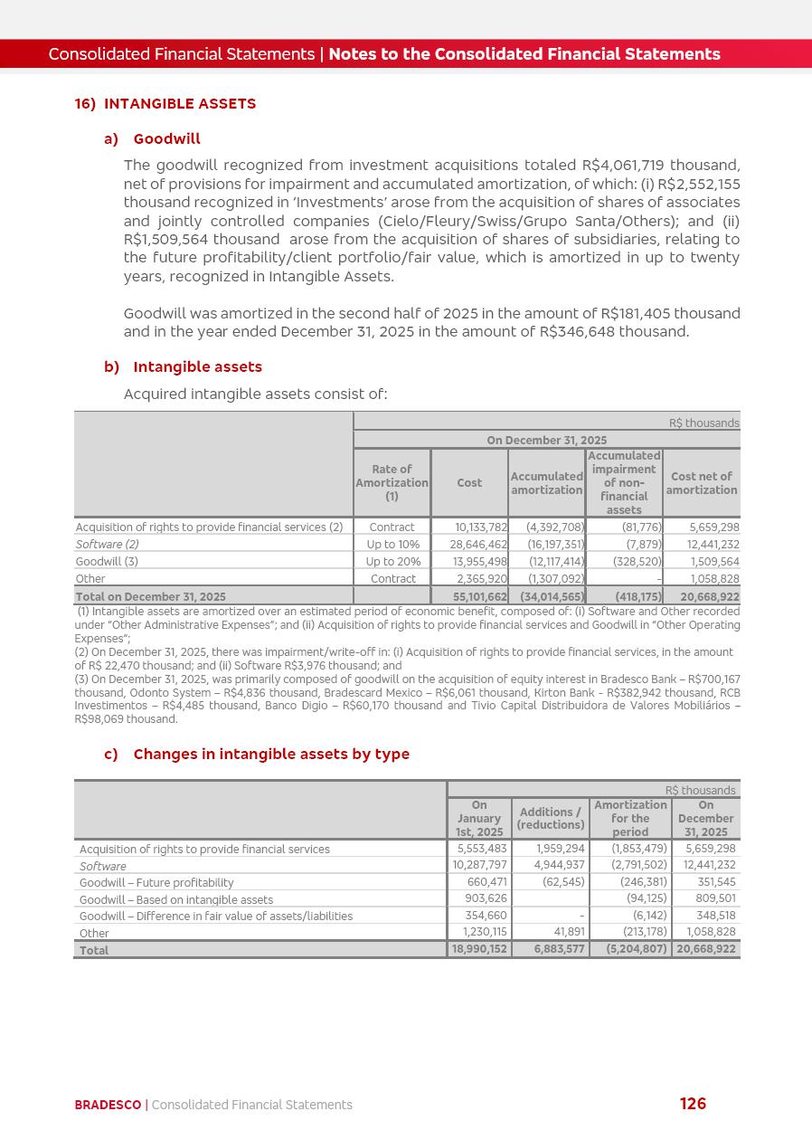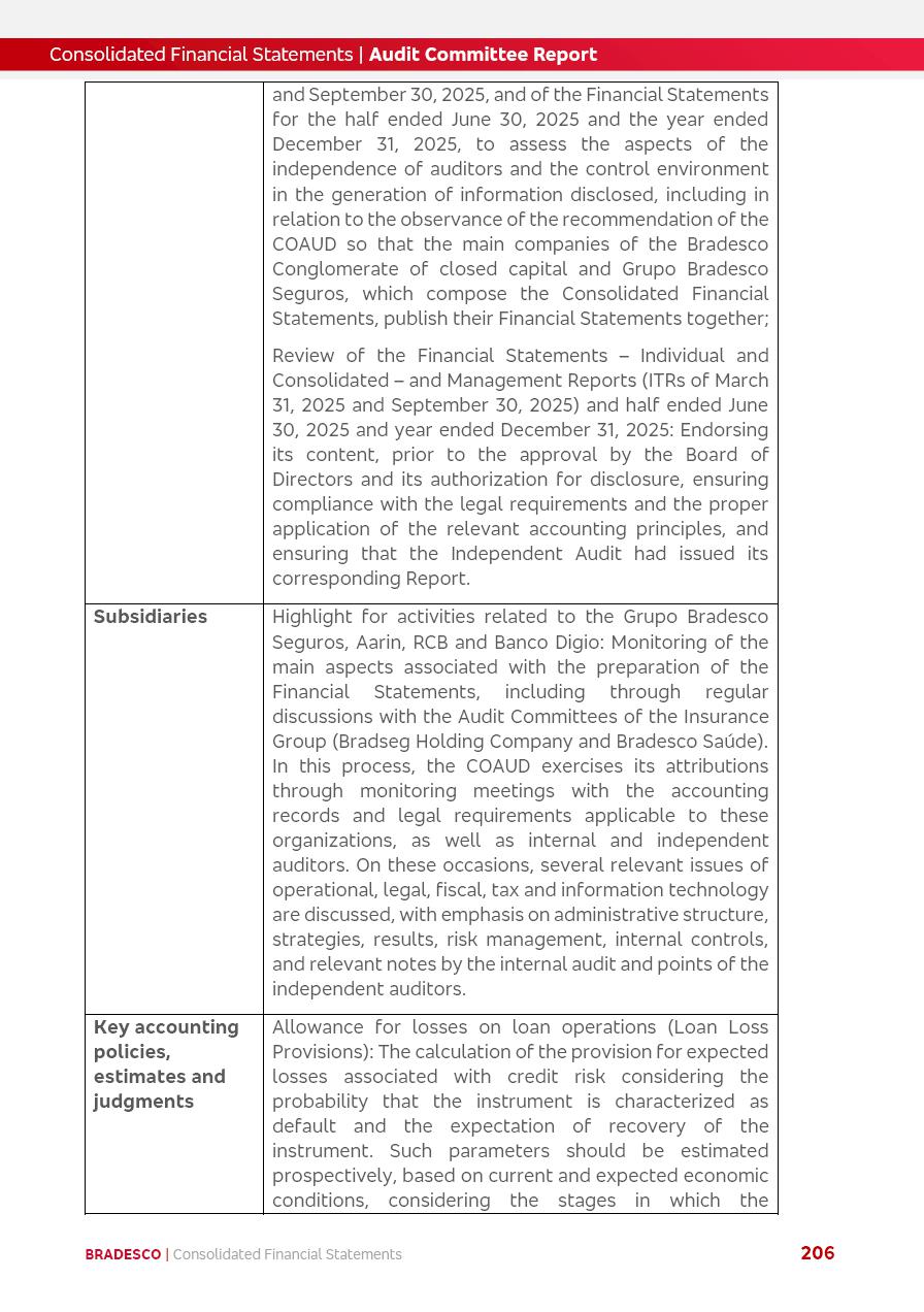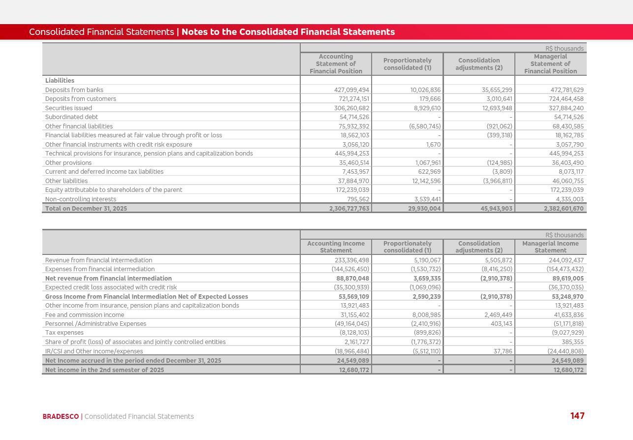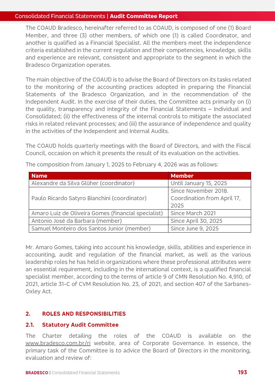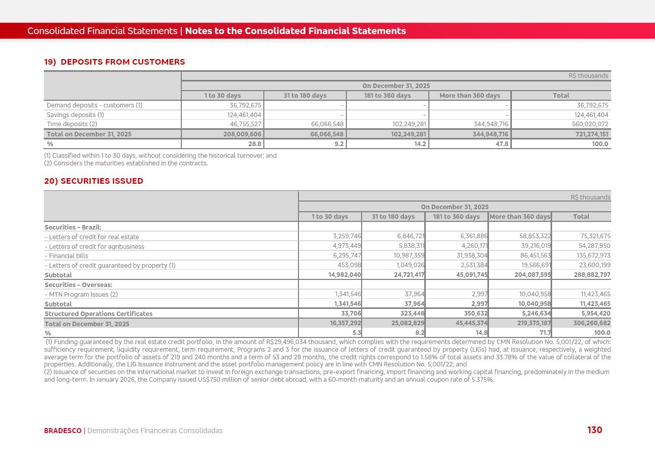 click on the items below to navigate through the document: 4Q 25 managerial analysis of results management report consolidated financial statements videoconference commenting on the results February 6th at 8:30 AM (US Eastern Time) economic and financial analysis reportBradesco | Economic and Financial Analysis Report 3 Table of Contents Managerial Analysis of Results 5 press release 6 highlights 4Q25 7 recurring net income statement 8 net interest income 9 funding sources 10 loan portfolio 11 expenses with expanded loan loss provisions 16 loan indicators 17 fee and commission income 19 operating expenses 21 Bradesco Seguros 22 basel 27 guidance, indicators & economic perspectives 28 Additional Information 29 corporate strategy | customer-centric 30 NPS 31 our people 32 sustainability 33 digital in figures | BIA 34 Bradesco Principal 35 Bradesco Expresso 36 international operations | My Account 37 Bradesco Bank 38 Ágora Investimentos 39 Digio 40 service points, clients and market share 41 return to shareholders 42 additional information 43 selected information 45 consolidated balance sheet – Bradesco 46 consolidated balance sheet – Insurance 47 statement of income – managerial vs. recurring | BRGAAP vs. IFRS comparative 48 Independent Auditor’s Report 49 Consolidated Financial Statements 53 Bradesco | Economic and Financial Analysis Report 4 Some numbers included in this Report have been subjected to rounding adjustments. As a result, some amounts indicated as total amounts in some charts may not be the arithmetic sum of the preceding numbers. Percentage variations not presented in the framework of this report, are related, in their majority, to the low value balances compared with the other periods presented. As of January 2025, we adopted in our Financial Statements the new accounting practices established by CMN Resolutions No. 4,966 and No. 4,975. For management purposes, we kept the information of the previous periods as already disclosed, which do not present relevant differences in the historical analysis of the results. For some credit indicators, when mentioned, we carry out historical data for comparability purposes on a pro-forma basis. In our financial statements the Organization opted for the exemption provided by the Standard not to resubmit comparative information from previous periods resulting from the changes. Managerial Analysis of Results Bradesco | Economic and Financial Analysis Report 6 press release Bradesco remains committed to expand profitability gradually and safely through the accelerated execution of the transformation plan. Our priority is to ensure the sustainability of the business by growing responsibly, keeping the cost of credit under control, investing in the transformation of the Organization, and reinforcing a customer centric approach in all decisions. In 2025, our commercial traction was reflected in impressive revenue growth across all of our core product lines. We maintained our risk appetite, new credit vintages with high quality and delinquency ratios under control. As a result, in 4Q25 we reported a Return on Equity (ROE) higher than our cost of capital, with eight straight quarters of profitability growth. Investments in our transformation have placed temporary pressure on expenses, but they are intended to boost our competitiveness in the short, medium and long term. The integration between "change the bank" and "run the bank" is intensifying, as the benefits of transformation continue to enhance operational performance and make it more sustainable. Net income was R$6.5 billion in 4Q25, resulting in ROAE of 15.2%, generating a profit of R$24.7 billion in 2025 and growth of 26.1% in 2025 vs. 2024. Total revenues topped R$36.1 billion for the quarter, growing 2.9% q/q and 9.8% y/y, driven by the performance of the net interest income and fee and commission income. Net interest income came to R$19.2 billion for the quarter, expanding 2.9% q/q and 13.2% y/y. Client NII reached R$19.1 billion, rising 2.7% q/q and 18.4% y/y, mainly due to the effect of the increase in the loan portfolio and efficiency on the funding margin. Market NII totaled R$126 million in 4Q25, in line with expectations, bringing the full-year figure to R$975 million. The expanded loan portfolio came to R$1.089 trillion, growing 11.0% y/y and 5.3% q/q in December 2025, reflecting our traction in the MSME and Individuals segments, and operations with Large Companies carried out at the end of the year. In December 2025, the delinquency ratio (over 90 days NPL) remained stable. Problem assets in the restructured portfolio fell by R$2.4 billion versus the prior quarter and R$10.5 billion in the annual comparison, while cured assets rose 10.7% q/q and 58.2% y/y. Consequently, stage 3 operations declined throughout 2025, with a 40 bps reduction in the last quarter. The cost of credit retreated slightly from 3.3% in 3Q25 to 3.2% in 4Q25, reflecting the quality of the concession and growth of the loan portfolio over the period. Fee and commission income performed strongly, growing 4.6% q/q and 8.0% y/y. The positive standouts over the quarter included capital market, card income and loan operations. The operational performance from insurance operations generated an income of R$5.6 billion (-1.0% q/q and +2.1% y/y) and net income of R$2.8 billion (10.7% q/q and 10.6% y/y). The ROAE of the insurance company was 24.3% in 4Q25. In 2025, the insurance earnings came to R$10.1 billion. Our efficiency ratio (expenses/revenues) improved by 2.2 p.p. over the year, attributed to a 13.2% increase in revenues and sound management of expenses. In 2025, operating expenses rose by 8.5% while administrative and personnel expenses saw a 5.0% bump, which includes the impact of the collective bargaining agreement of 5.68% and increase in profit-sharing expenditures. Temporary pressures seen throughout the year came mainly from our transformation initiatives and a strategic strengthening of the 