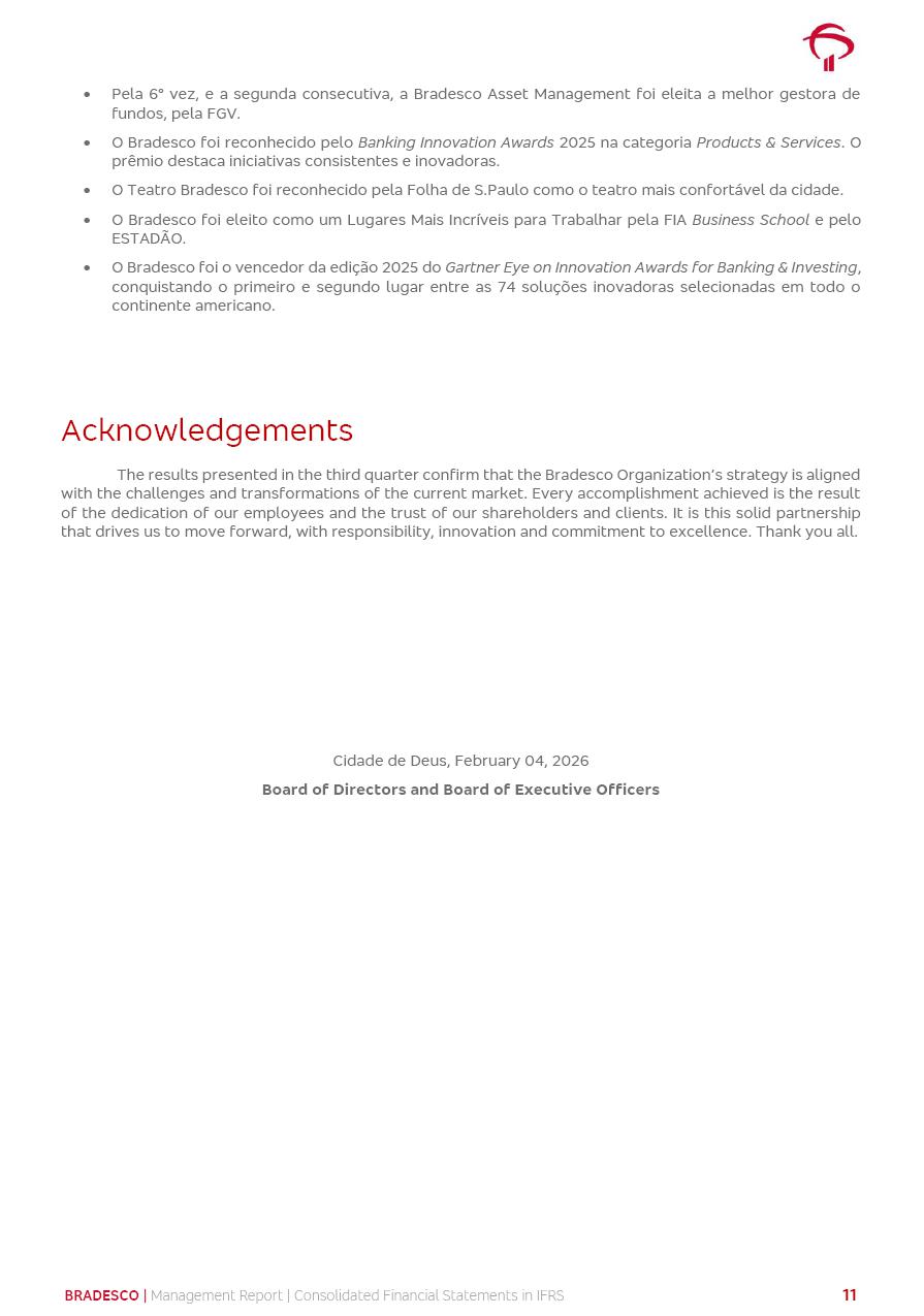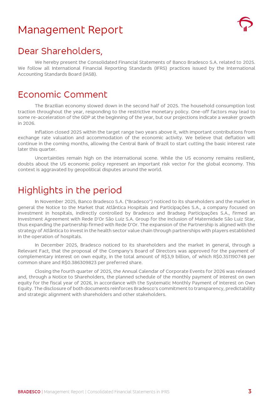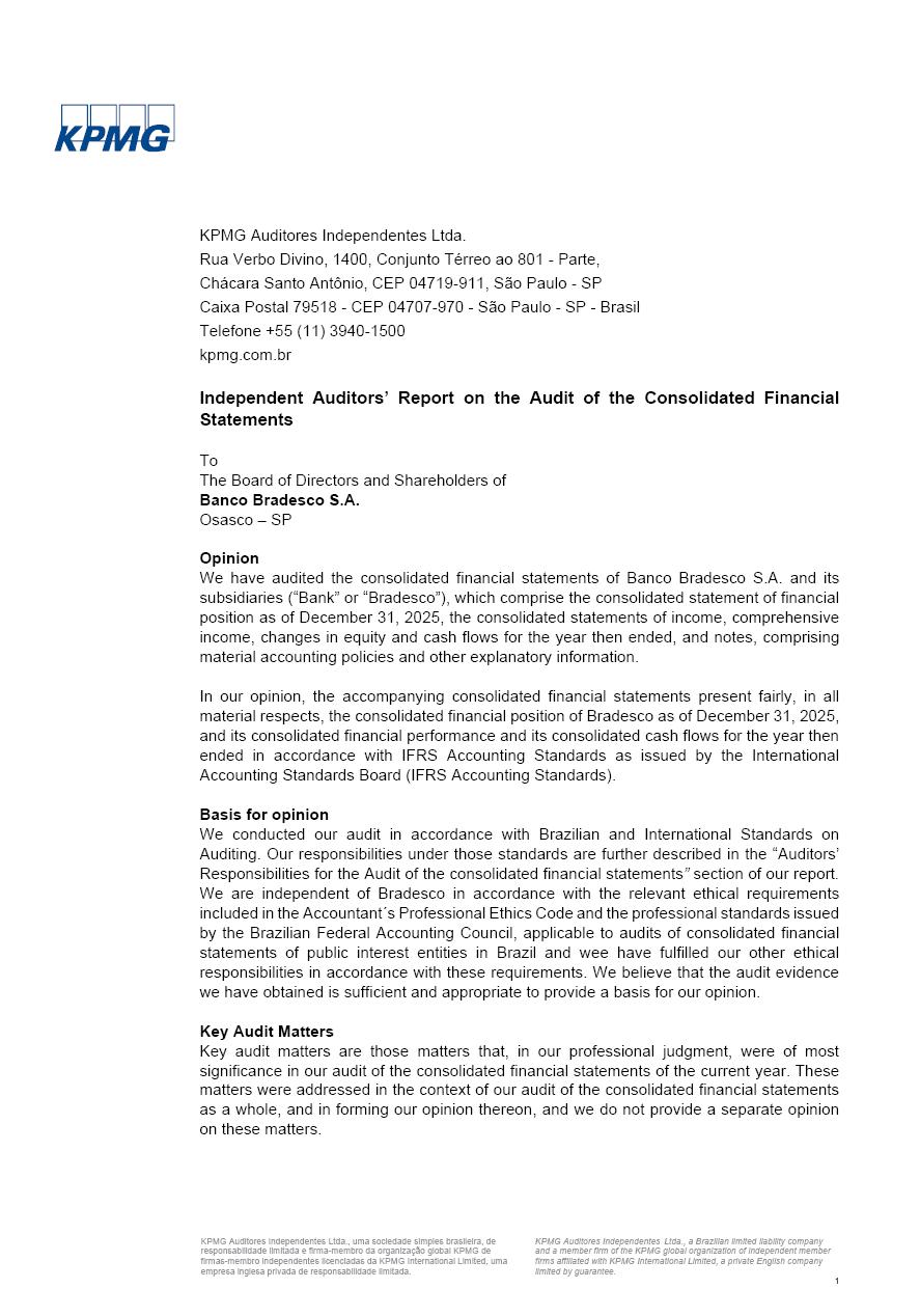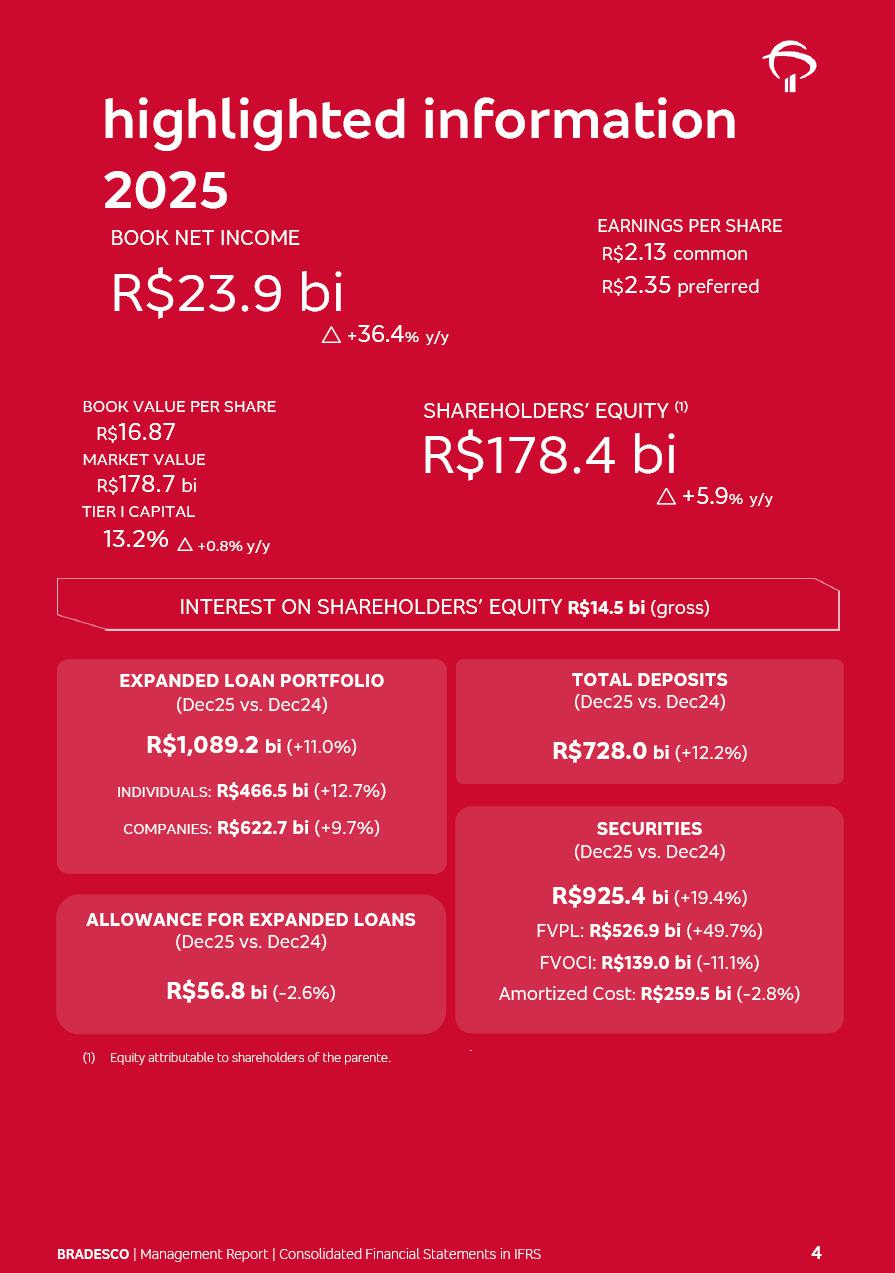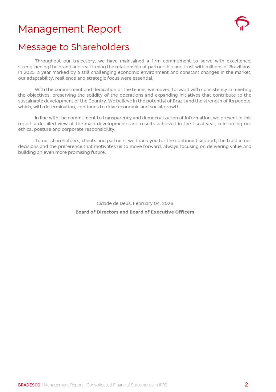 Consolidated Financial Statements 2025 in accordance with International Financial Reporting Standards (IFRS) issued by the International Accounting Standards Boards (IASB) Management Report BRADESCO | Management Report | Consolidated Financial Statements in IFRS 2 Message to Shareholders Throughout our trajectory, we have maintained a firm commitment to serve with excellence, strengthening the brand and reaffirming the relationship of partnership and trust with millions of Brazilians. In 2025, a year marked by a still challenging economic environment and constant changes in the market, our adaptability, resilience and strategic focus were essential. With the commitment and dedication of the teams, we moved forward with consistency in meeting the objectives, preserving the solidity of the operations and expanding initiatives that contribute to the sustainable development of the Country. We believe in the potential of Brazil and the strength of its people, which, with determination, continues to drive economic and social growth. In line with the commitment to transparency and democratization of information, we present in this report a detailed view of the main developments and results achieved in the fiscal year, reinforcing our ethical posture and corporate responsibility. To our shareholders, clients and partners, we thank you for the continued support, the trust in our decisions and the preference that motivates us to move forward, always focusing on delivering value and building an even more promising future. Cidade de Deus, February 04, 2026 Board of Directors and Board of Executive Officers Management Report BRADESCO | Management Report | Consolidated Financial Statements in IFRS 3 Dear Shareholders, We hereby present the Consolidated Financial Statements of Banco Bradesco S.A. related to 2025. We follow all International Financial Reporting Standards (IFRS) practices issued by the International Accounting Standards Board (IASB). Economic Comment The Brazilian economy slowed down in the second half of 2025. The household consumption lost traction throughout the year, responding to the restrictive monetary policy. One-off factors may lead to some re-acceleration of the GDP at the beginning of the year, but our projections indicate a weaker growth in 2026. Inflation closed 2025 within the target range two years above it, with important contributions from exchange rate valuation and accommodation of the economic activity. We believe that deflation will continue in the coming months, allowing the Central Bank of Brazil to start cutting the basic interest rate later this quarter. Uncertainties remain high on the international scene. While the US economy remains resilient, doubts about the US economic policy represent an important risk vector for the global economy. This context is aggravated by geopolitical disputes around the world. Highlights in the period In November 2025, Banco Bradesco S.A. (“Bradesco”) noticed to its shareholders and the market in general the Notice to the Market that Atlântica Hospitais and Participações S.A., a company focused on investment in hospitals, indirectly controlled by Bradesco and Bradseg Participações S.A., firmed an Investment Agreement with Rede D’Or São Luiz S.A. Group for the inclusion of Maternidade São Luiz Star, thus expanding the partnership firmed with Rede D’Or. The expansion of the Partnership is aligned with the strategy of Atlântica to invest in the health sector value chain through partnerships with players established in the operation of hospitals. In December 2025, Bradesco noticed to its shareholders and the market in general, through a Relevant Fact, that the proposal of the Company’s Board of Directors was approved for the payment of complementary interest on own equity, in the total amount of R$3,9 billion, of which R$0.351190748 per common share and R$0.386309823 per preferred share. Closing the fourth quarter of 2025, the Annual Calendar of Corporate Events for 2026 was released and, through a Notice to Shareholders, the planned schedule of the monthly payment of interest on own equity for the fiscal year of 2026, in accordance with the Systematic Monthly Payment of Interest on Own Equity. The disclosure of both documents reinforces Bradesco’s commitment to transparency, predictability and strategic alignment with shareholders and other stakeholders. BRADESCO | Management Report | Consolidated Financial Statements in IFRS 4 . highlighted information 2025 TOTAL DEPOSITS (Dec25 vs. Dec24) R$728.0 bi (+12.2%) R$23.9 bi R$178.4 bi +5.9% y/y EARNINGS PER SHARE BOOK VALUE PER SHARE BOOK NET INCOME R$2.13 common R$2.35 preferred R$16.87 SHAREHOLDERS’ EQUITY (1) MARKET VALUE TIER I CAPITAL R$178.7 bi 13.2% SECURITIES (Dec25 vs. Dec24) R$925.4 bi (+19.4%) FVPL: R$526.9 bi (+49.7%) FVOCI: R$139.0 bi (-11.1%) Amortized Cost: R$259.5 bi (-2.8%) EXPANDED LOAN PORTFOLIO (Dec25 vs. Dec24) R$1,089.2 bi (+11.0%) INDIVIDUALS: R$466.5 bi (+12.7%) COMPANIES: R$622.7 bi (+9.7%) ALLOWANCE FOR EXPANDED LOANS (Dec25 vs. Dec24) R$56.8 bi (-2.6%) INTEREST ON SHAREHOLDERS’ EQUITY R$14.5 bi (gross) +36.4% y/y (1) Equity attributable to shareholders of the parente. +0.8% y/y BRADESCO | Management Report | Consolidated Financial Statements in IFRS 5 Technology and innovation In two years of transformation, technology has become the core value leverage at Bradesco, providing more fluid and personalized customer experience, scalable operational efficiency with agility, security with cyber resilience and real-time prevention. With Agile@Scale, co-managed tribes between business and IT have increased efficiency, quality and value deliveries. In the period, we reduced the lead time by 43% and increased productivity by increasing the volume of deliveries to the business by 118% (vs. Dec23). The implementation of the AI First plan and the consolidation of the Bridge platform have democratized the use of GenAI in products and channels, with gov