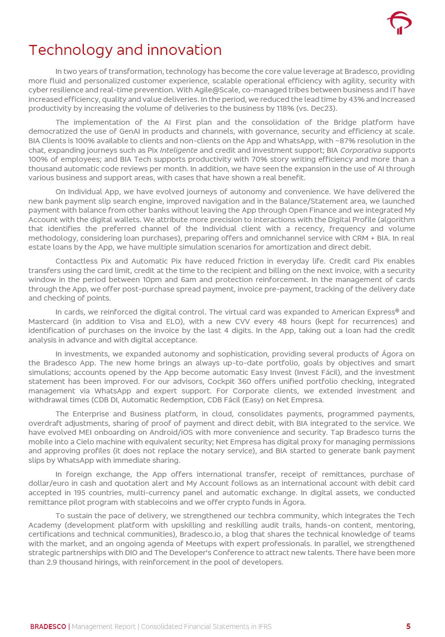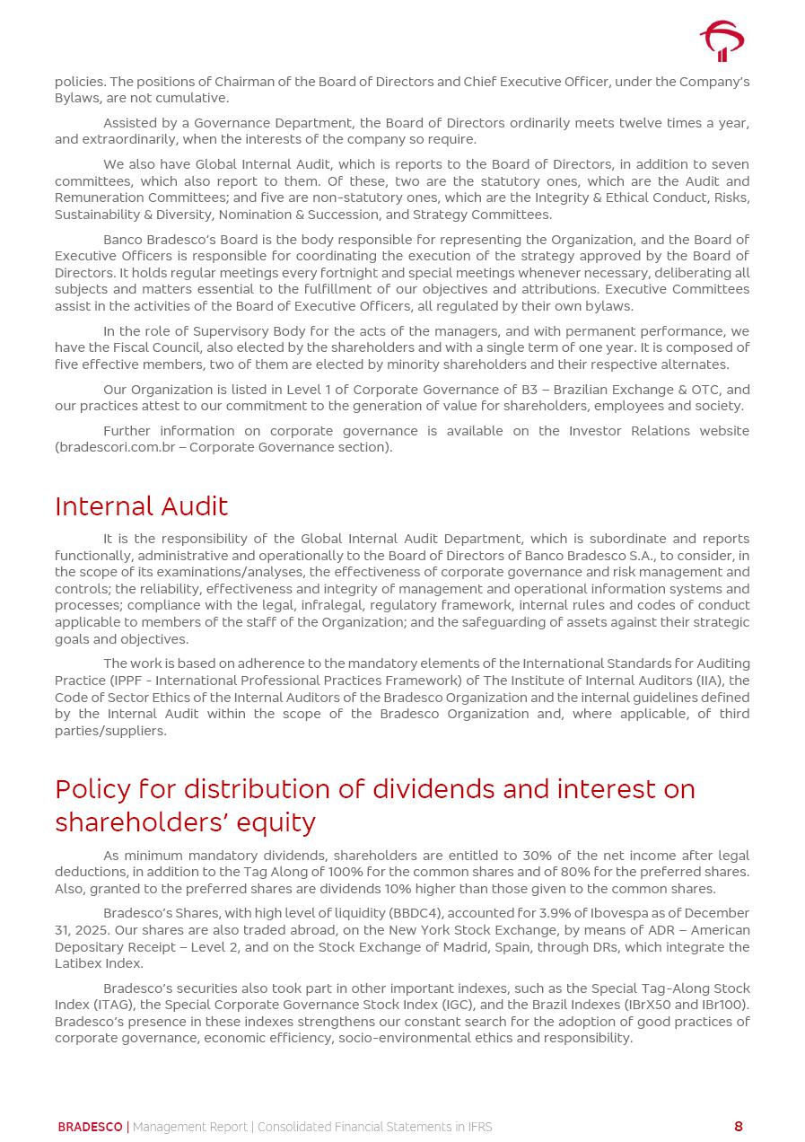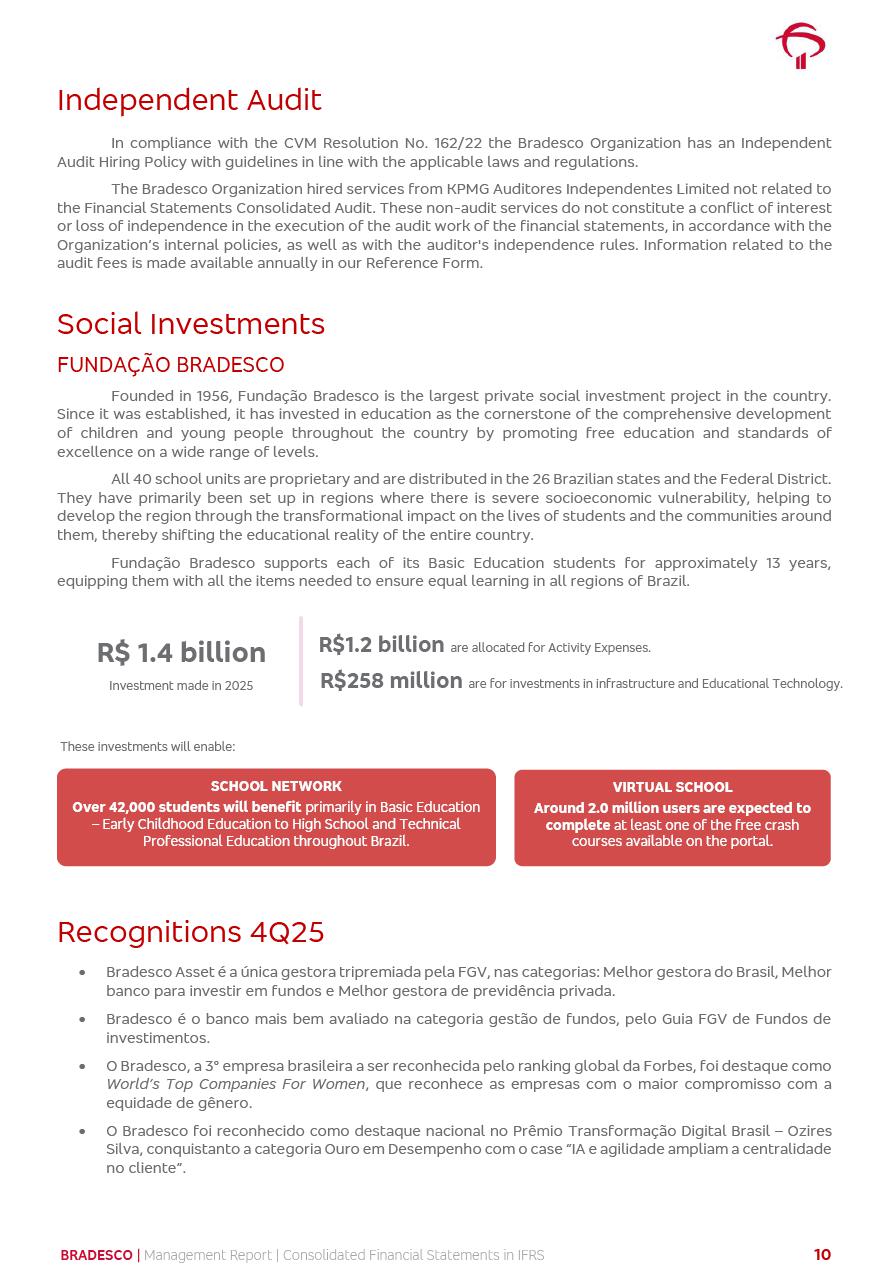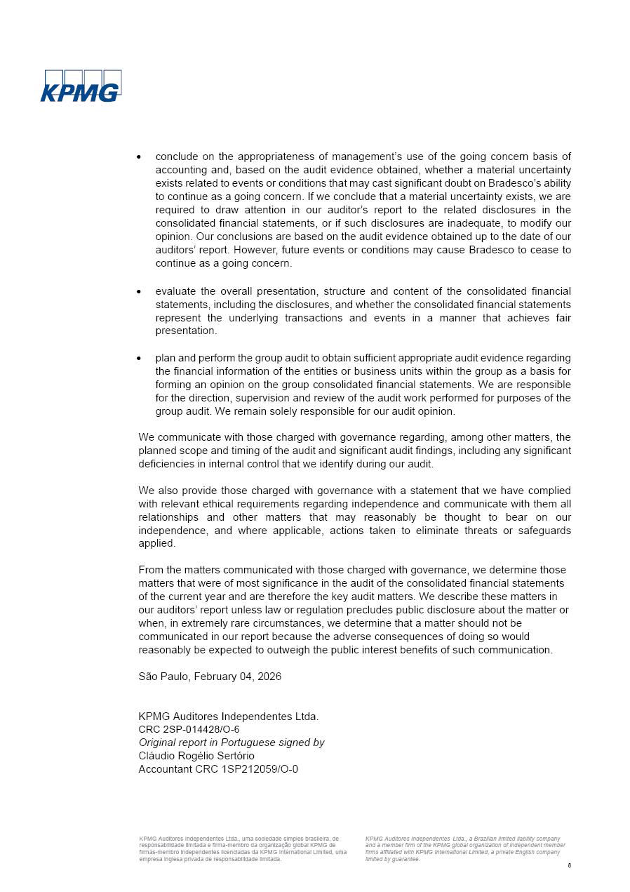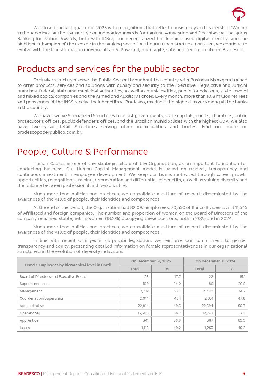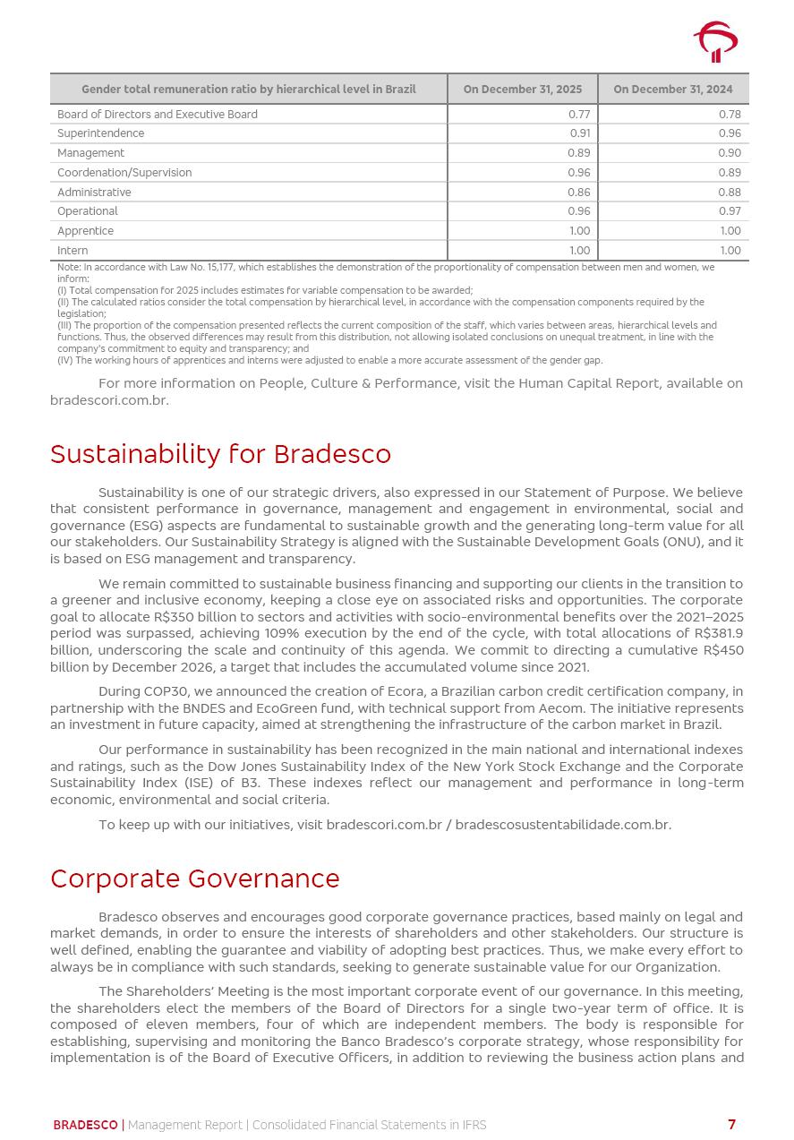 Consolidated Financial Statements 2025 in accordance with International Financial Reporting Standards (IFRS) issued by the International Accounting Standards Boards (IASB) Management Report BRADESCO | Management Report | Consolidated Financial Statements in IFRS 2 Message to Shareholders Throughout our trajectory, we have maintained a firm commitment to serve with excellence, strengthening the brand and reaffirming the relationship of partnership and trust with millions of Brazilians. In 2025, a year marked by a still challenging economic environment and constant changes in the market, our adaptability, resilience and strategic focus were essential. With the commitment and dedication of the teams, we moved forward with consistency in meeting the objectives, preserving the solidity of the operations and expanding initiatives that contribute to the sustainable development of the Country. We believe in the potential of Brazil and the strength of its people, which, with determination, continues to drive economic and social growth. In line with the commitment to transparency and democratization of information, we present in this report a detailed view of the main developments and results achieved in the fiscal year, reinforcing our ethical posture and corporate responsibility. To our shareholders, clients and partners, we thank you for the continued support, the trust in our decisions and the preference that motivates us to move forward, always focusing on delivering value and building an even more promising future. Cidade de Deus, February 04, 2026 Board of Directors and Board of Executive Officers Management Report BRADESCO | Management Report | Consolidated Financial Statements in IFRS 3 Dear Shareholders, We hereby present the Consolidated Financial Statements of Banco Bradesco S.A. related to 2025. We follow all International Financial Reporting Standards (IFRS) practices issued by the International Accounting Standards Board (IASB). Economic Comment The Brazilian economy slowed down in the second half of 2025. The household consumption lost traction throughout the year, responding to the restrictive monetary policy. One-off factors may lead to some re-acceleration of the GDP at the beginning of the year, but our projections indicate a weaker growth in 2026. Inflation closed 2025 within the target range two years above it, with important contributions from exchange rate valuation and accommodation of the economic activity. We believe that deflation will continue in the coming months, allowing the Central Bank of Brazil to start cutting the basic interest rate later this quarter. Uncertainties remain high on the international scene. While the US economy remains resilient, doubts about the US economic policy represent an important risk vector for the global economy. This context is aggravated by geopolitical disputes around the world. Highlights in the period In November 2025, Banco Bradesco S.A. (“Bradesco”) noticed to its shareholders and the market in general the Notice to the Market that Atlântica Hospitais and Participações S.A., a company focused on investment in hospitals, indirectly controlled by Bradesco and Bradseg Participações S.A., firmed an Investment Agreement with Rede D’Or São Luiz S.A. Group for the inclusion of Maternidade São Luiz Star, thus expanding the partnership firmed with Rede D’Or. The expansion of the Partnership is aligned with the strategy of Atlântica to invest in the health sector value chain through partnerships with players established in the operation of hospitals. In December 2025, Bradesco noticed to its shareholders and the market in general, through a Relevant Fact, that the proposal of the Company’s Board of Directors was approved for the payment of complementary interest on own equity, in the total amount of R$3,9 billion, of which R$0.351190748 per common share and R$0.386309823 per preferred share. Closing the fourth quarter of 2025, the Annual Calendar of Corporate Events for 2026 was released and, through a Notice to Shareholders, the planned schedule of the monthly payment of interest on own equity for the fiscal year of 2026, in accordance with the Systematic Monthly Payment of Interest on Own Equity. The disclosure of both documents reinforces Bradesco’s commitment to transparency, predictability and strategic alignment with shareholders and other stakeholders. BRADESCO | Management Report | Consolidated Financial Statements in IFRS 4 . highlighted information 2025 TOTAL DEPOSITS (Dec25 vs. Dec24) R$728.0 bi (+12.2%) R$23.9 bi R$178.4 bi +5.9% y/y EARNINGS PER SHARE BOOK VALUE PER SHARE BOOK NET INCOME R$2.13 common R$2.35 preferred R$16.87 SHAREHOLDERS’ EQUITY (1) MARKET VALUE TIER I CAPITAL R$178.7 bi 13.2% SECURITIES (Dec25 vs. Dec24) R$925.4 bi (+19.4%) FVPL: R$526.9 bi (+49.7%) FVOCI: R$139.0 bi (-11.1%) Amortized Cost: R$259.5 bi (-2.8%) EXPANDED LOAN PORTFOLIO (Dec25 vs. Dec24) R$1,089.2 bi (+11.0%) INDIVIDUALS: R$466.5 bi (+12.7%) COMPANIES: R$622.7 bi (+9.7%) ALLOWANCE FOR EXPANDED LOANS (Dec25 vs. Dec24) R$56.8 bi (-2.6%) INTEREST ON SHAREHOLDERS’ EQUITY R$14.5 bi (gross) +36.4% y/y (1) Equity attributable to shareholders of the parente. +0.8% y/y BRADESCO | Management Report | Consolidated Financial Statements in IFRS 5 Technology and innovation In two years of transformation, technology has become the core value leverage at Bradesco, providing more fluid and personalized customer experience, scalable operational efficiency with agility, security with cyber resilience and real-time prevention. With Agile@Scale, co-managed tribes between business and IT have increased efficiency, quality and value deliveries. In the period, we reduced the lead time by 43% and increased productivity by increasing the volume of deliveries to the business by 118% (vs. Dec23). The implementation of the AI First plan and the consolidation of the Bridge platform have democratized the use of GenAI in products and channels, with gov