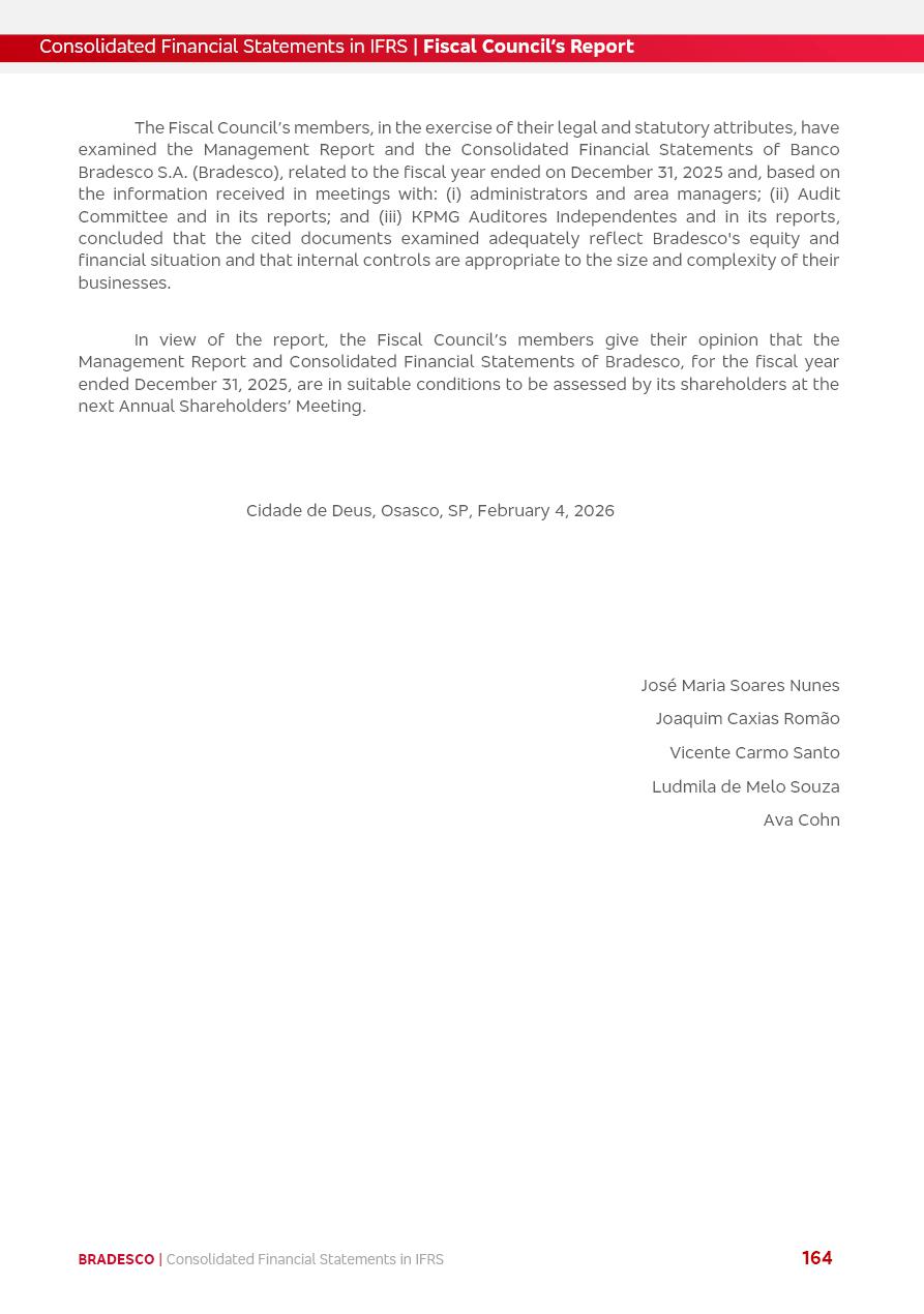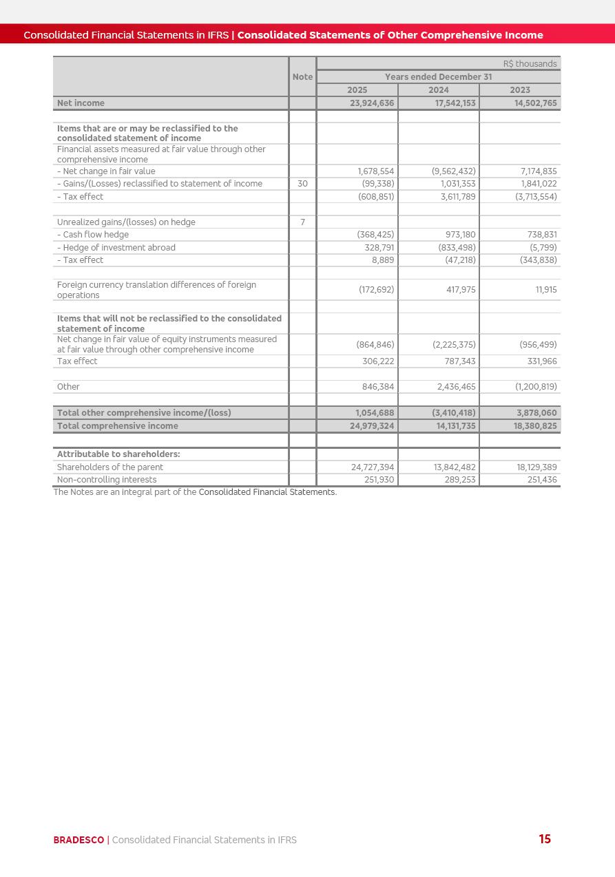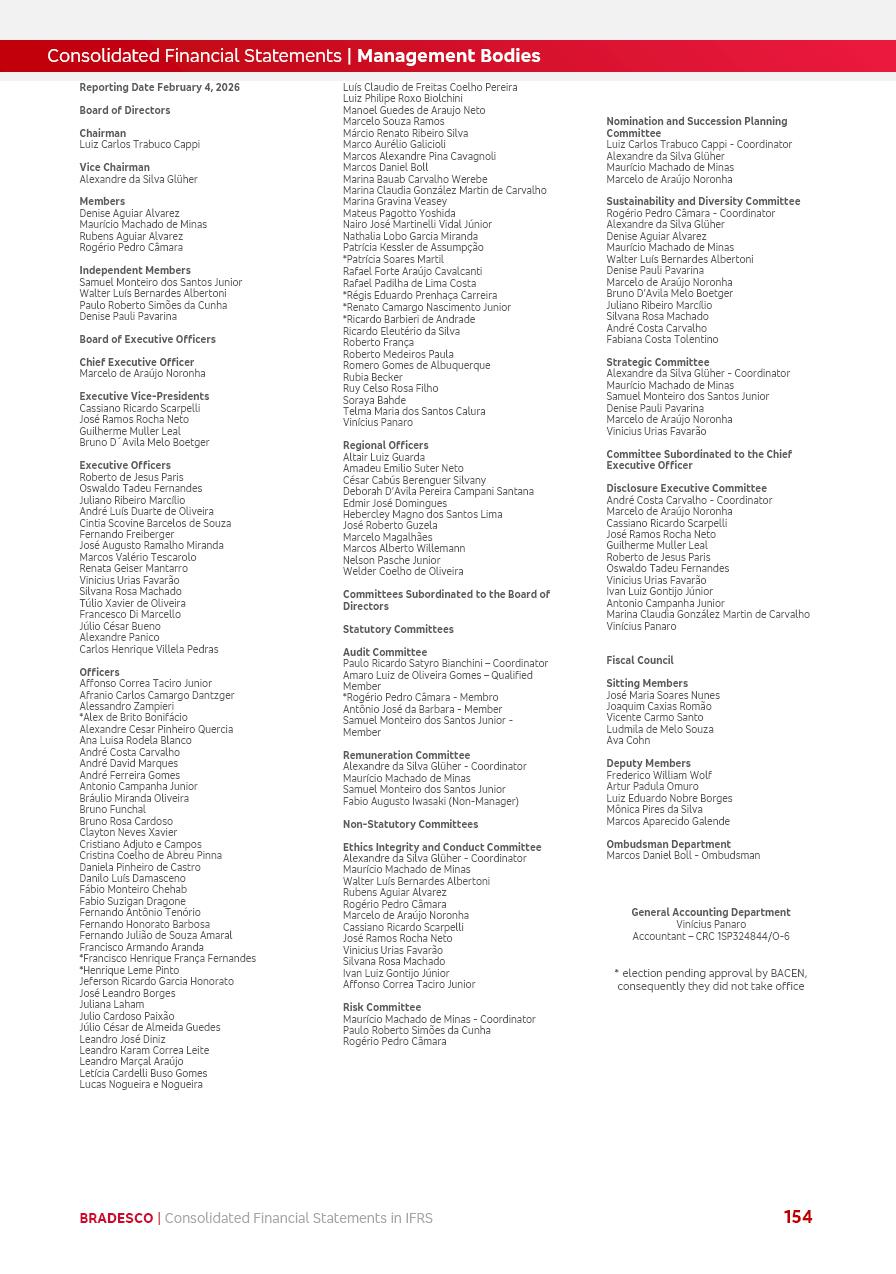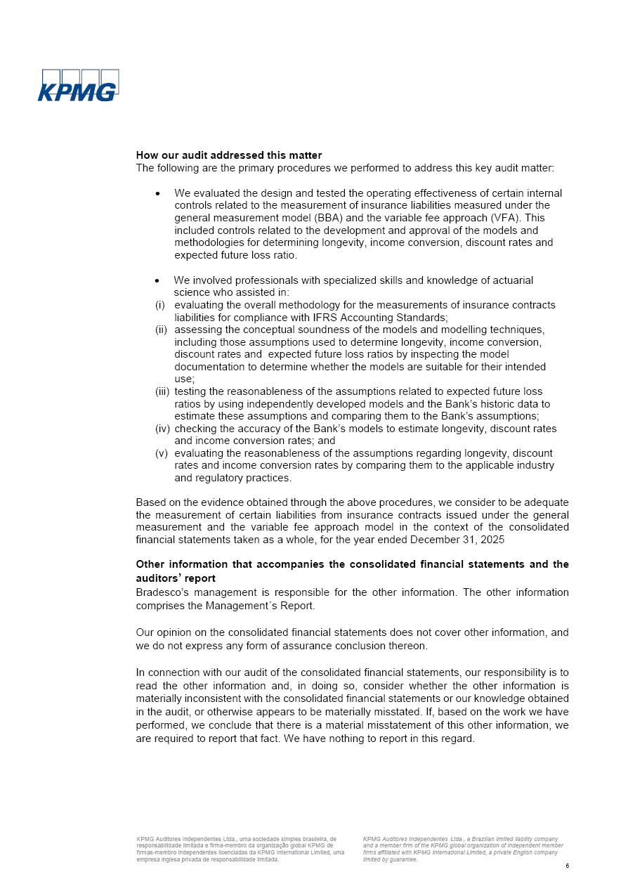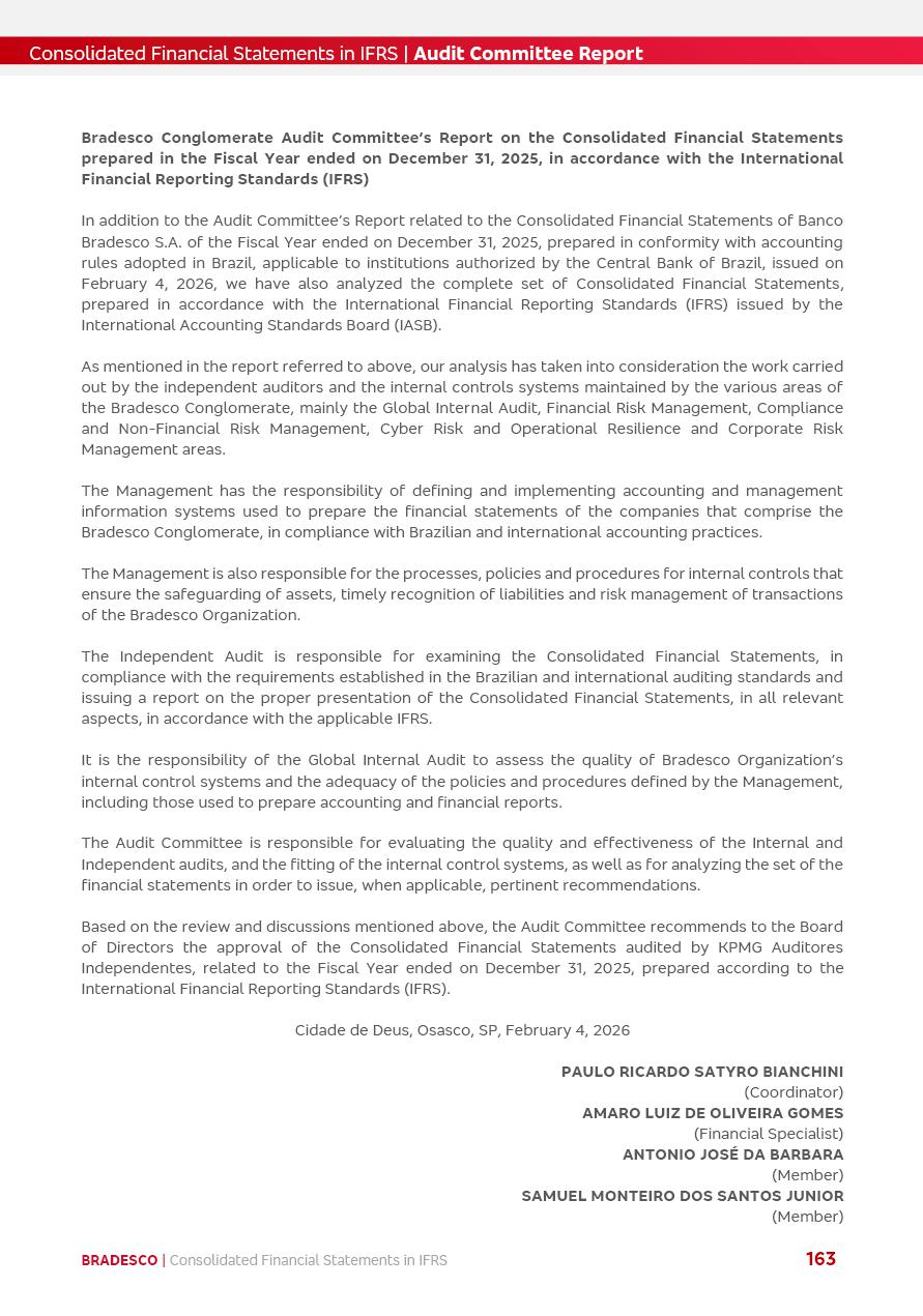 Consolidated Financial Statements 2025 in accordance with International Financial Reporting Standards (IFRS) issued by the International Accounting Standards Boards (IASB) Management Report BRADESCO | Management Report | Consolidated Financial Statements in IFRS 2 Message to Shareholders Throughout our trajectory, we have maintained a firm commitment to serve with excellence, strengthening the brand and reaffirming the relationship of partnership and trust with millions of Brazilians. In 2025, a year marked by a still challenging economic environment and constant changes in the market, our adaptability, resilience and strategic focus were essential. With the commitment and dedication of the teams, we moved forward with consistency in meeting the objectives, preserving the solidity of the operations and expanding initiatives that contribute to the sustainable development of the Country. We believe in the potential of Brazil and the strength of its people, which, with determination, continues to drive economic and social growth. In line with the commitment to transparency and democratization of information, we present in this report a detailed view of the main developments and results achieved in the fiscal year, reinforcing our ethical posture and corporate responsibility. To our shareholders, clients and partners, we thank you for the continued support, the trust in our decisions and the preference that motivates us to move forward, always focusing on delivering value and building an even more promising future. Cidade de Deus, February 04, 2026 Board of Directors and Board of Executive Officers Management Report BRADESCO | Management Report | Consolidated Financial Statements in IFRS 3 Dear Shareholders, We hereby present the Consolidated Financial Statements of Banco Bradesco S.A. related to 2025. We follow all International Financial Reporting Standards (IFRS) practices issued by the International Accounting Standards Board (IASB). Economic Comment The Brazilian economy slowed down in the second half of 2025. The household consumption lost traction throughout the year, responding to the restrictive monetary policy. One-off factors may lead to some re-acceleration of the GDP at the beginning of the year, but our projections indicate a weaker growth in 2026. Inflation closed 2025 within the target range two years above it, with important contributions from exchange rate valuation and accommodation of the economic activity. We believe that deflation will continue in the coming months, allowing the Central Bank of Brazil to start cutting the basic interest rate later this quarter. Uncertainties remain high on the international scene. While the US economy remains resilient, doubts about the US economic policy represent an important risk vector for the global economy. This context is aggravated by geopolitical disputes around the world. Highlights in the period In November 2025, Banco Bradesco S.A. (“Bradesco”) noticed to its shareholders and the market in general the Notice to the Market that Atlântica Hospitais and Participações S.A., a company focused on investment in hospitals, indirectly controlled by Bradesco and Bradseg Participações S.A., firmed an Investment Agreement with Rede D’Or São Luiz S.A. Group for the inclusion of Maternidade São Luiz Star, thus expanding the partnership firmed with Rede D’Or. The expansion of the Partnership is aligned with the strategy of Atlântica to invest in the health sector value chain through partnerships with players established in the operation of hospitals. In December 2025, Bradesco noticed to its shareholders and the market in general, through a Relevant Fact, that the proposal of the Company’s Board of Directors was approved for the payment of complementary interest on own equity, in the total amount of R$3,9 billion, of which R$0.351190748 per common share and R$0.386309823 per preferred share. Closing the fourth quarter of 2025, the Annual Calendar of Corporate Events for 2026 was released and, through a Notice to Shareholders, the planned schedule of the monthly payment of interest on own equity for the fiscal year of 2026, in accordance with the Systematic Monthly Payment of Interest on Own Equity. The disclosure of both documents reinforces Bradesco’s commitment to transparency, predictability and strategic alignment with shareholders and other stakeholders. BRADESCO | Management Report | Consolidated Financial Statements in IFRS 4 . highlighted information 2025 TOTAL DEPOSITS (Dec25 vs. Dec24) R$728.0 bi (+12.2%) R$23.9 bi R$178.4 bi +5.9% y/y EARNINGS PER SHARE BOOK VALUE PER SHARE BOOK NET INCOME R$2.13 common R$2.35 preferred R$16.87 SHAREHOLDERS’ EQUITY (1) MARKET VALUE TIER I CAPITAL R$178.7 bi 13.2% SECURITIES (Dec25 vs. Dec24) R$925.4 bi (+19.4%) FVPL: R$526.9 bi (+49.7%) FVOCI: R$139.0 bi (-11.1%) Amortized Cost: R$259.5 bi (-2.8%) EXPANDED LOAN PORTFOLIO (Dec25 vs. Dec24) R$1,089.2 bi (+11.0%) INDIVIDUALS: R$466.5 bi (+12.7%) COMPANIES: R$622.7 bi (+9.7%) ALLOWANCE FOR EXPANDED LOANS (Dec25 vs. Dec24) R$56.8 bi (-2.6%) INTEREST ON SHAREHOLDERS’ EQUITY R$14.5 bi (gross) +36.4% y/y (1) Equity attributable to shareholders of the parente. +0.8% y/y BRADESCO | Management Report | Consolidated Financial Statements in IFRS 5 Technology and innovation In two years of transformation, technology has become the core value leverage at Bradesco, providing more fluid and personalized customer experience, scalable operational efficiency with agility, security with cyber resilience and real-time prevention. With Agile@Scale, co-managed tribes between business and IT have increased efficiency, quality and value deliveries. In the period, we reduced the lead time by 43% and increased productivity by increasing the volume of deliveries to the business by 118% (vs. Dec23). The implementation of the AI First plan and the consolidation of the Bridge platform have democratized the use of GenAI in products and channels, with gov