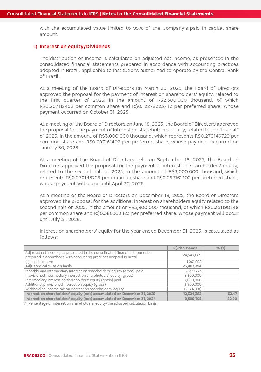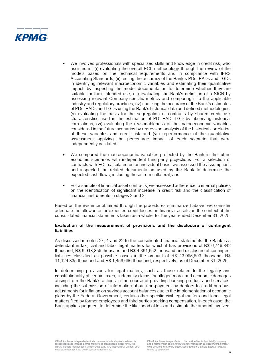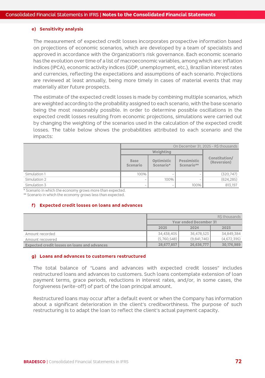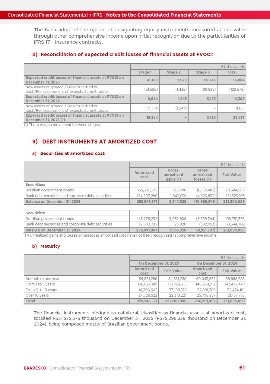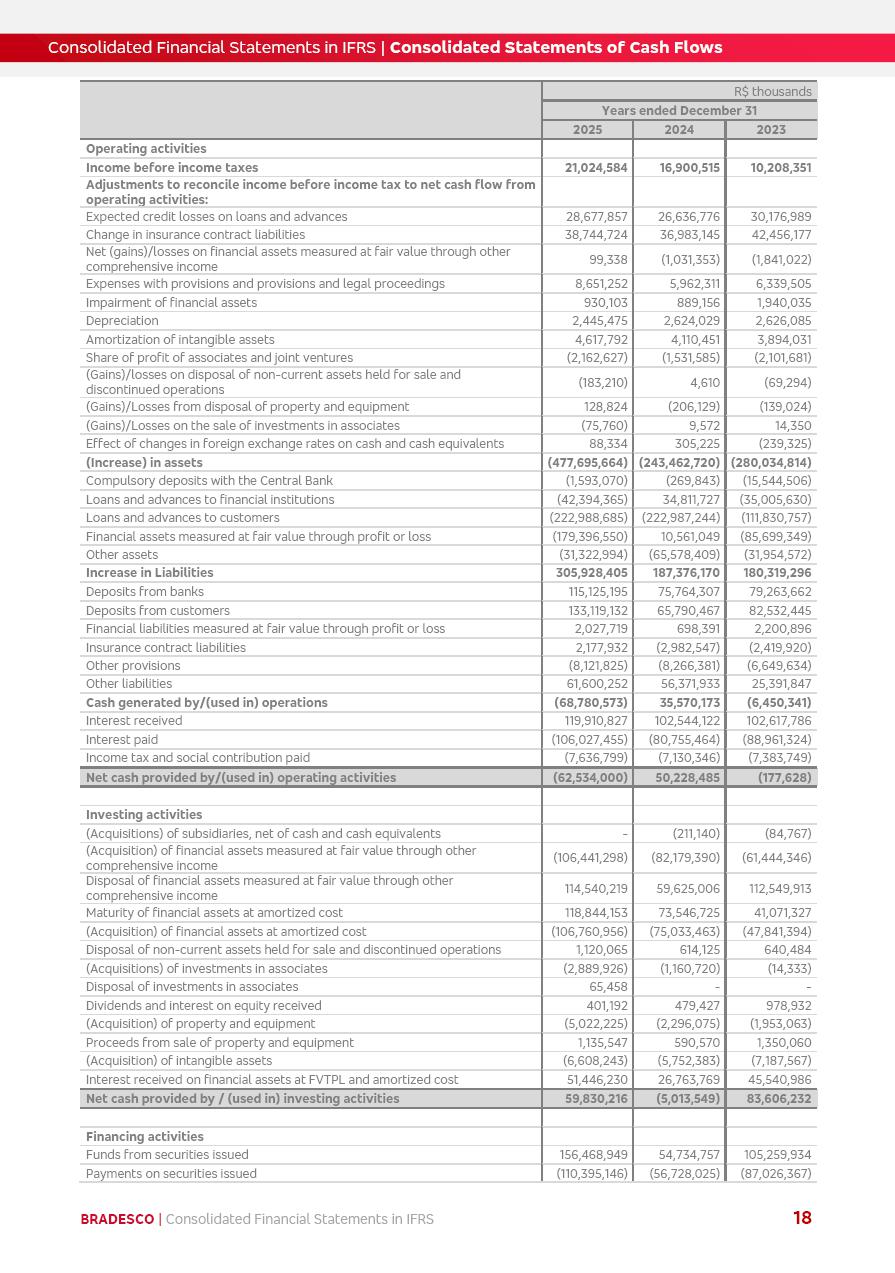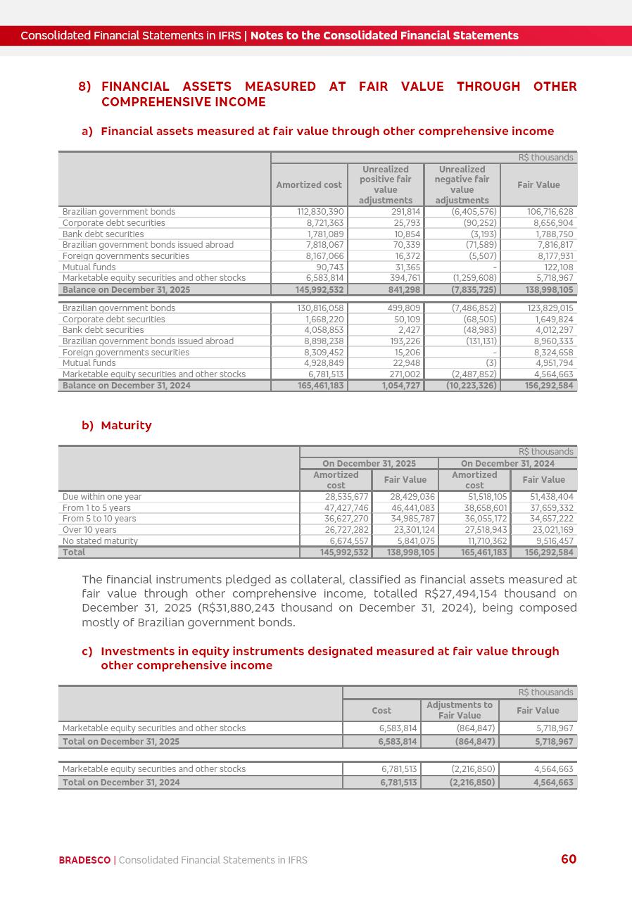 Consolidated Financial Statements 2025 in accordance with International Financial Reporting Standards (IFRS) issued by the International Accounting Standards Boards (IASB) Management Report BRADESCO | Management Report | Consolidated Financial Statements in IFRS 2 Message to Shareholders Throughout our trajectory, we have maintained a firm commitment to serve with excellence, strengthening the brand and reaffirming the relationship of partnership and trust with millions of Brazilians. In 2025, a year marked by a still challenging economic environment and constant changes in the market, our adaptability, resilience and strategic focus were essential. With the commitment and dedication of the teams, we moved forward with consistency in meeting the objectives, preserving the solidity of the operations and expanding initiatives that contribute to the sustainable development of the Country. We believe in the potential of Brazil and the strength of its people, which, with determination, continues to drive economic and social growth. In line with the commitment to transparency and democratization of information, we present in this report a detailed view of the main developments and results achieved in the fiscal year, reinforcing our ethical posture and corporate responsibility. To our shareholders, clients and partners, we thank you for the continued support, the trust in our decisions and the preference that motivates us to move forward, always focusing on delivering value and building an even more promising future. Cidade de Deus, February 04, 2026 Board of Directors and Board of Executive Officers Management Report BRADESCO | Management Report | Consolidated Financial Statements in IFRS 3 Dear Shareholders, We hereby present the Consolidated Financial Statements of Banco Bradesco S.A. related to 2025. We follow all International Financial Reporting Standards (IFRS) practices issued by the International Accounting Standards Board (IASB). Economic Comment The Brazilian economy slowed down in the second half of 2025. The household consumption lost traction throughout the year, responding to the restrictive monetary policy. One-off factors may lead to some re-acceleration of the GDP at the beginning of the year, but our projections indicate a weaker growth in 2026. Inflation closed 2025 within the target range two years above it, with important contributions from exchange rate valuation and accommodation of the economic activity. We believe that deflation will continue in the coming months, allowing the Central Bank of Brazil to start cutting the basic interest rate later this quarter. Uncertainties remain high on the international scene. While the US economy remains resilient, doubts about the US economic policy represent an important risk vector for the global economy. This context is aggravated by geopolitical disputes around the world. Highlights in the period In November 2025, Banco Bradesco S.A. (“Bradesco”) noticed to its shareholders and the market in general the Notice to the Market that Atlântica Hospitais and Participações S.A., a company focused on investment in hospitals, indirectly controlled by Bradesco and Bradseg Participações S.A., firmed an Investment Agreement with Rede D’Or São Luiz S.A. Group for the inclusion of Maternidade São Luiz Star, thus expanding the partnership firmed with Rede D’Or. The expansion of the Partnership is aligned with the strategy of Atlântica to invest in the health sector value chain through partnerships with players established in the operation of hospitals. In December 2025, Bradesco noticed to its shareholders and the market in general, through a Relevant Fact, that the proposal of the Company’s Board of Directors was approved for the payment of complementary interest on own equity, in the total amount of R$3,9 billion, of which R$0.351190748 per common share and R$0.386309823 per preferred share. Closing the fourth quarter of 2025, the Annual Calendar of Corporate Events for 2026 was released and, through a Notice to Shareholders, the planned schedule of the monthly payment of interest on own equity for the fiscal year of 2026, in accordance with the Systematic Monthly Payment of Interest on Own Equity. The disclosure of both documents reinforces Bradesco’s commitment to transparency, predictability and strategic alignment with shareholders and other stakeholders. BRADESCO | Management Report | Consolidated Financial Statements in IFRS 4 . highlighted information 2025 TOTAL DEPOSITS (Dec25 vs. Dec24) R$728.0 bi (+12.2%) R$23.9 bi R$178.4 bi +5.9% y/y EARNINGS PER SHARE BOOK VALUE PER SHARE BOOK NET INCOME R$2.13 common R$2.35 preferred R$16.87 SHAREHOLDERS’ EQUITY (1) MARKET VALUE TIER I CAPITAL R$178.7 bi 13.2% SECURITIES (Dec25 vs. Dec24) R$925.4 bi (+19.4%) FVPL: R$526.9 bi (+49.7%) FVOCI: R$139.0 bi (-11.1%) Amortized Cost: R$259.5 bi (-2.8%) EXPANDED LOAN PORTFOLIO (Dec25 vs. Dec24) R$1,089.2 bi (+11.0%) INDIVIDUALS: R$466.5 bi (+12.7%) COMPANIES: R$622.7 bi (+9.7%) ALLOWANCE FOR EXPANDED LOANS (Dec25 vs. Dec24) R$56.8 bi (-2.6%) INTEREST ON SHAREHOLDERS’ EQUITY R$14.5 bi (gross) +36.4% y/y (1) Equity attributable to shareholders of the parente. +0.8% y/y BRADESCO | Management Report | Consolidated Financial Statements in IFRS 5 Technology and innovation In two years of transformation, technology has become the core value leverage at Bradesco, providing more fluid and personalized customer experience, scalable operational efficiency with agility, security with cyber resilience and real-time prevention. With Agile@Scale, co-managed tribes between business and IT have increased efficiency, quality and value deliveries. In the period, we reduced the lead time by 43% and increased productivity by increasing the volume of deliveries to the business by 118% (vs. Dec23). The implementation of the AI First plan and the consolidation of the Bridge platform have democratized the use of GenAI in products and channels, with gov