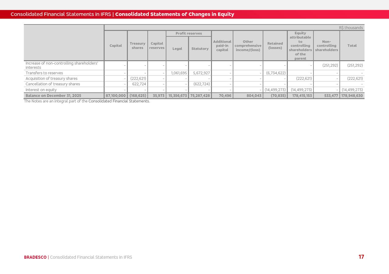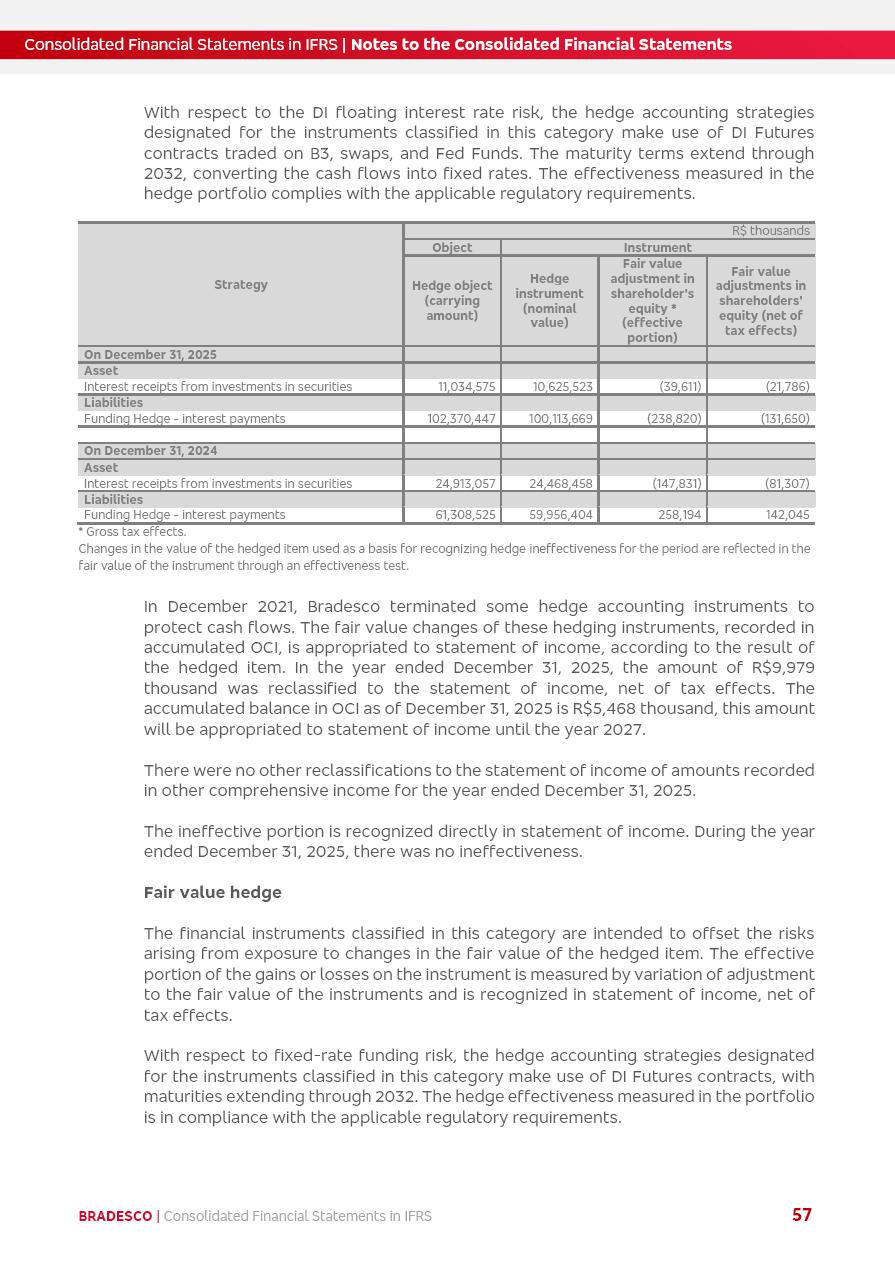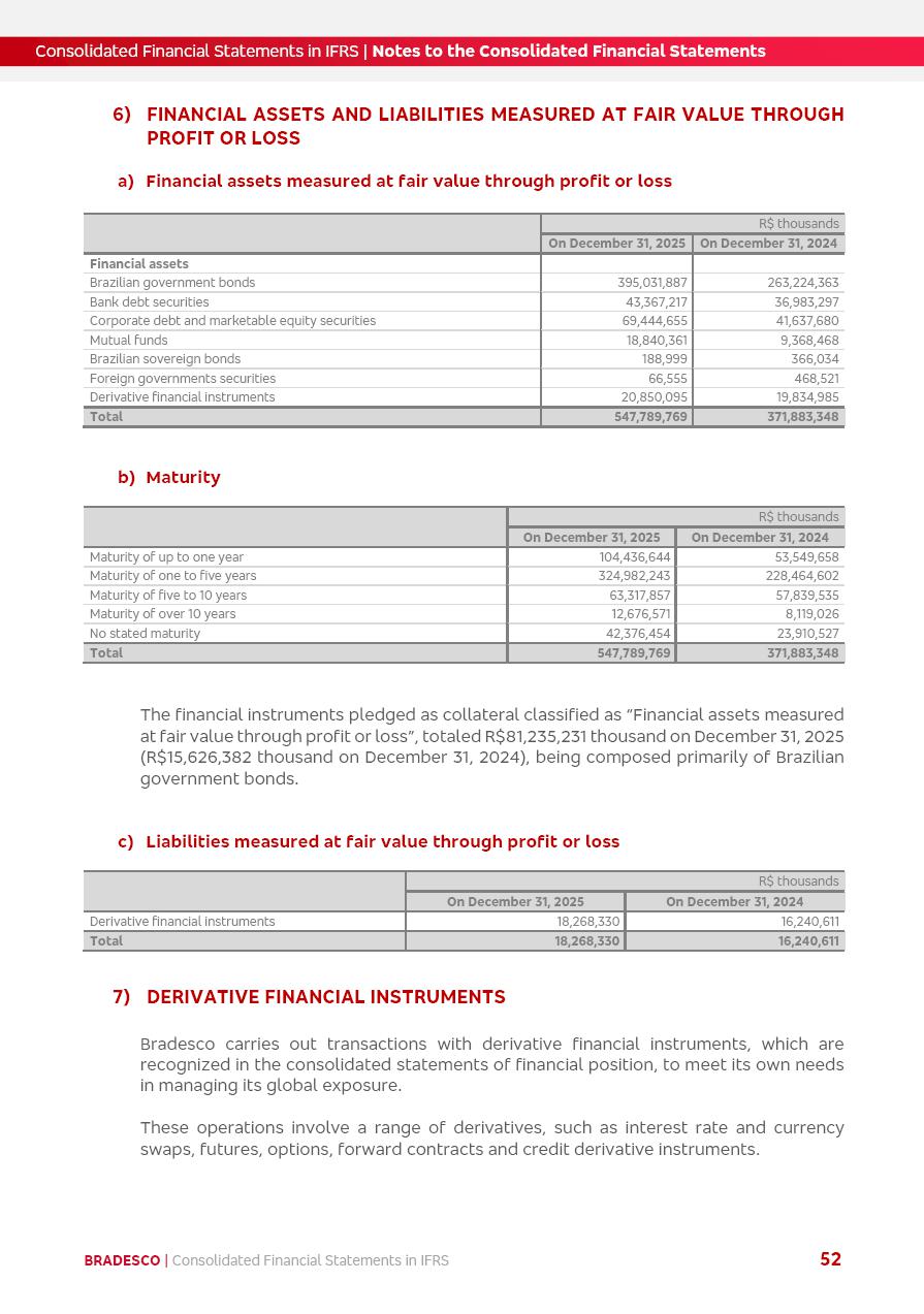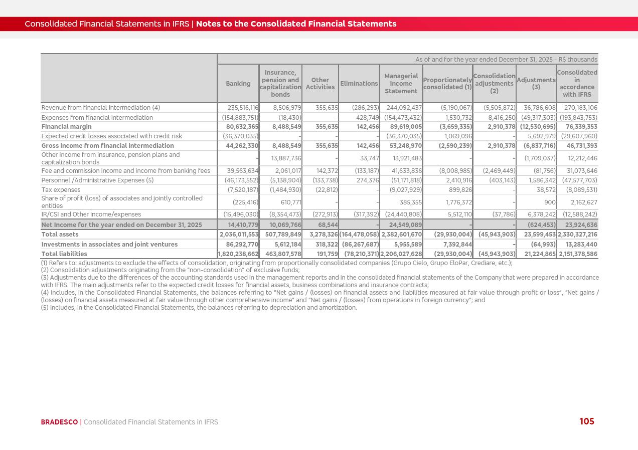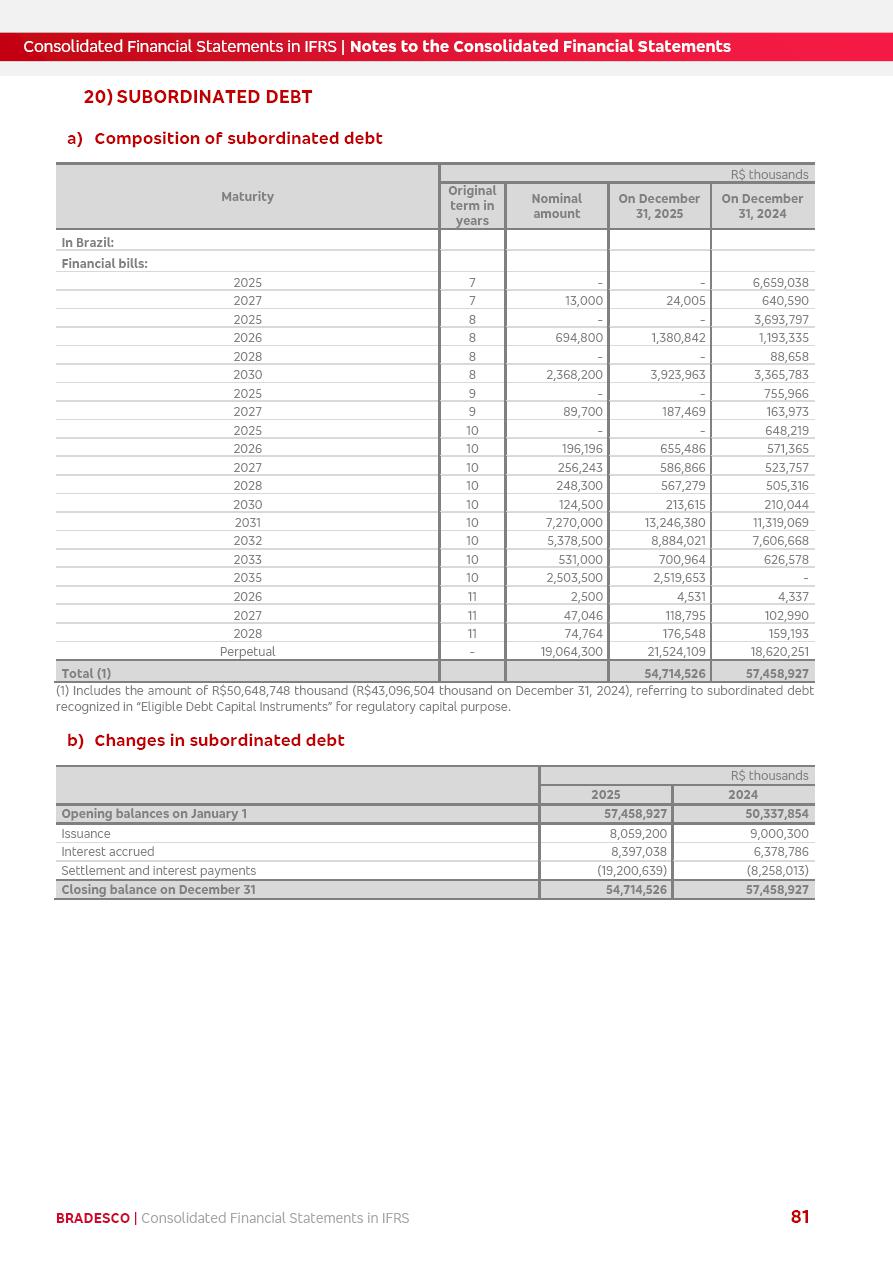 Consolidated Financial Statements 2025 in accordance with International Financial Reporting Standards (IFRS) issued by the International Accounting Standards Boards (IASB) Management Report BRADESCO | Management Report | Consolidated Financial Statements in IFRS 2 Message to Shareholders Throughout our trajectory, we have maintained a firm commitment to serve with excellence, strengthening the brand and reaffirming the relationship of partnership and trust with millions of Brazilians. In 2025, a year marked by a still challenging economic environment and constant changes in the market, our adaptability, resilience and strategic focus were essential. With the commitment and dedication of the teams, we moved forward with consistency in meeting the objectives, preserving the solidity of the operations and expanding initiatives that contribute to the sustainable development of the Country. We believe in the potential of Brazil and the strength of its people, which, with determination, continues to drive economic and social growth. In line with the commitment to transparency and democratization of information, we present in this report a detailed view of the main developments and results achieved in the fiscal year, reinforcing our ethical posture and corporate responsibility. To our shareholders, clients and partners, we thank you for the continued support, the trust in our decisions and the preference that motivates us to move forward, always focusing on delivering value and building an even more promising future. Cidade de Deus, February 04, 2026 Board of Directors and Board of Executive Officers Management Report BRADESCO | Management Report | Consolidated Financial Statements in IFRS 3 Dear Shareholders, We hereby present the Consolidated Financial Statements of Banco Bradesco S.A. related to 2025. We follow all International Financial Reporting Standards (IFRS) practices issued by the International Accounting Standards Board (IASB). Economic Comment The Brazilian economy slowed down in the second half of 2025. The household consumption lost traction throughout the year, responding to the restrictive monetary policy. One-off factors may lead to some re-acceleration of the GDP at the beginning of the year, but our projections indicate a weaker growth in 2026. Inflation closed 2025 within the target range two years above it, with important contributions from exchange rate valuation and accommodation of the economic activity. We believe that deflation will continue in the coming months, allowing the Central Bank of Brazil to start cutting the basic interest rate later this quarter. Uncertainties remain high on the international scene. While the US economy remains resilient, doubts about the US economic policy represent an important risk vector for the global economy. This context is aggravated by geopolitical disputes around the world. Highlights in the period In November 2025, Banco Bradesco S.A. (“Bradesco”) noticed to its shareholders and the market in general the Notice to the Market that Atlântica Hospitais and Participações S.A., a company focused on investment in hospitals, indirectly controlled by Bradesco and Bradseg Participações S.A., firmed an Investment Agreement with Rede D’Or São Luiz S.A. Group for the inclusion of Maternidade São Luiz Star, thus expanding the partnership firmed with Rede D’Or. The expansion of the Partnership is aligned with the strategy of Atlântica to invest in the health sector value chain through partnerships with players established in the operation of hospitals. In December 2025, Bradesco noticed to its shareholders and the market in general, through a Relevant Fact, that the proposal of the Company’s Board of Directors was approved for the payment of complementary interest on own equity, in the total amount of R$3,9 billion, of which R$0.351190748 per common share and R$0.386309823 per preferred share. Closing the fourth quarter of 2025, the Annual Calendar of Corporate Events for 2026 was released and, through a Notice to Shareholders, the planned schedule of the monthly payment of interest on own equity for the fiscal year of 2026, in accordance with the Systematic Monthly Payment of Interest on Own Equity. The disclosure of both documents reinforces Bradesco’s commitment to transparency, predictability and strategic alignment with shareholders and other stakeholders. BRADESCO | Management Report | Consolidated Financial Statements in IFRS 4 . highlighted information 2025 TOTAL DEPOSITS (Dec25 vs. Dec24) R$728.0 bi (+12.2%) R$23.9 bi R$178.4 bi +5.9% y/y EARNINGS PER SHARE BOOK VALUE PER SHARE BOOK NET INCOME R$2.13 common R$2.35 preferred R$16.87 SHAREHOLDERS’ EQUITY (1) MARKET VALUE TIER I CAPITAL R$178.7 bi 13.2% SECURITIES (Dec25 vs. Dec24) R$925.4 bi (+19.4%) FVPL: R$526.9 bi (+49.7%) FVOCI: R$139.0 bi (-11.1%) Amortized Cost: R$259.5 bi (-2.8%) EXPANDED LOAN PORTFOLIO (Dec25 vs. Dec24) R$1,089.2 bi (+11.0%) INDIVIDUALS: R$466.5 bi (+12.7%) COMPANIES: R$622.7 bi (+9.7%) ALLOWANCE FOR EXPANDED LOANS (Dec25 vs. Dec24) R$56.8 bi (-2.6%) INTEREST ON SHAREHOLDERS’ EQUITY R$14.5 bi (gross) +36.4% y/y (1) Equity attributable to shareholders of the parente. +0.8% y/y BRADESCO | Management Report | Consolidated Financial Statements in IFRS 5 Technology and innovation In two years of transformation, technology has become the core value leverage at Bradesco, providing more fluid and personalized customer experience, scalable operational efficiency with agility, security with cyber resilience and real-time prevention. With Agile@Scale, co-managed tribes between business and IT have increased efficiency, quality and value deliveries. In the period, we reduced the lead time by 43% and increased productivity by increasing the volume of deliveries to the business by 118% (vs. Dec23). The implementation of the AI First plan and the consolidation of the Bridge platform have democratized the use of GenAI in products and channels, with gov