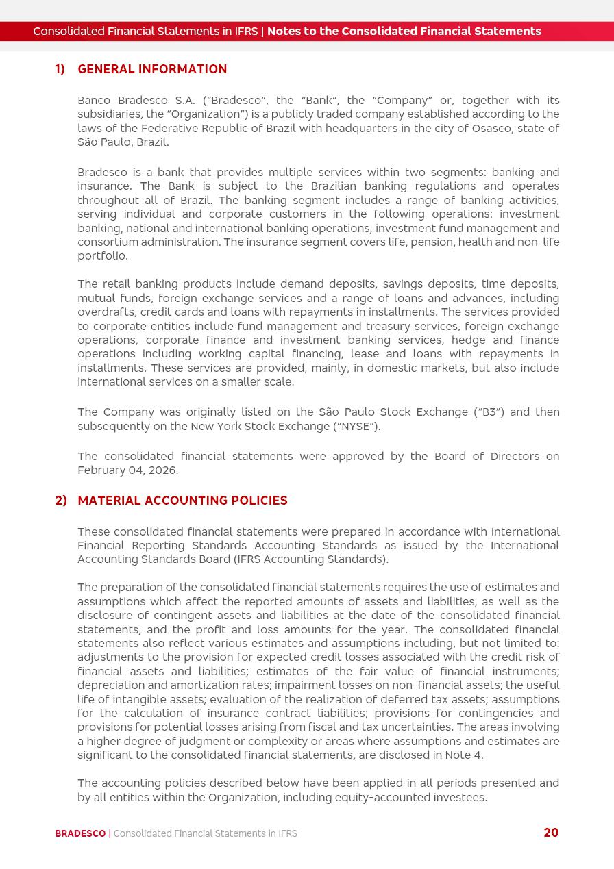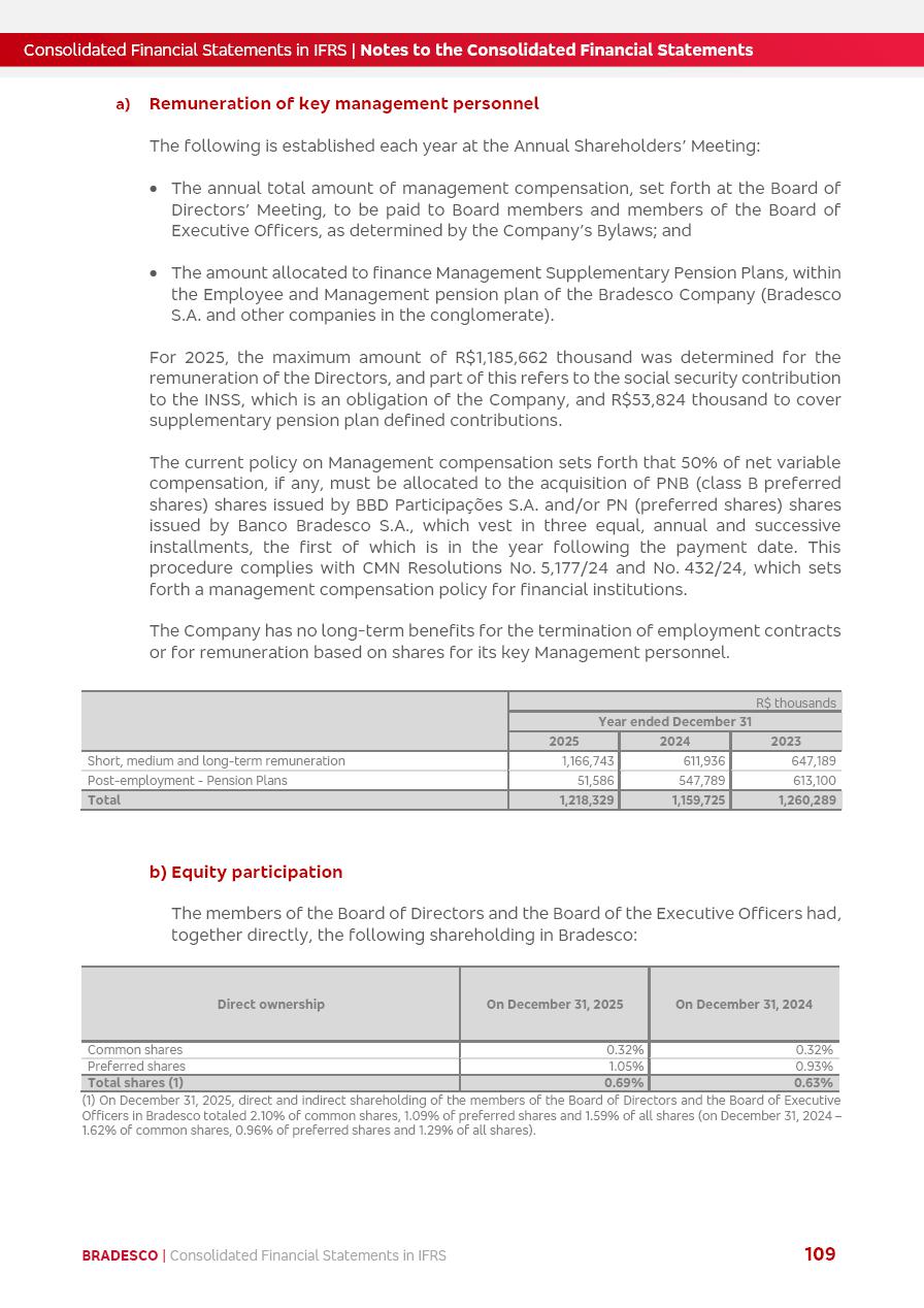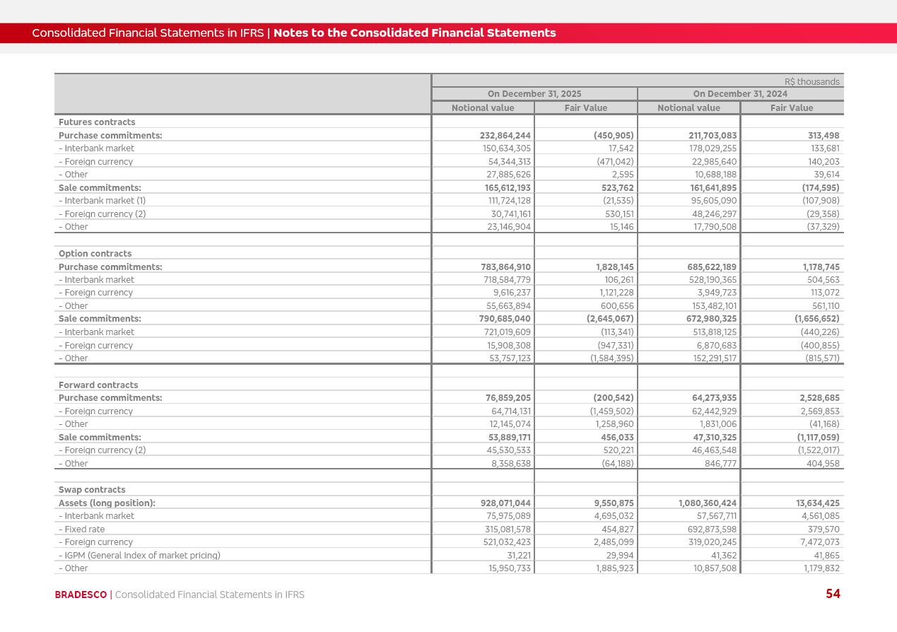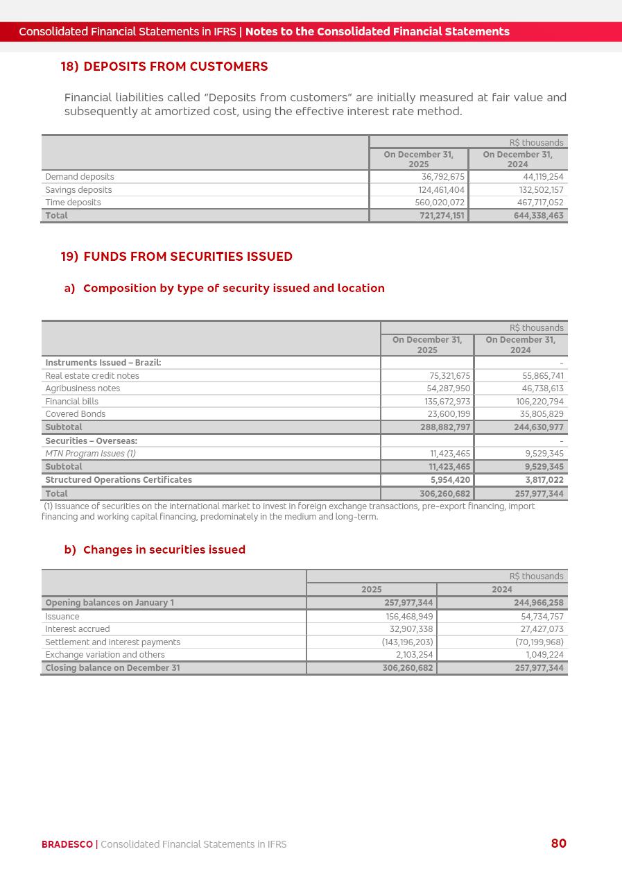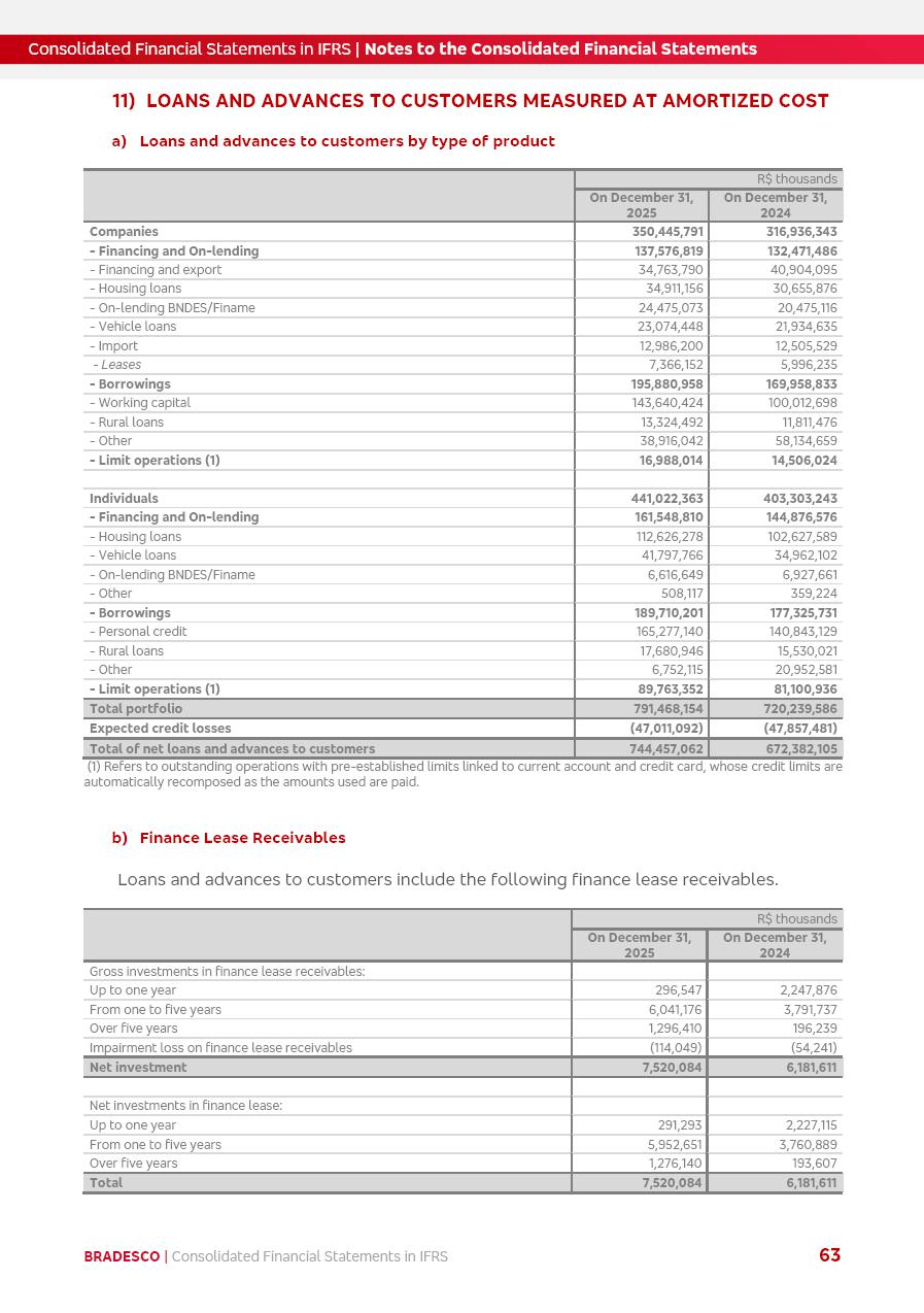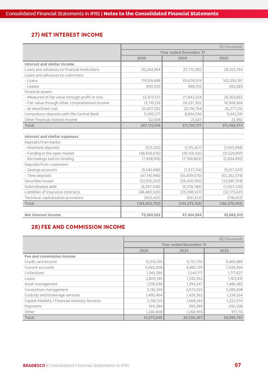 Consolidated Financial Statements 2025 in accordance with International Financial Reporting Standards (IFRS) issued by the International Accounting Standards Boards (IASB) Management Report BRADESCO | Management Report | Consolidated Financial Statements in IFRS 2 Message to Shareholders Throughout our trajectory, we have maintained a firm commitment to serve with excellence, strengthening the brand and reaffirming the relationship of partnership and trust with millions of Brazilians. In 2025, a year marked by a still challenging economic environment and constant changes in the market, our adaptability, resilience and strategic focus were essential. With the commitment and dedication of the teams, we moved forward with consistency in meeting the objectives, preserving the solidity of the operations and expanding initiatives that contribute to the sustainable development of the Country. We believe in the potential of Brazil and the strength of its people, which, with determination, continues to drive economic and social growth. In line with the commitment to transparency and democratization of information, we present in this report a detailed view of the main developments and results achieved in the fiscal year, reinforcing our ethical posture and corporate responsibility. To our shareholders, clients and partners, we thank you for the continued support, the trust in our decisions and the preference that motivates us to move forward, always focusing on delivering value and building an even more promising future. Cidade de Deus, February 04, 2026 Board of Directors and Board of Executive Officers Management Report BRADESCO | Management Report | Consolidated Financial Statements in IFRS 3 Dear Shareholders, We hereby present the Consolidated Financial Statements of Banco Bradesco S.A. related to 2025. We follow all International Financial Reporting Standards (IFRS) practices issued by the International Accounting Standards Board (IASB). Economic Comment The Brazilian economy slowed down in the second half of 2025. The household consumption lost traction throughout the year, responding to the restrictive monetary policy. One-off factors may lead to some re-acceleration of the GDP at the beginning of the year, but our projections indicate a weaker growth in 2026. Inflation closed 2025 within the target range two years above it, with important contributions from exchange rate valuation and accommodation of the economic activity. We believe that deflation will continue in the coming months, allowing the Central Bank of Brazil to start cutting the basic interest rate later this quarter. Uncertainties remain high on the international scene. While the US economy remains resilient, doubts about the US economic policy represent an important risk vector for the global economy. This context is aggravated by geopolitical disputes around the world. Highlights in the period In November 2025, Banco Bradesco S.A. (“Bradesco”) noticed to its shareholders and the market in general the Notice to the Market that Atlântica Hospitais and Participações S.A., a company focused on investment in hospitals, indirectly controlled by Bradesco and Bradseg Participações S.A., firmed an Investment Agreement with Rede D’Or São Luiz S.A. Group for the inclusion of Maternidade São Luiz Star, thus expanding the partnership firmed with Rede D’Or. The expansion of the Partnership is aligned with the strategy of Atlântica to invest in the health sector value chain through partnerships with players established in the operation of hospitals. In December 2025, Bradesco noticed to its shareholders and the market in general, through a Relevant Fact, that the proposal of the Company’s Board of Directors was approved for the payment of complementary interest on own equity, in the total amount of R$3,9 billion, of which R$0.351190748 per common share and R$0.386309823 per preferred share. Closing the fourth quarter of 2025, the Annual Calendar of Corporate Events for 2026 was released and, through a Notice to Shareholders, the planned schedule of the monthly payment of interest on own equity for the fiscal year of 2026, in accordance with the Systematic Monthly Payment of Interest on Own Equity. The disclosure of both documents reinforces Bradesco’s commitment to transparency, predictability and strategic alignment with shareholders and other stakeholders. BRADESCO | Management Report | Consolidated Financial Statements in IFRS 4 . highlighted information 2025 TOTAL DEPOSITS (Dec25 vs. Dec24) R$728.0 bi (+12.2%) R$23.9 bi R$178.4 bi +5.9% y/y EARNINGS PER SHARE BOOK VALUE PER SHARE BOOK NET INCOME R$2.13 common R$2.35 preferred R$16.87 SHAREHOLDERS’ EQUITY (1) MARKET VALUE TIER I CAPITAL R$178.7 bi 13.2% SECURITIES (Dec25 vs. Dec24) R$925.4 bi (+19.4%) FVPL: R$526.9 bi (+49.7%) FVOCI: R$139.0 bi (-11.1%) Amortized Cost: R$259.5 bi (-2.8%) EXPANDED LOAN PORTFOLIO (Dec25 vs. Dec24) R$1,089.2 bi (+11.0%) INDIVIDUALS: R$466.5 bi (+12.7%) COMPANIES: R$622.7 bi (+9.7%) ALLOWANCE FOR EXPANDED LOANS (Dec25 vs. Dec24) R$56.8 bi (-2.6%) INTEREST ON SHAREHOLDERS’ EQUITY R$14.5 bi (gross) +36.4% y/y (1) Equity attributable to shareholders of the parente. +0.8% y/y BRADESCO | Management Report | Consolidated Financial Statements in IFRS 5 Technology and innovation In two years of transformation, technology has become the core value leverage at Bradesco, providing more fluid and personalized customer experience, scalable operational efficiency with agility, security with cyber resilience and real-time prevention. With Agile@Scale, co-managed tribes between business and IT have increased efficiency, quality and value deliveries. In the period, we reduced the lead time by 43% and increased productivity by increasing the volume of deliveries to the business by 118% (vs. Dec23). The implementation of the AI First plan and the consolidation of the Bridge platform have democratized the use of GenAI in products and channels, with gov