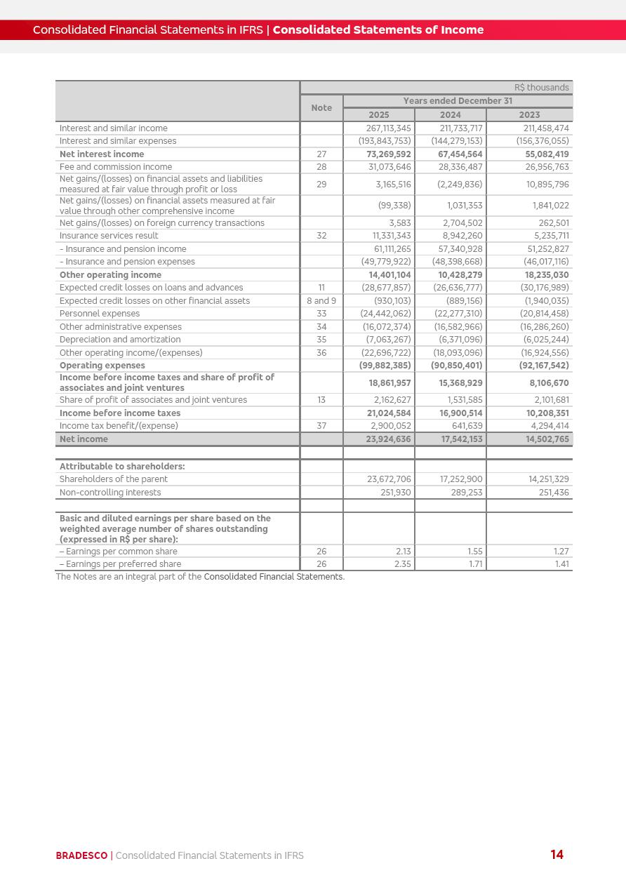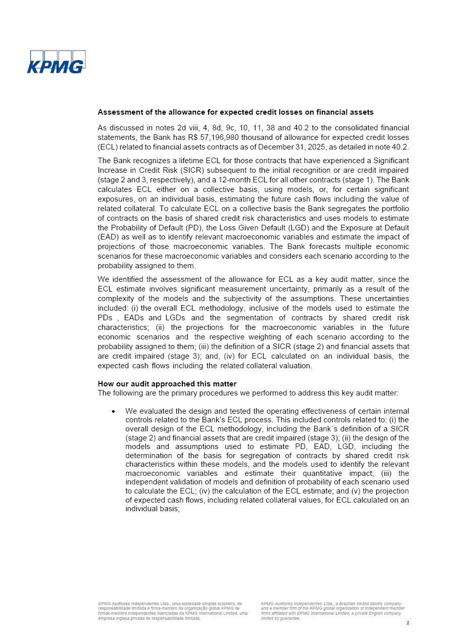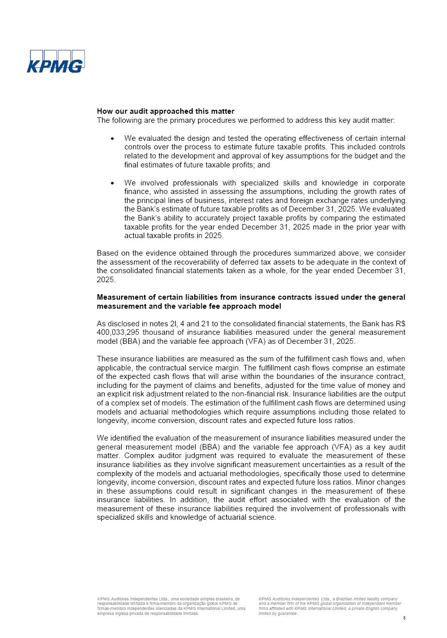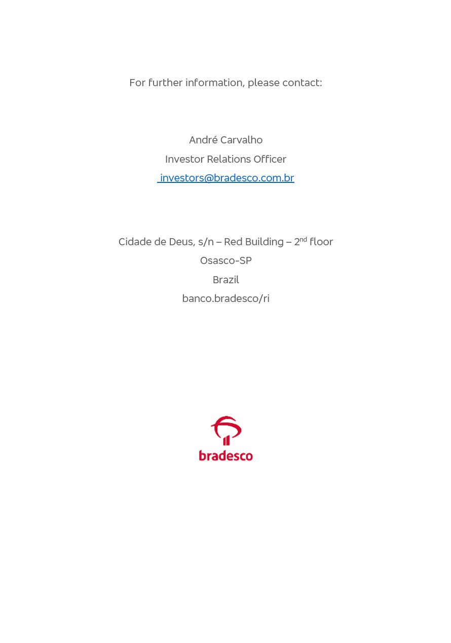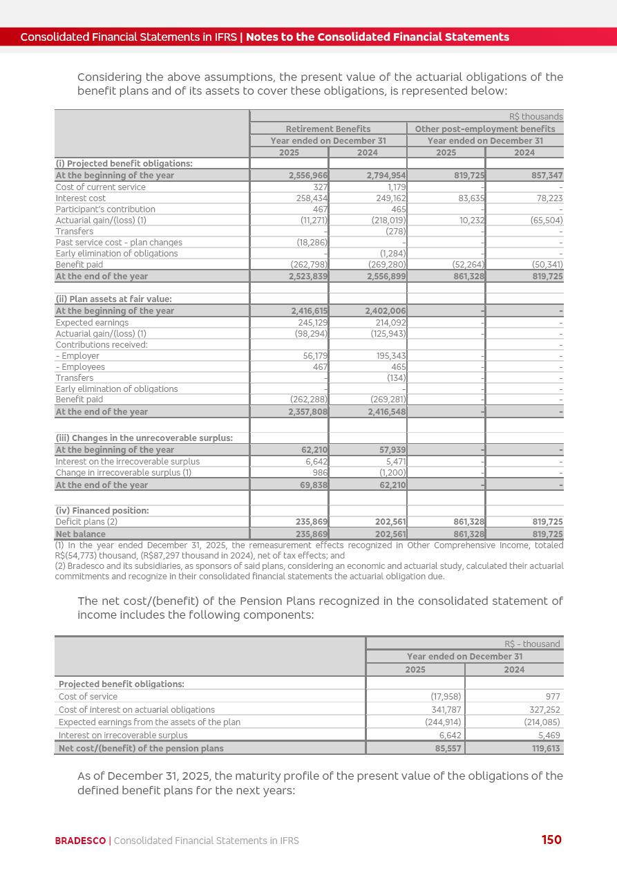 Consolidated Financial Statements 2025 in accordance with International Financial Reporting Standards (IFRS) issued by the International Accounting Standards Boards (IASB) Management Report BRADESCO | Management Report | Consolidated Financial Statements in IFRS 2 Message to Shareholders Throughout our trajectory, we have maintained a firm commitment to serve with excellence, strengthening the brand and reaffirming the relationship of partnership and trust with millions of Brazilians. In 2025, a year marked by a still challenging economic environment and constant changes in the market, our adaptability, resilience and strategic focus were essential. With the commitment and dedication of the teams, we moved forward with consistency in meeting the objectives, preserving the solidity of the operations and expanding initiatives that contribute to the sustainable development of the Country. We believe in the potential of Brazil and the strength of its people, which, with determination, continues to drive economic and social growth. In line with the commitment to transparency and democratization of information, we present in this report a detailed view of the main developments and results achieved in the fiscal year, reinforcing our ethical posture and corporate responsibility. To our shareholders, clients and partners, we thank you for the continued support, the trust in our decisions and the preference that motivates us to move forward, always focusing on delivering value and building an even more promising future. Cidade de Deus, February 04, 2026 Board of Directors and Board of Executive Officers Management Report BRADESCO | Management Report | Consolidated Financial Statements in IFRS 3 Dear Shareholders, We hereby present the Consolidated Financial Statements of Banco Bradesco S.A. related to 2025. We follow all International Financial Reporting Standards (IFRS) practices issued by the International Accounting Standards Board (IASB). Economic Comment The Brazilian economy slowed down in the second half of 2025. The household consumption lost traction throughout the year, responding to the restrictive monetary policy. One-off factors may lead to some re-acceleration of the GDP at the beginning of the year, but our projections indicate a weaker growth in 2026. Inflation closed 2025 within the target range two years above it, with important contributions from exchange rate valuation and accommodation of the economic activity. We believe that deflation will continue in the coming months, allowing the Central Bank of Brazil to start cutting the basic interest rate later this quarter. Uncertainties remain high on the international scene. While the US economy remains resilient, doubts about the US economic policy represent an important risk vector for the global economy. This context is aggravated by geopolitical disputes around the world. Highlights in the period In November 2025, Banco Bradesco S.A. (“Bradesco”) noticed to its shareholders and the market in general the Notice to the Market that Atlântica Hospitais and Participações S.A., a company focused on investment in hospitals, indirectly controlled by Bradesco and Bradseg Participações S.A., firmed an Investment Agreement with Rede D’Or São Luiz S.A. Group for the inclusion of Maternidade São Luiz Star, thus expanding the partnership firmed with Rede D’Or. The expansion of the Partnership is aligned with the strategy of Atlântica to invest in the health sector value chain through partnerships with players established in the operation of hospitals. In December 2025, Bradesco noticed to its shareholders and the market in general, through a Relevant Fact, that the proposal of the Company’s Board of Directors was approved for the payment of complementary interest on own equity, in the total amount of R$3,9 billion, of which R$0.351190748 per common share and R$0.386309823 per preferred share. Closing the fourth quarter of 2025, the Annual Calendar of Corporate Events for 2026 was released and, through a Notice to Shareholders, the planned schedule of the monthly payment of interest on own equity for the fiscal year of 2026, in accordance with the Systematic Monthly Payment of Interest on Own Equity. The disclosure of both documents reinforces Bradesco’s commitment to transparency, predictability and strategic alignment with shareholders and other stakeholders. BRADESCO | Management Report | Consolidated Financial Statements in IFRS 4 . highlighted information 2025 TOTAL DEPOSITS (Dec25 vs. Dec24) R$728.0 bi (+12.2%) R$23.9 bi R$178.4 bi +5.9% y/y EARNINGS PER SHARE BOOK VALUE PER SHARE BOOK NET INCOME R$2.13 common R$2.35 preferred R$16.87 SHAREHOLDERS’ EQUITY (1) MARKET VALUE TIER I CAPITAL R$178.7 bi 13.2% SECURITIES (Dec25 vs. Dec24) R$925.4 bi (+19.4%) FVPL: R$526.9 bi (+49.7%) FVOCI: R$139.0 bi (-11.1%) Amortized Cost: R$259.5 bi (-2.8%) EXPANDED LOAN PORTFOLIO (Dec25 vs. Dec24) R$1,089.2 bi (+11.0%) INDIVIDUALS: R$466.5 bi (+12.7%) COMPANIES: R$622.7 bi (+9.7%) ALLOWANCE FOR EXPANDED LOANS (Dec25 vs. Dec24) R$56.8 bi (-2.6%) INTEREST ON SHAREHOLDERS’ EQUITY R$14.5 bi (gross) +36.4% y/y (1) Equity attributable to shareholders of the parente. +0.8% y/y BRADESCO | Management Report | Consolidated Financial Statements in IFRS 5 Technology and innovation In two years of transformation, technology has become the core value leverage at Bradesco, providing more fluid and personalized customer experience, scalable operational efficiency with agility, security with cyber resilience and real-time prevention. With Agile@Scale, co-managed tribes between business and IT have increased efficiency, quality and value deliveries. In the period, we reduced the lead time by 43% and increased productivity by increasing the volume of deliveries to the business by 118% (vs. Dec23). The implementation of the AI First plan and the consolidation of the Bridge platform have democratized the use of GenAI in products and channels, with gov