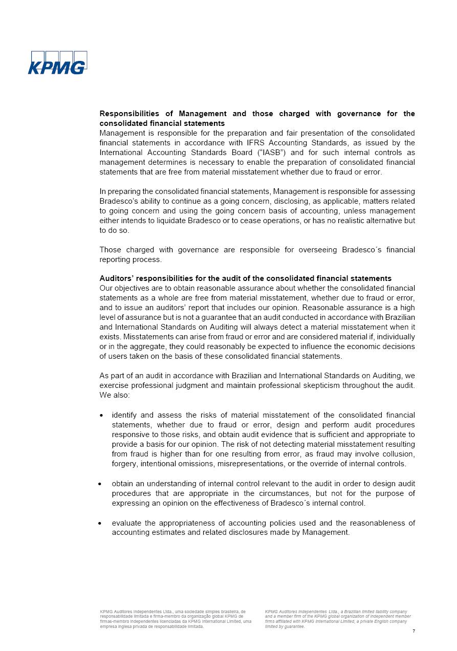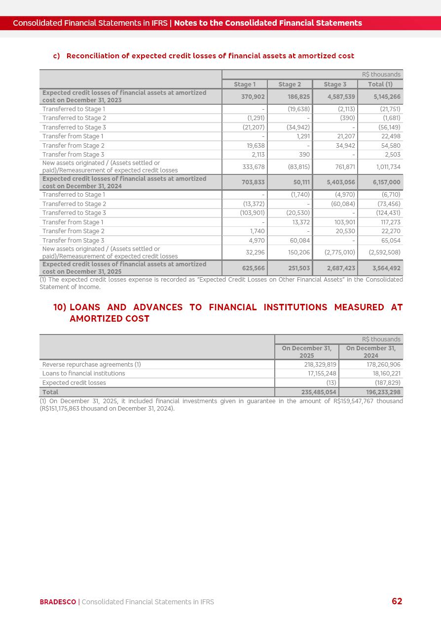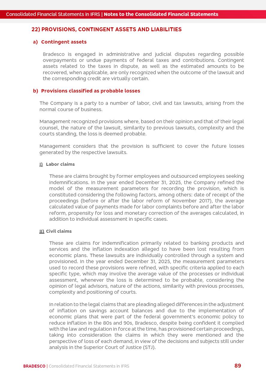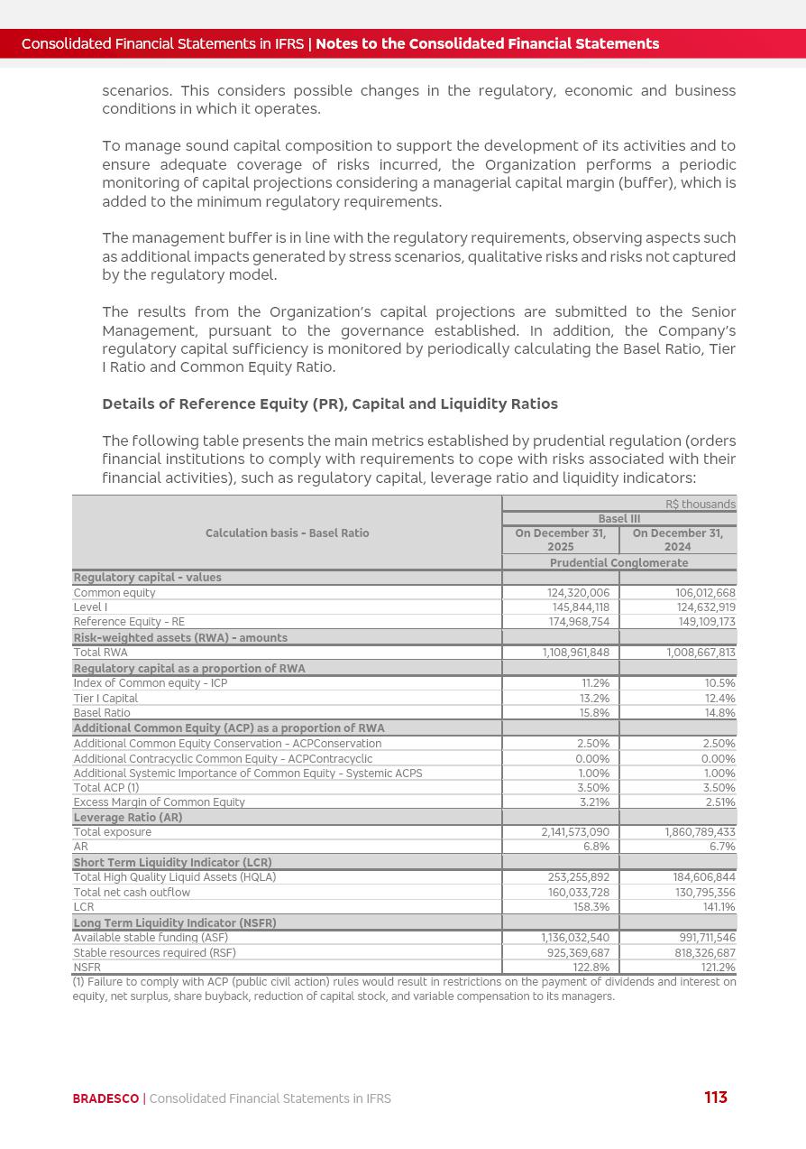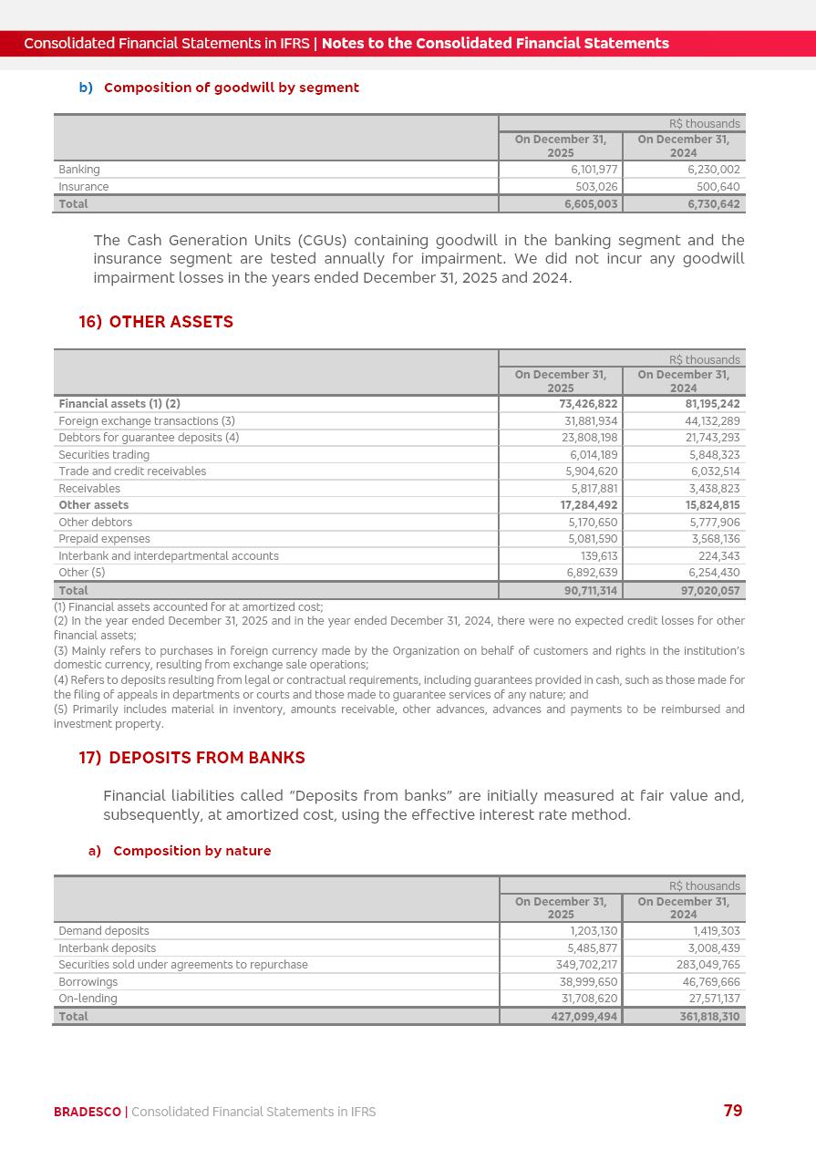 Consolidated Financial Statements 2025 in accordance with International Financial Reporting Standards (IFRS) issued by the International Accounting Standards Boards (IASB) Management Report BRADESCO | Management Report | Consolidated Financial Statements in IFRS 2 Message to Shareholders Throughout our trajectory, we have maintained a firm commitment to serve with excellence, strengthening the brand and reaffirming the relationship of partnership and trust with millions of Brazilians. In 2025, a year marked by a still challenging economic environment and constant changes in the market, our adaptability, resilience and strategic focus were essential. With the commitment and dedication of the teams, we moved forward with consistency in meeting the objectives, preserving the solidity of the operations and expanding initiatives that contribute to the sustainable development of the Country. We believe in the potential of Brazil and the strength of its people, which, with determination, continues to drive economic and social growth. In line with the commitment to transparency and democratization of information, we present in this report a detailed view of the main developments and results achieved in the fiscal year, reinforcing our ethical posture and corporate responsibility. To our shareholders, clients and partners, we thank you for the continued support, the trust in our decisions and the preference that motivates us to move forward, always focusing on delivering value and building an even more promising future. Cidade de Deus, February 04, 2026 Board of Directors and Board of Executive Officers Management Report BRADESCO | Management Report | Consolidated Financial Statements in IFRS 3 Dear Shareholders, We hereby present the Consolidated Financial Statements of Banco Bradesco S.A. related to 2025. We follow all International Financial Reporting Standards (IFRS) practices issued by the International Accounting Standards Board (IASB). Economic Comment The Brazilian economy slowed down in the second half of 2025. The household consumption lost traction throughout the year, responding to the restrictive monetary policy. One-off factors may lead to some re-acceleration of the GDP at the beginning of the year, but our projections indicate a weaker growth in 2026. Inflation closed 2025 within the target range two years above it, with important contributions from exchange rate valuation and accommodation of the economic activity. We believe that deflation will continue in the coming months, allowing the Central Bank of Brazil to start cutting the basic interest rate later this quarter. Uncertainties remain high on the international scene. While the US economy remains resilient, doubts about the US economic policy represent an important risk vector for the global economy. This context is aggravated by geopolitical disputes around the world. Highlights in the period In November 2025, Banco Bradesco S.A. (“Bradesco”) noticed to its shareholders and the market in general the Notice to the Market that Atlântica Hospitais and Participações S.A., a company focused on investment in hospitals, indirectly controlled by Bradesco and Bradseg Participações S.A., firmed an Investment Agreement with Rede D’Or São Luiz S.A. Group for the inclusion of Maternidade São Luiz Star, thus expanding the partnership firmed with Rede D’Or. The expansion of the Partnership is aligned with the strategy of Atlântica to invest in the health sector value chain through partnerships with players established in the operation of hospitals. In December 2025, Bradesco noticed to its shareholders and the market in general, through a Relevant Fact, that the proposal of the Company’s Board of Directors was approved for the payment of complementary interest on own equity, in the total amount of R$3,9 billion, of which R$0.351190748 per common share and R$0.386309823 per preferred share. Closing the fourth quarter of 2025, the Annual Calendar of Corporate Events for 2026 was released and, through a Notice to Shareholders, the planned schedule of the monthly payment of interest on own equity for the fiscal year of 2026, in accordance with the Systematic Monthly Payment of Interest on Own Equity. The disclosure of both documents reinforces Bradesco’s commitment to transparency, predictability and strategic alignment with shareholders and other stakeholders. BRADESCO | Management Report | Consolidated Financial Statements in IFRS 4 . highlighted information 2025 TOTAL DEPOSITS (Dec25 vs. Dec24) R$728.0 bi (+12.2%) R$23.9 bi R$178.4 bi +5.9% y/y EARNINGS PER SHARE BOOK VALUE PER SHARE BOOK NET INCOME R$2.13 common R$2.35 preferred R$16.87 SHAREHOLDERS’ EQUITY (1) MARKET VALUE TIER I CAPITAL R$178.7 bi 13.2% SECURITIES (Dec25 vs. Dec24) R$925.4 bi (+19.4%) FVPL: R$526.9 bi (+49.7%) FVOCI: R$139.0 bi (-11.1%) Amortized Cost: R$259.5 bi (-2.8%) EXPANDED LOAN PORTFOLIO (Dec25 vs. Dec24) R$1,089.2 bi (+11.0%) INDIVIDUALS: R$466.5 bi (+12.7%) COMPANIES: R$622.7 bi (+9.7%) ALLOWANCE FOR EXPANDED LOANS (Dec25 vs. Dec24) R$56.8 bi (-2.6%) INTEREST ON SHAREHOLDERS’ EQUITY R$14.5 bi (gross) +36.4% y/y (1) Equity attributable to shareholders of the parente. +0.8% y/y BRADESCO | Management Report | Consolidated Financial Statements in IFRS 5 Technology and innovation In two years of transformation, technology has become the core value leverage at Bradesco, providing more fluid and personalized customer experience, scalable operational efficiency with agility, security with cyber resilience and real-time prevention. With Agile@Scale, co-managed tribes between business and IT have increased efficiency, quality and value deliveries. In the period, we reduced the lead time by 43% and increased productivity by increasing the volume of deliveries to the business by 118% (vs. Dec23). The implementation of the AI First plan and the consolidation of the Bridge platform have democratized the use of GenAI in products and channels, with gov
