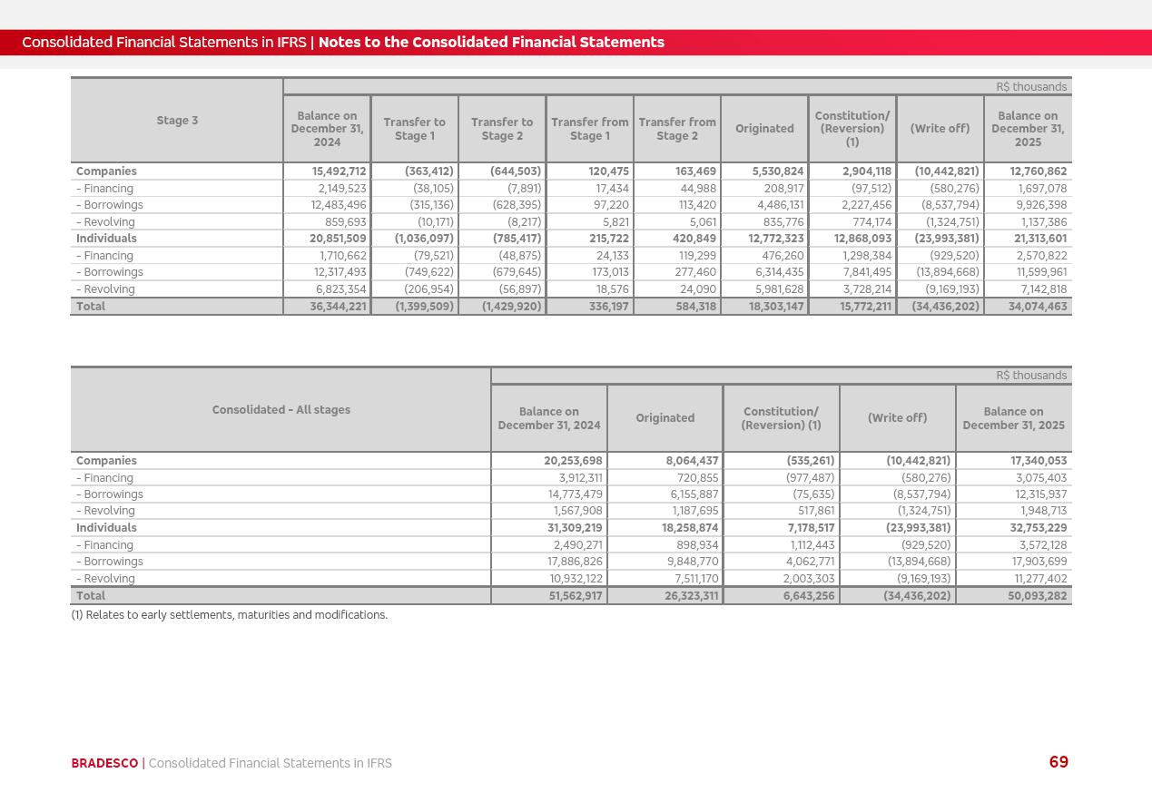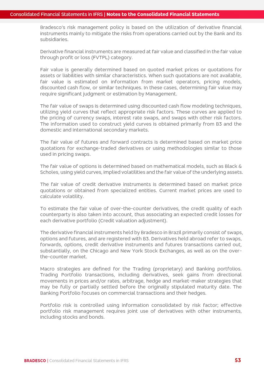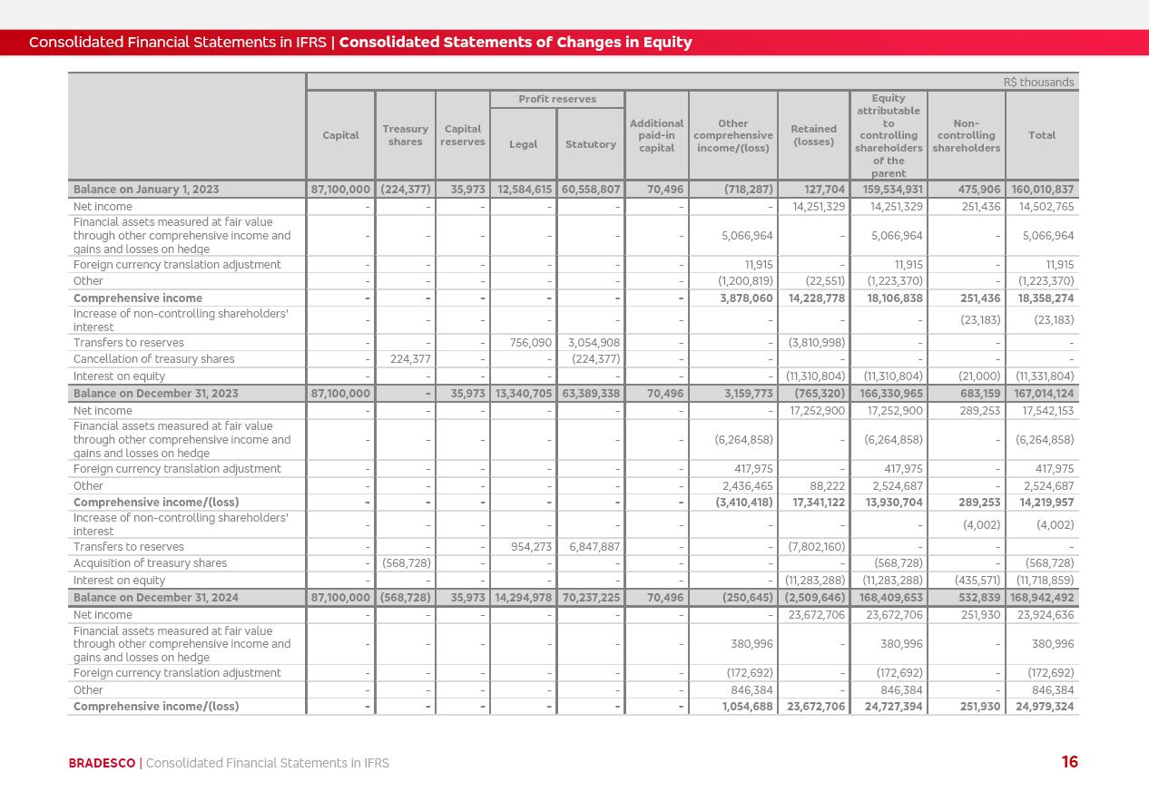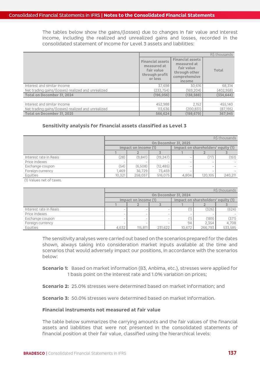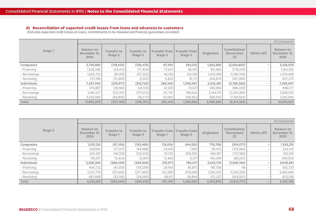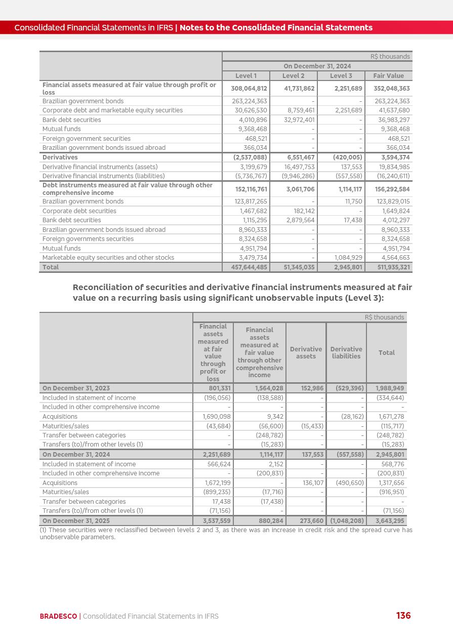 Consolidated Financial Statements 2025 in accordance with International Financial Reporting Standards (IFRS) issued by the International Accounting Standards Boards (IASB) Management Report BRADESCO | Management Report | Consolidated Financial Statements in IFRS 2 Message to Shareholders Throughout our trajectory, we have maintained a firm commitment to serve with excellence, strengthening the brand and reaffirming the relationship of partnership and trust with millions of Brazilians. In 2025, a year marked by a still challenging economic environment and constant changes in the market, our adaptability, resilience and strategic focus were essential. With the commitment and dedication of the teams, we moved forward with consistency in meeting the objectives, preserving the solidity of the operations and expanding initiatives that contribute to the sustainable development of the Country. We believe in the potential of Brazil and the strength of its people, which, with determination, continues to drive economic and social growth. In line with the commitment to transparency and democratization of information, we present in this report a detailed view of the main developments and results achieved in the fiscal year, reinforcing our ethical posture and corporate responsibility. To our shareholders, clients and partners, we thank you for the continued support, the trust in our decisions and the preference that motivates us to move forward, always focusing on delivering value and building an even more promising future. Cidade de Deus, February 04, 2026 Board of Directors and Board of Executive Officers Management Report BRADESCO | Management Report | Consolidated Financial Statements in IFRS 3 Dear Shareholders, We hereby present the Consolidated Financial Statements of Banco Bradesco S.A. related to 2025. We follow all International Financial Reporting Standards (IFRS) practices issued by the International Accounting Standards Board (IASB). Economic Comment The Brazilian economy slowed down in the second half of 2025. The household consumption lost traction throughout the year, responding to the restrictive monetary policy. One-off factors may lead to some re-acceleration of the GDP at the beginning of the year, but our projections indicate a weaker growth in 2026. Inflation closed 2025 within the target range two years above it, with important contributions from exchange rate valuation and accommodation of the economic activity. We believe that deflation will continue in the coming months, allowing the Central Bank of Brazil to start cutting the basic interest rate later this quarter. Uncertainties remain high on the international scene. While the US economy remains resilient, doubts about the US economic policy represent an important risk vector for the global economy. This context is aggravated by geopolitical disputes around the world. Highlights in the period In November 2025, Banco Bradesco S.A. (“Bradesco”) noticed to its shareholders and the market in general the Notice to the Market that Atlântica Hospitais and Participações S.A., a company focused on investment in hospitals, indirectly controlled by Bradesco and Bradseg Participações S.A., firmed an Investment Agreement with Rede D’Or São Luiz S.A. Group for the inclusion of Maternidade São Luiz Star, thus expanding the partnership firmed with Rede D’Or. The expansion of the Partnership is aligned with the strategy of Atlântica to invest in the health sector value chain through partnerships with players established in the operation of hospitals. In December 2025, Bradesco noticed to its shareholders and the market in general, through a Relevant Fact, that the proposal of the Company’s Board of Directors was approved for the payment of complementary interest on own equity, in the total amount of R$3,9 billion, of which R$0.351190748 per common share and R$0.386309823 per preferred share. Closing the fourth quarter of 2025, the Annual Calendar of Corporate Events for 2026 was released and, through a Notice to Shareholders, the planned schedule of the monthly payment of interest on own equity for the fiscal year of 2026, in accordance with the Systematic Monthly Payment of Interest on Own Equity. The disclosure of both documents reinforces Bradesco’s commitment to transparency, predictability and strategic alignment with shareholders and other stakeholders. BRADESCO | Management Report | Consolidated Financial Statements in IFRS 4 . highlighted information 2025 TOTAL DEPOSITS (Dec25 vs. Dec24) R$728.0 bi (+12.2%) R$23.9 bi R$178.4 bi +5.9% y/y EARNINGS PER SHARE BOOK VALUE PER SHARE BOOK NET INCOME R$2.13 common R$2.35 preferred R$16.87 SHAREHOLDERS’ EQUITY (1) MARKET VALUE TIER I CAPITAL R$178.7 bi 13.2% SECURITIES (Dec25 vs. Dec24) R$925.4 bi (+19.4%) FVPL: R$526.9 bi (+49.7%) FVOCI: R$139.0 bi (-11.1%) Amortized Cost: R$259.5 bi (-2.8%) EXPANDED LOAN PORTFOLIO (Dec25 vs. Dec24) R$1,089.2 bi (+11.0%) INDIVIDUALS: R$466.5 bi (+12.7%) COMPANIES: R$622.7 bi (+9.7%) ALLOWANCE FOR EXPANDED LOANS (Dec25 vs. Dec24) R$56.8 bi (-2.6%) INTEREST ON SHAREHOLDERS’ EQUITY R$14.5 bi (gross) +36.4% y/y (1) Equity attributable to shareholders of the parente. +0.8% y/y BRADESCO | Management Report | Consolidated Financial Statements in IFRS 5 Technology and innovation In two years of transformation, technology has become the core value leverage at Bradesco, providing more fluid and personalized customer experience, scalable operational efficiency with agility, security with cyber resilience and real-time prevention. With Agile@Scale, co-managed tribes between business and IT have increased efficiency, quality and value deliveries. In the period, we reduced the lead time by 43% and increased productivity by increasing the volume of deliveries to the business by 118% (vs. Dec23). The implementation of the AI First plan and the consolidation of the Bridge platform have democratized the use of GenAI in products and channels, with gov