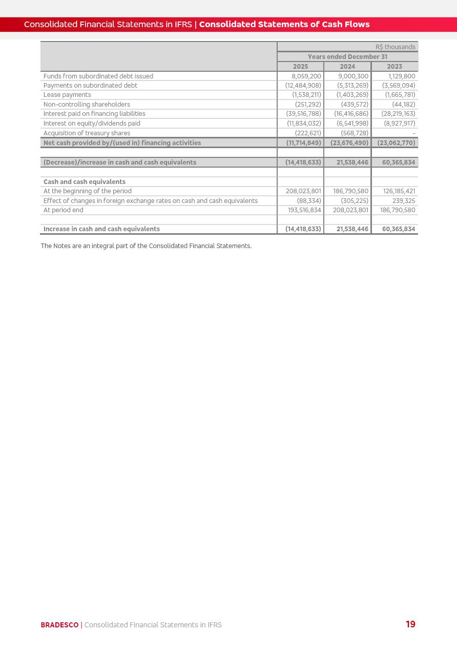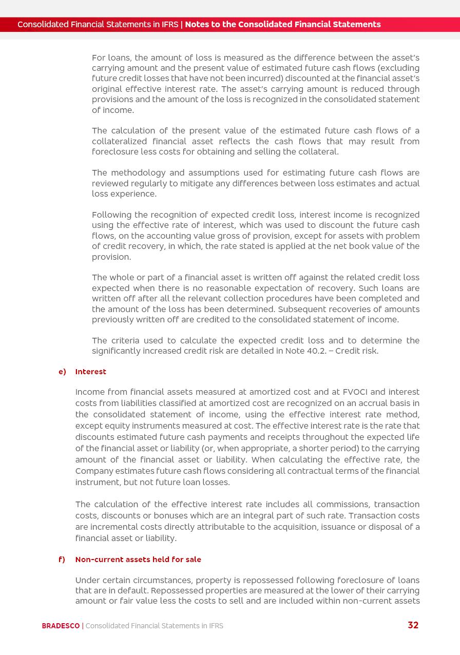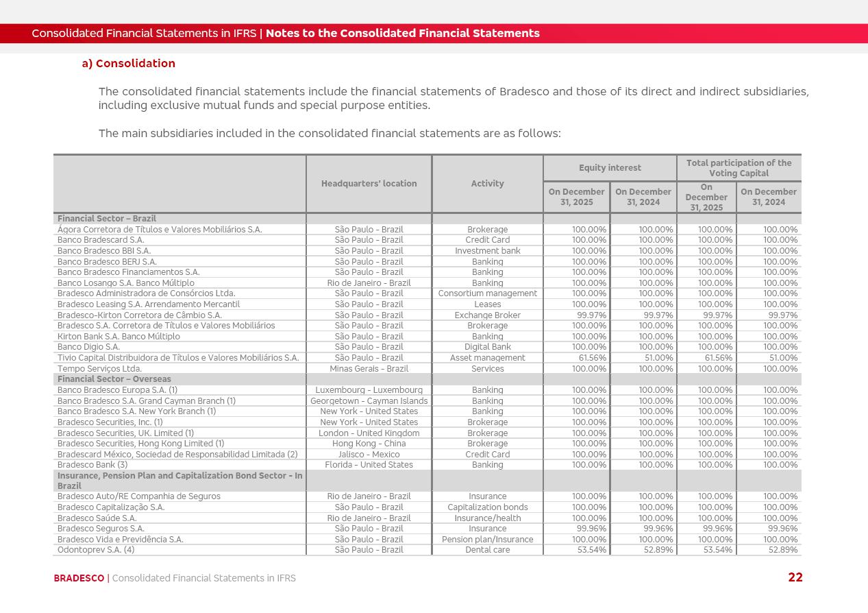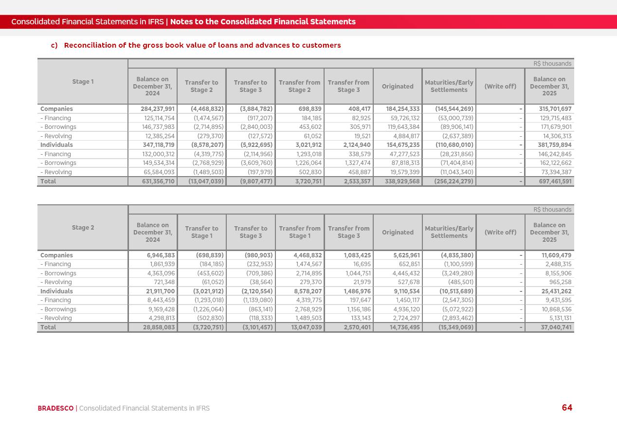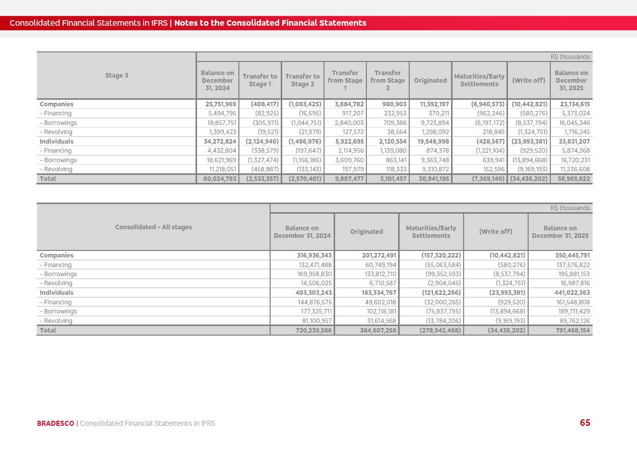 Consolidated Financial Statements 2025 in accordance with International Financial Reporting Standards (IFRS) issued by the International Accounting Standards Boards (IASB) Management Report BRADESCO | Management Report | Consolidated Financial Statements in IFRS 2 Message to Shareholders Throughout our trajectory, we have maintained a firm commitment to serve with excellence, strengthening the brand and reaffirming the relationship of partnership and trust with millions of Brazilians. In 2025, a year marked by a still challenging economic environment and constant changes in the market, our adaptability, resilience and strategic focus were essential. With the commitment and dedication of the teams, we moved forward with consistency in meeting the objectives, preserving the solidity of the operations and expanding initiatives that contribute to the sustainable development of the Country. We believe in the potential of Brazil and the strength of its people, which, with determination, continues to drive economic and social growth. In line with the commitment to transparency and democratization of information, we present in this report a detailed view of the main developments and results achieved in the fiscal year, reinforcing our ethical posture and corporate responsibility. To our shareholders, clients and partners, we thank you for the continued support, the trust in our decisions and the preference that motivates us to move forward, always focusing on delivering value and building an even more promising future. Cidade de Deus, February 04, 2026 Board of Directors and Board of Executive Officers Management Report BRADESCO | Management Report | Consolidated Financial Statements in IFRS 3 Dear Shareholders, We hereby present the Consolidated Financial Statements of Banco Bradesco S.A. related to 2025. We follow all International Financial Reporting Standards (IFRS) practices issued by the International Accounting Standards Board (IASB). Economic Comment The Brazilian economy slowed down in the second half of 2025. The household consumption lost traction throughout the year, responding to the restrictive monetary policy. One-off factors may lead to some re-acceleration of the GDP at the beginning of the year, but our projections indicate a weaker growth in 2026. Inflation closed 2025 within the target range two years above it, with important contributions from exchange rate valuation and accommodation of the economic activity. We believe that deflation will continue in the coming months, allowing the Central Bank of Brazil to start cutting the basic interest rate later this quarter. Uncertainties remain high on the international scene. While the US economy remains resilient, doubts about the US economic policy represent an important risk vector for the global economy. This context is aggravated by geopolitical disputes around the world. Highlights in the period In November 2025, Banco Bradesco S.A. (“Bradesco”) noticed to its shareholders and the market in general the Notice to the Market that Atlântica Hospitais and Participações S.A., a company focused on investment in hospitals, indirectly controlled by Bradesco and Bradseg Participações S.A., firmed an Investment Agreement with Rede D’Or São Luiz S.A. Group for the inclusion of Maternidade São Luiz Star, thus expanding the partnership firmed with Rede D’Or. The expansion of the Partnership is aligned with the strategy of Atlântica to invest in the health sector value chain through partnerships with players established in the operation of hospitals. In December 2025, Bradesco noticed to its shareholders and the market in general, through a Relevant Fact, that the proposal of the Company’s Board of Directors was approved for the payment of complementary interest on own equity, in the total amount of R$3,9 billion, of which R$0.351190748 per common share and R$0.386309823 per preferred share. Closing the fourth quarter of 2025, the Annual Calendar of Corporate Events for 2026 was released and, through a Notice to Shareholders, the planned schedule of the monthly payment of interest on own equity for the fiscal year of 2026, in accordance with the Systematic Monthly Payment of Interest on Own Equity. The disclosure of both documents reinforces Bradesco’s commitment to transparency, predictability and strategic alignment with shareholders and other stakeholders. BRADESCO | Management Report | Consolidated Financial Statements in IFRS 4 . highlighted information 2025 TOTAL DEPOSITS (Dec25 vs. Dec24) R$728.0 bi (+12.2%) R$23.9 bi R$178.4 bi +5.9% y/y EARNINGS PER SHARE BOOK VALUE PER SHARE BOOK NET INCOME R$2.13 common R$2.35 preferred R$16.87 SHAREHOLDERS’ EQUITY (1) MARKET VALUE TIER I CAPITAL R$178.7 bi 13.2% SECURITIES (Dec25 vs. Dec24) R$925.4 bi (+19.4%) FVPL: R$526.9 bi (+49.7%) FVOCI: R$139.0 bi (-11.1%) Amortized Cost: R$259.5 bi (-2.8%) EXPANDED LOAN PORTFOLIO (Dec25 vs. Dec24) R$1,089.2 bi (+11.0%) INDIVIDUALS: R$466.5 bi (+12.7%) COMPANIES: R$622.7 bi (+9.7%) ALLOWANCE FOR EXPANDED LOANS (Dec25 vs. Dec24) R$56.8 bi (-2.6%) INTEREST ON SHAREHOLDERS’ EQUITY R$14.5 bi (gross) +36.4% y/y (1) Equity attributable to shareholders of the parente. +0.8% y/y BRADESCO | Management Report | Consolidated Financial Statements in IFRS 5 Technology and innovation In two years of transformation, technology has become the core value leverage at Bradesco, providing more fluid and personalized customer experience, scalable operational efficiency with agility, security with cyber resilience and real-time prevention. With Agile@Scale, co-managed tribes between business and IT have increased efficiency, quality and value deliveries. In the period, we reduced the lead time by 43% and increased productivity by increasing the volume of deliveries to the business by 118% (vs. Dec23). The implementation of the AI First plan and the consolidation of the Bridge platform have democratized the use of GenAI in products and channels, with gov