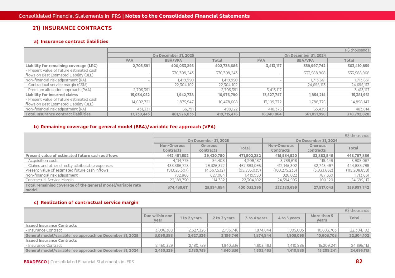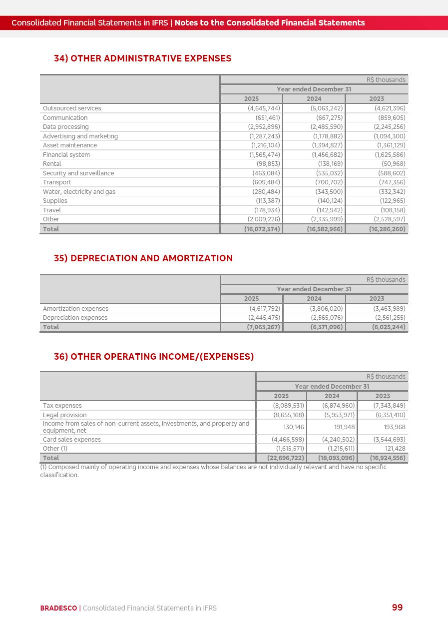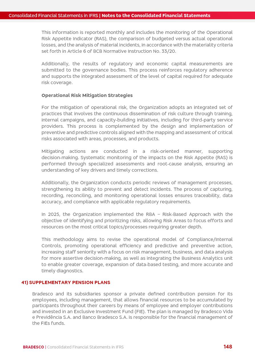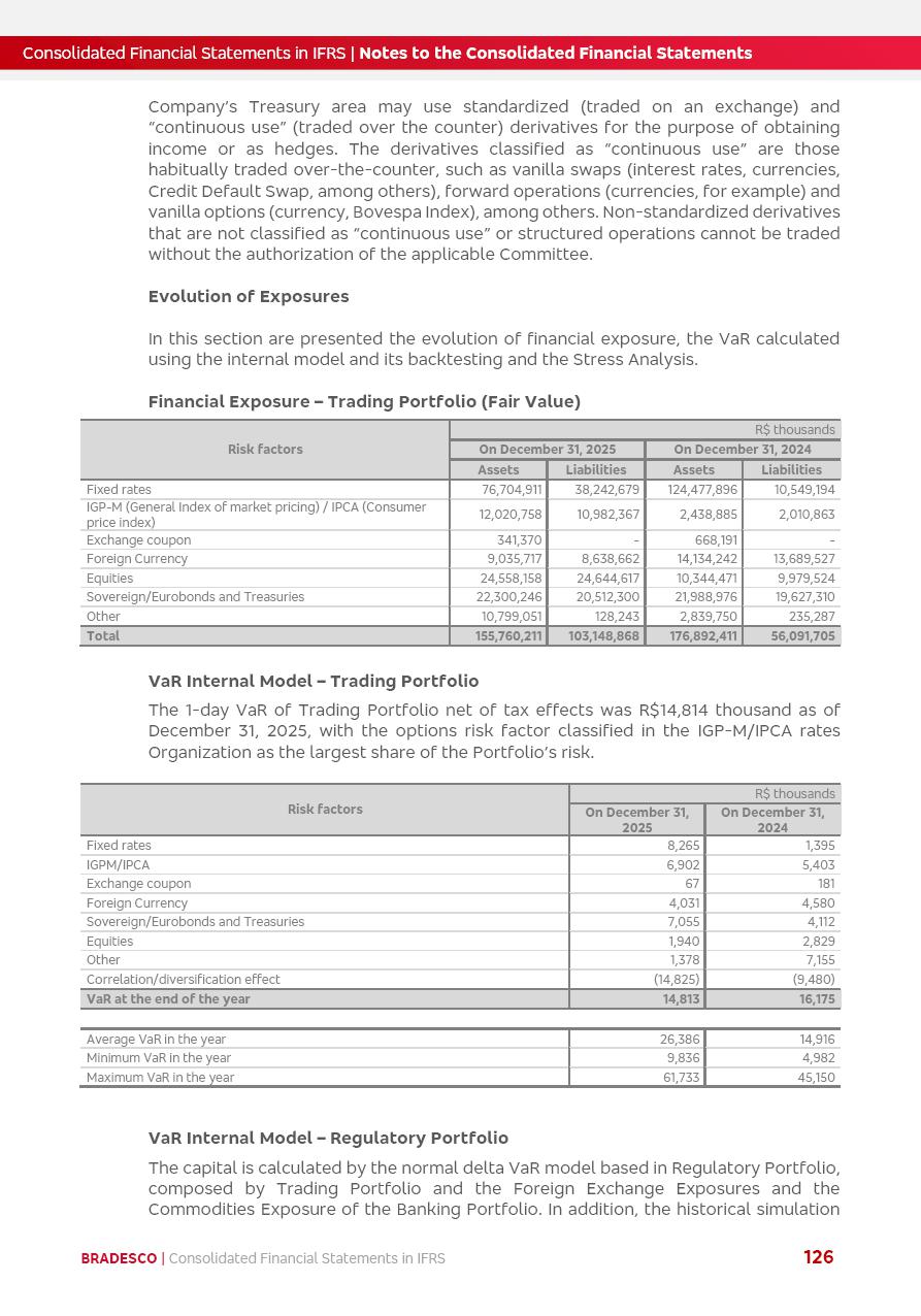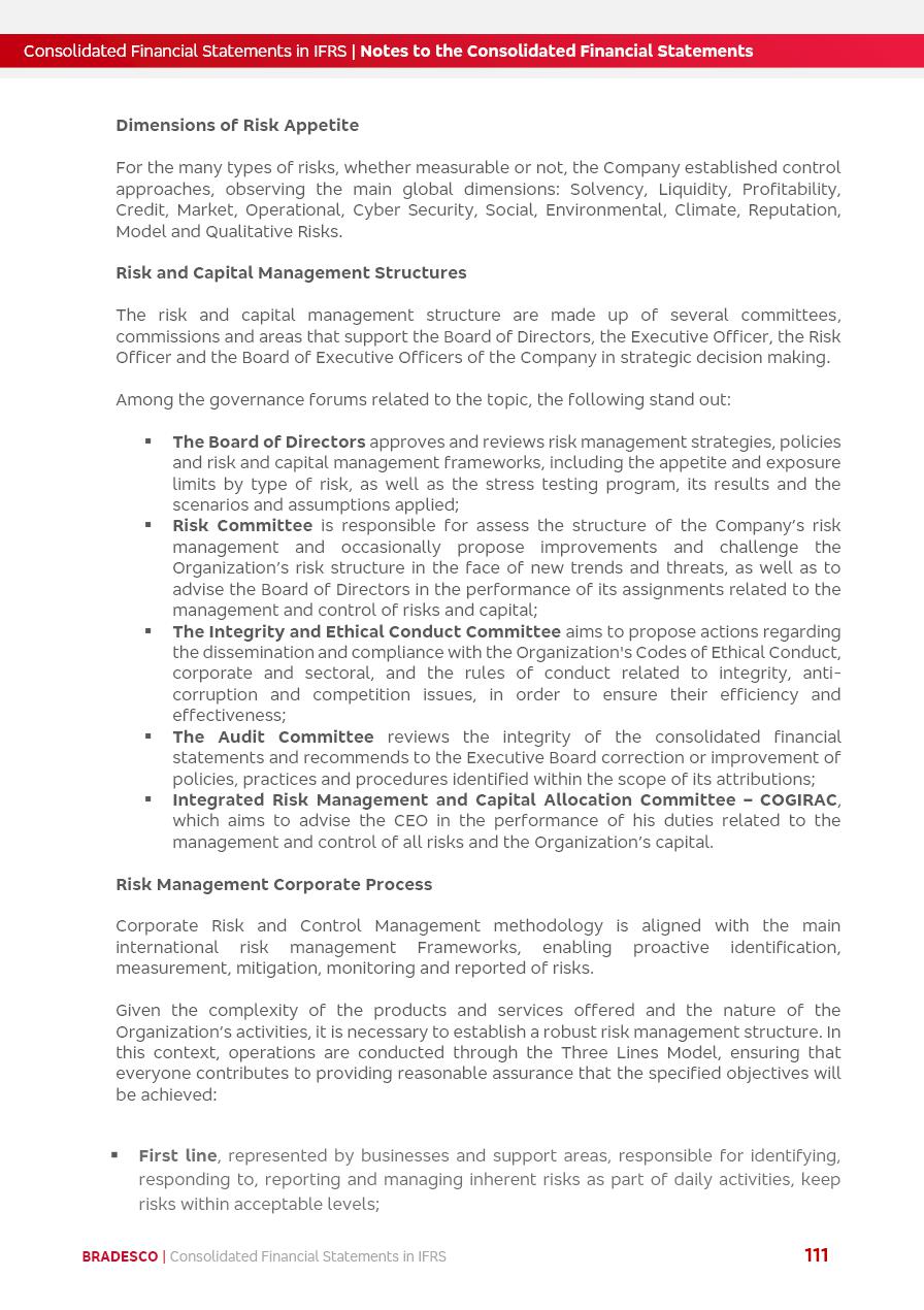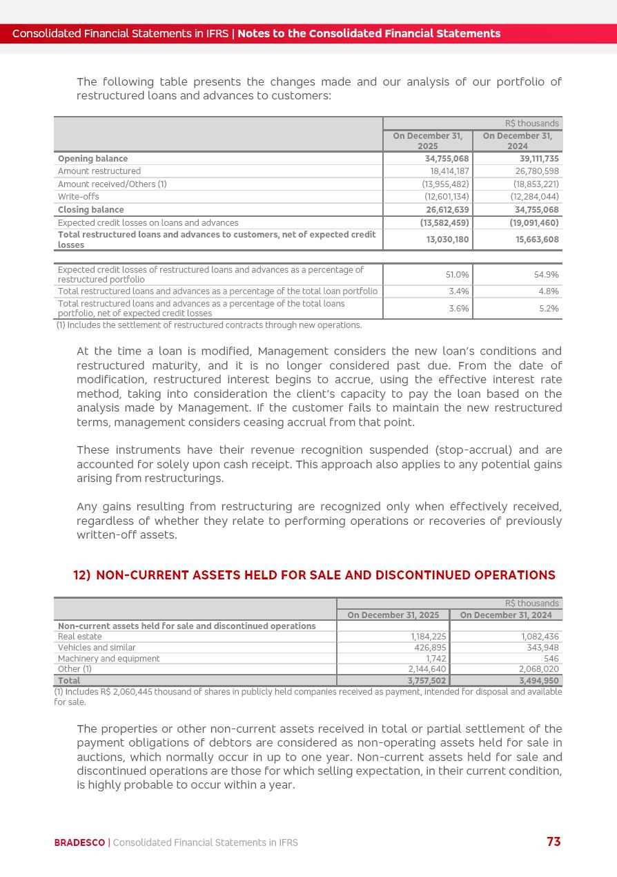 Consolidated Financial Statements 2025 in accordance with International Financial Reporting Standards (IFRS) issued by the International Accounting Standards Boards (IASB) Management Report BRADESCO | Management Report | Consolidated Financial Statements in IFRS 2 Message to Shareholders Throughout our trajectory, we have maintained a firm commitment to serve with excellence, strengthening the brand and reaffirming the relationship of partnership and trust with millions of Brazilians. In 2025, a year marked by a still challenging economic environment and constant changes in the market, our adaptability, resilience and strategic focus were essential. With the commitment and dedication of the teams, we moved forward with consistency in meeting the objectives, preserving the solidity of the operations and expanding initiatives that contribute to the sustainable development of the Country. We believe in the potential of Brazil and the strength of its people, which, with determination, continues to drive economic and social growth. In line with the commitment to transparency and democratization of information, we present in this report a detailed view of the main developments and results achieved in the fiscal year, reinforcing our ethical posture and corporate responsibility. To our shareholders, clients and partners, we thank you for the continued support, the trust in our decisions and the preference that motivates us to move forward, always focusing on delivering value and building an even more promising future. Cidade de Deus, February 04, 2026 Board of Directors and Board of Executive Officers Management Report BRADESCO | Management Report | Consolidated Financial Statements in IFRS 3 Dear Shareholders, We hereby present the Consolidated Financial Statements of Banco Bradesco S.A. related to 2025. We follow all International Financial Reporting Standards (IFRS) practices issued by the International Accounting Standards Board (IASB). Economic Comment The Brazilian economy slowed down in the second half of 2025. The household consumption lost traction throughout the year, responding to the restrictive monetary policy. One-off factors may lead to some re-acceleration of the GDP at the beginning of the year, but our projections indicate a weaker growth in 2026. Inflation closed 2025 within the target range two years above it, with important contributions from exchange rate valuation and accommodation of the economic activity. We believe that deflation will continue in the coming months, allowing the Central Bank of Brazil to start cutting the basic interest rate later this quarter. Uncertainties remain high on the international scene. While the US economy remains resilient, doubts about the US economic policy represent an important risk vector for the global economy. This context is aggravated by geopolitical disputes around the world. Highlights in the period In November 2025, Banco Bradesco S.A. (“Bradesco”) noticed to its shareholders and the market in general the Notice to the Market that Atlântica Hospitais and Participações S.A., a company focused on investment in hospitals, indirectly controlled by Bradesco and Bradseg Participações S.A., firmed an Investment Agreement with Rede D’Or São Luiz S.A. Group for the inclusion of Maternidade São Luiz Star, thus expanding the partnership firmed with Rede D’Or. The expansion of the Partnership is aligned with the strategy of Atlântica to invest in the health sector value chain through partnerships with players established in the operation of hospitals. In December 2025, Bradesco noticed to its shareholders and the market in general, through a Relevant Fact, that the proposal of the Company’s Board of Directors was approved for the payment of complementary interest on own equity, in the total amount of R$3,9 billion, of which R$0.351190748 per common share and R$0.386309823 per preferred share. Closing the fourth quarter of 2025, the Annual Calendar of Corporate Events for 2026 was released and, through a Notice to Shareholders, the planned schedule of the monthly payment of interest on own equity for the fiscal year of 2026, in accordance with the Systematic Monthly Payment of Interest on Own Equity. The disclosure of both documents reinforces Bradesco’s commitment to transparency, predictability and strategic alignment with shareholders and other stakeholders. BRADESCO | Management Report | Consolidated Financial Statements in IFRS 4 . highlighted information 2025 TOTAL DEPOSITS (Dec25 vs. Dec24) R$728.0 bi (+12.2%) R$23.9 bi R$178.4 bi +5.9% y/y EARNINGS PER SHARE BOOK VALUE PER SHARE BOOK NET INCOME R$2.13 common R$2.35 preferred R$16.87 SHAREHOLDERS’ EQUITY (1) MARKET VALUE TIER I CAPITAL R$178.7 bi 13.2% SECURITIES (Dec25 vs. Dec24) R$925.4 bi (+19.4%) FVPL: R$526.9 bi (+49.7%) FVOCI: R$139.0 bi (-11.1%) Amortized Cost: R$259.5 bi (-2.8%) EXPANDED LOAN PORTFOLIO (Dec25 vs. Dec24) R$1,089.2 bi (+11.0%) INDIVIDUALS: R$466.5 bi (+12.7%) COMPANIES: R$622.7 bi (+9.7%) ALLOWANCE FOR EXPANDED LOANS (Dec25 vs. Dec24) R$56.8 bi (-2.6%) INTEREST ON SHAREHOLDERS’ EQUITY R$14.5 bi (gross) +36.4% y/y (1) Equity attributable to shareholders of the parente. +0.8% y/y BRADESCO | Management Report | Consolidated Financial Statements in IFRS 5 Technology and innovation In two years of transformation, technology has become the core value leverage at Bradesco, providing more fluid and personalized customer experience, scalable operational efficiency with agility, security with cyber resilience and real-time prevention. With Agile@Scale, co-managed tribes between business and IT have increased efficiency, quality and value deliveries. In the period, we reduced the lead time by 43% and increased productivity by increasing the volume of deliveries to the business by 118% (vs. Dec23). The implementation of the AI First plan and the consolidation of the Bridge platform have democratized the use of GenAI in products and channels, with gov