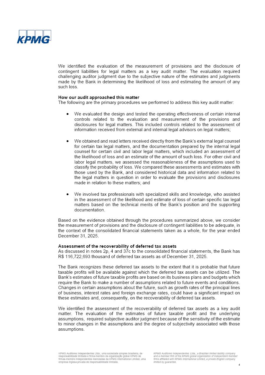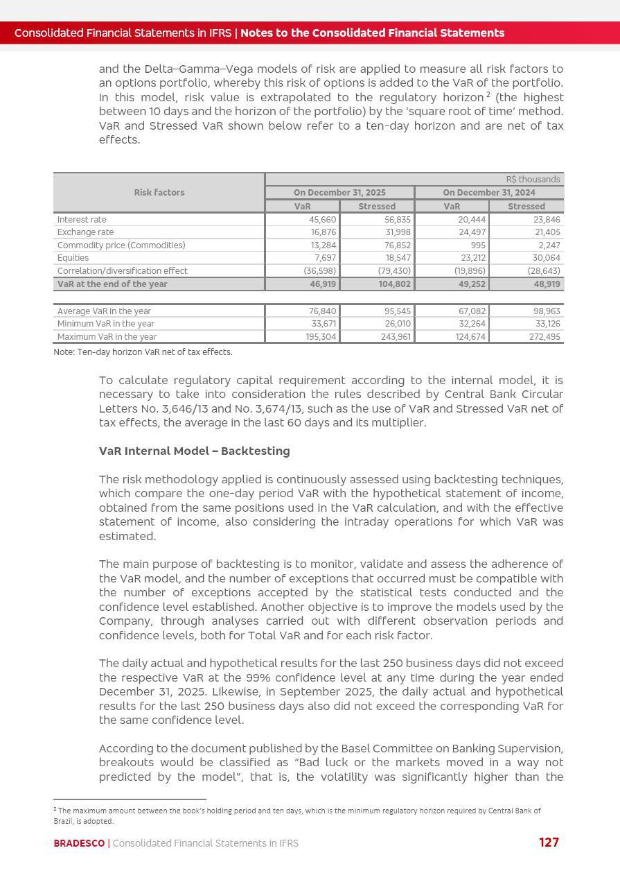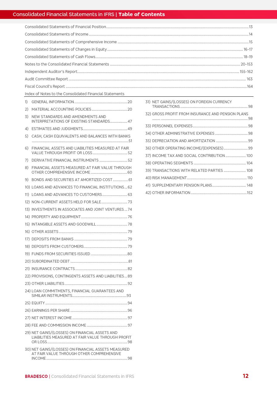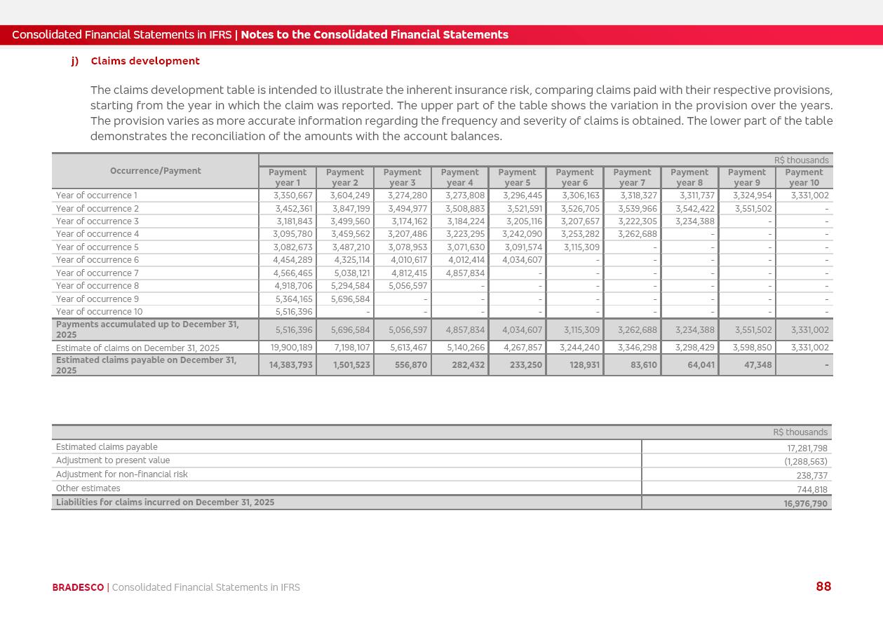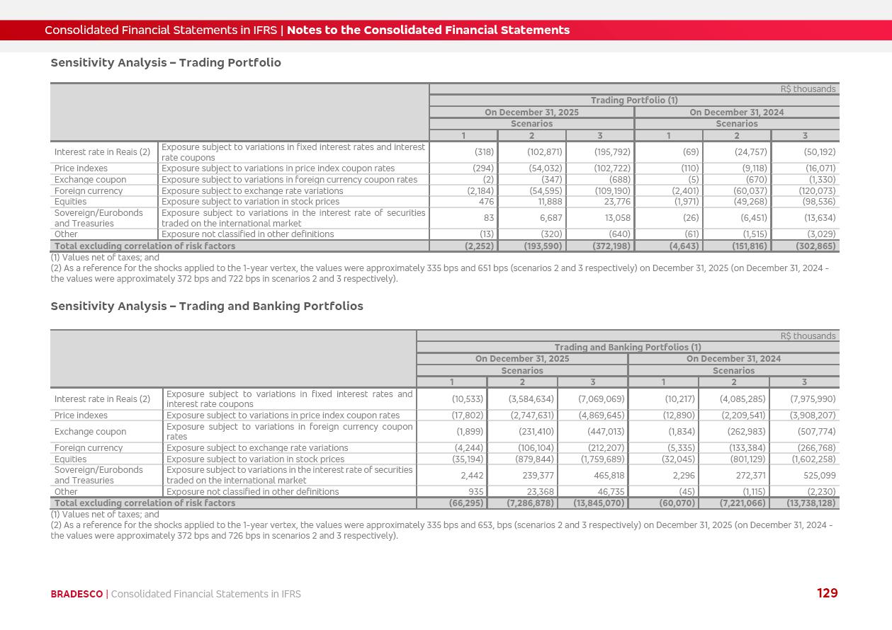 Consolidated Financial Statements 2025 in accordance with International Financial Reporting Standards (IFRS) issued by the International Accounting Standards Boards (IASB) Management Report BRADESCO | Management Report | Consolidated Financial Statements in IFRS 2 Message to Shareholders Throughout our trajectory, we have maintained a firm commitment to serve with excellence, strengthening the brand and reaffirming the relationship of partnership and trust with millions of Brazilians. In 2025, a year marked by a still challenging economic environment and constant changes in the market, our adaptability, resilience and strategic focus were essential. With the commitment and dedication of the teams, we moved forward with consistency in meeting the objectives, preserving the solidity of the operations and expanding initiatives that contribute to the sustainable development of the Country. We believe in the potential of Brazil and the strength of its people, which, with determination, continues to drive economic and social growth. In line with the commitment to transparency and democratization of information, we present in this report a detailed view of the main developments and results achieved in the fiscal year, reinforcing our ethical posture and corporate responsibility. To our shareholders, clients and partners, we thank you for the continued support, the trust in our decisions and the preference that motivates us to move forward, always focusing on delivering value and building an even more promising future. Cidade de Deus, February 04, 2026 Board of Directors and Board of Executive Officers Management Report BRADESCO | Management Report | Consolidated Financial Statements in IFRS 3 Dear Shareholders, We hereby present the Consolidated Financial Statements of Banco Bradesco S.A. related to 2025. We follow all International Financial Reporting Standards (IFRS) practices issued by the International Accounting Standards Board (IASB). Economic Comment The Brazilian economy slowed down in the second half of 2025. The household consumption lost traction throughout the year, responding to the restrictive monetary policy. One-off factors may lead to some re-acceleration of the GDP at the beginning of the year, but our projections indicate a weaker growth in 2026. Inflation closed 2025 within the target range two years above it, with important contributions from exchange rate valuation and accommodation of the economic activity. We believe that deflation will continue in the coming months, allowing the Central Bank of Brazil to start cutting the basic interest rate later this quarter. Uncertainties remain high on the international scene. While the US economy remains resilient, doubts about the US economic policy represent an important risk vector for the global economy. This context is aggravated by geopolitical disputes around the world. Highlights in the period In November 2025, Banco Bradesco S.A. (“Bradesco”) noticed to its shareholders and the market in general the Notice to the Market that Atlântica Hospitais and Participações S.A., a company focused on investment in hospitals, indirectly controlled by Bradesco and Bradseg Participações S.A., firmed an Investment Agreement with Rede D’Or São Luiz S.A. Group for the inclusion of Maternidade São Luiz Star, thus expanding the partnership firmed with Rede D’Or. The expansion of the Partnership is aligned with the strategy of Atlântica to invest in the health sector value chain through partnerships with players established in the operation of hospitals. In December 2025, Bradesco noticed to its shareholders and the market in general, through a Relevant Fact, that the proposal of the Company’s Board of Directors was approved for the payment of complementary interest on own equity, in the total amount of R$3,9 billion, of which R$0.351190748 per common share and R$0.386309823 per preferred share. Closing the fourth quarter of 2025, the Annual Calendar of Corporate Events for 2026 was released and, through a Notice to Shareholders, the planned schedule of the monthly payment of interest on own equity for the fiscal year of 2026, in accordance with the Systematic Monthly Payment of Interest on Own Equity. The disclosure of both documents reinforces Bradesco’s commitment to transparency, predictability and strategic alignment with shareholders and other stakeholders. BRADESCO | Management Report | Consolidated Financial Statements in IFRS 4 . highlighted information 2025 TOTAL DEPOSITS (Dec25 vs. Dec24) R$728.0 bi (+12.2%) R$23.9 bi R$178.4 bi +5.9% y/y EARNINGS PER SHARE BOOK VALUE PER SHARE BOOK NET INCOME R$2.13 common R$2.35 preferred R$16.87 SHAREHOLDERS’ EQUITY (1) MARKET VALUE TIER I CAPITAL R$178.7 bi 13.2% SECURITIES (Dec25 vs. Dec24) R$925.4 bi (+19.4%) FVPL: R$526.9 bi (+49.7%) FVOCI: R$139.0 bi (-11.1%) Amortized Cost: R$259.5 bi (-2.8%) EXPANDED LOAN PORTFOLIO (Dec25 vs. Dec24) R$1,089.2 bi (+11.0%) INDIVIDUALS: R$466.5 bi (+12.7%) COMPANIES: R$622.7 bi (+9.7%) ALLOWANCE FOR EXPANDED LOANS (Dec25 vs. Dec24) R$56.8 bi (-2.6%) INTEREST ON SHAREHOLDERS’ EQUITY R$14.5 bi (gross) +36.4% y/y (1) Equity attributable to shareholders of the parente. +0.8% y/y BRADESCO | Management Report | Consolidated Financial Statements in IFRS 5 Technology and innovation In two years of transformation, technology has become the core value leverage at Bradesco, providing more fluid and personalized customer experience, scalable operational efficiency with agility, security with cyber resilience and real-time prevention. With Agile@Scale, co-managed tribes between business and IT have increased efficiency, quality and value deliveries. In the period, we reduced the lead time by 43% and increased productivity by increasing the volume of deliveries to the business by 118% (vs. Dec23). The implementation of the AI First plan and the consolidation of the Bridge platform have democratized the use of GenAI in products and channels, with gov