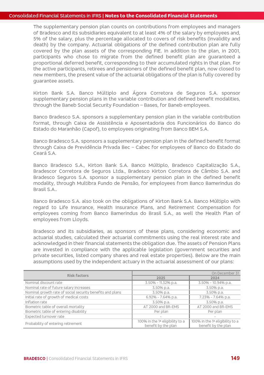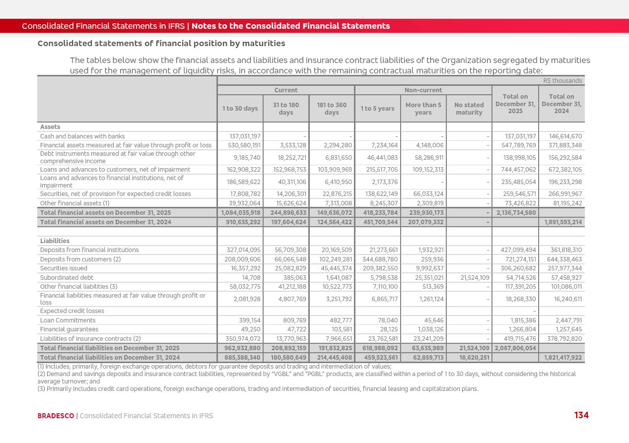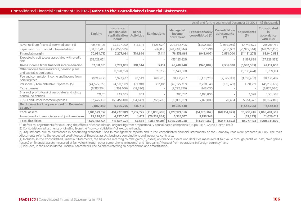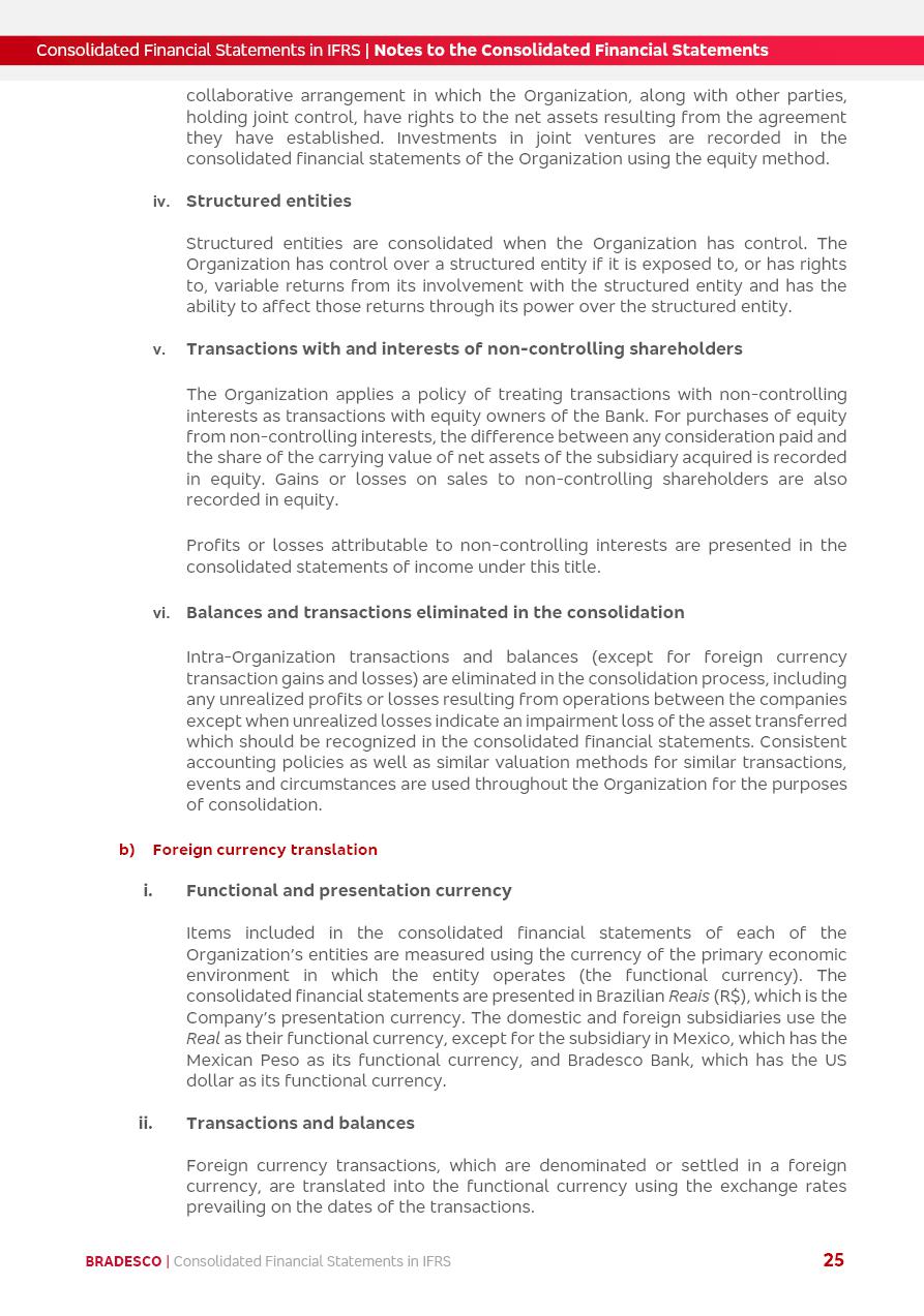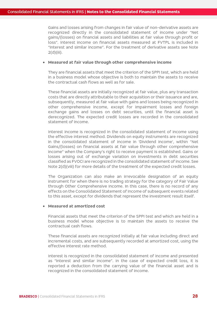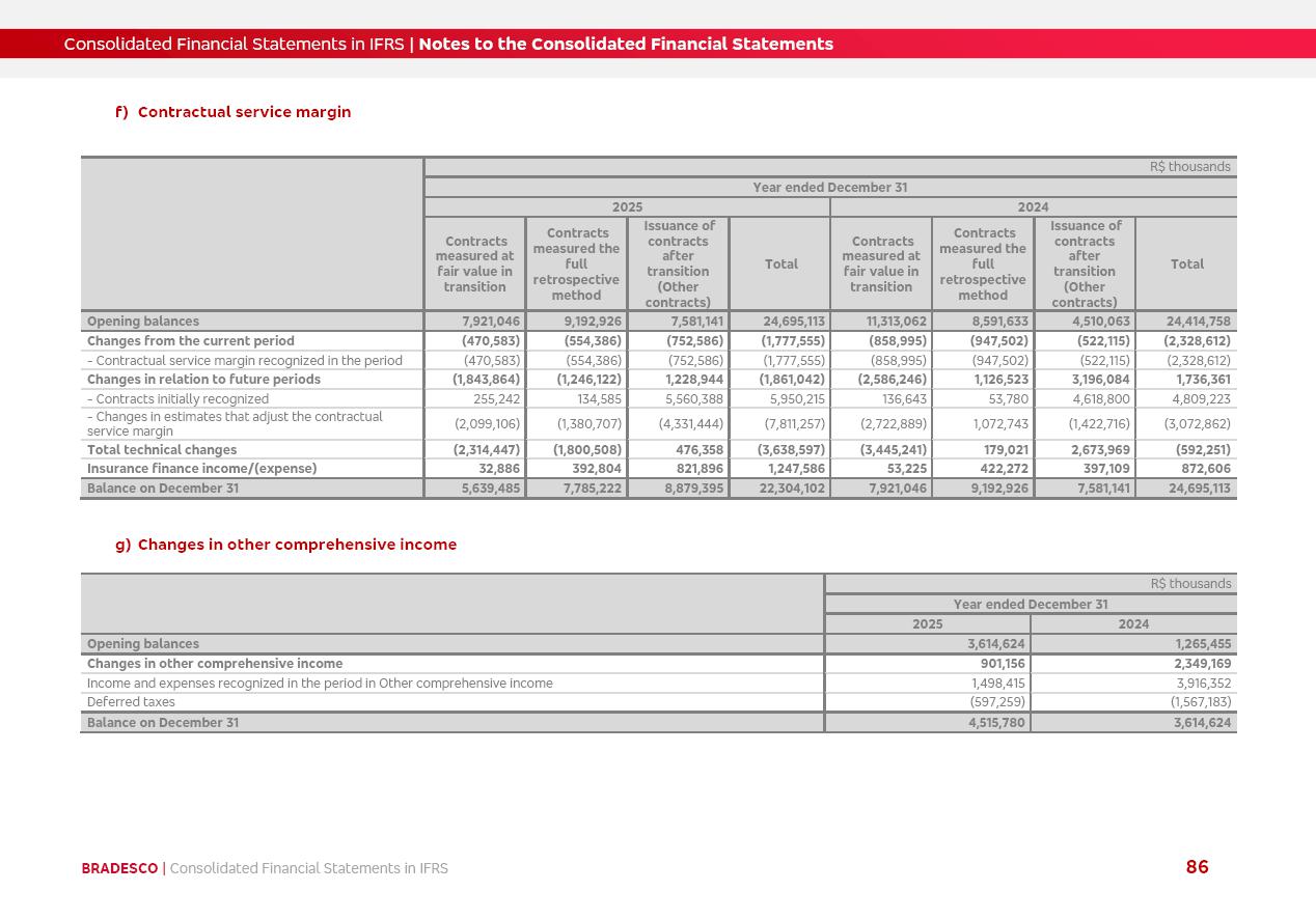 Consolidated Financial Statements 2025 in accordance with International Financial Reporting Standards (IFRS) issued by the International Accounting Standards Boards (IASB) Management Report BRADESCO | Management Report | Consolidated Financial Statements in IFRS 2 Message to Shareholders Throughout our trajectory, we have maintained a firm commitment to serve with excellence, strengthening the brand and reaffirming the relationship of partnership and trust with millions of Brazilians. In 2025, a year marked by a still challenging economic environment and constant changes in the market, our adaptability, resilience and strategic focus were essential. With the commitment and dedication of the teams, we moved forward with consistency in meeting the objectives, preserving the solidity of the operations and expanding initiatives that contribute to the sustainable development of the Country. We believe in the potential of Brazil and the strength of its people, which, with determination, continues to drive economic and social growth. In line with the commitment to transparency and democratization of information, we present in this report a detailed view of the main developments and results achieved in the fiscal year, reinforcing our ethical posture and corporate responsibility. To our shareholders, clients and partners, we thank you for the continued support, the trust in our decisions and the preference that motivates us to move forward, always focusing on delivering value and building an even more promising future. Cidade de Deus, February 04, 2026 Board of Directors and Board of Executive Officers Management Report BRADESCO | Management Report | Consolidated Financial Statements in IFRS 3 Dear Shareholders, We hereby present the Consolidated Financial Statements of Banco Bradesco S.A. related to 2025. We follow all International Financial Reporting Standards (IFRS) practices issued by the International Accounting Standards Board (IASB). Economic Comment The Brazilian economy slowed down in the second half of 2025. The household consumption lost traction throughout the year, responding to the restrictive monetary policy. One-off factors may lead to some re-acceleration of the GDP at the beginning of the year, but our projections indicate a weaker growth in 2026. Inflation closed 2025 within the target range two years above it, with important contributions from exchange rate valuation and accommodation of the economic activity. We believe that deflation will continue in the coming months, allowing the Central Bank of Brazil to start cutting the basic interest rate later this quarter. Uncertainties remain high on the international scene. While the US economy remains resilient, doubts about the US economic policy represent an important risk vector for the global economy. This context is aggravated by geopolitical disputes around the world. Highlights in the period In November 2025, Banco Bradesco S.A. (“Bradesco”) noticed to its shareholders and the market in general the Notice to the Market that Atlântica Hospitais and Participações S.A., a company focused on investment in hospitals, indirectly controlled by Bradesco and Bradseg Participações S.A., firmed an Investment Agreement with Rede D’Or São Luiz S.A. Group for the inclusion of Maternidade São Luiz Star, thus expanding the partnership firmed with Rede D’Or. The expansion of the Partnership is aligned with the strategy of Atlântica to invest in the health sector value chain through partnerships with players established in the operation of hospitals. In December 2025, Bradesco noticed to its shareholders and the market in general, through a Relevant Fact, that the proposal of the Company’s Board of Directors was approved for the payment of complementary interest on own equity, in the total amount of R$3,9 billion, of which R$0.351190748 per common share and R$0.386309823 per preferred share. Closing the fourth quarter of 2025, the Annual Calendar of Corporate Events for 2026 was released and, through a Notice to Shareholders, the planned schedule of the monthly payment of interest on own equity for the fiscal year of 2026, in accordance with the Systematic Monthly Payment of Interest on Own Equity. The disclosure of both documents reinforces Bradesco’s commitment to transparency, predictability and strategic alignment with shareholders and other stakeholders. BRADESCO | Management Report | Consolidated Financial Statements in IFRS 4 . highlighted information 2025 TOTAL DEPOSITS (Dec25 vs. Dec24) R$728.0 bi (+12.2%) R$23.9 bi R$178.4 bi +5.9% y/y EARNINGS PER SHARE BOOK VALUE PER SHARE BOOK NET INCOME R$2.13 common R$2.35 preferred R$16.87 SHAREHOLDERS’ EQUITY (1) MARKET VALUE TIER I CAPITAL R$178.7 bi 13.2% SECURITIES (Dec25 vs. Dec24) R$925.4 bi (+19.4%) FVPL: R$526.9 bi (+49.7%) FVOCI: R$139.0 bi (-11.1%) Amortized Cost: R$259.5 bi (-2.8%) EXPANDED LOAN PORTFOLIO (Dec25 vs. Dec24) R$1,089.2 bi (+11.0%) INDIVIDUALS: R$466.5 bi (+12.7%) COMPANIES: R$622.7 bi (+9.7%) ALLOWANCE FOR EXPANDED LOANS (Dec25 vs. Dec24) R$56.8 bi (-2.6%) INTEREST ON SHAREHOLDERS’ EQUITY R$14.5 bi (gross) +36.4% y/y (1) Equity attributable to shareholders of the parente. +0.8% y/y BRADESCO | Management Report | Consolidated Financial Statements in IFRS 5 Technology and innovation In two years of transformation, technology has become the core value leverage at Bradesco, providing more fluid and personalized customer experience, scalable operational efficiency with agility, security with cyber resilience and real-time prevention. With Agile@Scale, co-managed tribes between business and IT have increased efficiency, quality and value deliveries. In the period, we reduced the lead time by 43% and increased productivity by increasing the volume of deliveries to the business by 118% (vs. Dec23). The implementation of the AI First plan and the consolidation of the Bridge platform have democratized the use of GenAI in products and channels, with gov