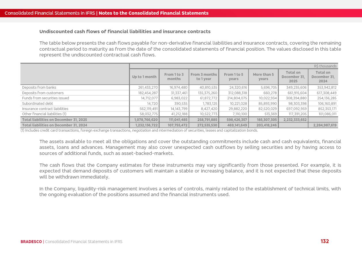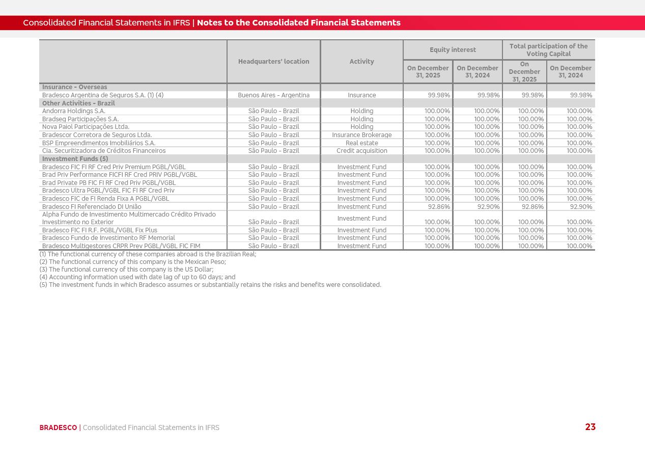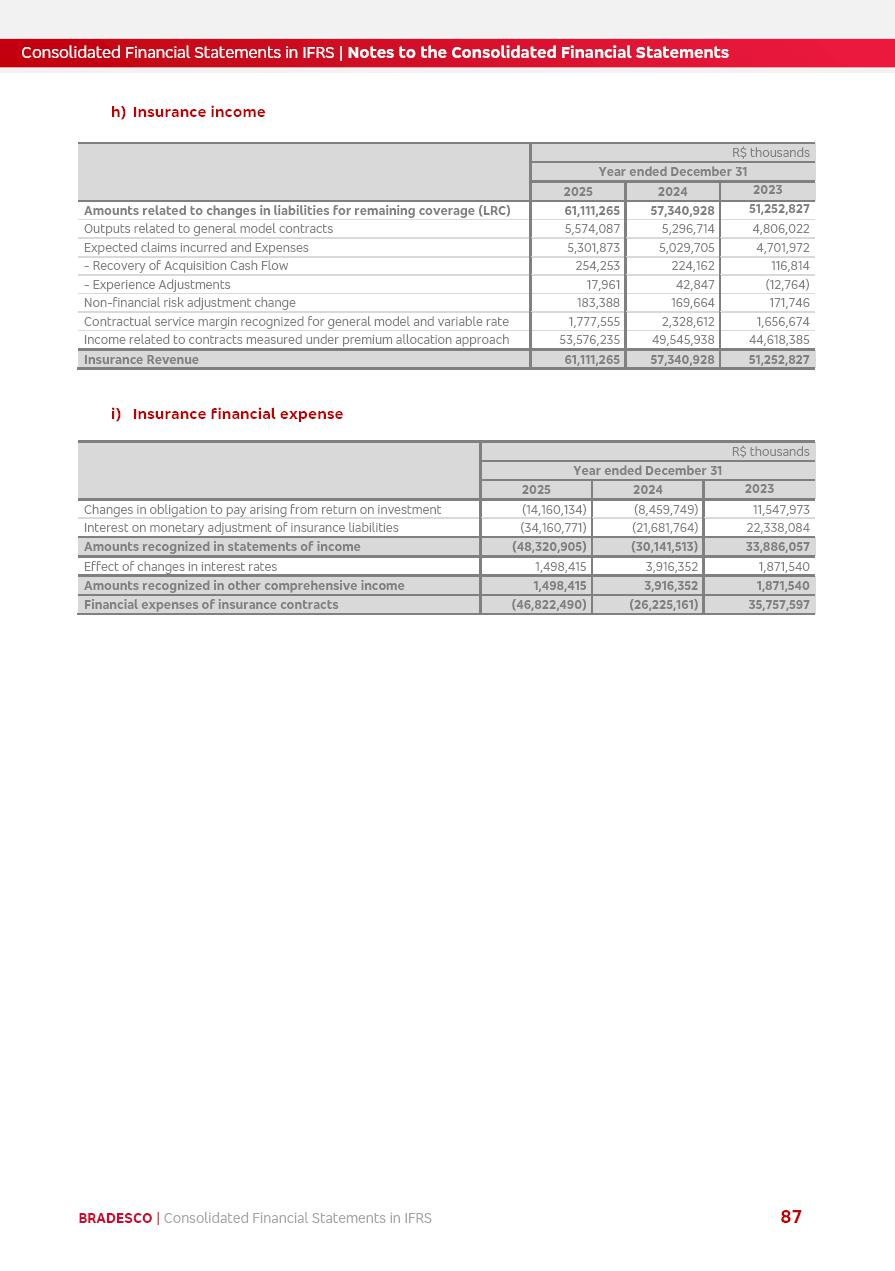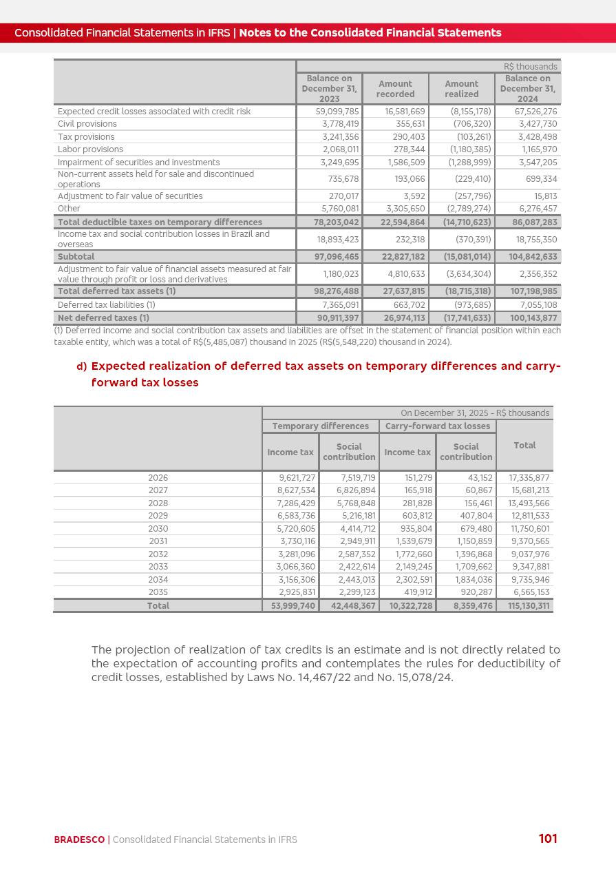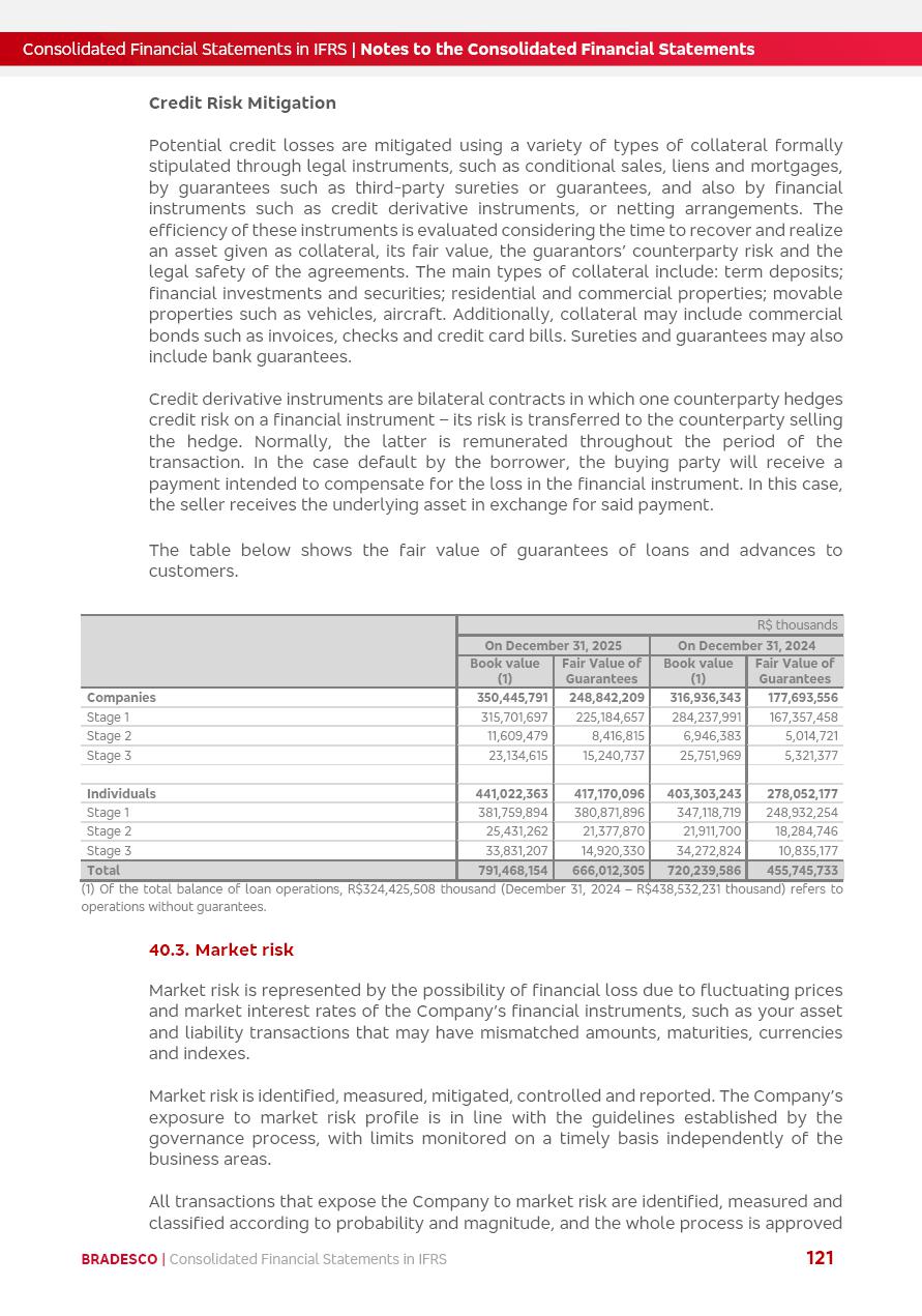 Consolidated Financial Statements 2025 in accordance with International Financial Reporting Standards (IFRS) issued by the International Accounting Standards Boards (IASB) Management Report BRADESCO | Management Report | Consolidated Financial Statements in IFRS 2 Message to Shareholders Throughout our trajectory, we have maintained a firm commitment to serve with excellence, strengthening the brand and reaffirming the relationship of partnership and trust with millions of Brazilians. In 2025, a year marked by a still challenging economic environment and constant changes in the market, our adaptability, resilience and strategic focus were essential. With the commitment and dedication of the teams, we moved forward with consistency in meeting the objectives, preserving the solidity of the operations and expanding initiatives that contribute to the sustainable development of the Country. We believe in the potential of Brazil and the strength of its people, which, with determination, continues to drive economic and social growth. In line with the commitment to transparency and democratization of information, we present in this report a detailed view of the main developments and results achieved in the fiscal year, reinforcing our ethical posture and corporate responsibility. To our shareholders, clients and partners, we thank you for the continued support, the trust in our decisions and the preference that motivates us to move forward, always focusing on delivering value and building an even more promising future. Cidade de Deus, February 04, 2026 Board of Directors and Board of Executive Officers Management Report BRADESCO | Management Report | Consolidated Financial Statements in IFRS 3 Dear Shareholders, We hereby present the Consolidated Financial Statements of Banco Bradesco S.A. related to 2025. We follow all International Financial Reporting Standards (IFRS) practices issued by the International Accounting Standards Board (IASB). Economic Comment The Brazilian economy slowed down in the second half of 2025. The household consumption lost traction throughout the year, responding to the restrictive monetary policy. One-off factors may lead to some re-acceleration of the GDP at the beginning of the year, but our projections indicate a weaker growth in 2026. Inflation closed 2025 within the target range two years above it, with important contributions from exchange rate valuation and accommodation of the economic activity. We believe that deflation will continue in the coming months, allowing the Central Bank of Brazil to start cutting the basic interest rate later this quarter. Uncertainties remain high on the international scene. While the US economy remains resilient, doubts about the US economic policy represent an important risk vector for the global economy. This context is aggravated by geopolitical disputes around the world. Highlights in the period In November 2025, Banco Bradesco S.A. (“Bradesco”) noticed to its shareholders and the market in general the Notice to the Market that Atlântica Hospitais and Participações S.A., a company focused on investment in hospitals, indirectly controlled by Bradesco and Bradseg Participações S.A., firmed an Investment Agreement with Rede D’Or São Luiz S.A. Group for the inclusion of Maternidade São Luiz Star, thus expanding the partnership firmed with Rede D’Or. The expansion of the Partnership is aligned with the strategy of Atlântica to invest in the health sector value chain through partnerships with players established in the operation of hospitals. In December 2025, Bradesco noticed to its shareholders and the market in general, through a Relevant Fact, that the proposal of the Company’s Board of Directors was approved for the payment of complementary interest on own equity, in the total amount of R$3,9 billion, of which R$0.351190748 per common share and R$0.386309823 per preferred share. Closing the fourth quarter of 2025, the Annual Calendar of Corporate Events for 2026 was released and, through a Notice to Shareholders, the planned schedule of the monthly payment of interest on own equity for the fiscal year of 2026, in accordance with the Systematic Monthly Payment of Interest on Own Equity. The disclosure of both documents reinforces Bradesco’s commitment to transparency, predictability and strategic alignment with shareholders and other stakeholders. BRADESCO | Management Report | Consolidated Financial Statements in IFRS 4 . highlighted information 2025 TOTAL DEPOSITS (Dec25 vs. Dec24) R$728.0 bi (+12.2%) R$23.9 bi R$178.4 bi +5.9% y/y EARNINGS PER SHARE BOOK VALUE PER SHARE BOOK NET INCOME R$2.13 common R$2.35 preferred R$16.87 SHAREHOLDERS’ EQUITY (1) MARKET VALUE TIER I CAPITAL R$178.7 bi 13.2% SECURITIES (Dec25 vs. Dec24) R$925.4 bi (+19.4%) FVPL: R$526.9 bi (+49.7%) FVOCI: R$139.0 bi (-11.1%) Amortized Cost: R$259.5 bi (-2.8%) EXPANDED LOAN PORTFOLIO (Dec25 vs. Dec24) R$1,089.2 bi (+11.0%) INDIVIDUALS: R$466.5 bi (+12.7%) COMPANIES: R$622.7 bi (+9.7%) ALLOWANCE FOR EXPANDED LOANS (Dec25 vs. Dec24) R$56.8 bi (-2.6%) INTEREST ON SHAREHOLDERS’ EQUITY R$14.5 bi (gross) +36.4% y/y (1) Equity attributable to shareholders of the parente. +0.8% y/y BRADESCO | Management Report | Consolidated Financial Statements in IFRS 5 Technology and innovation In two years of transformation, technology has become the core value leverage at Bradesco, providing more fluid and personalized customer experience, scalable operational efficiency with agility, security with cyber resilience and real-time prevention. With Agile@Scale, co-managed tribes between business and IT have increased efficiency, quality and value deliveries. In the period, we reduced the lead time by 43% and increased productivity by increasing the volume of deliveries to the business by 118% (vs. Dec23). The implementation of the AI First plan and the consolidation of the Bridge platform have democratized the use of GenAI in products and channels, with gov