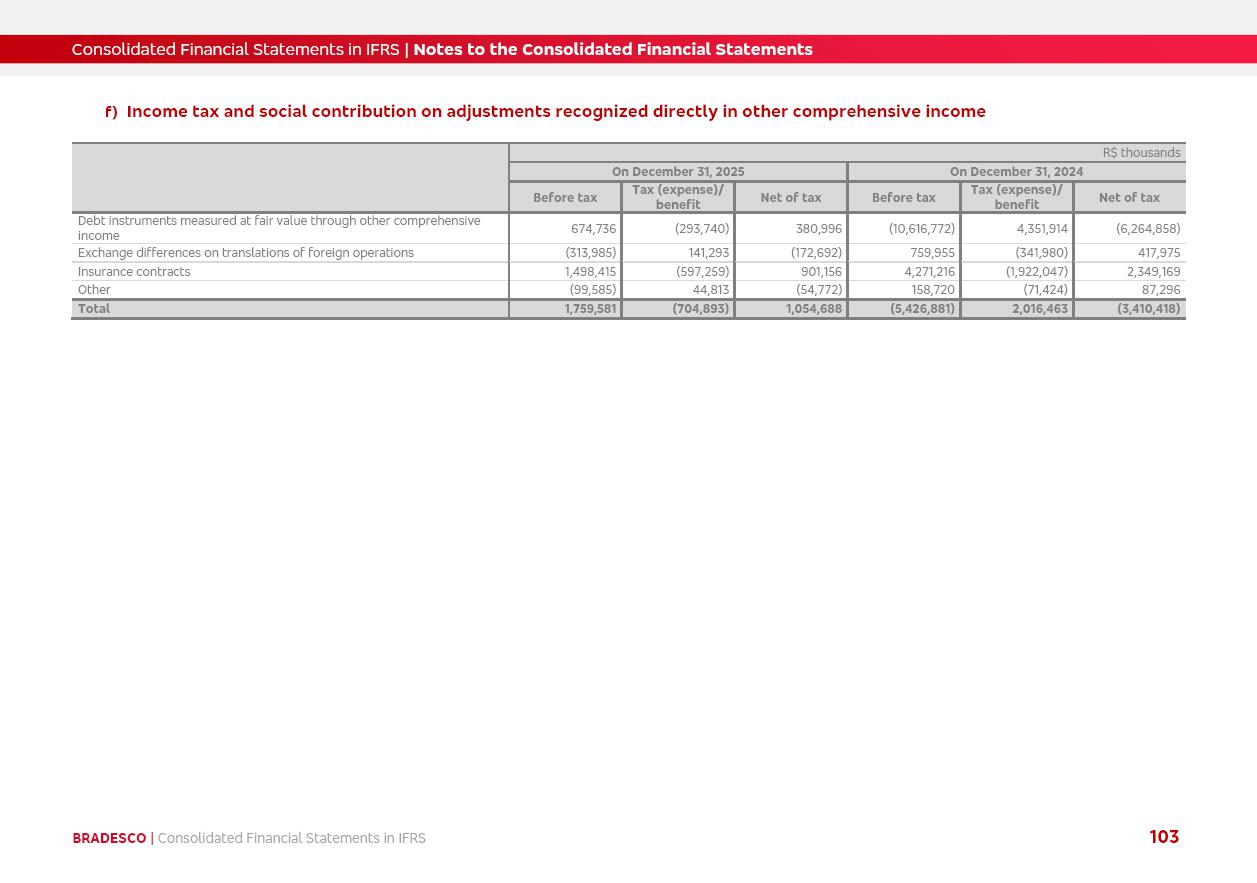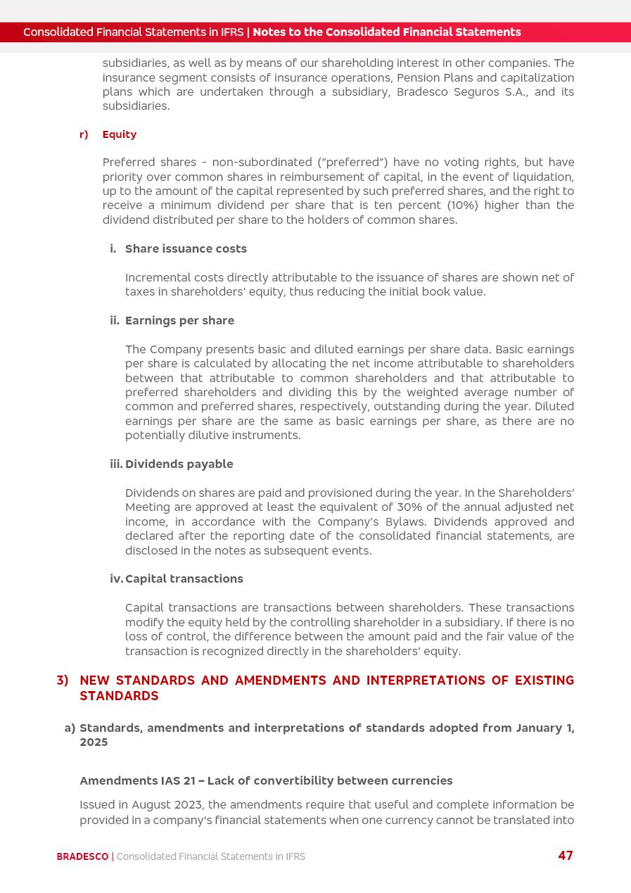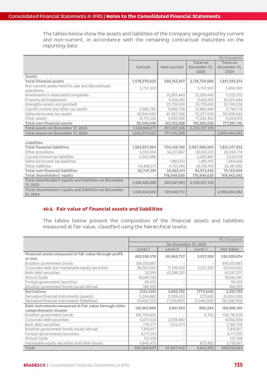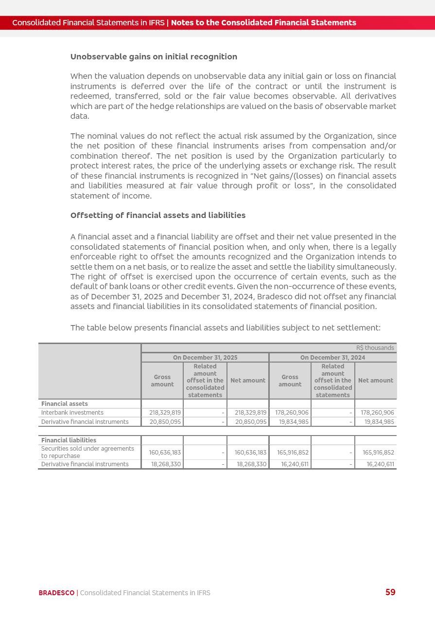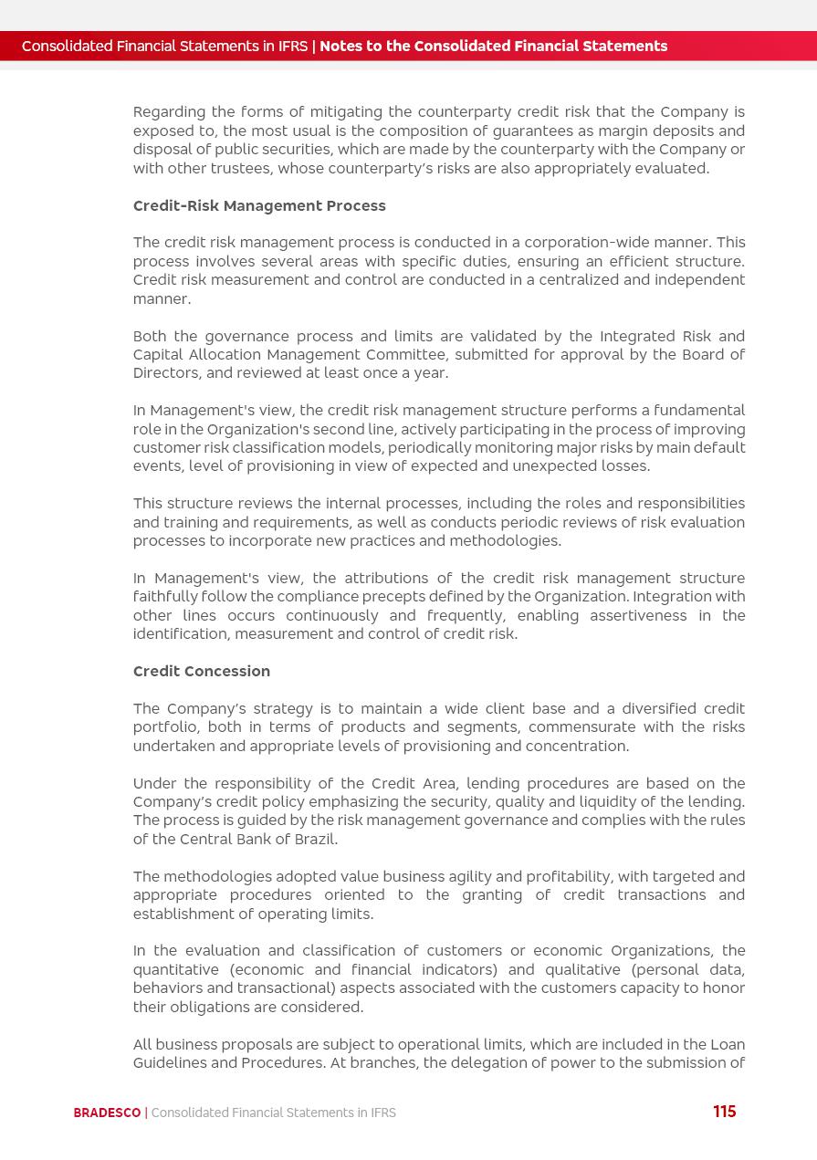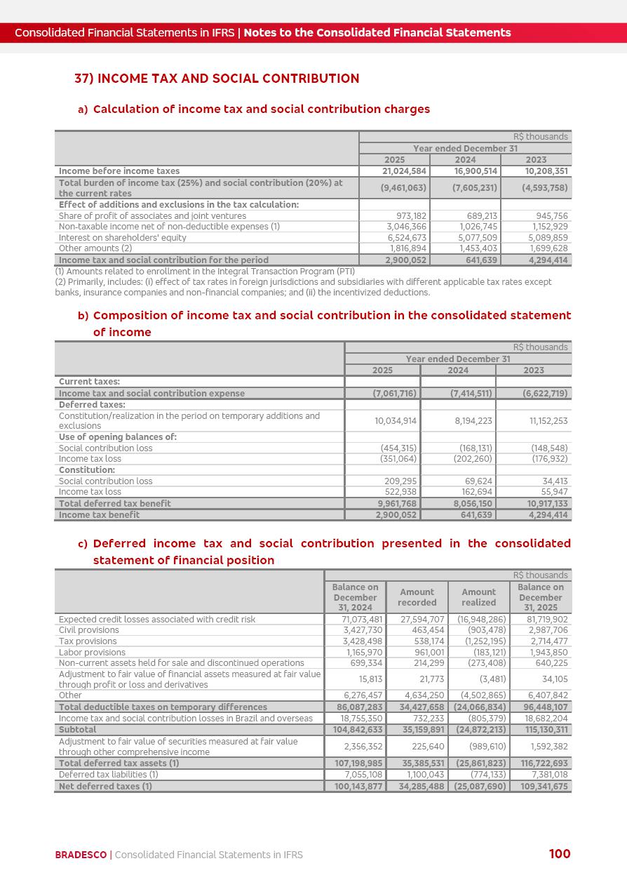 Consolidated Financial Statements 2025 in accordance with International Financial Reporting Standards (IFRS) issued by the International Accounting Standards Boards (IASB) Management Report BRADESCO | Management Report | Consolidated Financial Statements in IFRS 2 Message to Shareholders Throughout our trajectory, we have maintained a firm commitment to serve with excellence, strengthening the brand and reaffirming the relationship of partnership and trust with millions of Brazilians. In 2025, a year marked by a still challenging economic environment and constant changes in the market, our adaptability, resilience and strategic focus were essential. With the commitment and dedication of the teams, we moved forward with consistency in meeting the objectives, preserving the solidity of the operations and expanding initiatives that contribute to the sustainable development of the Country. We believe in the potential of Brazil and the strength of its people, which, with determination, continues to drive economic and social growth. In line with the commitment to transparency and democratization of information, we present in this report a detailed view of the main developments and results achieved in the fiscal year, reinforcing our ethical posture and corporate responsibility. To our shareholders, clients and partners, we thank you for the continued support, the trust in our decisions and the preference that motivates us to move forward, always focusing on delivering value and building an even more promising future. Cidade de Deus, February 04, 2026 Board of Directors and Board of Executive Officers Management Report BRADESCO | Management Report | Consolidated Financial Statements in IFRS 3 Dear Shareholders, We hereby present the Consolidated Financial Statements of Banco Bradesco S.A. related to 2025. We follow all International Financial Reporting Standards (IFRS) practices issued by the International Accounting Standards Board (IASB). Economic Comment The Brazilian economy slowed down in the second half of 2025. The household consumption lost traction throughout the year, responding to the restrictive monetary policy. One-off factors may lead to some re-acceleration of the GDP at the beginning of the year, but our projections indicate a weaker growth in 2026. Inflation closed 2025 within the target range two years above it, with important contributions from exchange rate valuation and accommodation of the economic activity. We believe that deflation will continue in the coming months, allowing the Central Bank of Brazil to start cutting the basic interest rate later this quarter. Uncertainties remain high on the international scene. While the US economy remains resilient, doubts about the US economic policy represent an important risk vector for the global economy. This context is aggravated by geopolitical disputes around the world. Highlights in the period In November 2025, Banco Bradesco S.A. (“Bradesco”) noticed to its shareholders and the market in general the Notice to the Market that Atlântica Hospitais and Participações S.A., a company focused on investment in hospitals, indirectly controlled by Bradesco and Bradseg Participações S.A., firmed an Investment Agreement with Rede D’Or São Luiz S.A. Group for the inclusion of Maternidade São Luiz Star, thus expanding the partnership firmed with Rede D’Or. The expansion of the Partnership is aligned with the strategy of Atlântica to invest in the health sector value chain through partnerships with players established in the operation of hospitals. In December 2025, Bradesco noticed to its shareholders and the market in general, through a Relevant Fact, that the proposal of the Company’s Board of Directors was approved for the payment of complementary interest on own equity, in the total amount of R$3,9 billion, of which R$0.351190748 per common share and R$0.386309823 per preferred share. Closing the fourth quarter of 2025, the Annual Calendar of Corporate Events for 2026 was released and, through a Notice to Shareholders, the planned schedule of the monthly payment of interest on own equity for the fiscal year of 2026, in accordance with the Systematic Monthly Payment of Interest on Own Equity. The disclosure of both documents reinforces Bradesco’s commitment to transparency, predictability and strategic alignment with shareholders and other stakeholders. BRADESCO | Management Report | Consolidated Financial Statements in IFRS 4 . highlighted information 2025 TOTAL DEPOSITS (Dec25 vs. Dec24) R$728.0 bi (+12.2%) R$23.9 bi R$178.4 bi +5.9% y/y EARNINGS PER SHARE BOOK VALUE PER SHARE BOOK NET INCOME R$2.13 common R$2.35 preferred R$16.87 SHAREHOLDERS’ EQUITY (1) MARKET VALUE TIER I CAPITAL R$178.7 bi 13.2% SECURITIES (Dec25 vs. Dec24) R$925.4 bi (+19.4%) FVPL: R$526.9 bi (+49.7%) FVOCI: R$139.0 bi (-11.1%) Amortized Cost: R$259.5 bi (-2.8%) EXPANDED LOAN PORTFOLIO (Dec25 vs. Dec24) R$1,089.2 bi (+11.0%) INDIVIDUALS: R$466.5 bi (+12.7%) COMPANIES: R$622.7 bi (+9.7%) ALLOWANCE FOR EXPANDED LOANS (Dec25 vs. Dec24) R$56.8 bi (-2.6%) INTEREST ON SHAREHOLDERS’ EQUITY R$14.5 bi (gross) +36.4% y/y (1) Equity attributable to shareholders of the parente. +0.8% y/y BRADESCO | Management Report | Consolidated Financial Statements in IFRS 5 Technology and innovation In two years of transformation, technology has become the core value leverage at Bradesco, providing more fluid and personalized customer experience, scalable operational efficiency with agility, security with cyber resilience and real-time prevention. With Agile@Scale, co-managed tribes between business and IT have increased efficiency, quality and value deliveries. In the period, we reduced the lead time by 43% and increased productivity by increasing the volume of deliveries to the business by 118% (vs. Dec23). The implementation of the AI First plan and the consolidation of the Bridge platform have democratized the use of GenAI in products and channels, with gov