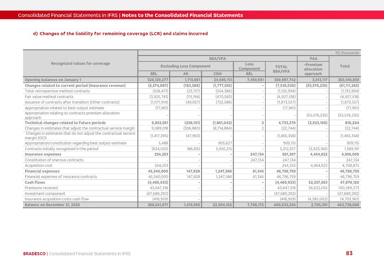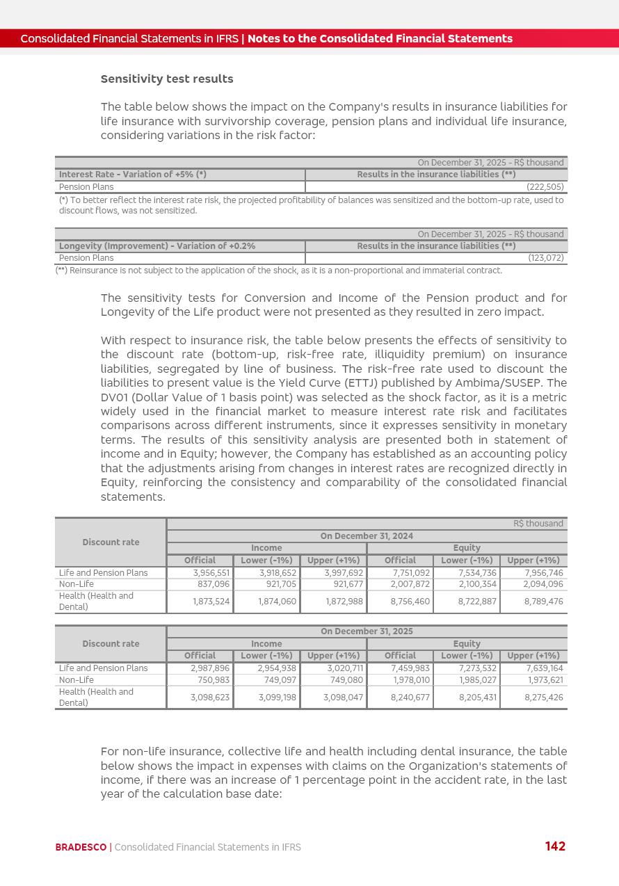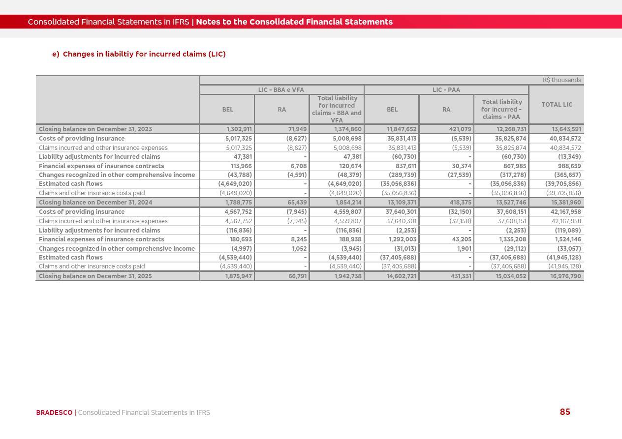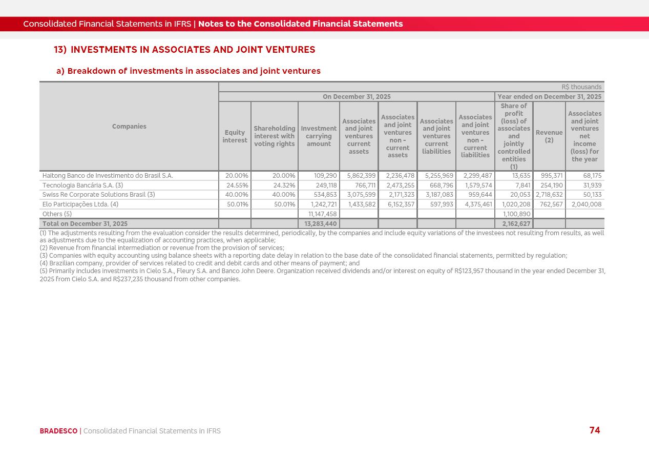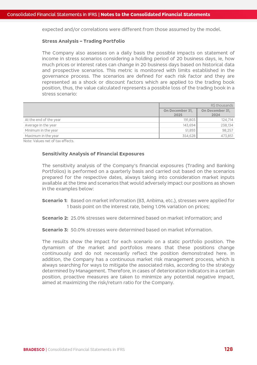 Consolidated Financial Statements 2025 in accordance with International Financial Reporting Standards (IFRS) issued by the International Accounting Standards Boards (IASB) Management Report BRADESCO | Management Report | Consolidated Financial Statements in IFRS 2 Message to Shareholders Throughout our trajectory, we have maintained a firm commitment to serve with excellence, strengthening the brand and reaffirming the relationship of partnership and trust with millions of Brazilians. In 2025, a year marked by a still challenging economic environment and constant changes in the market, our adaptability, resilience and strategic focus were essential. With the commitment and dedication of the teams, we moved forward with consistency in meeting the objectives, preserving the solidity of the operations and expanding initiatives that contribute to the sustainable development of the Country. We believe in the potential of Brazil and the strength of its people, which, with determination, continues to drive economic and social growth. In line with the commitment to transparency and democratization of information, we present in this report a detailed view of the main developments and results achieved in the fiscal year, reinforcing our ethical posture and corporate responsibility. To our shareholders, clients and partners, we thank you for the continued support, the trust in our decisions and the preference that motivates us to move forward, always focusing on delivering value and building an even more promising future. Cidade de Deus, February 04, 2026 Board of Directors and Board of Executive Officers Management Report BRADESCO | Management Report | Consolidated Financial Statements in IFRS 3 Dear Shareholders, We hereby present the Consolidated Financial Statements of Banco Bradesco S.A. related to 2025. We follow all International Financial Reporting Standards (IFRS) practices issued by the International Accounting Standards Board (IASB). Economic Comment The Brazilian economy slowed down in the second half of 2025. The household consumption lost traction throughout the year, responding to the restrictive monetary policy. One-off factors may lead to some re-acceleration of the GDP at the beginning of the year, but our projections indicate a weaker growth in 2026. Inflation closed 2025 within the target range two years above it, with important contributions from exchange rate valuation and accommodation of the economic activity. We believe that deflation will continue in the coming months, allowing the Central Bank of Brazil to start cutting the basic interest rate later this quarter. Uncertainties remain high on the international scene. While the US economy remains resilient, doubts about the US economic policy represent an important risk vector for the global economy. This context is aggravated by geopolitical disputes around the world. Highlights in the period In November 2025, Banco Bradesco S.A. (“Bradesco”) noticed to its shareholders and the market in general the Notice to the Market that Atlântica Hospitais and Participações S.A., a company focused on investment in hospitals, indirectly controlled by Bradesco and Bradseg Participações S.A., firmed an Investment Agreement with Rede D’Or São Luiz S.A. Group for the inclusion of Maternidade São Luiz Star, thus expanding the partnership firmed with Rede D’Or. The expansion of the Partnership is aligned with the strategy of Atlântica to invest in the health sector value chain through partnerships with players established in the operation of hospitals. In December 2025, Bradesco noticed to its shareholders and the market in general, through a Relevant Fact, that the proposal of the Company’s Board of Directors was approved for the payment of complementary interest on own equity, in the total amount of R$3,9 billion, of which R$0.351190748 per common share and R$0.386309823 per preferred share. Closing the fourth quarter of 2025, the Annual Calendar of Corporate Events for 2026 was released and, through a Notice to Shareholders, the planned schedule of the monthly payment of interest on own equity for the fiscal year of 2026, in accordance with the Systematic Monthly Payment of Interest on Own Equity. The disclosure of both documents reinforces Bradesco’s commitment to transparency, predictability and strategic alignment with shareholders and other stakeholders. BRADESCO | Management Report | Consolidated Financial Statements in IFRS 4 . highlighted information 2025 TOTAL DEPOSITS (Dec25 vs. Dec24) R$728.0 bi (+12.2%) R$23.9 bi R$178.4 bi +5.9% y/y EARNINGS PER SHARE BOOK VALUE PER SHARE BOOK NET INCOME R$2.13 common R$2.35 preferred R$16.87 SHAREHOLDERS’ EQUITY (1) MARKET VALUE TIER I CAPITAL R$178.7 bi 13.2% SECURITIES (Dec25 vs. Dec24) R$925.4 bi (+19.4%) FVPL: R$526.9 bi (+49.7%) FVOCI: R$139.0 bi (-11.1%) Amortized Cost: R$259.5 bi (-2.8%) EXPANDED LOAN PORTFOLIO (Dec25 vs. Dec24) R$1,089.2 bi (+11.0%) INDIVIDUALS: R$466.5 bi (+12.7%) COMPANIES: R$622.7 bi (+9.7%) ALLOWANCE FOR EXPANDED LOANS (Dec25 vs. Dec24) R$56.8 bi (-2.6%) INTEREST ON SHAREHOLDERS’ EQUITY R$14.5 bi (gross) +36.4% y/y (1) Equity attributable to shareholders of the parente. +0.8% y/y BRADESCO | Management Report | Consolidated Financial Statements in IFRS 5 Technology and innovation In two years of transformation, technology has become the core value leverage at Bradesco, providing more fluid and personalized customer experience, scalable operational efficiency with agility, security with cyber resilience and real-time prevention. With Agile@Scale, co-managed tribes between business and IT have increased efficiency, quality and value deliveries. In the period, we reduced the lead time by 43% and increased productivity by increasing the volume of deliveries to the business by 118% (vs. Dec23). The implementation of the AI First plan and the consolidation of the Bridge platform have democratized the use of GenAI in products and channels, with gov