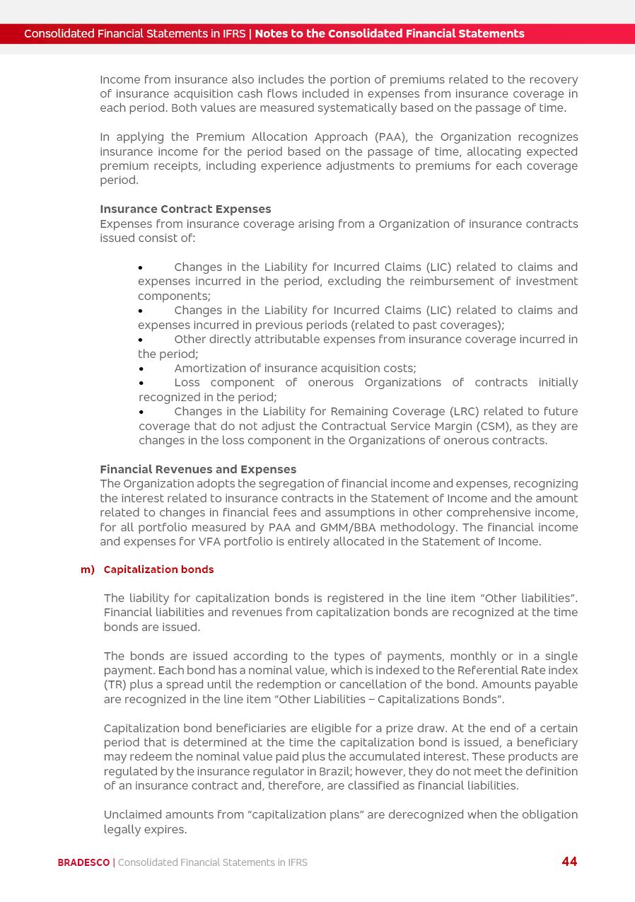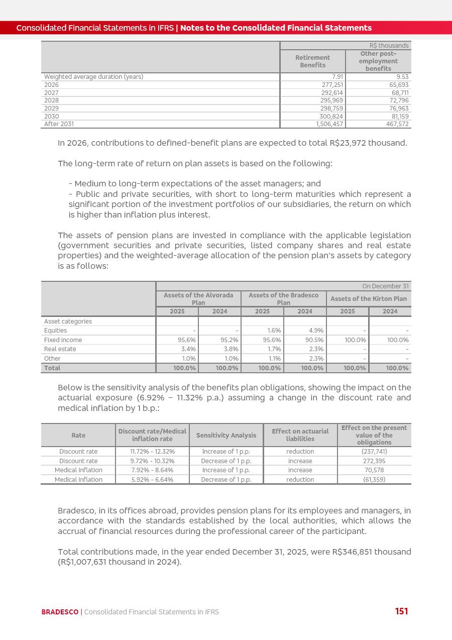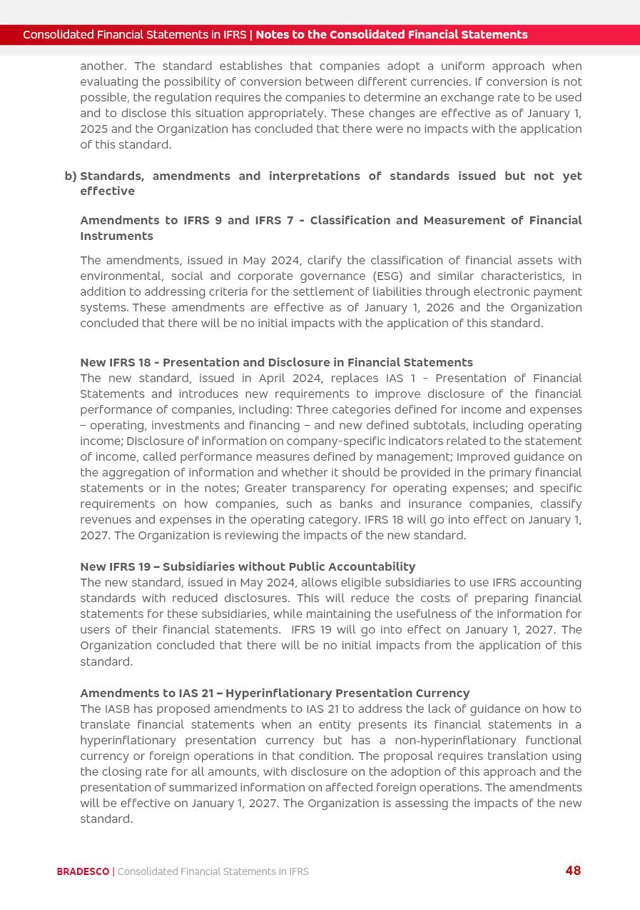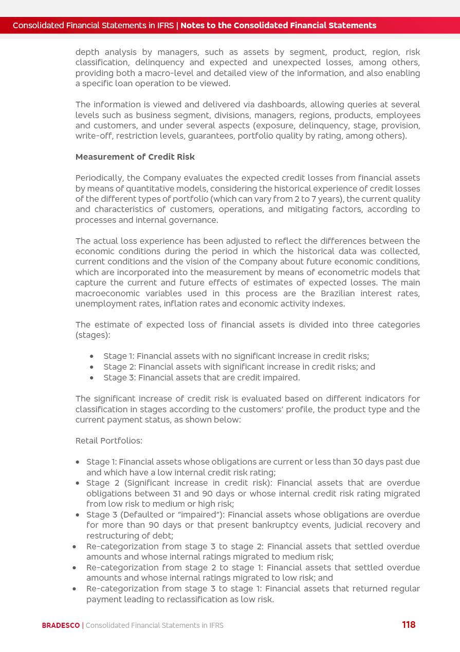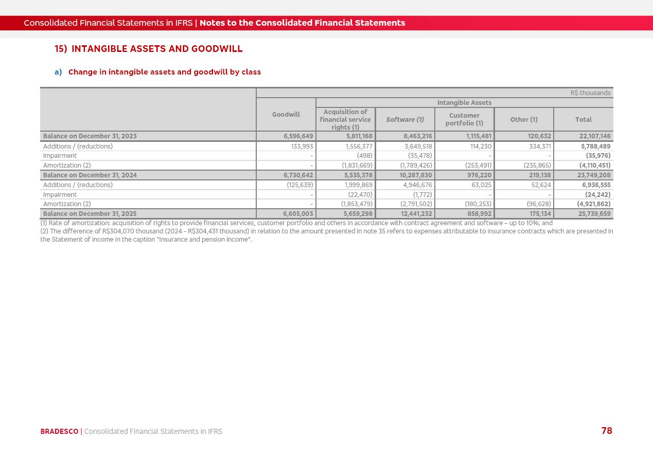 Consolidated Financial Statements 2025 in accordance with International Financial Reporting Standards (IFRS) issued by the International Accounting Standards Boards (IASB) Management Report BRADESCO | Management Report | Consolidated Financial Statements in IFRS 2 Message to Shareholders Throughout our trajectory, we have maintained a firm commitment to serve with excellence, strengthening the brand and reaffirming the relationship of partnership and trust with millions of Brazilians. In 2025, a year marked by a still challenging economic environment and constant changes in the market, our adaptability, resilience and strategic focus were essential. With the commitment and dedication of the teams, we moved forward with consistency in meeting the objectives, preserving the solidity of the operations and expanding initiatives that contribute to the sustainable development of the Country. We believe in the potential of Brazil and the strength of its people, which, with determination, continues to drive economic and social growth. In line with the commitment to transparency and democratization of information, we present in this report a detailed view of the main developments and results achieved in the fiscal year, reinforcing our ethical posture and corporate responsibility. To our shareholders, clients and partners, we thank you for the continued support, the trust in our decisions and the preference that motivates us to move forward, always focusing on delivering value and building an even more promising future. Cidade de Deus, February 04, 2026 Board of Directors and Board of Executive Officers Management Report BRADESCO | Management Report | Consolidated Financial Statements in IFRS 3 Dear Shareholders, We hereby present the Consolidated Financial Statements of Banco Bradesco S.A. related to 2025. We follow all International Financial Reporting Standards (IFRS) practices issued by the International Accounting Standards Board (IASB). Economic Comment The Brazilian economy slowed down in the second half of 2025. The household consumption lost traction throughout the year, responding to the restrictive monetary policy. One-off factors may lead to some re-acceleration of the GDP at the beginning of the year, but our projections indicate a weaker growth in 2026. Inflation closed 2025 within the target range two years above it, with important contributions from exchange rate valuation and accommodation of the economic activity. We believe that deflation will continue in the coming months, allowing the Central Bank of Brazil to start cutting the basic interest rate later this quarter. Uncertainties remain high on the international scene. While the US economy remains resilient, doubts about the US economic policy represent an important risk vector for the global economy. This context is aggravated by geopolitical disputes around the world. Highlights in the period In November 2025, Banco Bradesco S.A. (“Bradesco”) noticed to its shareholders and the market in general the Notice to the Market that Atlântica Hospitais and Participações S.A., a company focused on investment in hospitals, indirectly controlled by Bradesco and Bradseg Participações S.A., firmed an Investment Agreement with Rede D’Or São Luiz S.A. Group for the inclusion of Maternidade São Luiz Star, thus expanding the partnership firmed with Rede D’Or. The expansion of the Partnership is aligned with the strategy of Atlântica to invest in the health sector value chain through partnerships with players established in the operation of hospitals. In December 2025, Bradesco noticed to its shareholders and the market in general, through a Relevant Fact, that the proposal of the Company’s Board of Directors was approved for the payment of complementary interest on own equity, in the total amount of R$3,9 billion, of which R$0.351190748 per common share and R$0.386309823 per preferred share. Closing the fourth quarter of 2025, the Annual Calendar of Corporate Events for 2026 was released and, through a Notice to Shareholders, the planned schedule of the monthly payment of interest on own equity for the fiscal year of 2026, in accordance with the Systematic Monthly Payment of Interest on Own Equity. The disclosure of both documents reinforces Bradesco’s commitment to transparency, predictability and strategic alignment with shareholders and other stakeholders. BRADESCO | Management Report | Consolidated Financial Statements in IFRS 4 . highlighted information 2025 TOTAL DEPOSITS (Dec25 vs. Dec24) R$728.0 bi (+12.2%) R$23.9 bi R$178.4 bi +5.9% y/y EARNINGS PER SHARE BOOK VALUE PER SHARE BOOK NET INCOME R$2.13 common R$2.35 preferred R$16.87 SHAREHOLDERS’ EQUITY (1) MARKET VALUE TIER I CAPITAL R$178.7 bi 13.2% SECURITIES (Dec25 vs. Dec24) R$925.4 bi (+19.4%) FVPL: R$526.9 bi (+49.7%) FVOCI: R$139.0 bi (-11.1%) Amortized Cost: R$259.5 bi (-2.8%) EXPANDED LOAN PORTFOLIO (Dec25 vs. Dec24) R$1,089.2 bi (+11.0%) INDIVIDUALS: R$466.5 bi (+12.7%) COMPANIES: R$622.7 bi (+9.7%) ALLOWANCE FOR EXPANDED LOANS (Dec25 vs. Dec24) R$56.8 bi (-2.6%) INTEREST ON SHAREHOLDERS’ EQUITY R$14.5 bi (gross) +36.4% y/y (1) Equity attributable to shareholders of the parente. +0.8% y/y BRADESCO | Management Report | Consolidated Financial Statements in IFRS 5 Technology and innovation In two years of transformation, technology has become the core value leverage at Bradesco, providing more fluid and personalized customer experience, scalable operational efficiency with agility, security with cyber resilience and real-time prevention. With Agile@Scale, co-managed tribes between business and IT have increased efficiency, quality and value deliveries. In the period, we reduced the lead time by 43% and increased productivity by increasing the volume of deliveries to the business by 118% (vs. Dec23). The implementation of the AI First plan and the consolidation of the Bridge platform have democratized the use of GenAI in products and channels, with gov