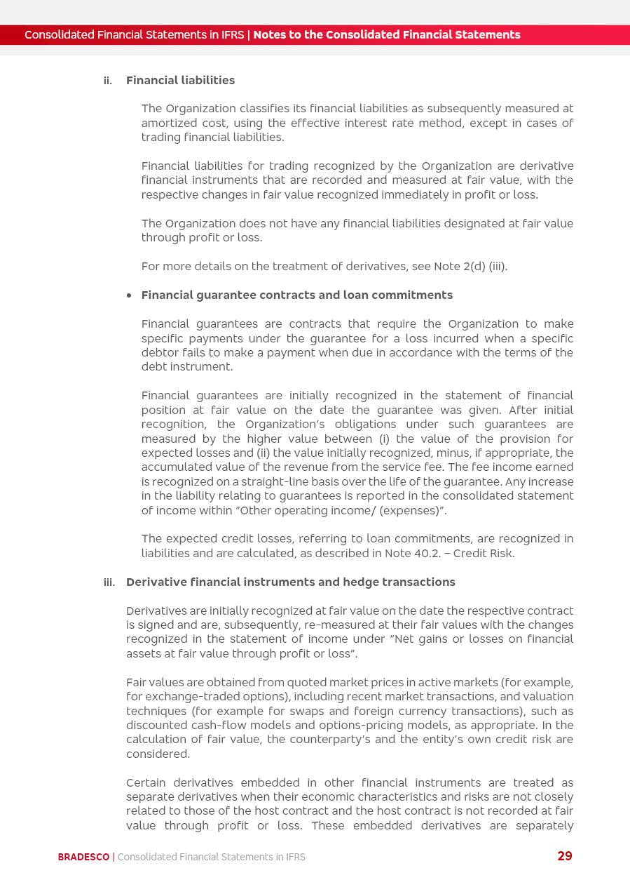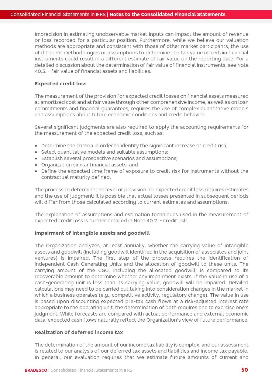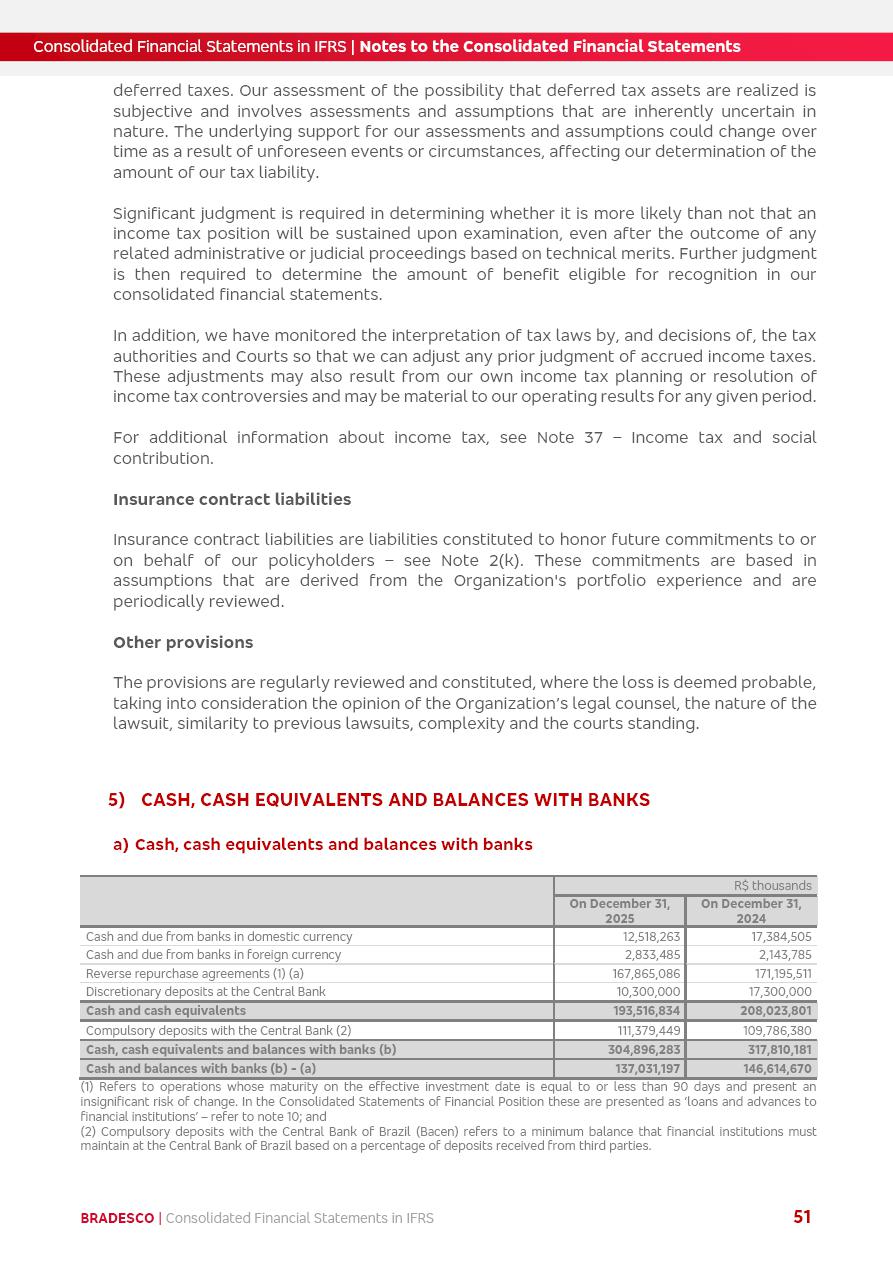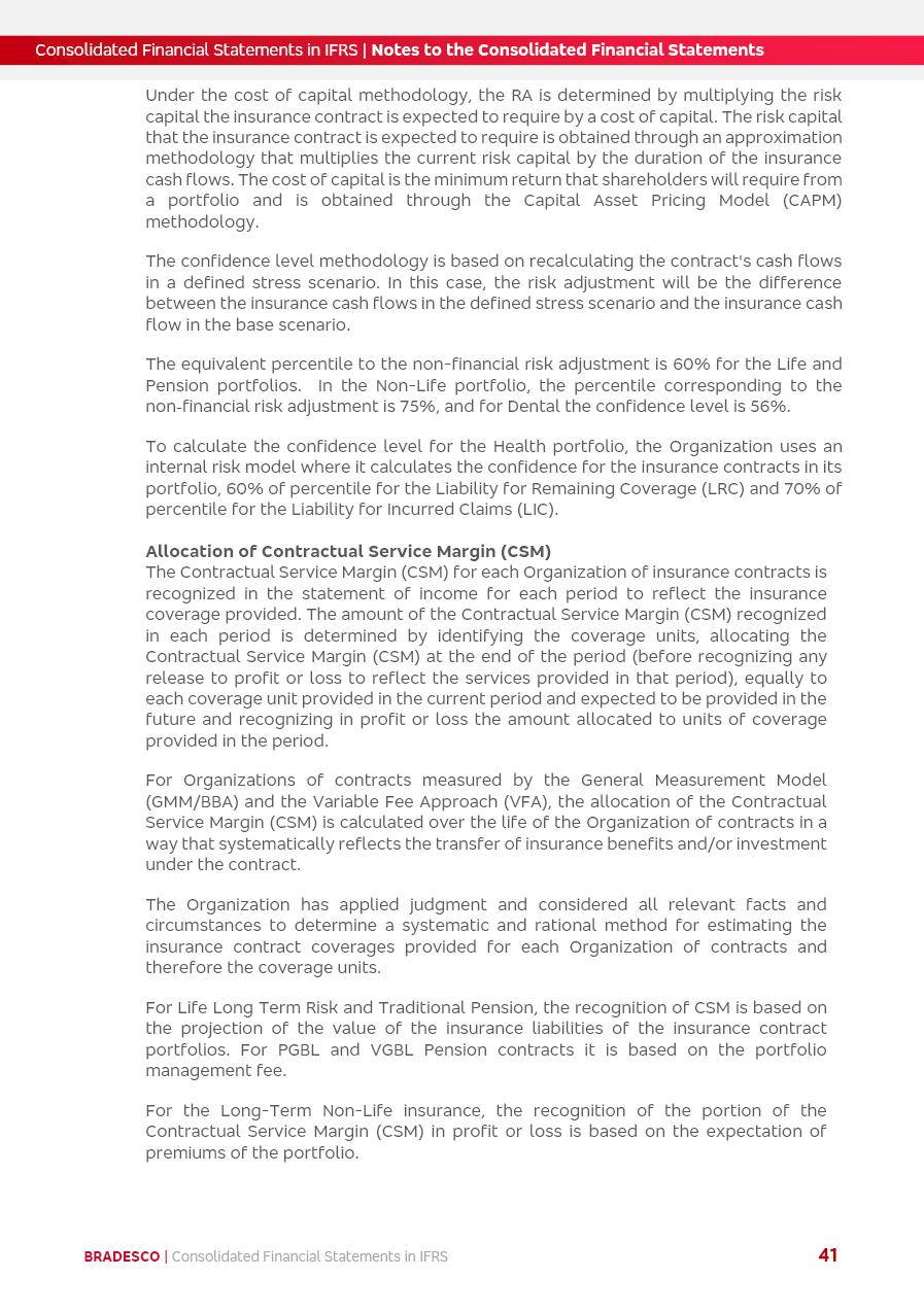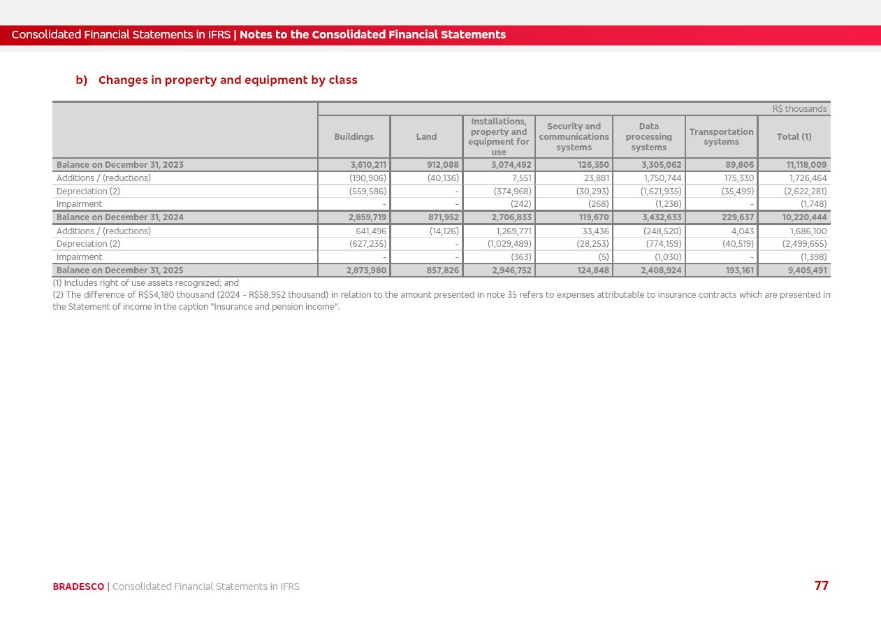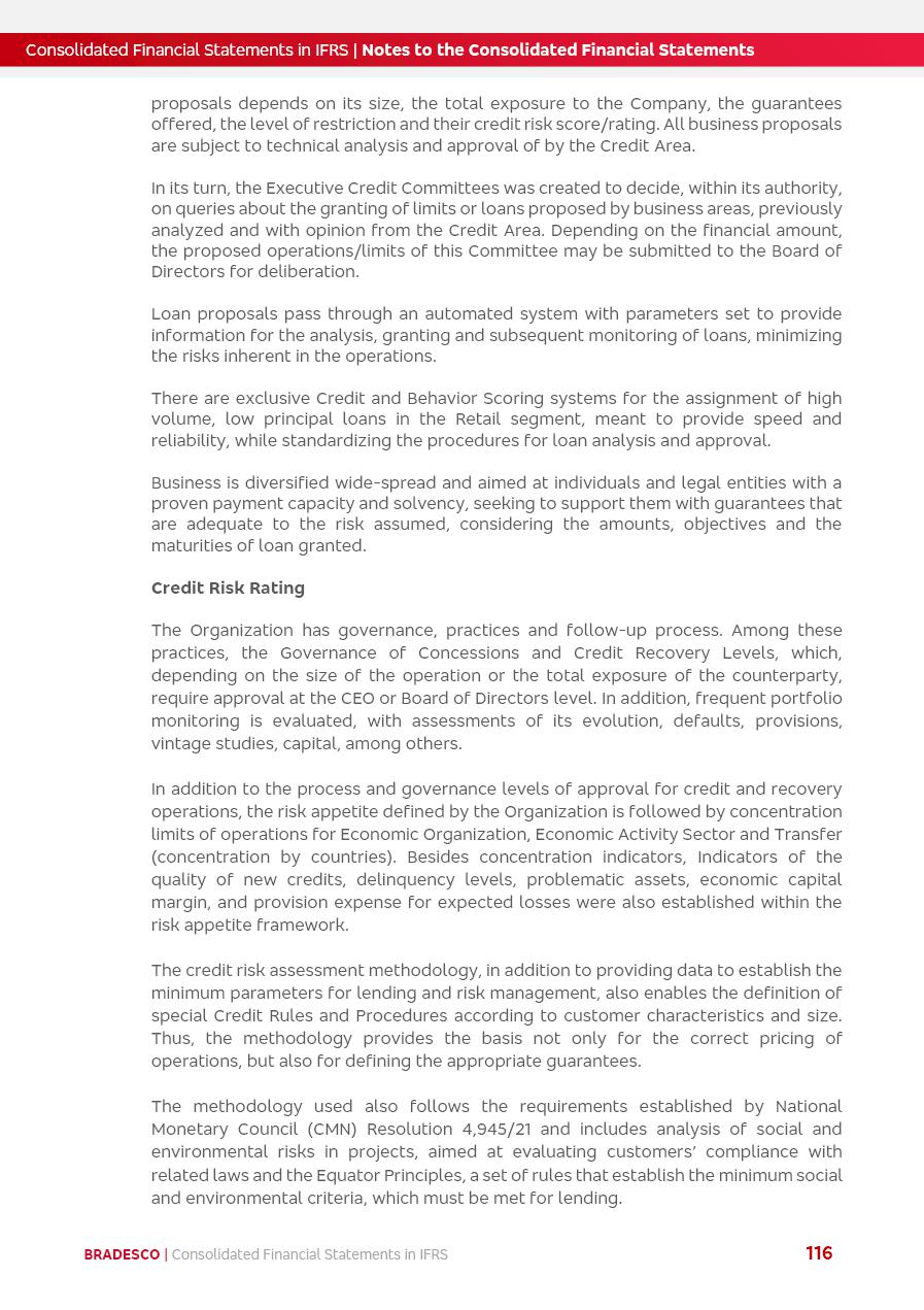 Consolidated Financial Statements 2025 in accordance with International Financial Reporting Standards (IFRS) issued by the International Accounting Standards Boards (IASB) Management Report BRADESCO | Management Report | Consolidated Financial Statements in IFRS 2 Message to Shareholders Throughout our trajectory, we have maintained a firm commitment to serve with excellence, strengthening the brand and reaffirming the relationship of partnership and trust with millions of Brazilians. In 2025, a year marked by a still challenging economic environment and constant changes in the market, our adaptability, resilience and strategic focus were essential. With the commitment and dedication of the teams, we moved forward with consistency in meeting the objectives, preserving the solidity of the operations and expanding initiatives that contribute to the sustainable development of the Country. We believe in the potential of Brazil and the strength of its people, which, with determination, continues to drive economic and social growth. In line with the commitment to transparency and democratization of information, we present in this report a detailed view of the main developments and results achieved in the fiscal year, reinforcing our ethical posture and corporate responsibility. To our shareholders, clients and partners, we thank you for the continued support, the trust in our decisions and the preference that motivates us to move forward, always focusing on delivering value and building an even more promising future. Cidade de Deus, February 04, 2026 Board of Directors and Board of Executive Officers Management Report BRADESCO | Management Report | Consolidated Financial Statements in IFRS 3 Dear Shareholders, We hereby present the Consolidated Financial Statements of Banco Bradesco S.A. related to 2025. We follow all International Financial Reporting Standards (IFRS) practices issued by the International Accounting Standards Board (IASB). Economic Comment The Brazilian economy slowed down in the second half of 2025. The household consumption lost traction throughout the year, responding to the restrictive monetary policy. One-off factors may lead to some re-acceleration of the GDP at the beginning of the year, but our projections indicate a weaker growth in 2026. Inflation closed 2025 within the target range two years above it, with important contributions from exchange rate valuation and accommodation of the economic activity. We believe that deflation will continue in the coming months, allowing the Central Bank of Brazil to start cutting the basic interest rate later this quarter. Uncertainties remain high on the international scene. While the US economy remains resilient, doubts about the US economic policy represent an important risk vector for the global economy. This context is aggravated by geopolitical disputes around the world. Highlights in the period In November 2025, Banco Bradesco S.A. (“Bradesco”) noticed to its shareholders and the market in general the Notice to the Market that Atlântica Hospitais and Participações S.A., a company focused on investment in hospitals, indirectly controlled by Bradesco and Bradseg Participações S.A., firmed an Investment Agreement with Rede D’Or São Luiz S.A. Group for the inclusion of Maternidade São Luiz Star, thus expanding the partnership firmed with Rede D’Or. The expansion of the Partnership is aligned with the strategy of Atlântica to invest in the health sector value chain through partnerships with players established in the operation of hospitals. In December 2025, Bradesco noticed to its shareholders and the market in general, through a Relevant Fact, that the proposal of the Company’s Board of Directors was approved for the payment of complementary interest on own equity, in the total amount of R$3,9 billion, of which R$0.351190748 per common share and R$0.386309823 per preferred share. Closing the fourth quarter of 2025, the Annual Calendar of Corporate Events for 2026 was released and, through a Notice to Shareholders, the planned schedule of the monthly payment of interest on own equity for the fiscal year of 2026, in accordance with the Systematic Monthly Payment of Interest on Own Equity. The disclosure of both documents reinforces Bradesco’s commitment to transparency, predictability and strategic alignment with shareholders and other stakeholders. BRADESCO | Management Report | Consolidated Financial Statements in IFRS 4 . highlighted information 2025 TOTAL DEPOSITS (Dec25 vs. Dec24) R$728.0 bi (+12.2%) R$23.9 bi R$178.4 bi +5.9% y/y EARNINGS PER SHARE BOOK VALUE PER SHARE BOOK NET INCOME R$2.13 common R$2.35 preferred R$16.87 SHAREHOLDERS’ EQUITY (1) MARKET VALUE TIER I CAPITAL R$178.7 bi 13.2% SECURITIES (Dec25 vs. Dec24) R$925.4 bi (+19.4%) FVPL: R$526.9 bi (+49.7%) FVOCI: R$139.0 bi (-11.1%) Amortized Cost: R$259.5 bi (-2.8%) EXPANDED LOAN PORTFOLIO (Dec25 vs. Dec24) R$1,089.2 bi (+11.0%) INDIVIDUALS: R$466.5 bi (+12.7%) COMPANIES: R$622.7 bi (+9.7%) ALLOWANCE FOR EXPANDED LOANS (Dec25 vs. Dec24) R$56.8 bi (-2.6%) INTEREST ON SHAREHOLDERS’ EQUITY R$14.5 bi (gross) +36.4% y/y (1) Equity attributable to shareholders of the parente. +0.8% y/y BRADESCO | Management Report | Consolidated Financial Statements in IFRS 5 Technology and innovation In two years of transformation, technology has become the core value leverage at Bradesco, providing more fluid and personalized customer experience, scalable operational efficiency with agility, security with cyber resilience and real-time prevention. With Agile@Scale, co-managed tribes between business and IT have increased efficiency, quality and value deliveries. In the period, we reduced the lead time by 43% and increased productivity by increasing the volume of deliveries to the business by 118% (vs. Dec23). The implementation of the AI First plan and the consolidation of the Bridge platform have democratized the use of GenAI in products and channels, with gov