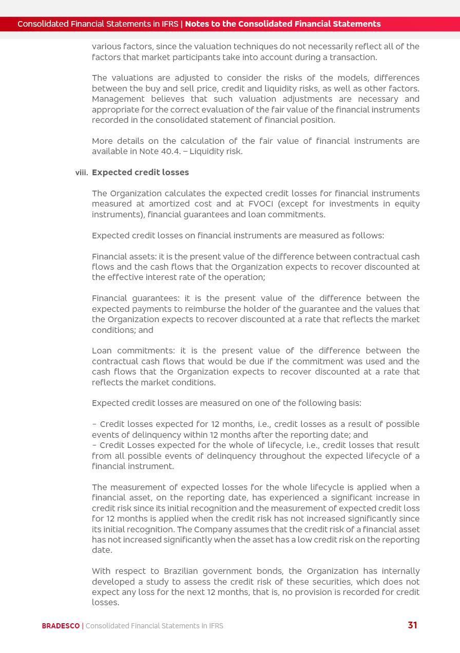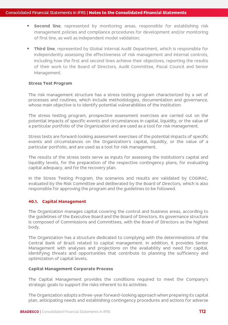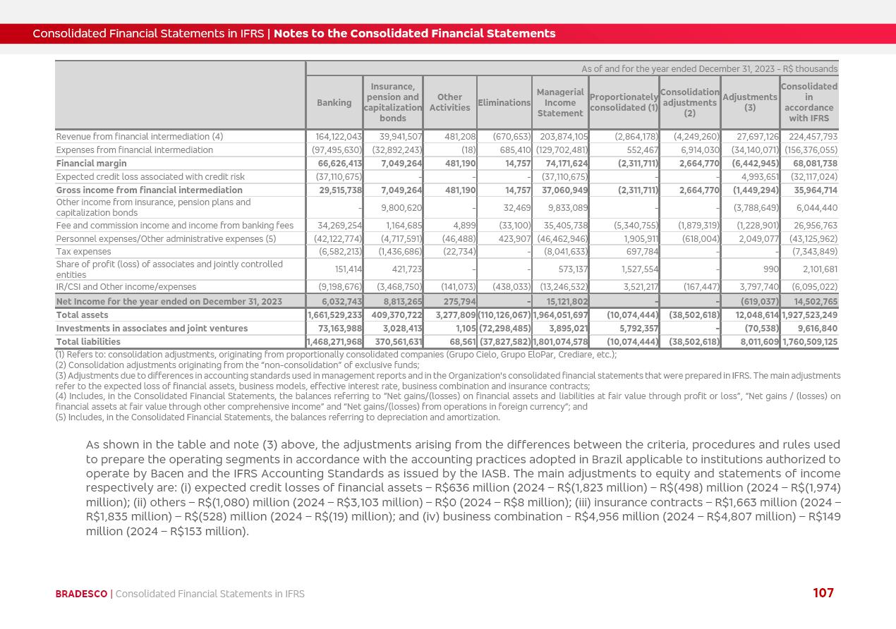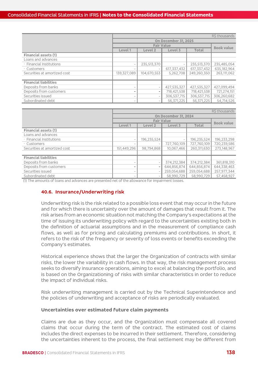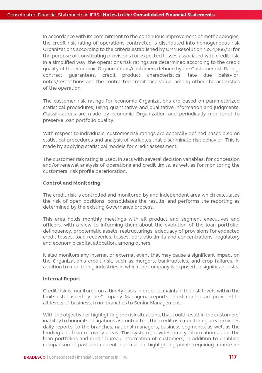 Consolidated Financial Statements 2025 in accordance with International Financial Reporting Standards (IFRS) issued by the International Accounting Standards Boards (IASB) Management Report BRADESCO | Management Report | Consolidated Financial Statements in IFRS 2 Message to Shareholders Throughout our trajectory, we have maintained a firm commitment to serve with excellence, strengthening the brand and reaffirming the relationship of partnership and trust with millions of Brazilians. In 2025, a year marked by a still challenging economic environment and constant changes in the market, our adaptability, resilience and strategic focus were essential. With the commitment and dedication of the teams, we moved forward with consistency in meeting the objectives, preserving the solidity of the operations and expanding initiatives that contribute to the sustainable development of the Country. We believe in the potential of Brazil and the strength of its people, which, with determination, continues to drive economic and social growth. In line with the commitment to transparency and democratization of information, we present in this report a detailed view of the main developments and results achieved in the fiscal year, reinforcing our ethical posture and corporate responsibility. To our shareholders, clients and partners, we thank you for the continued support, the trust in our decisions and the preference that motivates us to move forward, always focusing on delivering value and building an even more promising future. Cidade de Deus, February 04, 2026 Board of Directors and Board of Executive Officers Management Report BRADESCO | Management Report | Consolidated Financial Statements in IFRS 3 Dear Shareholders, We hereby present the Consolidated Financial Statements of Banco Bradesco S.A. related to 2025. We follow all International Financial Reporting Standards (IFRS) practices issued by the International Accounting Standards Board (IASB). Economic Comment The Brazilian economy slowed down in the second half of 2025. The household consumption lost traction throughout the year, responding to the restrictive monetary policy. One-off factors may lead to some re-acceleration of the GDP at the beginning of the year, but our projections indicate a weaker growth in 2026. Inflation closed 2025 within the target range two years above it, with important contributions from exchange rate valuation and accommodation of the economic activity. We believe that deflation will continue in the coming months, allowing the Central Bank of Brazil to start cutting the basic interest rate later this quarter. Uncertainties remain high on the international scene. While the US economy remains resilient, doubts about the US economic policy represent an important risk vector for the global economy. This context is aggravated by geopolitical disputes around the world. Highlights in the period In November 2025, Banco Bradesco S.A. (“Bradesco”) noticed to its shareholders and the market in general the Notice to the Market that Atlântica Hospitais and Participações S.A., a company focused on investment in hospitals, indirectly controlled by Bradesco and Bradseg Participações S.A., firmed an Investment Agreement with Rede D’Or São Luiz S.A. Group for the inclusion of Maternidade São Luiz Star, thus expanding the partnership firmed with Rede D’Or. The expansion of the Partnership is aligned with the strategy of Atlântica to invest in the health sector value chain through partnerships with players established in the operation of hospitals. In December 2025, Bradesco noticed to its shareholders and the market in general, through a Relevant Fact, that the proposal of the Company’s Board of Directors was approved for the payment of complementary interest on own equity, in the total amount of R$3,9 billion, of which R$0.351190748 per common share and R$0.386309823 per preferred share. Closing the fourth quarter of 2025, the Annual Calendar of Corporate Events for 2026 was released and, through a Notice to Shareholders, the planned schedule of the monthly payment of interest on own equity for the fiscal year of 2026, in accordance with the Systematic Monthly Payment of Interest on Own Equity. The disclosure of both documents reinforces Bradesco’s commitment to transparency, predictability and strategic alignment with shareholders and other stakeholders. BRADESCO | Management Report | Consolidated Financial Statements in IFRS 4 . highlighted information 2025 TOTAL DEPOSITS (Dec25 vs. Dec24) R$728.0 bi (+12.2%) R$23.9 bi R$178.4 bi +5.9% y/y EARNINGS PER SHARE BOOK VALUE PER SHARE BOOK NET INCOME R$2.13 common R$2.35 preferred R$16.87 SHAREHOLDERS’ EQUITY (1) MARKET VALUE TIER I CAPITAL R$178.7 bi 13.2% SECURITIES (Dec25 vs. Dec24) R$925.4 bi (+19.4%) FVPL: R$526.9 bi (+49.7%) FVOCI: R$139.0 bi (-11.1%) Amortized Cost: R$259.5 bi (-2.8%) EXPANDED LOAN PORTFOLIO (Dec25 vs. Dec24) R$1,089.2 bi (+11.0%) INDIVIDUALS: R$466.5 bi (+12.7%) COMPANIES: R$622.7 bi (+9.7%) ALLOWANCE FOR EXPANDED LOANS (Dec25 vs. Dec24) R$56.8 bi (-2.6%) INTEREST ON SHAREHOLDERS’ EQUITY R$14.5 bi (gross) +36.4% y/y (1) Equity attributable to shareholders of the parente. +0.8% y/y BRADESCO | Management Report | Consolidated Financial Statements in IFRS 5 Technology and innovation In two years of transformation, technology has become the core value leverage at Bradesco, providing more fluid and personalized customer experience, scalable operational efficiency with agility, security with cyber resilience and real-time prevention. With Agile@Scale, co-managed tribes between business and IT have increased efficiency, quality and value deliveries. In the period, we reduced the lead time by 43% and increased productivity by increasing the volume of deliveries to the business by 118% (vs. Dec23). The implementation of the AI First plan and the consolidation of the Bridge platform have democratized the use of GenAI in products and channels, with gov