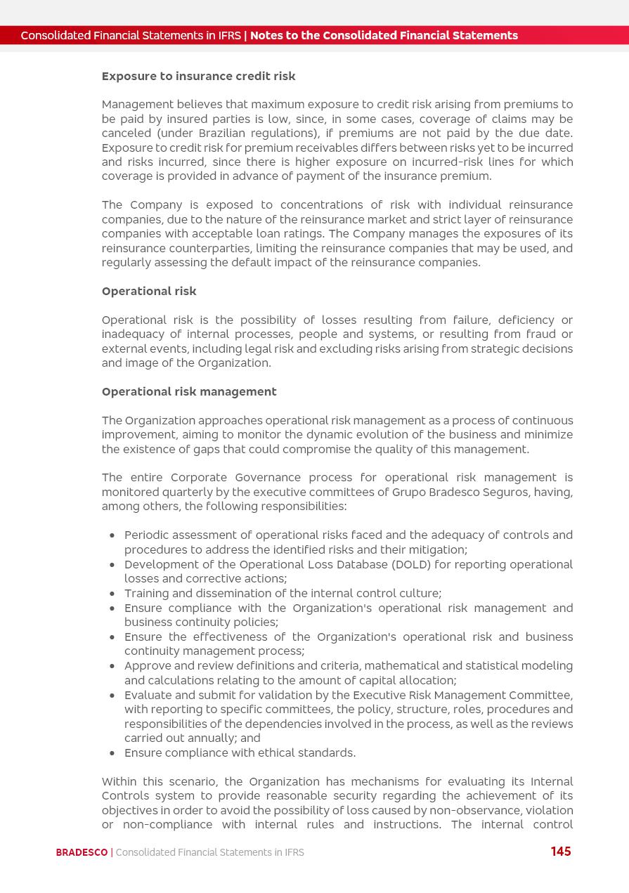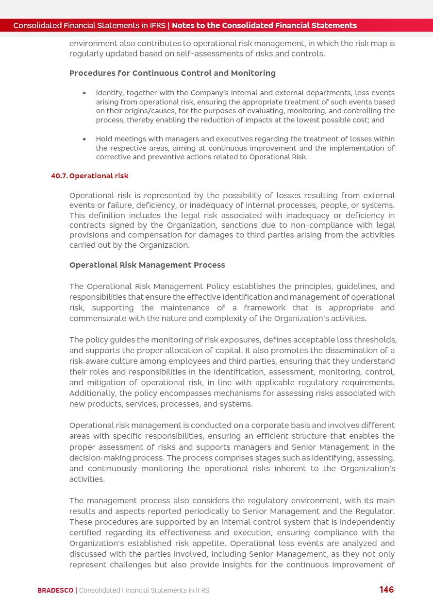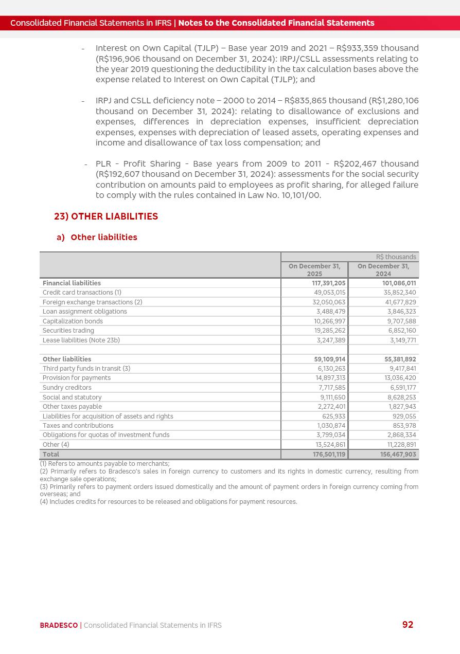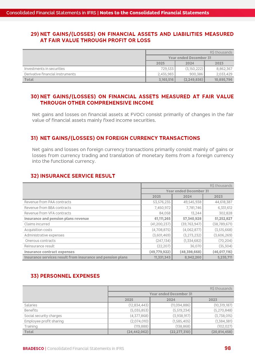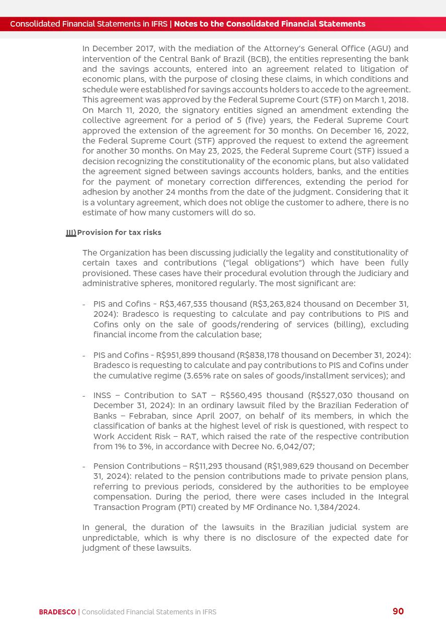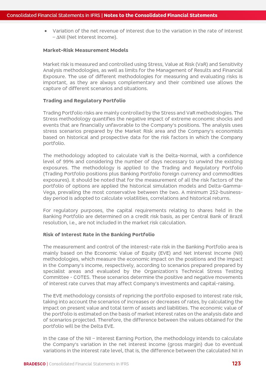 Consolidated Financial Statements 2025 in accordance with International Financial Reporting Standards (IFRS) issued by the International Accounting Standards Boards (IASB) Management Report BRADESCO | Management Report | Consolidated Financial Statements in IFRS 2 Message to Shareholders Throughout our trajectory, we have maintained a firm commitment to serve with excellence, strengthening the brand and reaffirming the relationship of partnership and trust with millions of Brazilians. In 2025, a year marked by a still challenging economic environment and constant changes in the market, our adaptability, resilience and strategic focus were essential. With the commitment and dedication of the teams, we moved forward with consistency in meeting the objectives, preserving the solidity of the operations and expanding initiatives that contribute to the sustainable development of the Country. We believe in the potential of Brazil and the strength of its people, which, with determination, continues to drive economic and social growth. In line with the commitment to transparency and democratization of information, we present in this report a detailed view of the main developments and results achieved in the fiscal year, reinforcing our ethical posture and corporate responsibility. To our shareholders, clients and partners, we thank you for the continued support, the trust in our decisions and the preference that motivates us to move forward, always focusing on delivering value and building an even more promising future. Cidade de Deus, February 04, 2026 Board of Directors and Board of Executive Officers Management Report BRADESCO | Management Report | Consolidated Financial Statements in IFRS 3 Dear Shareholders, We hereby present the Consolidated Financial Statements of Banco Bradesco S.A. related to 2025. We follow all International Financial Reporting Standards (IFRS) practices issued by the International Accounting Standards Board (IASB). Economic Comment The Brazilian economy slowed down in the second half of 2025. The household consumption lost traction throughout the year, responding to the restrictive monetary policy. One-off factors may lead to some re-acceleration of the GDP at the beginning of the year, but our projections indicate a weaker growth in 2026. Inflation closed 2025 within the target range two years above it, with important contributions from exchange rate valuation and accommodation of the economic activity. We believe that deflation will continue in the coming months, allowing the Central Bank of Brazil to start cutting the basic interest rate later this quarter. Uncertainties remain high on the international scene. While the US economy remains resilient, doubts about the US economic policy represent an important risk vector for the global economy. This context is aggravated by geopolitical disputes around the world. Highlights in the period In November 2025, Banco Bradesco S.A. (“Bradesco”) noticed to its shareholders and the market in general the Notice to the Market that Atlântica Hospitais and Participações S.A., a company focused on investment in hospitals, indirectly controlled by Bradesco and Bradseg Participações S.A., firmed an Investment Agreement with Rede D’Or São Luiz S.A. Group for the inclusion of Maternidade São Luiz Star, thus expanding the partnership firmed with Rede D’Or. The expansion of the Partnership is aligned with the strategy of Atlântica to invest in the health sector value chain through partnerships with players established in the operation of hospitals. In December 2025, Bradesco noticed to its shareholders and the market in general, through a Relevant Fact, that the proposal of the Company’s Board of Directors was approved for the payment of complementary interest on own equity, in the total amount of R$3,9 billion, of which R$0.351190748 per common share and R$0.386309823 per preferred share. Closing the fourth quarter of 2025, the Annual Calendar of Corporate Events for 2026 was released and, through a Notice to Shareholders, the planned schedule of the monthly payment of interest on own equity for the fiscal year of 2026, in accordance with the Systematic Monthly Payment of Interest on Own Equity. The disclosure of both documents reinforces Bradesco’s commitment to transparency, predictability and strategic alignment with shareholders and other stakeholders. BRADESCO | Management Report | Consolidated Financial Statements in IFRS 4 . highlighted information 2025 TOTAL DEPOSITS (Dec25 vs. Dec24) R$728.0 bi (+12.2%) R$23.9 bi R$178.4 bi +5.9% y/y EARNINGS PER SHARE BOOK VALUE PER SHARE BOOK NET INCOME R$2.13 common R$2.35 preferred R$16.87 SHAREHOLDERS’ EQUITY (1) MARKET VALUE TIER I CAPITAL R$178.7 bi 13.2% SECURITIES (Dec25 vs. Dec24) R$925.4 bi (+19.4%) FVPL: R$526.9 bi (+49.7%) FVOCI: R$139.0 bi (-11.1%) Amortized Cost: R$259.5 bi (-2.8%) EXPANDED LOAN PORTFOLIO (Dec25 vs. Dec24) R$1,089.2 bi (+11.0%) INDIVIDUALS: R$466.5 bi (+12.7%) COMPANIES: R$622.7 bi (+9.7%) ALLOWANCE FOR EXPANDED LOANS (Dec25 vs. Dec24) R$56.8 bi (-2.6%) INTEREST ON SHAREHOLDERS’ EQUITY R$14.5 bi (gross) +36.4% y/y (1) Equity attributable to shareholders of the parente. +0.8% y/y BRADESCO | Management Report | Consolidated Financial Statements in IFRS 5 Technology and innovation In two years of transformation, technology has become the core value leverage at Bradesco, providing more fluid and personalized customer experience, scalable operational efficiency with agility, security with cyber resilience and real-time prevention. With Agile@Scale, co-managed tribes between business and IT have increased efficiency, quality and value deliveries. In the period, we reduced the lead time by 43% and increased productivity by increasing the volume of deliveries to the business by 118% (vs. Dec23). The implementation of the AI First plan and the consolidation of the Bridge platform have democratized the use of GenAI in products and channels, with gov