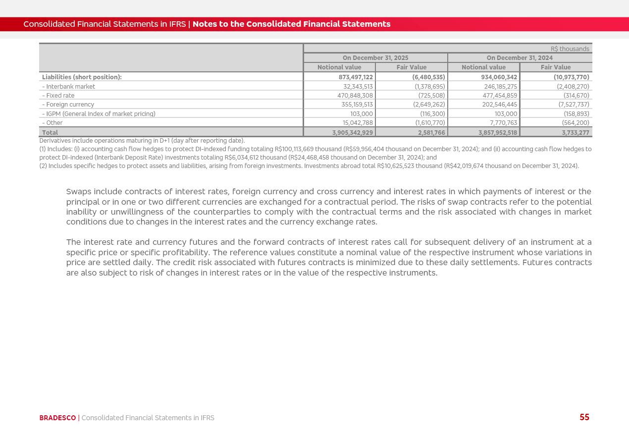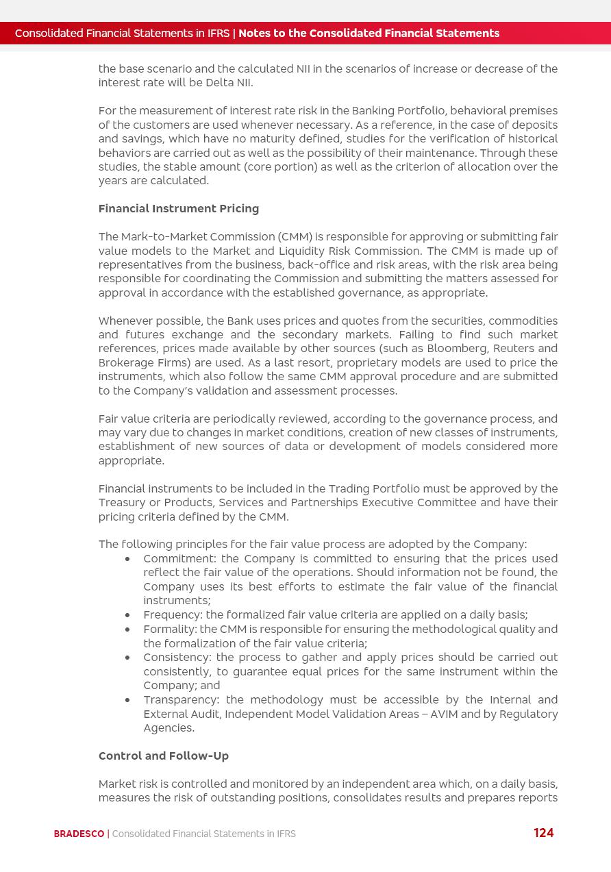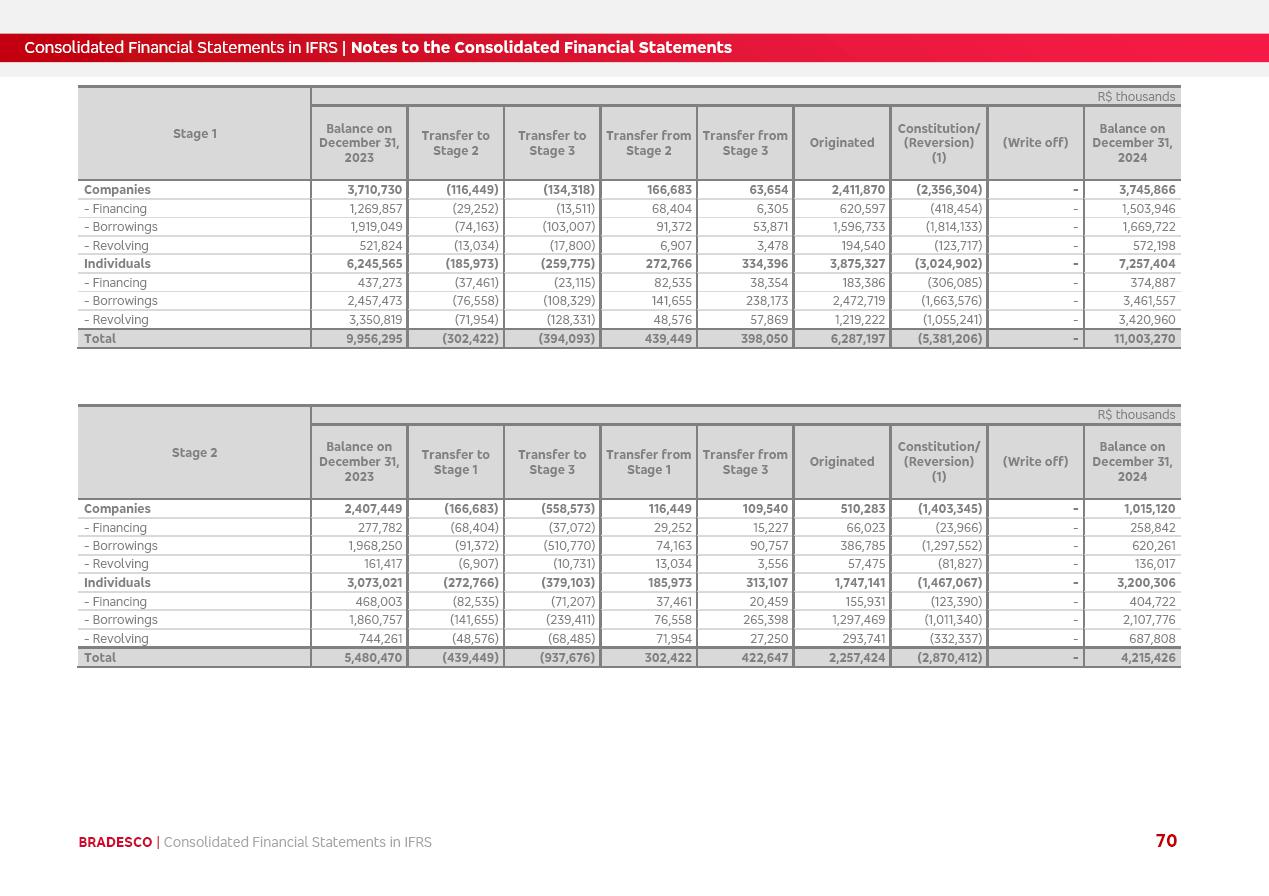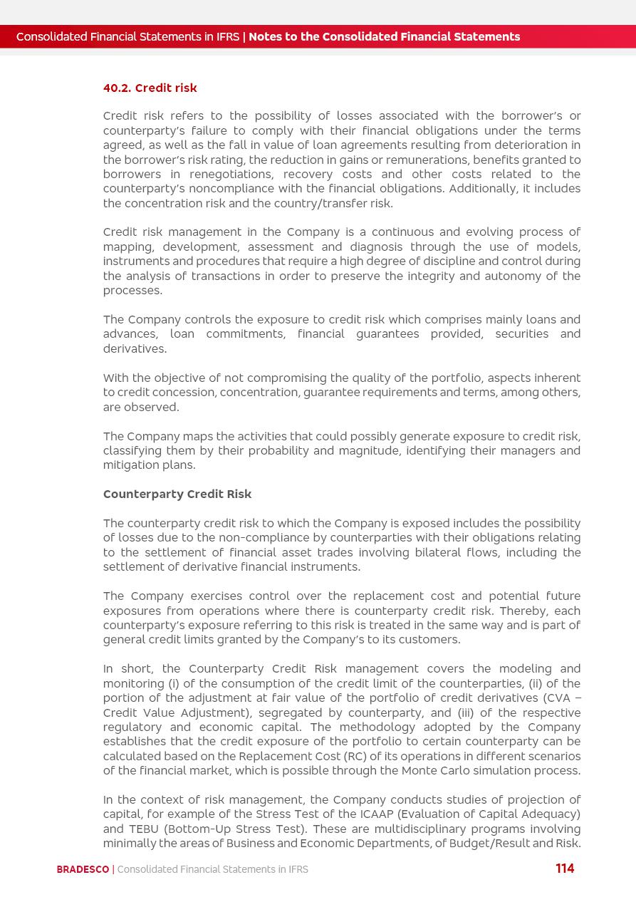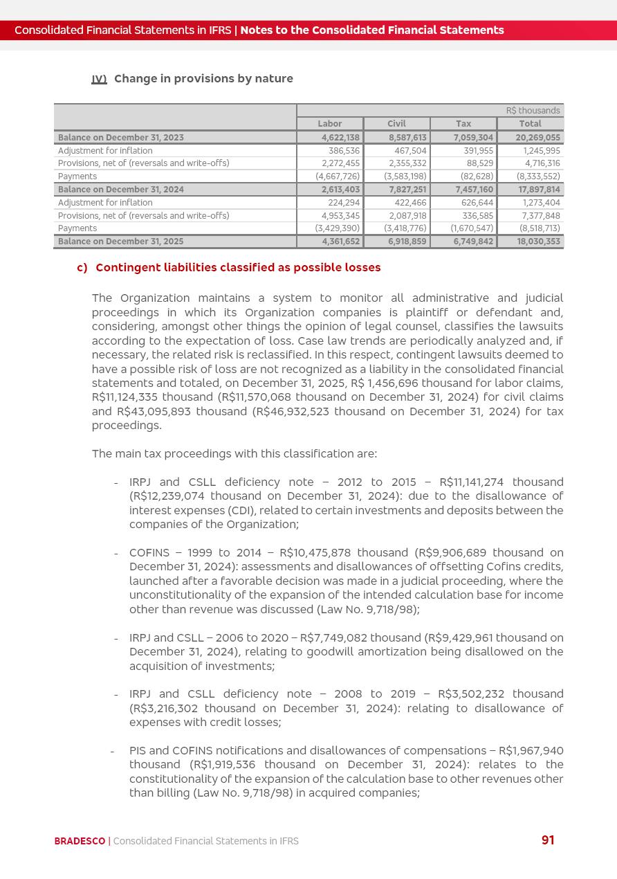 Consolidated Financial Statements 2025 in accordance with International Financial Reporting Standards (IFRS) issued by the International Accounting Standards Boards (IASB) Management Report BRADESCO | Management Report | Consolidated Financial Statements in IFRS 2 Message to Shareholders Throughout our trajectory, we have maintained a firm commitment to serve with excellence, strengthening the brand and reaffirming the relationship of partnership and trust with millions of Brazilians. In 2025, a year marked by a still challenging economic environment and constant changes in the market, our adaptability, resilience and strategic focus were essential. With the commitment and dedication of the teams, we moved forward with consistency in meeting the objectives, preserving the solidity of the operations and expanding initiatives that contribute to the sustainable development of the Country. We believe in the potential of Brazil and the strength of its people, which, with determination, continues to drive economic and social growth. In line with the commitment to transparency and democratization of information, we present in this report a detailed view of the main developments and results achieved in the fiscal year, reinforcing our ethical posture and corporate responsibility. To our shareholders, clients and partners, we thank you for the continued support, the trust in our decisions and the preference that motivates us to move forward, always focusing on delivering value and building an even more promising future. Cidade de Deus, February 04, 2026 Board of Directors and Board of Executive Officers Management Report BRADESCO | Management Report | Consolidated Financial Statements in IFRS 3 Dear Shareholders, We hereby present the Consolidated Financial Statements of Banco Bradesco S.A. related to 2025. We follow all International Financial Reporting Standards (IFRS) practices issued by the International Accounting Standards Board (IASB). Economic Comment The Brazilian economy slowed down in the second half of 2025. The household consumption lost traction throughout the year, responding to the restrictive monetary policy. One-off factors may lead to some re-acceleration of the GDP at the beginning of the year, but our projections indicate a weaker growth in 2026. Inflation closed 2025 within the target range two years above it, with important contributions from exchange rate valuation and accommodation of the economic activity. We believe that deflation will continue in the coming months, allowing the Central Bank of Brazil to start cutting the basic interest rate later this quarter. Uncertainties remain high on the international scene. While the US economy remains resilient, doubts about the US economic policy represent an important risk vector for the global economy. This context is aggravated by geopolitical disputes around the world. Highlights in the period In November 2025, Banco Bradesco S.A. (“Bradesco”) noticed to its shareholders and the market in general the Notice to the Market that Atlântica Hospitais and Participações S.A., a company focused on investment in hospitals, indirectly controlled by Bradesco and Bradseg Participações S.A., firmed an Investment Agreement with Rede D’Or São Luiz S.A. Group for the inclusion of Maternidade São Luiz Star, thus expanding the partnership firmed with Rede D’Or. The expansion of the Partnership is aligned with the strategy of Atlântica to invest in the health sector value chain through partnerships with players established in the operation of hospitals. In December 2025, Bradesco noticed to its shareholders and the market in general, through a Relevant Fact, that the proposal of the Company’s Board of Directors was approved for the payment of complementary interest on own equity, in the total amount of R$3,9 billion, of which R$0.351190748 per common share and R$0.386309823 per preferred share. Closing the fourth quarter of 2025, the Annual Calendar of Corporate Events for 2026 was released and, through a Notice to Shareholders, the planned schedule of the monthly payment of interest on own equity for the fiscal year of 2026, in accordance with the Systematic Monthly Payment of Interest on Own Equity. The disclosure of both documents reinforces Bradesco’s commitment to transparency, predictability and strategic alignment with shareholders and other stakeholders. BRADESCO | Management Report | Consolidated Financial Statements in IFRS 4 . highlighted information 2025 TOTAL DEPOSITS (Dec25 vs. Dec24) R$728.0 bi (+12.2%) R$23.9 bi R$178.4 bi +5.9% y/y EARNINGS PER SHARE BOOK VALUE PER SHARE BOOK NET INCOME R$2.13 common R$2.35 preferred R$16.87 SHAREHOLDERS’ EQUITY (1) MARKET VALUE TIER I CAPITAL R$178.7 bi 13.2% SECURITIES (Dec25 vs. Dec24) R$925.4 bi (+19.4%) FVPL: R$526.9 bi (+49.7%) FVOCI: R$139.0 bi (-11.1%) Amortized Cost: R$259.5 bi (-2.8%) EXPANDED LOAN PORTFOLIO (Dec25 vs. Dec24) R$1,089.2 bi (+11.0%) INDIVIDUALS: R$466.5 bi (+12.7%) COMPANIES: R$622.7 bi (+9.7%) ALLOWANCE FOR EXPANDED LOANS (Dec25 vs. Dec24) R$56.8 bi (-2.6%) INTEREST ON SHAREHOLDERS’ EQUITY R$14.5 bi (gross) +36.4% y/y (1) Equity attributable to shareholders of the parente. +0.8% y/y BRADESCO | Management Report | Consolidated Financial Statements in IFRS 5 Technology and innovation In two years of transformation, technology has become the core value leverage at Bradesco, providing more fluid and personalized customer experience, scalable operational efficiency with agility, security with cyber resilience and real-time prevention. With Agile@Scale, co-managed tribes between business and IT have increased efficiency, quality and value deliveries. In the period, we reduced the lead time by 43% and increased productivity by increasing the volume of deliveries to the business by 118% (vs. Dec23). The implementation of the AI First plan and the consolidation of the Bridge platform have democratized the use of GenAI in products and channels, with gov