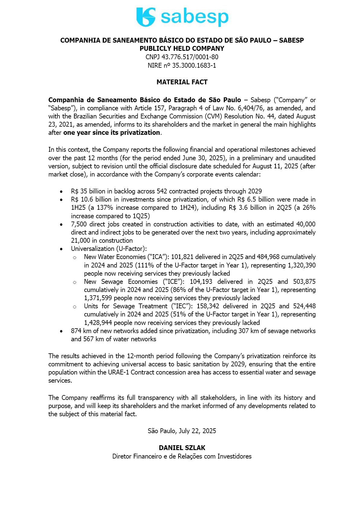 COMPANHIA DE SANEAMENTO BÁSICO DO ESTADO DE SÃO PAULO – SABESP PUBLICLY HELD COMPANY CNPJ 43.776.517/0001-80 NIRE nº 35.3000.1683-1 MATERIAL FACT Companhia de Saneamento Básico do Estado de São Paulo – Sabesp (“Company” or “Sabesp”), in compliance with Article 157, Paragraph 4 of Law No. 6,404/76, as amended, and with the Brazilian Securities and Exchange Commission (CVM) Resolution No. 44, dated August 23, 2021, as amended, informs to its shareholders and the market in general the main highlights after one year since its privatization. In this context, the Company reports the following financial and operational milestones achieved over the past 12 months (for the period ended June 30, 2025), in a preliminary and unaudited version, subject to revision until the official disclosure date scheduled for August 11, 2025 (after market close), in accordance with the Company’s corporate events calendar: R$ 35 billion in backlog across 542 contracted projects through 2029 R$ 10.6 billion in investments since privatization, of which R$ 6.5 billion were made in 1H25 (a 137% increase compared to 1H24), including R$ 3.6 billion in 2Q25 (a 26% increase compared to 1Q25) 7,500 direct jobs created in construction activities to date, with an estimated 40,000 direct and indirect jobs to be generated over the next two years, including approximately 21,000 in construction Universalization (U-Factor): o New Water Economies (“ICA”): 101,821 delivered in 2Q25 and 484,968 cumulatively in 2024 and 2025 (111% of the U-Factor target in Year 1), representing 1,320,390 people now receiving services they previously lacked o New Sewage Economies (“ICE”): 104,193 delivered in 2Q25 and 503,875 cumulatively in 2024 and 2025 (86% of the U-Factor target in Year 1), representing 1,371,599 people now receiving services they previously lacked o Units for Sewage Treatment (“IEC”): 158,342 delivered in 2Q25 and 524,448 cumulatively in 2024 and 2025 (51% of the U-Factor target in Year 1), representing 1,428,944 people now receiving services they previously lacked 874 km of new networks added since privatization, including 307 km of sewage networks and 567 km of water networks The results achieved in the 12-month period following the Company’s privatization reinforce its commitment to achieving universal access to basic sanitation by 2029, ensuring that the entire population within the URAE-1 Contract concession area has access to essential water and sewage services. The Company reaffirms its full transparency with all stakeholders, in line with its history and purpose, and will keep its shareholders and the market informed of any developments related to the subject of this material fact. São Paulo, July 22, 2025 DANIEL SZLAK Diretor Financeiro e de Relações com Investidores