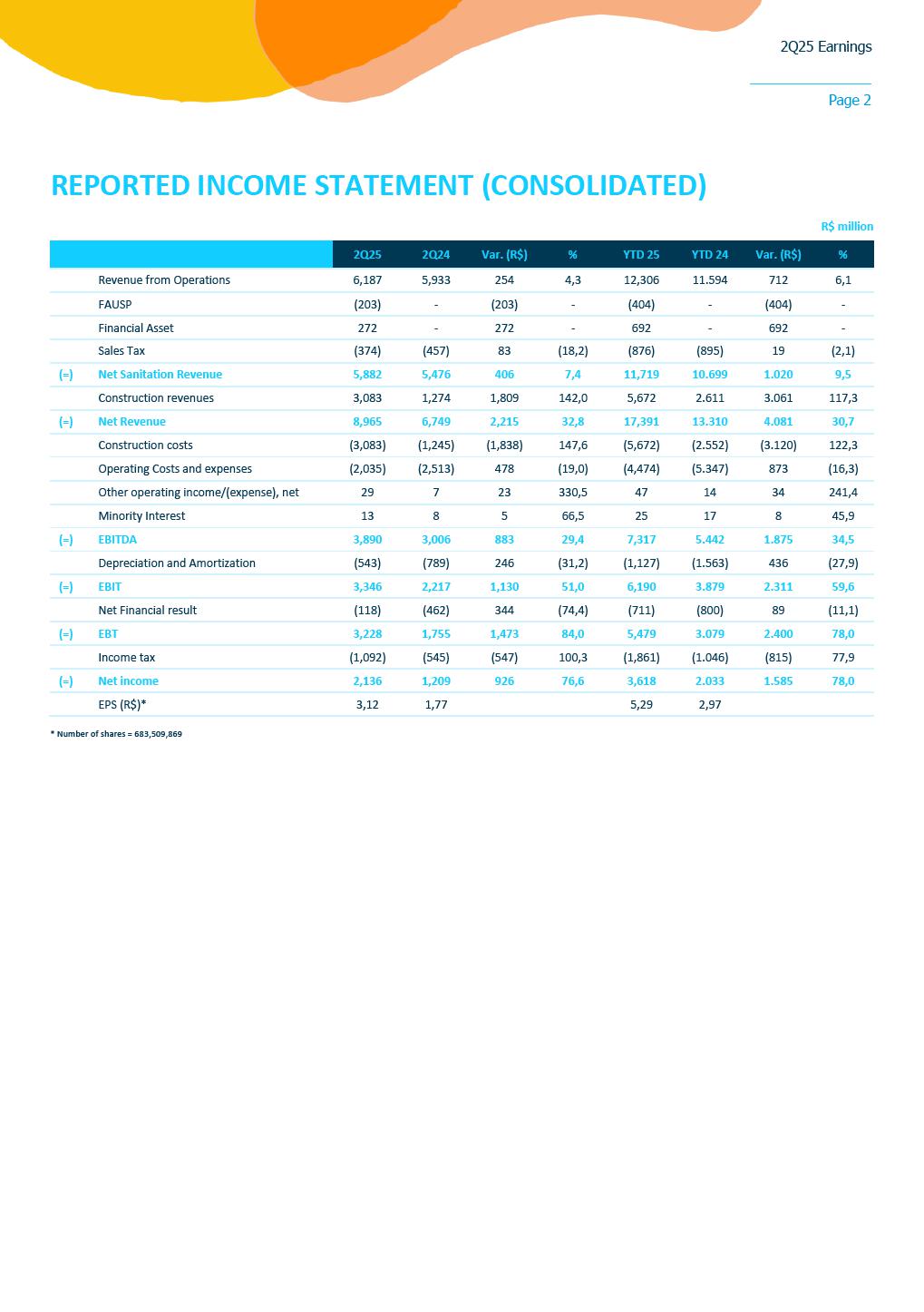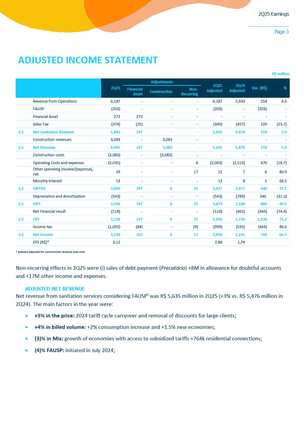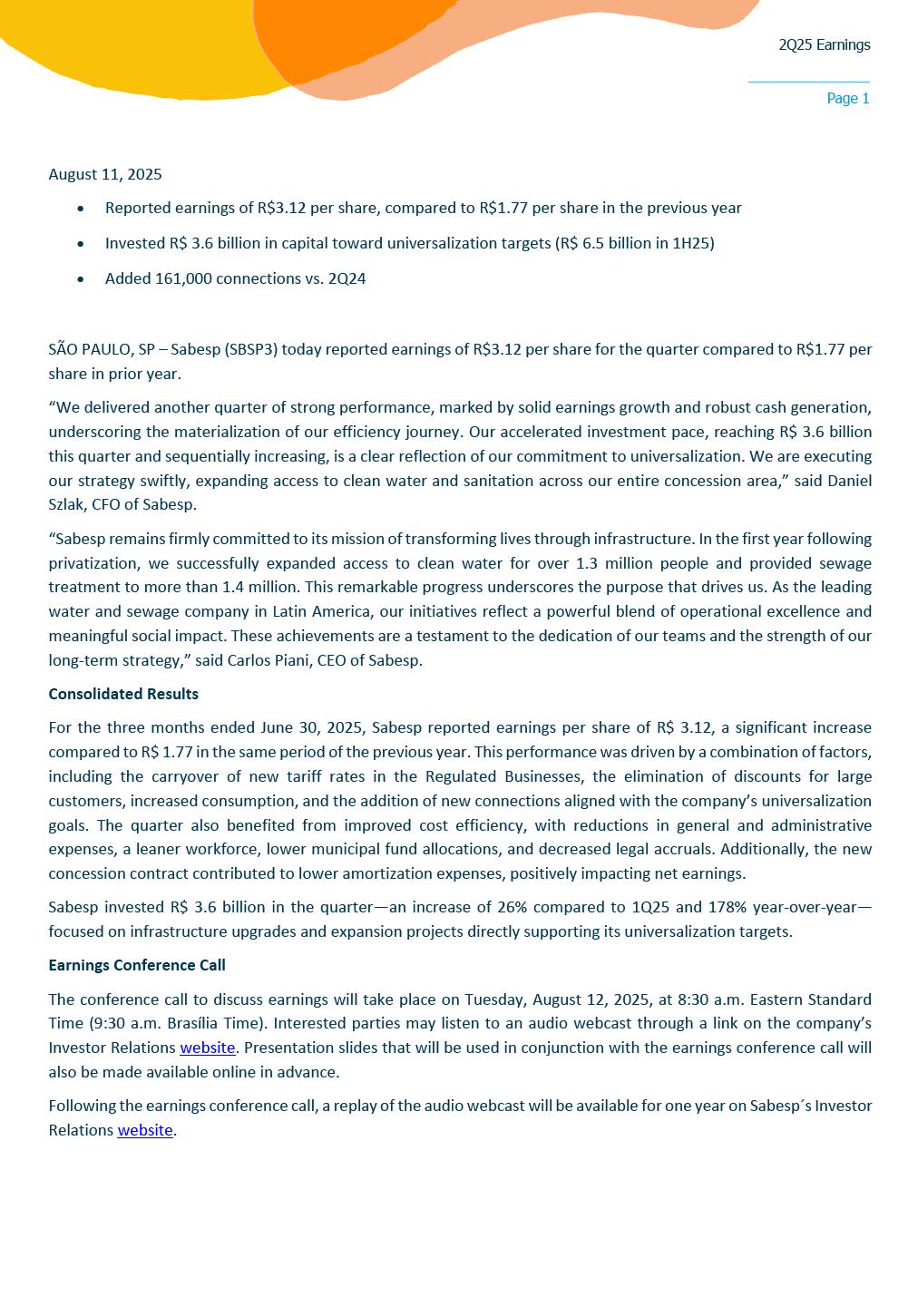 2Q25 Earnings Page 1 August 11, 2025 • Reported earnings of R$3.12 per share, compared to R$1.77 per share in the previous year • Invested R$ 3.6 billion in capital toward universalization targets (R$ 6.5 billion in 1H25) • Added 161,000 connections vs. 2Q24 SÃO PAULO, SP – Sabesp (SBSP3) today reported earnings of R$3.12 per share for the quarter compared to R$1.77 per share in prior year. “We delivered another quarter of strong performance, marked by solid earnings growth and robust cash generation, underscoring the materialization of our efficiency journey. Our accelerated investment pace, reaching R$ 3.6 billion this quarter and sequentially increasing, is a clear reflection of our commitment to universalization. We are executing our strategy swiftly, expanding access to clean water and sanitation across our entire concession area,” said Daniel Szlak, CFO of Sabesp. “Sabesp remains firmly committed to its mission of transforming lives through infrastructure. In the first year following privatization, we successfully expanded access to clean water for over 1.3 million people and provided sewage treatment to more than 1.4 million. This remarkable progress underscores the purpose that drives us. As the leading water and sewage company in Latin America, our initiatives reflect a powerful blend of operational excellence and meaningful social impact. These achievements are a testament to the dedication of our teams and the strength of our long-term strategy,” said Carlos Piani, CEO of Sabesp. Consolidated Results For the three months ended June 30, 2025, Sabesp reported earnings per share of R$ 3.12, a significant increase compared to R$ 1.77 in the same period of the previous year. This performance was driven by a combination of factors, including the carryover of new tariff rates in the Regulated Businesses, the elimination of discounts for large customers, increased consumption, and the addition of new connections aligned with the company’s universalization goals. The quarter also benefited from improved cost efficiency, with reductions in general and administrative expenses, a leaner workforce, lower municipal fund allocations, and decreased legal accruals. Additionally, the new concession contract contributed to lower amortization expenses, positively impacting net earnings. Sabesp invested R$ 3.6 billion in the quarter—an increase of 26% compared to 1Q25 and 178% year-over-year—focused on infrastructure upgrades and expansion projects directly supporting its universalization targets. Earnings Conference Call The conference call to discuss earnings will take place on Tuesday, August 12, 2025, at 8:30 a.m. Eastern Standard Time (9:30 a.m. Brasília Time). Interested parties may listen to an audio webcast through a link on the company’s Investor Relations website. Presentation slides that will be used in conjunction with the earnings conference call will also be made available online in advance. Following the earnings conference call, a replay of the audio webcast will be available for one year on Sabesp´s Investor Relations website. 2Q25 Earnings Page 2 REPORTED INCOME STATEMENT (CONSOLIDATED) R$ million 2Q25 2Q24 Var. (R$) % YTD 25 YTD 24 Var. (R$) % Revenue from Operations 6,187 5,933 254 4,3 12,306 11.594 712 6,1 FAUSP (203) - (203) - (404) - (404) - Financial Asset 272 - 272 - 692 - 692 - Sales Tax (374) (457) 83 (18,2) (876) (895) 19 (2,1) (=) Net Sanitation Revenue 5,882 5,476 406 7,4 11,719 10.699 1.020 9,5 Construction revenues 3,083 1,274 1,809 142,0 5,672 2.611 3.061 117,3 (=) Net Revenue 8,965 6,749 2,215 32,8 17,391 13.310 4.081 30,7 Construction costs (3,083) (1,245) (1,838) 147,6 (5,672) (2.552) (3.120) 122,3 Operating Costs and expenses (2,035) (2,513) 478 (19,0) (4,474) (5.347) 873 (16,3) Other operating income/(expense), net 29 7 23 330,5 47 14 34 241,4 Minority Interest 13 8 5 66,5 25 17 8 45,9 (=) EBITDA 3,890 3,006 883 29,4 7,317 5.442 1.875 34,5 Depreciation and Amortization (543) (789) 246 (31,2) (1,127) (1.563) 436 (27,9) (=) EBIT 3,346 2,217 1,130 51,0 6,190 3.879 2.311 59,6 Net Financial result (118) (462) 344 (74,4) (711) (800) 89 (11,1) (=) EBT 3,228 1,755 1,473 84,0 5,479 3.079 2.400 78,0 Income tax (1,092) (545) (547) 100,3 (1,861) (1.046) (815) 77,9 (=) Net income 2,136 1,209 926 76,6 3,618 2.033 1.585 78,0 EPS (R$)* 3,12 1,77 5,29 2,97 * Number of shares = 683,509,869 2Q25 Earnings Page 3 ADJUSTED INCOME STATEMENT R$ million 2Q25 Adjustments 2Q25 Adjusted 2Q24 Adjusted Var. (R$) % Financial Asset Construction Non-Recurring Revenue from Operations 6,187 - - - 6,187 5,933 254 4.3 FAUSP (203) - - - (203) - (203) - Financial Asset 272 272 - - - - - - Sales Tax (374) (25) - - (349) (457) 109 (23.7) (=) Net Sanitation Revenue 5,882 247 - - 5,635 5,476 159 2.9 Construction revenues 3,083 - 3,083 - - - - - (=) Net Revenue 8,965 247 3,083 - 5,635 5,476 159 2.9 Construction costs (3,083) - (3,083) - - - - - Operating Costs and expenses (2,035) - - 8 (2,043) (2,513) 470 (18.7) Other operating income/(expense), net 29 - - 17 12 7 6 80.9 Minority Interest 13 - - - 13 8 5 66.5 (=) EBITDA 3,890 247 0 25 3,617 2,977 640 21.5 Depreciation and Amortization (543) - - - (543) (789) 246 (31.2) (=) EBIT 3,346 247 0 25 3,074 2,188 886 40.5 Net Financial result (118) - - - (118) (462) (344) (74.4) (=) EBT 3,228 247 0 25 2,956 1,726 1,230 71.2 Income tax (1,092) (84) - (9) (999) (535) (464) 86.6 (=) Net income 2,136 163 0 17 1,956 1,191 766 64.3 EPS (R$)* 3,12 2,86 1,74 * Balance adjusted for construction revenue and costs Non-recurring effects in 2Q25 were (i) sales of debt payment (Precatório) +8M in allowance for doubtful accounts and +17M other income and expenses. ADJUSTED NET REVENUE Net revenue from sanitation services considering FAUSP¹ was R$ 5,635 million in 2Q25 (+3% vs. R$ 5,476 million in 2Q24). The main factors in the year were: • +5% in the price: 2024 tariff cycle carryover and removal of discounts for large clients; • +4% in billed
