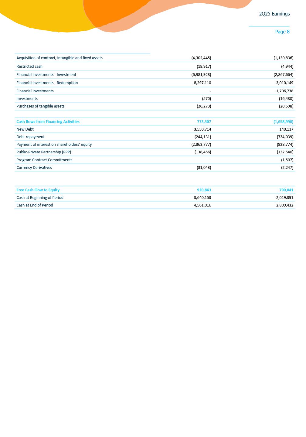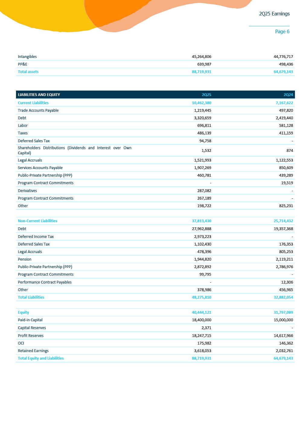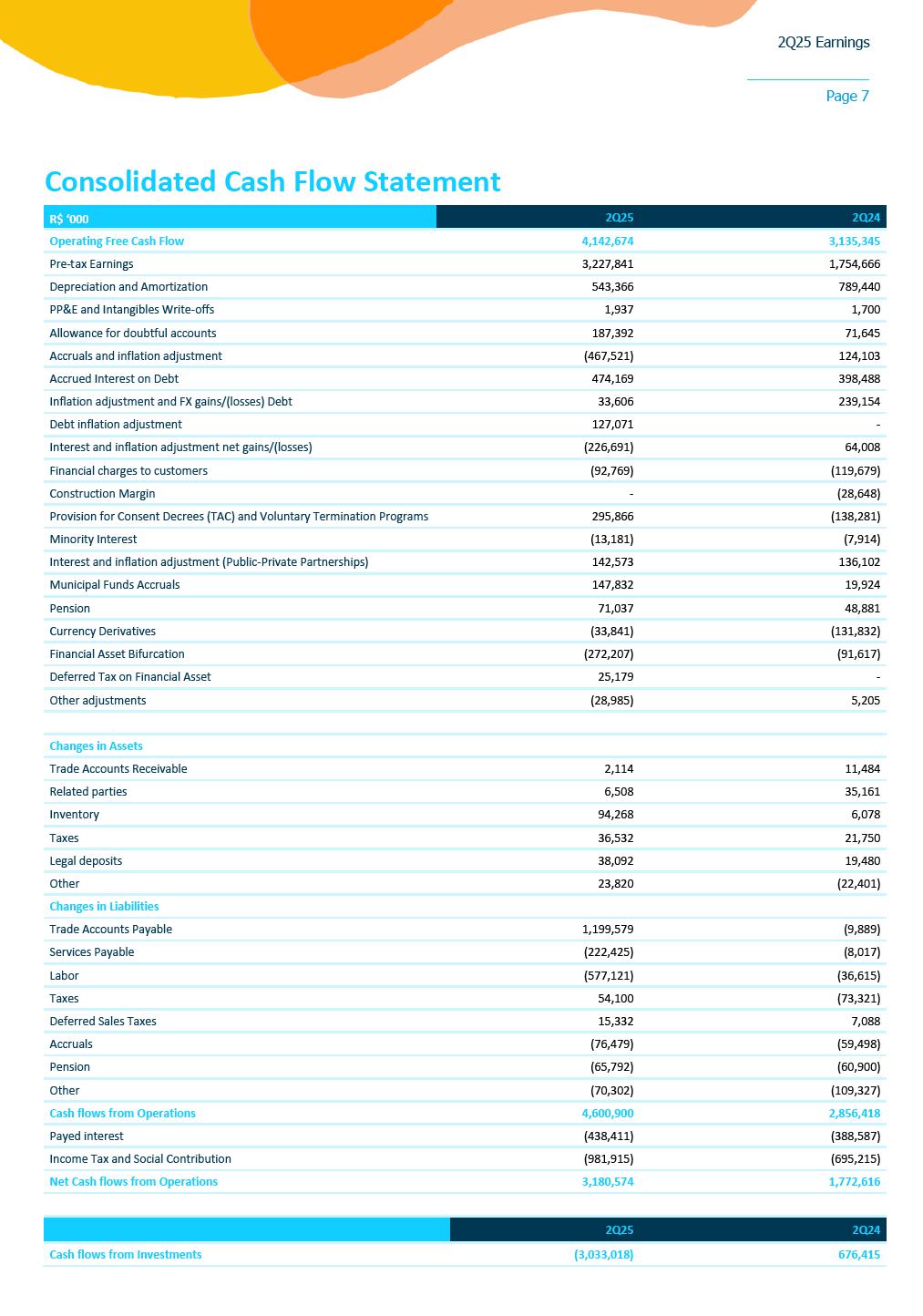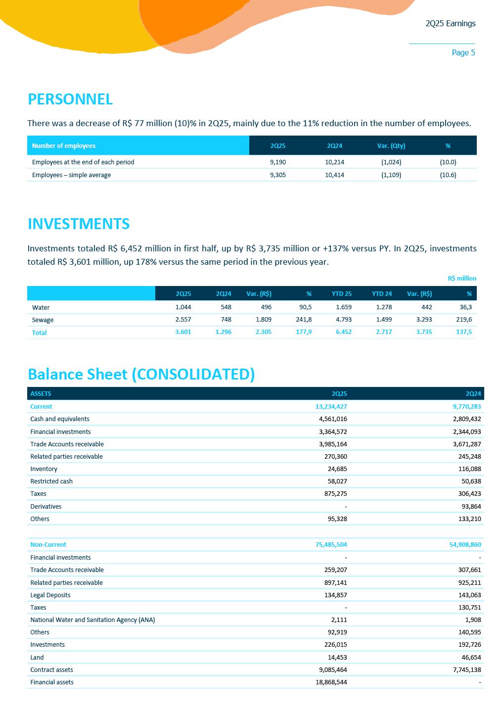 2Q25 Earnings Page 1 August 11, 2025 • Reported earnings of R$3.12 per share, compared to R$1.77 per share in the previous year • Invested R$ 3.6 billion in capital toward universalization targets (R$ 6.5 billion in 1H25) • Added 161,000 connections vs. 2Q24 SÃO PAULO, SP – Sabesp (SBSP3) today reported earnings of R$3.12 per share for the quarter compared to R$1.77 per share in prior year. “We delivered another quarter of strong performance, marked by solid earnings growth and robust cash generation, underscoring the materialization of our efficiency journey. Our accelerated investment pace, reaching R$ 3.6 billion this quarter and sequentially increasing, is a clear reflection of our commitment to universalization. We are executing our strategy swiftly, expanding access to clean water and sanitation across our entire concession area,” said Daniel Szlak, CFO of Sabesp. “Sabesp remains firmly committed to its mission of transforming lives through infrastructure. In the first year following privatization, we successfully expanded access to clean water for over 1.3 million people and provided sewage treatment to more than 1.4 million. This remarkable progress underscores the purpose that drives us. As the leading water and sewage company in Latin America, our initiatives reflect a powerful blend of operational excellence and meaningful social impact. These achievements are a testament to the dedication of our teams and the strength of our long-term strategy,” said Carlos Piani, CEO of Sabesp. Consolidated Results For the three months ended June 30, 2025, Sabesp reported earnings per share of R$ 3.12, a significant increase compared to R$ 1.77 in the same period of the previous year. This performance was driven by a combination of factors, including the carryover of new tariff rates in the Regulated Businesses, the elimination of discounts for large customers, increased consumption, and the addition of new connections aligned with the company’s universalization goals. The quarter also benefited from improved cost efficiency, with reductions in general and administrative expenses, a leaner workforce, lower municipal fund allocations, and decreased legal accruals. Additionally, the new concession contract contributed to lower amortization expenses, positively impacting net earnings. Sabesp invested R$ 3.6 billion in the quarter—an increase of 26% compared to 1Q25 and 178% year-over-year—focused on infrastructure upgrades and expansion projects directly supporting its universalization targets. Earnings Conference Call The conference call to discuss earnings will take place on Tuesday, August 12, 2025, at 8:30 a.m. Eastern Standard Time (9:30 a.m. Brasília Time). Interested parties may listen to an audio webcast through a link on the company’s Investor Relations website. Presentation slides that will be used in conjunction with the earnings conference call will also be made available online in advance. Following the earnings conference call, a replay of the audio webcast will be available for one year on Sabesp´s Investor Relations website. 2Q25 Earnings Page 2 REPORTED INCOME STATEMENT (CONSOLIDATED) R$ million 2Q25 2Q24 Var. (R$) % YTD 25 YTD 24 Var. (R$) % Revenue from Operations 6,187 5,933 254 4,3 12,306 11.594 712 6,1 FAUSP (203) - (203) - (404) - (404) - Financial Asset 272 - 272 - 692 - 692 - Sales Tax (374) (457) 83 (18,2) (876) (895) 19 (2,1) (=) Net Sanitation Revenue 5,882 5,476 406 7,4 11,719 10.699 1.020 9,5 Construction revenues 3,083 1,274 1,809 142,0 5,672 2.611 3.061 117,3 (=) Net Revenue 8,965 6,749 2,215 32,8 17,391 13.310 4.081 30,7 Construction costs (3,083) (1,245) (1,838) 147,6 (5,672) (2.552) (3.120) 122,3 Operating Costs and expenses (2,035) (2,513) 478 (19,0) (4,474) (5.347) 873 (16,3) Other operating income/(expense), net 29 7 23 330,5 47 14 34 241,4 Minority Interest 13 8 5 66,5 25 17 8 45,9 (=) EBITDA 3,890 3,006 883 29,4 7,317 5.442 1.875 34,5 Depreciation and Amortization (543) (789) 246 (31,2) (1,127) (1.563) 436 (27,9) (=) EBIT 3,346 2,217 1,130 51,0 6,190 3.879 2.311 59,6 Net Financial result (118) (462) 344 (74,4) (711) (800) 89 (11,1) (=) EBT 3,228 1,755 1,473 84,0 5,479 3.079 2.400 78,0 Income tax (1,092) (545) (547) 100,3 (1,861) (1.046) (815) 77,9 (=) Net income 2,136 1,209 926 76,6 3,618 2.033 1.585 78,0 EPS (R$)* 3,12 1,77 5,29 2,97 * Number of shares = 683,509,869 2Q25 Earnings Page 3 ADJUSTED INCOME STATEMENT R$ million 2Q25 Adjustments 2Q25 Adjusted 2Q24 Adjusted Var. (R$) % Financial Asset Construction Non-Recurring Revenue from Operations 6,187 - - - 6,187 5,933 254 4.3 FAUSP (203) - - - (203) - (203) - Financial Asset 272 272 - - - - - - Sales Tax (374) (25) - - (349) (457) 109 (23.7) (=) Net Sanitation Revenue 5,882 247 - - 5,635 5,476 159 2.9 Construction revenues 3,083 - 3,083 - - - - - (=) Net Revenue 8,965 247 3,083 - 5,635 5,476 159 2.9 Construction costs (3,083) - (3,083) - - - - - Operating Costs and expenses (2,035) - - 8 (2,043) (2,513) 470 (18.7) Other operating income/(expense), net 29 - - 17 12 7 6 80.9 Minority Interest 13 - - - 13 8 5 66.5 (=) EBITDA 3,890 247 0 25 3,617 2,977 640 21.5 Depreciation and Amortization (543) - - - (543) (789) 246 (31.2) (=) EBIT 3,346 247 0 25 3,074 2,188 886 40.5 Net Financial result (118) - - - (118) (462) (344) (74.4) (=) EBT 3,228 247 0 25 2,956 1,726 1,230 71.2 Income tax (1,092) (84) - (9) (999) (535) (464) 86.6 (=) Net income 2,136 163 0 17 1,956 1,191 766 64.3 EPS (R$)* 3,12 2,86 1,74 * Balance adjusted for construction revenue and costs Non-recurring effects in 2Q25 were (i) sales of debt payment (Precatório) +8M in allowance for doubtful accounts and +17M other income and expenses. ADJUSTED NET REVENUE Net revenue from sanitation services considering FAUSP¹ was R$ 5,635 million in 2Q25 (+3% vs. R$ 5,476 million in 2Q24). The main factors in the year were: • +5% in the price: 2024 tariff cycle carryover and removal of discounts for large clients; • +4% in billed