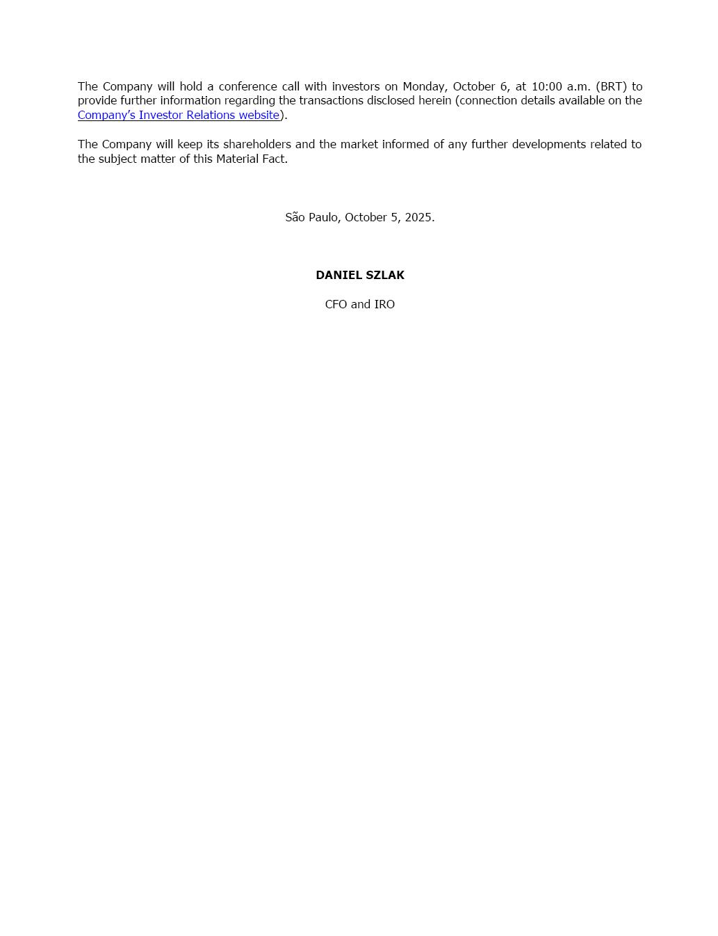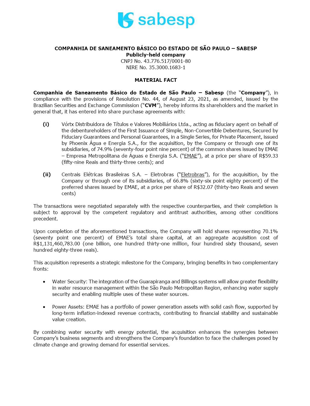COMPANHIA DE SANEAMENTO BÁSICO DO ESTADO DE SÃO PAULO – SABESP Publicly-held company CNPJ No. 43.776.517/0001-80 NIRE No. 35.3000.1683-1 MATERIAL FACT Companhia de Saneamento Básico do Estado de São Paulo – Sabesp (the “Company”), in compliance with the provisions of Resolution No. 44, of August 23, 2021, as amended, issued by the Brazilian Securities and Exchange Commission (“CVM”), hereby informs its shareholders and the market in general that, it has entered into share purchase agreements with: (i) Vórtx Distribuidora de Títulos e Valores Mobiliários Ltda., acting as fiduciary agent on behalf of the debentureholders of the First Issuance of Simple, Non-Convertible Debentures, Secured by Fiduciary Guarantees and Personal Guarantees, in a Single Series, for Private Placement, issued by Phoenix Água e Energia S.A., for the acquisition, by the Company or through one of its subsidiaries, of 74.9% (seventy-four point nine percent) of the common shares issued by EMAE – Empresa Metropolitana de Águas e Energia S.A. (“EMAE”), at a price per share of R$59.33 (fifty-nine Reais and thirty-three cents); and (ii) Centrais Elétricas Brasileiras S.A. – Eletrobras (“Eletrobras”), for the acquisition, by the Company or through one of its subsidiaries, of 66.8% (sixty-six point eighty percent) of the preferred shares issued by EMAE, at a price per share of R$32.07 (thirty-two Reais and seven cents) The transactions were negotiated separately with the respective counterparties, and their completion is subject to approval by the competent regulatory and antitrust authorities, among other conditions precedent. Upon completion of the aforementioned transactions, the Company will hold shares representing 70.1% (seventy point one percent) of EMAE’s total share capital, at an aggregate acquisition cost of R$1,131,460,783.00 (one billion, one hundred thirty-one million, four hundred sixty thousand, seven hundred eighty-three reais). This acquisition represents a strategic milestone for the Company, bringing benefits in two complementary fronts: • Water Security: The integration of the Guarapiranga and Billings systems will allow greater flexibility in water resource management within the São Paulo Metropolitan Region, enhancing water supply security and enabling multiple uses of these water sources. • Power Assets: EMAE has a portfolio of power generation assets with solid cash flow, supported by long-term inflation-indexed revenue contracts, contributing to financial stability and sustainable value creation. By combining water security with energy potential, the acquisition enhances the synergies between Company’s business segments and strengthens the Company’s foundation to face the challenges posed by climate change and growing demand for essential services. The Company will hold a conference call with investors on Monday, October 6, at 10:00 a.m. (BRT) to provide further information regarding the transactions disclosed herein (connection details available on the Company’s Investor Relations website). The Company will keep its shareholders and the market informed of any further developments related to the subject matter of this Material Fact. São Paulo, October 5, 2025. DANIEL SZLAK CFO and IRO