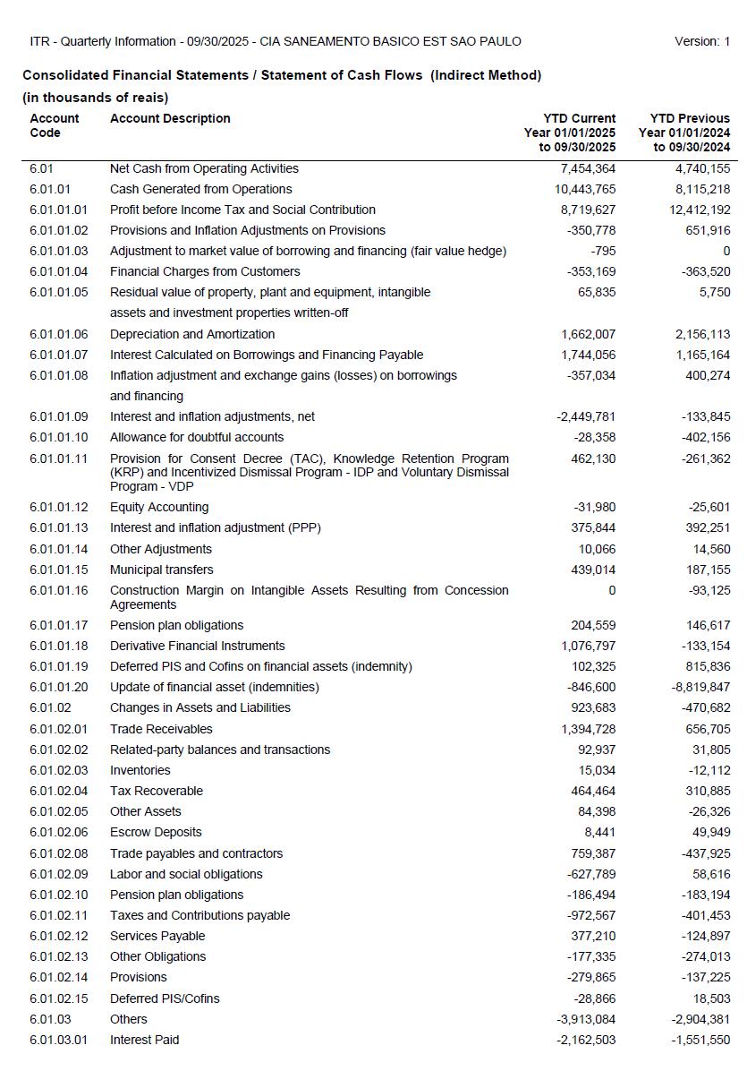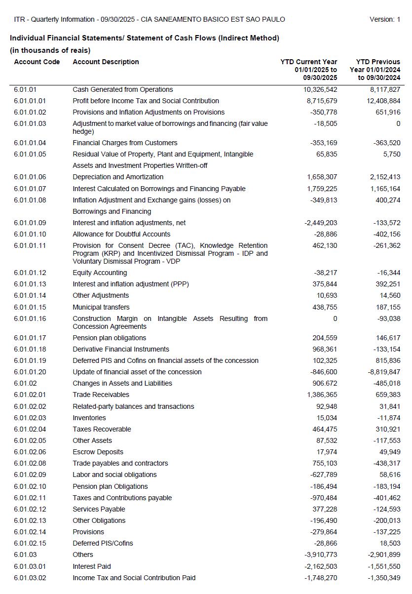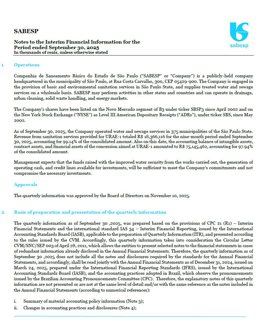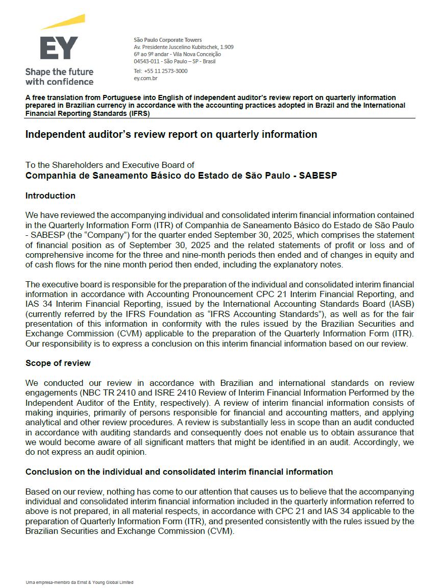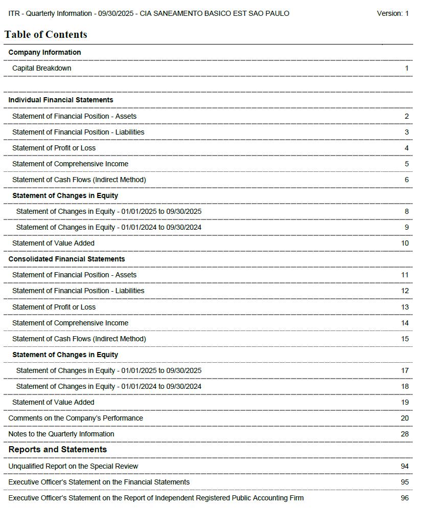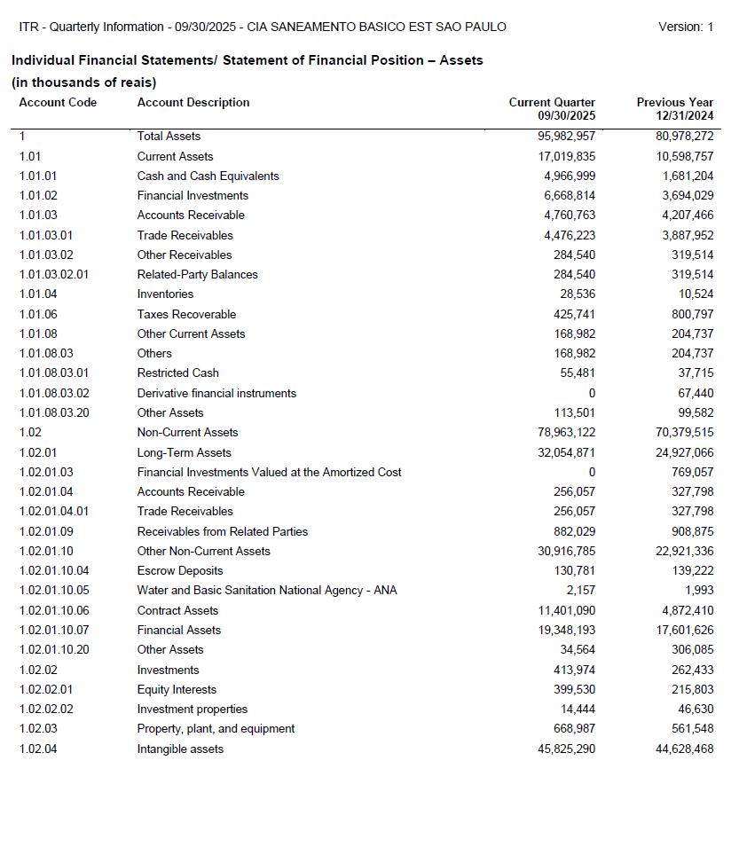 ITR - Quarterly Information - 09/30/2025 - CIA SANEAMENTO BASICO EST SAO PAULO Version: 1 Table of Contents Company Information Capital Breakdown 1 Individual Financial Statements Statement of Financial Position - Assets 2 Statement of Financial Position - Liabilities 3 Statement of Profit or Loss 4 Statement of Comprehensive Income 5 Statement of Cash Flows (Indirect Method) 6 Statement of Changes in Equity Statement of Changes in Equity - 01/01/2025 to 09/30/2025 8 Statement of Changes in Equity - 01/01/2024 to 09/30/2024 9 Statement of Value Added 10 Consolidated Financial Statements Statement of Financial Position - Assets 11 Statement of Financial Position - Liabilities 12 Statement of Profit or Loss 13 Statement of Comprehensive Income 14 Statement of Cash Flows (Indirect Method) 15 Statement of Changes in Equity Statement of Changes in Equity - 01/01/2025 to 09/30/2025 17 Statement of Changes in Equity - 01/01/2024 to 09/30/2024 18 Statement of Value Added 19 Comments on the Company’s Performance 20 Notes to the Quarterly Information 28 Reports and Statements Unqualified Report on the Special Review 94 Executive Officer’s Statement on the Financial Statements 95 Executive Officer’s Statement on the Report of Independent Registered Public Accounting Firm 96 ITR - Quarterly Information - 09/30/2025 - CIA SANEAMENTO BASICO EST SAO PAULO Version: 1 Company Information / Capital Breakdown Number of Shares Current Quarter (Units) 09/30/2025 Paid-up Capital Common 683,509,868 Preferred 1 Total 683,509,869 Treasury Shares Common 0 Preferred 0 Total 0 ITR - Quarterly Information - 09/30/2025 - CIA SANEAMENTO BASICO EST SAO PAULO Version: 1 Individual Financial Statements/ Statement of Financial Position – Assets (in thousands of reais) Account Code Account Description Current Quarter 09/30/2025 Previous Year 12/31/2024 1 Total Assets 95,982,957 80,978,272 1.01 Current Assets 17,019,835 10,598,757 1.01.01 Cash and Cash Equivalents 4,966,999 1,681,204 1.01.02 Financial Investments 6,668,814 3,694,029 1.01.03 Accounts Receivable 4,760,763 4,207,466 1.01.03.01 Trade Receivables 4,476,223 3,887,952 1.01.03.02 Other Receivables 284,540 319,514 1.01.03.02.01 Related-Party Balances 284,540 319,514 1.01.04 Inventories 28,536 10,524 1.01.06 Taxes Recoverable 425,741 800,797 1.01.08 Other Current Assets 168,982 204,737 1.01.08.03 Others 168,982 204,737 1.01.08.03.01 Restricted Cash 55,481 37,715 1.01.08.03.02 Derivative financial instruments 0 67,440 1.01.08.03.20 Other Assets 113,501 99,582 1.02 Non-Current Assets 78,963,122 70,379,515 1.02.01 Long-Term Assets 32,054,871 24,927,066 1.02.01.03 Financial Investments Valued at the Amortized Cost 0 769,057 1.02.01.04 Accounts Receivable 256,057 327,798 1.02.01.04.01 Trade Receivables 256,057 327,798 1.02.01.09 Receivables from Related Parties 882,029 908,875 1.02.01.10 Other Non-Current Assets 30,916,785 22,921,336 1.02.01.10.04 Escrow Deposits 130,781 139,222 1.02.01.10.05 Water and Basic Sanitation National Agency - ANA 2,157 1,993 1.02.01.10.06 Contract Assets 11,401,090 4,872,410 1.02.01.10.07 Financial Assets 19,348,193 17,601,626 1.02.01.10.20 Other Assets 34,564 306,085 1.02.02 Investments 413,974 262,433 1.02.02.01 Equity Interests 399,530 215,803 1.02.02.02 Investment properties 14,444 46,630 1.02.03 Property, plant, and equipment 668,987 561,548 1.02.04 Intangible assets 45,825,290 44,628,468 ITR - Quarterly Information - 09/30/2025 - CIA SANEAMENTO BASICO EST SAO PAULO Version: 1 Individual Financial Statements/ Statement of Financial Position - Liabilities (in thousands of reais) Account Code Account Description Current Quarter 09/30/2025 Previous Year 12/31/2024 2 Total Liabilities 95,982,957 80,978,272 2.01 Current Liabilities 14,434,328 11,968,321 2.01.01 Social and Labor obligations 1,120,534 1,286,193 2.01.02 Trade Payables 1,523,474 768,371 2.01.03 Tax Obligations 733,704 589,110 2.01.04 Borrowings and Financings 5,797,790 3,133,850 2.01.05 Other Obligations 3,927,261 4,644,613 2.01.05.02 Others 3,927,261 4,644,613 2.01.05.02.01 Dividends and Interest on Equity Payable 1,532 2,275,890 2.01.05.02.04 Services Payable 2,250,981 1,434,998 2.01.05.02.07 Public-Private Partnership - PPP 465,028 452,323 2.01.05.02.10 Performance Agreements 222,642 287,109 2.01.05.02.11 Deferred PIS/Cofins 74,117 0 2.01.05.02.12 Derivative financial instruments 714,842 0 2.01.05.02.20 Other Obligations 198,119 194,293 2.01.06 Provisions 1,331,565 1,546,184 2.02 Non-current Liabilities 38,838,354 32,081,897 2.02.01 Borrowings and Financings 29,258,757 22,124,447 2.02.02 Other Obligations 6,362,539 6,400,064 2.02.02.02 Others 6,362,539 6,400,064 2.02.02.02.04 Social Security Obligations 1,949,210 1,931,145 2.02.02.02.06 Public-Private Partnership - PPP 2,857,070 2,853,896 2.02.02.02.09 Deferred PIS/Cofins 1,117,146 1,117,804 2.02.02.02.10 Performance Agreements 100,608 137,441 2.02.02.02.20 Other Obligations 338,505 359,778 2.02.03 Deferred taxes 2,737,586 2,661,891 2.02.03.01 Deferred Income Tax and Social Contribution 2,737,586 2,661,891 2.02.04 Provisions 479,472 895,495 2.03 Equity 42,710,275 36,928,054 2.03.01 Paid-Up Capital 18,400,000 15,000,000 2.03.02 Capital Reserves 5,927 0 2.03.04 Profit Reserves 18,247,715 21,647,715 2.03.04.01 Legal Reserve 2,343,583 2,343,583 2.03.04.10 Investment Reserve 15,904,132 19,304,132 2.03.05 Retained Earnings/ Accumulated Losses 5,776,619 0 2.03.06 Equity Valuation Adjustments 280,014 280,339 ITR - Quarterly Information - 09/30/2025 - CIA SANEAMENTO BASICO EST SAO PAULO Version: 1 Individual Financial Statements/ Income Statement (in thousands of reais) Account Code Account Description Current Quarter 07/01/2025 to 09/30/2025 Accrued from the Current Year 01/01/2025 to 09/30/2025 Same Quarter of the Previous Year 07/01/2024 to 09/30/2024 Accrued for the Previous Year 01/01/2024 to 09/30/2024 3.01 Revenue from Sales and/or Services 9,413,305 26,784,086 14,986,700 28,278,265 3.02 Cost of Sales and/or Services -6,42