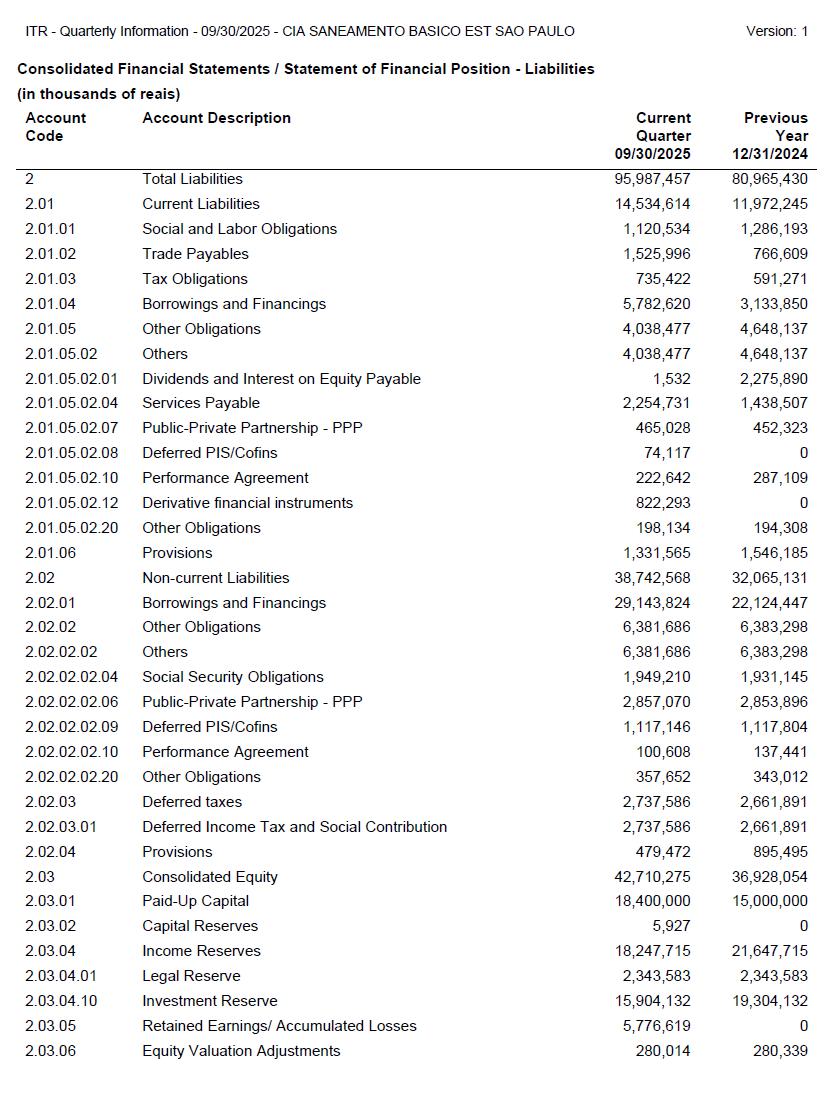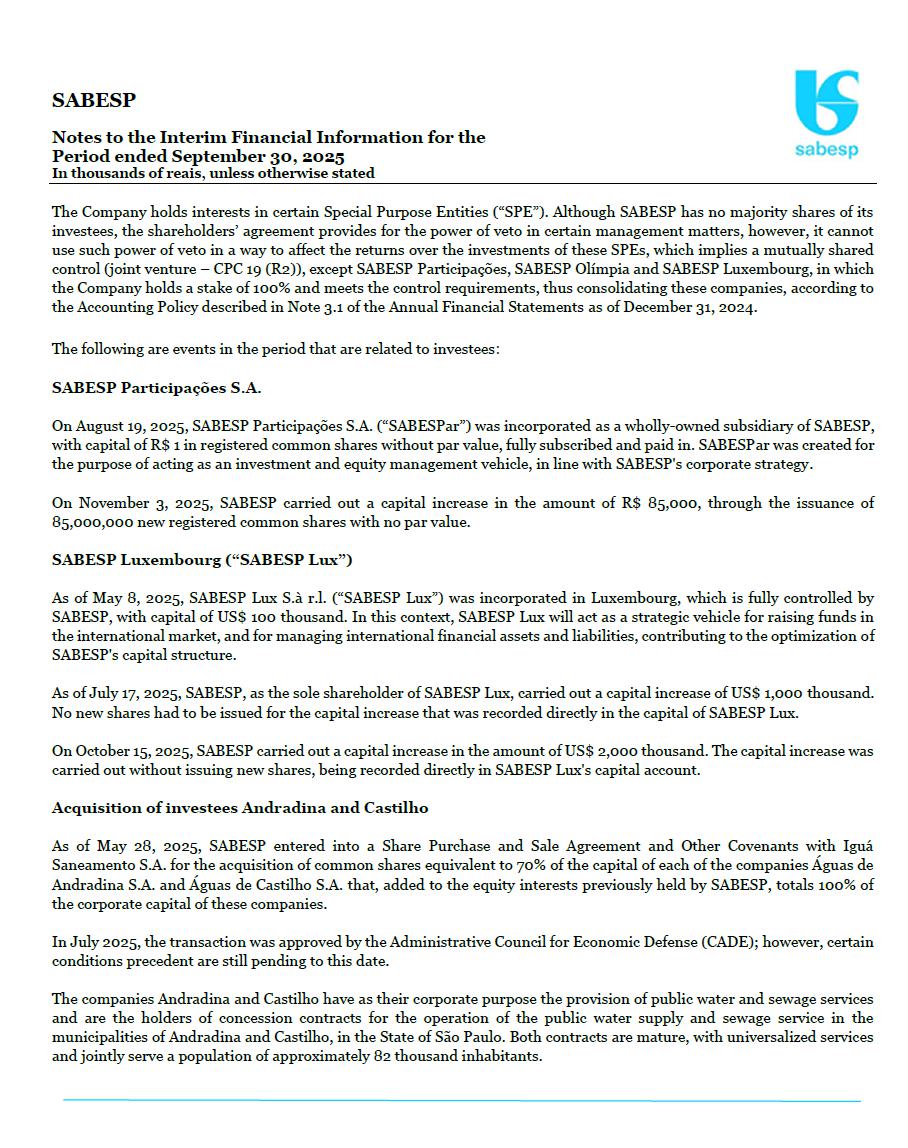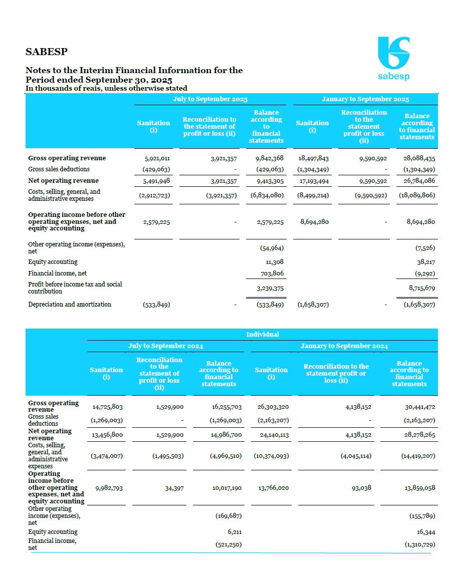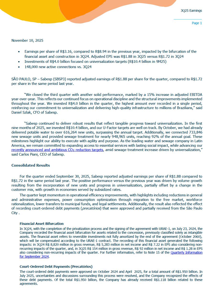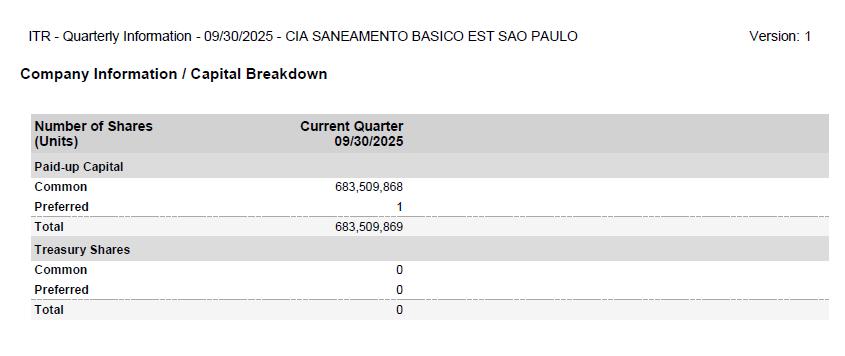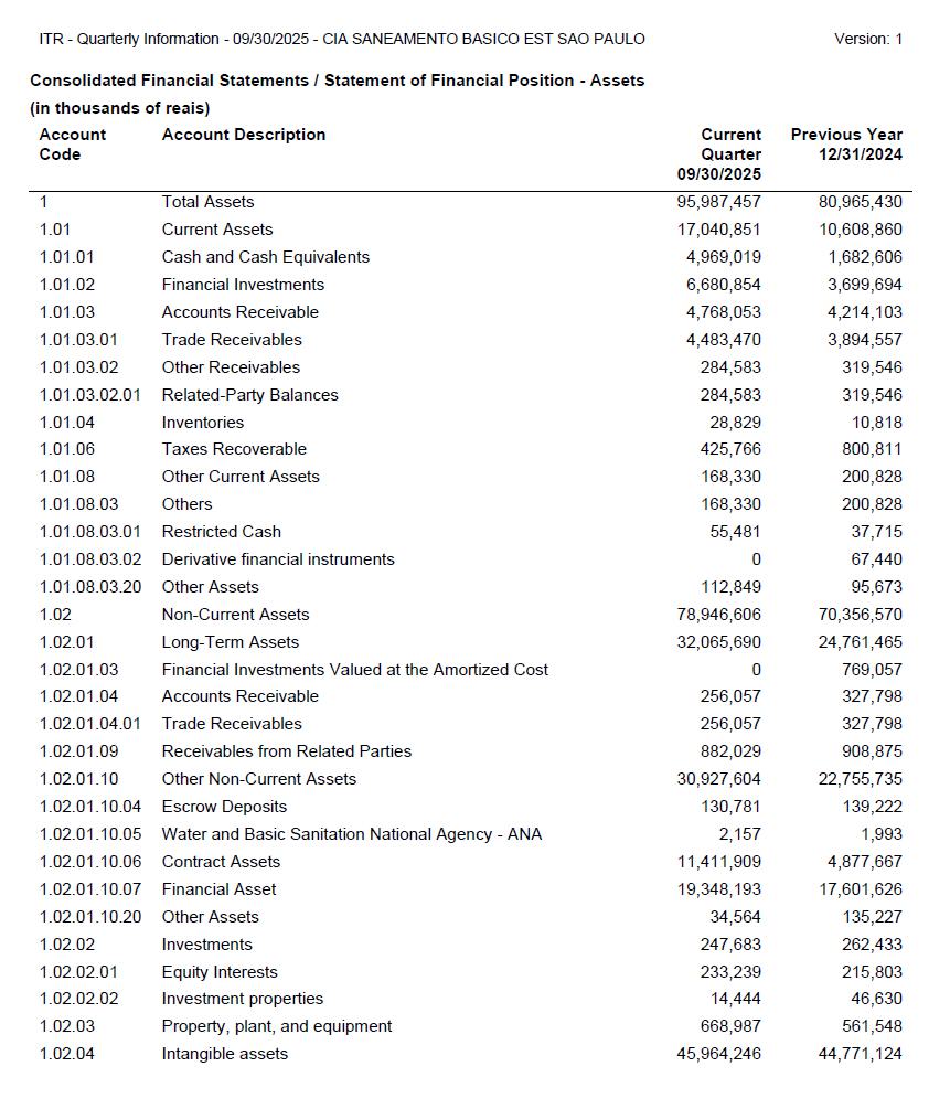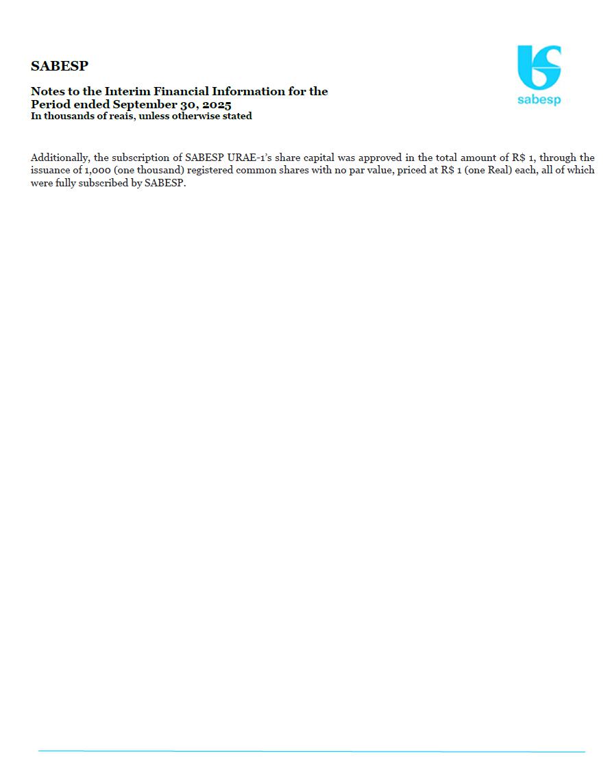 ITR - Quarterly Information - 09/30/2025 - CIA SANEAMENTO BASICO EST SAO PAULO Version: 1 Table of Contents Company Information Capital Breakdown 1 Individual Financial Statements Statement of Financial Position - Assets 2 Statement of Financial Position - Liabilities 3 Statement of Profit or Loss 4 Statement of Comprehensive Income 5 Statement of Cash Flows (Indirect Method) 6 Statement of Changes in Equity Statement of Changes in Equity - 01/01/2025 to 09/30/2025 8 Statement of Changes in Equity - 01/01/2024 to 09/30/2024 9 Statement of Value Added 10 Consolidated Financial Statements Statement of Financial Position - Assets 11 Statement of Financial Position - Liabilities 12 Statement of Profit or Loss 13 Statement of Comprehensive Income 14 Statement of Cash Flows (Indirect Method) 15 Statement of Changes in Equity Statement of Changes in Equity - 01/01/2025 to 09/30/2025 17 Statement of Changes in Equity - 01/01/2024 to 09/30/2024 18 Statement of Value Added 19 Comments on the Company’s Performance 20 Notes to the Quarterly Information 28 Reports and Statements Unqualified Report on the Special Review 94 Executive Officer’s Statement on the Financial Statements 95 Executive Officer’s Statement on the Report of Independent Registered Public Accounting Firm 96 ITR - Quarterly Information - 09/30/2025 - CIA SANEAMENTO BASICO EST SAO PAULO Version: 1 Company Information / Capital Breakdown Number of Shares Current Quarter (Units) 09/30/2025 Paid-up Capital Common 683,509,868 Preferred 1 Total 683,509,869 Treasury Shares Common 0 Preferred 0 Total 0 ITR - Quarterly Information - 09/30/2025 - CIA SANEAMENTO BASICO EST SAO PAULO Version: 1 Individual Financial Statements/ Statement of Financial Position – Assets (in thousands of reais) Account Code Account Description Current Quarter 09/30/2025 Previous Year 12/31/2024 1 Total Assets 95,982,957 80,978,272 1.01 Current Assets 17,019,835 10,598,757 1.01.01 Cash and Cash Equivalents 4,966,999 1,681,204 1.01.02 Financial Investments 6,668,814 3,694,029 1.01.03 Accounts Receivable 4,760,763 4,207,466 1.01.03.01 Trade Receivables 4,476,223 3,887,952 1.01.03.02 Other Receivables 284,540 319,514 1.01.03.02.01 Related-Party Balances 284,540 319,514 1.01.04 Inventories 28,536 10,524 1.01.06 Taxes Recoverable 425,741 800,797 1.01.08 Other Current Assets 168,982 204,737 1.01.08.03 Others 168,982 204,737 1.01.08.03.01 Restricted Cash 55,481 37,715 1.01.08.03.02 Derivative financial instruments 0 67,440 1.01.08.03.20 Other Assets 113,501 99,582 1.02 Non-Current Assets 78,963,122 70,379,515 1.02.01 Long-Term Assets 32,054,871 24,927,066 1.02.01.03 Financial Investments Valued at the Amortized Cost 0 769,057 1.02.01.04 Accounts Receivable 256,057 327,798 1.02.01.04.01 Trade Receivables 256,057 327,798 1.02.01.09 Receivables from Related Parties 882,029 908,875 1.02.01.10 Other Non-Current Assets 30,916,785 22,921,336 1.02.01.10.04 Escrow Deposits 130,781 139,222 1.02.01.10.05 Water and Basic Sanitation National Agency - ANA 2,157 1,993 1.02.01.10.06 Contract Assets 11,401,090 4,872,410 1.02.01.10.07 Financial Assets 19,348,193 17,601,626 1.02.01.10.20 Other Assets 34,564 306,085 1.02.02 Investments 413,974 262,433 1.02.02.01 Equity Interests 399,530 215,803 1.02.02.02 Investment properties 14,444 46,630 1.02.03 Property, plant, and equipment 668,987 561,548 1.02.04 Intangible assets 45,825,290 44,628,468 ITR - Quarterly Information - 09/30/2025 - CIA SANEAMENTO BASICO EST SAO PAULO Version: 1 Individual Financial Statements/ Statement of Financial Position - Liabilities (in thousands of reais) Account Code Account Description Current Quarter 09/30/2025 Previous Year 12/31/2024 2 Total Liabilities 95,982,957 80,978,272 2.01 Current Liabilities 14,434,328 11,968,321 2.01.01 Social and Labor obligations 1,120,534 1,286,193 2.01.02 Trade Payables 1,523,474 768,371 2.01.03 Tax Obligations 733,704 589,110 2.01.04 Borrowings and Financings 5,797,790 3,133,850 2.01.05 Other Obligations 3,927,261 4,644,613 2.01.05.02 Others 3,927,261 4,644,613 2.01.05.02.01 Dividends and Interest on Equity Payable 1,532 2,275,890 2.01.05.02.04 Services Payable 2,250,981 1,434,998 2.01.05.02.07 Public-Private Partnership - PPP 465,028 452,323 2.01.05.02.10 Performance Agreements 222,642 287,109 2.01.05.02.11 Deferred PIS/Cofins 74,117 0 2.01.05.02.12 Derivative financial instruments 714,842 0 2.01.05.02.20 Other Obligations 198,119 194,293 2.01.06 Provisions 1,331,565 1,546,184 2.02 Non-current Liabilities 38,838,354 32,081,897 2.02.01 Borrowings and Financings 29,258,757 22,124,447 2.02.02 Other Obligations 6,362,539 6,400,064 2.02.02.02 Others 6,362,539 6,400,064 2.02.02.02.04 Social Security Obligations 1,949,210 1,931,145 2.02.02.02.06 Public-Private Partnership - PPP 2,857,070 2,853,896 2.02.02.02.09 Deferred PIS/Cofins 1,117,146 1,117,804 2.02.02.02.10 Performance Agreements 100,608 137,441 2.02.02.02.20 Other Obligations 338,505 359,778 2.02.03 Deferred taxes 2,737,586 2,661,891 2.02.03.01 Deferred Income Tax and Social Contribution 2,737,586 2,661,891 2.02.04 Provisions 479,472 895,495 2.03 Equity 42,710,275 36,928,054 2.03.01 Paid-Up Capital 18,400,000 15,000,000 2.03.02 Capital Reserves 5,927 0 2.03.04 Profit Reserves 18,247,715 21,647,715 2.03.04.01 Legal Reserve 2,343,583 2,343,583 2.03.04.10 Investment Reserve 15,904,132 19,304,132 2.03.05 Retained Earnings/ Accumulated Losses 5,776,619 0 2.03.06 Equity Valuation Adjustments 280,014 280,339 ITR - Quarterly Information - 09/30/2025 - CIA SANEAMENTO BASICO EST SAO PAULO Version: 1 Individual Financial Statements/ Income Statement (in thousands of reais) Account Code Account Description Current Quarter 07/01/2025 to 09/30/2025 Accrued from the Current Year 01/01/2025 to 09/30/2025 Same Quarter of the Previous Year 07/01/2024 to 09/30/2024 Accrued for the Previous Year 01/01/2024 to 09/30/2024 3.01 Revenue from Sales and/or Services 9,413,305 26,784,086 14,986,700 28,278,265 3.02 Cost of Sales and/or Services -6,42