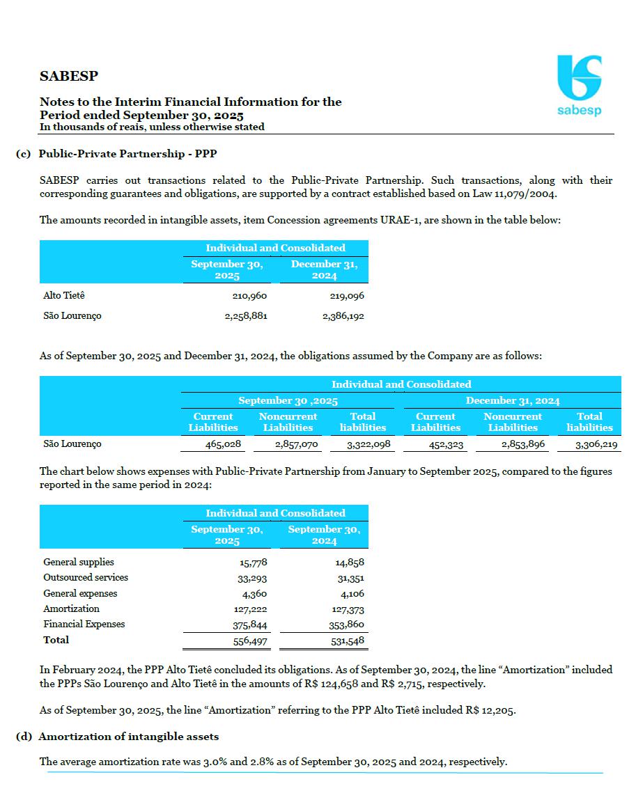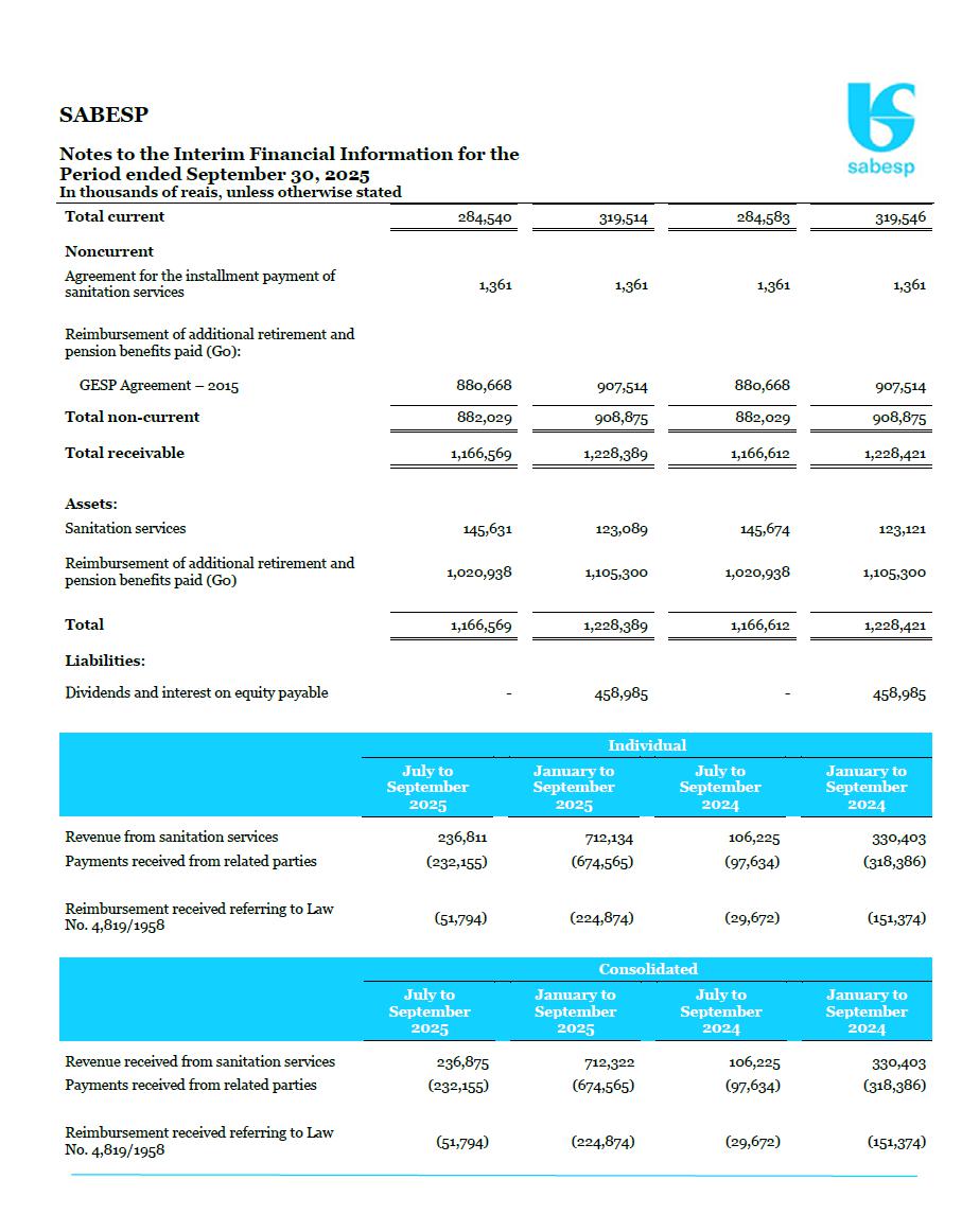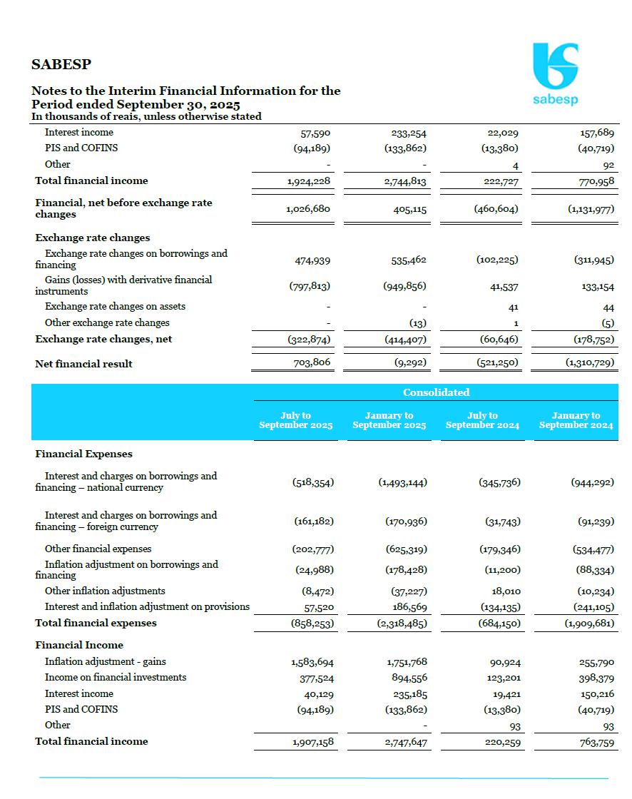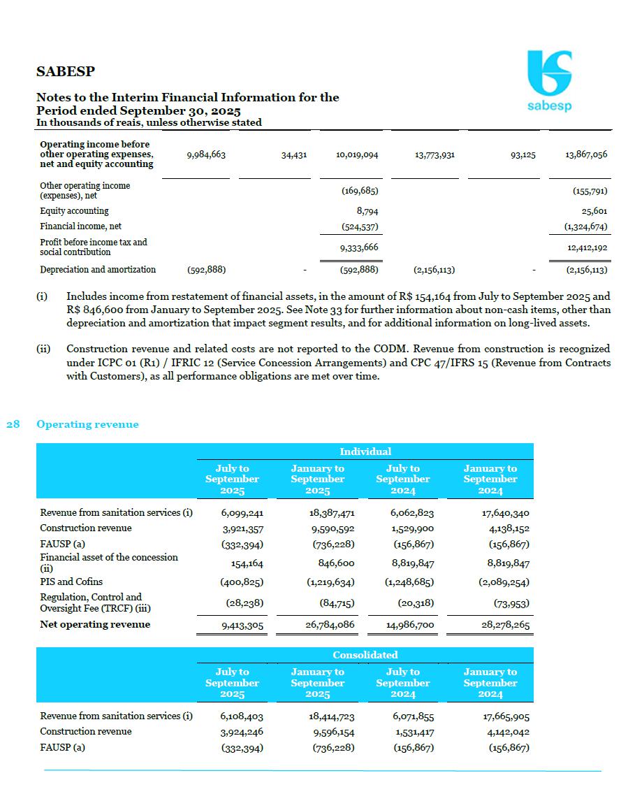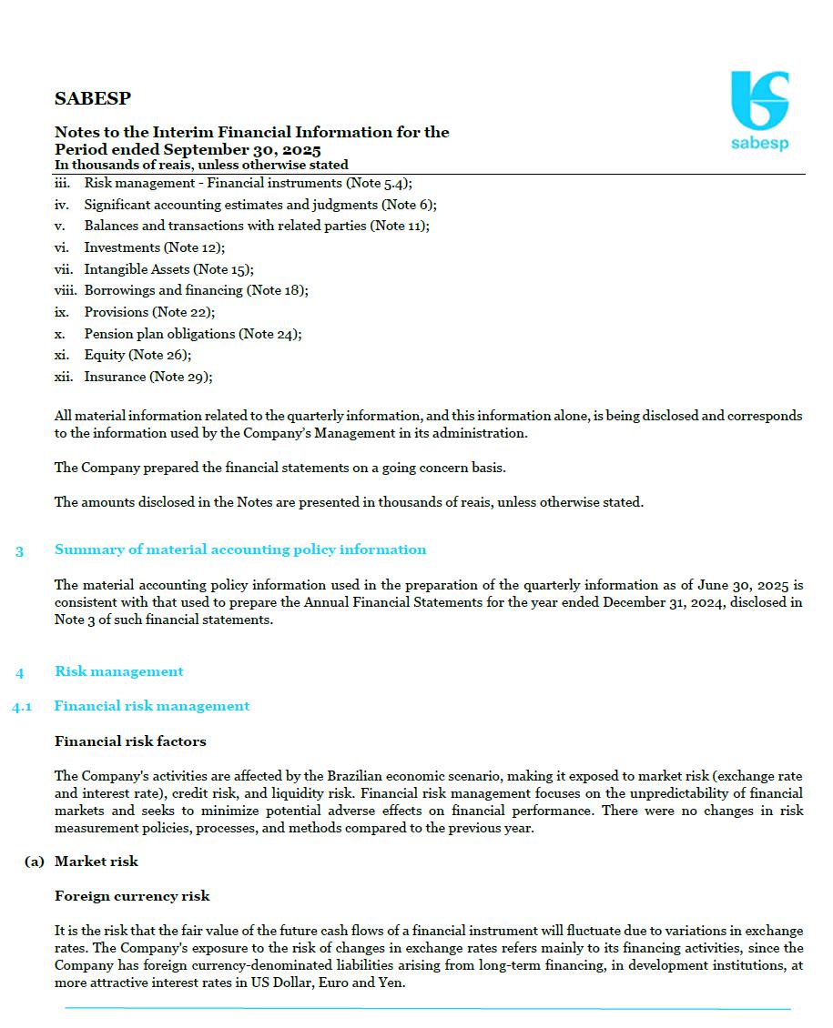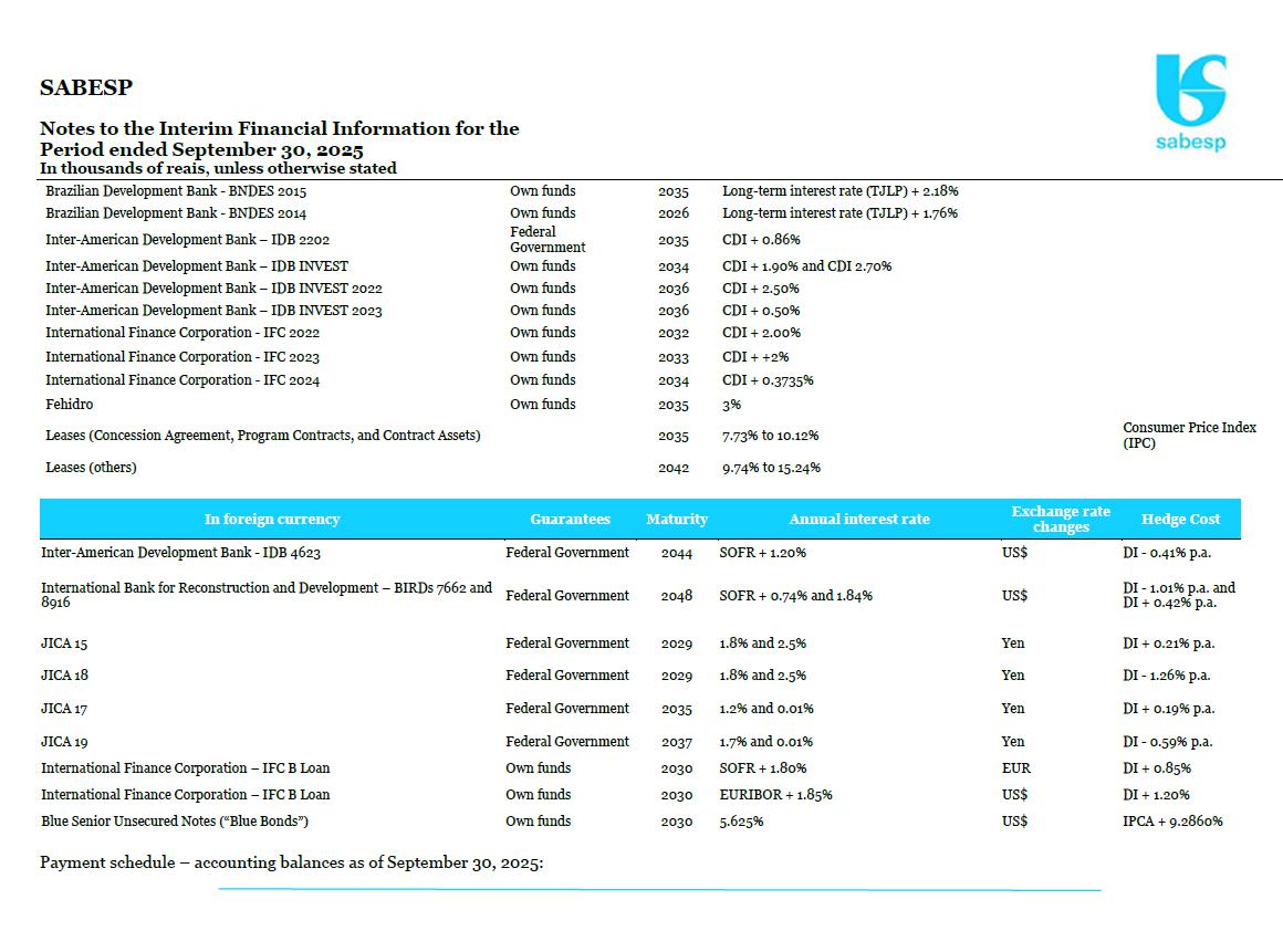 ITR - Quarterly Information - 09/30/2025 - CIA SANEAMENTO BASICO EST SAO PAULO Version: 1 Table of Contents Company Information Capital Breakdown 1 Individual Financial Statements Statement of Financial Position - Assets 2 Statement of Financial Position - Liabilities 3 Statement of Profit or Loss 4 Statement of Comprehensive Income 5 Statement of Cash Flows (Indirect Method) 6 Statement of Changes in Equity Statement of Changes in Equity - 01/01/2025 to 09/30/2025 8 Statement of Changes in Equity - 01/01/2024 to 09/30/2024 9 Statement of Value Added 10 Consolidated Financial Statements Statement of Financial Position - Assets 11 Statement of Financial Position - Liabilities 12 Statement of Profit or Loss 13 Statement of Comprehensive Income 14 Statement of Cash Flows (Indirect Method) 15 Statement of Changes in Equity Statement of Changes in Equity - 01/01/2025 to 09/30/2025 17 Statement of Changes in Equity - 01/01/2024 to 09/30/2024 18 Statement of Value Added 19 Comments on the Company’s Performance 20 Notes to the Quarterly Information 28 Reports and Statements Unqualified Report on the Special Review 94 Executive Officer’s Statement on the Financial Statements 95 Executive Officer’s Statement on the Report of Independent Registered Public Accounting Firm 96 ITR - Quarterly Information - 09/30/2025 - CIA SANEAMENTO BASICO EST SAO PAULO Version: 1 Company Information / Capital Breakdown Number of Shares Current Quarter (Units) 09/30/2025 Paid-up Capital Common 683,509,868 Preferred 1 Total 683,509,869 Treasury Shares Common 0 Preferred 0 Total 0 ITR - Quarterly Information - 09/30/2025 - CIA SANEAMENTO BASICO EST SAO PAULO Version: 1 Individual Financial Statements/ Statement of Financial Position – Assets (in thousands of reais) Account Code Account Description Current Quarter 09/30/2025 Previous Year 12/31/2024 1 Total Assets 95,982,957 80,978,272 1.01 Current Assets 17,019,835 10,598,757 1.01.01 Cash and Cash Equivalents 4,966,999 1,681,204 1.01.02 Financial Investments 6,668,814 3,694,029 1.01.03 Accounts Receivable 4,760,763 4,207,466 1.01.03.01 Trade Receivables 4,476,223 3,887,952 1.01.03.02 Other Receivables 284,540 319,514 1.01.03.02.01 Related-Party Balances 284,540 319,514 1.01.04 Inventories 28,536 10,524 1.01.06 Taxes Recoverable 425,741 800,797 1.01.08 Other Current Assets 168,982 204,737 1.01.08.03 Others 168,982 204,737 1.01.08.03.01 Restricted Cash 55,481 37,715 1.01.08.03.02 Derivative financial instruments 0 67,440 1.01.08.03.20 Other Assets 113,501 99,582 1.02 Non-Current Assets 78,963,122 70,379,515 1.02.01 Long-Term Assets 32,054,871 24,927,066 1.02.01.03 Financial Investments Valued at the Amortized Cost 0 769,057 1.02.01.04 Accounts Receivable 256,057 327,798 1.02.01.04.01 Trade Receivables 256,057 327,798 1.02.01.09 Receivables from Related Parties 882,029 908,875 1.02.01.10 Other Non-Current Assets 30,916,785 22,921,336 1.02.01.10.04 Escrow Deposits 130,781 139,222 1.02.01.10.05 Water and Basic Sanitation National Agency - ANA 2,157 1,993 1.02.01.10.06 Contract Assets 11,401,090 4,872,410 1.02.01.10.07 Financial Assets 19,348,193 17,601,626 1.02.01.10.20 Other Assets 34,564 306,085 1.02.02 Investments 413,974 262,433 1.02.02.01 Equity Interests 399,530 215,803 1.02.02.02 Investment properties 14,444 46,630 1.02.03 Property, plant, and equipment 668,987 561,548 1.02.04 Intangible assets 45,825,290 44,628,468 ITR - Quarterly Information - 09/30/2025 - CIA SANEAMENTO BASICO EST SAO PAULO Version: 1 Individual Financial Statements/ Statement of Financial Position - Liabilities (in thousands of reais) Account Code Account Description Current Quarter 09/30/2025 Previous Year 12/31/2024 2 Total Liabilities 95,982,957 80,978,272 2.01 Current Liabilities 14,434,328 11,968,321 2.01.01 Social and Labor obligations 1,120,534 1,286,193 2.01.02 Trade Payables 1,523,474 768,371 2.01.03 Tax Obligations 733,704 589,110 2.01.04 Borrowings and Financings 5,797,790 3,133,850 2.01.05 Other Obligations 3,927,261 4,644,613 2.01.05.02 Others 3,927,261 4,644,613 2.01.05.02.01 Dividends and Interest on Equity Payable 1,532 2,275,890 2.01.05.02.04 Services Payable 2,250,981 1,434,998 2.01.05.02.07 Public-Private Partnership - PPP 465,028 452,323 2.01.05.02.10 Performance Agreements 222,642 287,109 2.01.05.02.11 Deferred PIS/Cofins 74,117 0 2.01.05.02.12 Derivative financial instruments 714,842 0 2.01.05.02.20 Other Obligations 198,119 194,293 2.01.06 Provisions 1,331,565 1,546,184 2.02 Non-current Liabilities 38,838,354 32,081,897 2.02.01 Borrowings and Financings 29,258,757 22,124,447 2.02.02 Other Obligations 6,362,539 6,400,064 2.02.02.02 Others 6,362,539 6,400,064 2.02.02.02.04 Social Security Obligations 1,949,210 1,931,145 2.02.02.02.06 Public-Private Partnership - PPP 2,857,070 2,853,896 2.02.02.02.09 Deferred PIS/Cofins 1,117,146 1,117,804 2.02.02.02.10 Performance Agreements 100,608 137,441 2.02.02.02.20 Other Obligations 338,505 359,778 2.02.03 Deferred taxes 2,737,586 2,661,891 2.02.03.01 Deferred Income Tax and Social Contribution 2,737,586 2,661,891 2.02.04 Provisions 479,472 895,495 2.03 Equity 42,710,275 36,928,054 2.03.01 Paid-Up Capital 18,400,000 15,000,000 2.03.02 Capital Reserves 5,927 0 2.03.04 Profit Reserves 18,247,715 21,647,715 2.03.04.01 Legal Reserve 2,343,583 2,343,583 2.03.04.10 Investment Reserve 15,904,132 19,304,132 2.03.05 Retained Earnings/ Accumulated Losses 5,776,619 0 2.03.06 Equity Valuation Adjustments 280,014 280,339 ITR - Quarterly Information - 09/30/2025 - CIA SANEAMENTO BASICO EST SAO PAULO Version: 1 Individual Financial Statements/ Income Statement (in thousands of reais) Account Code Account Description Current Quarter 07/01/2025 to 09/30/2025 Accrued from the Current Year 01/01/2025 to 09/30/2025 Same Quarter of the Previous Year 07/01/2024 to 09/30/2024 Accrued for the Previous Year 01/01/2024 to 09/30/2024 3.01 Revenue from Sales and/or Services 9,413,305 26,784,086 14,986,700 28,278,265 3.02 Cost of Sales and/or Services -6,42