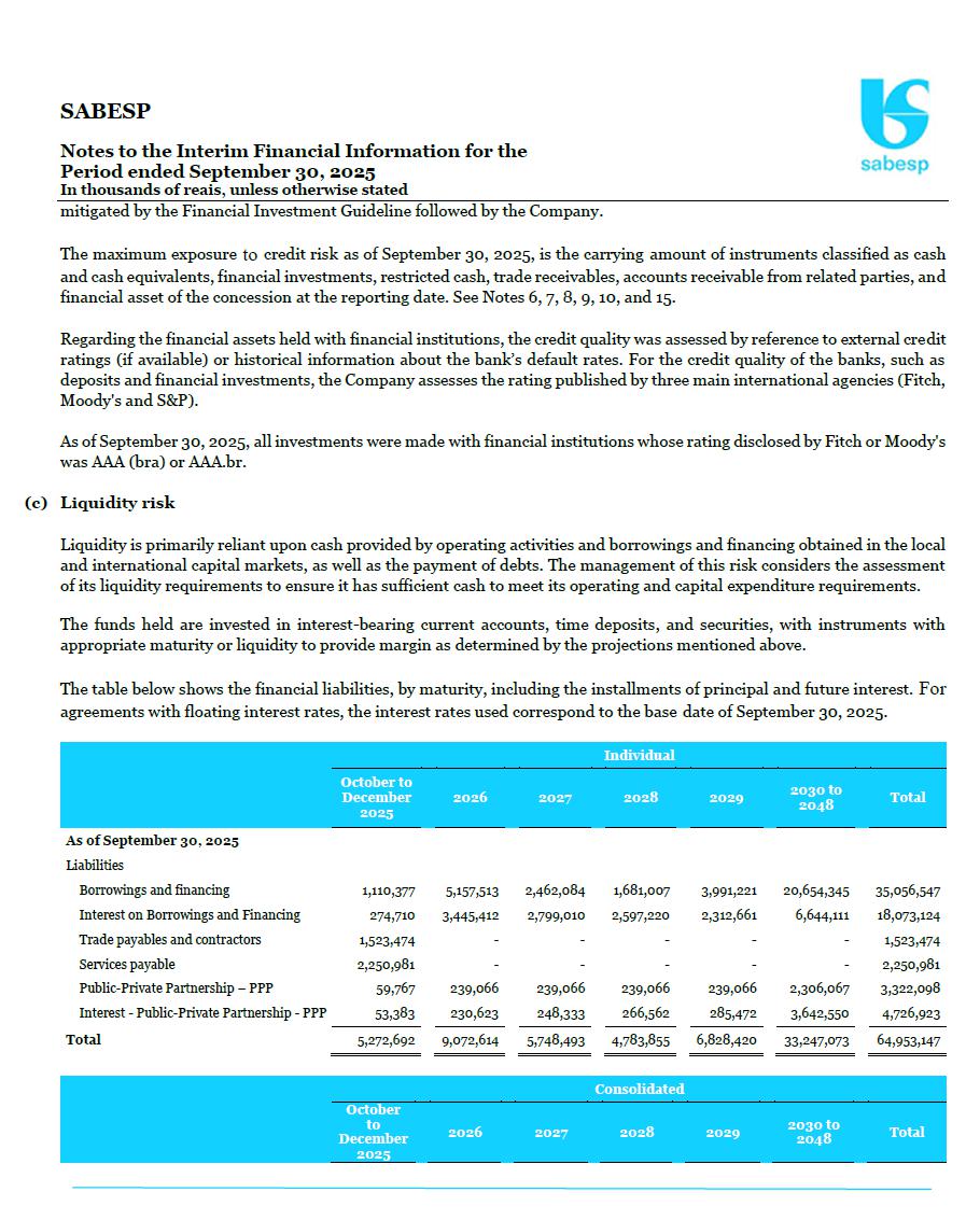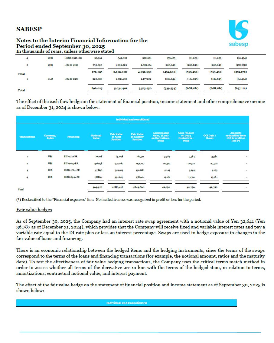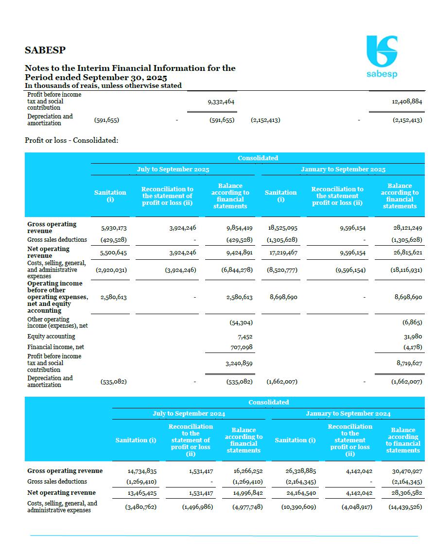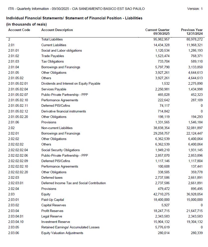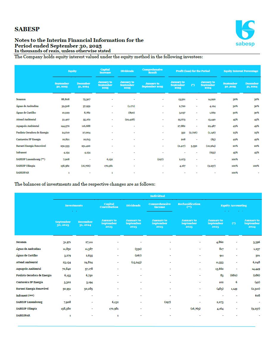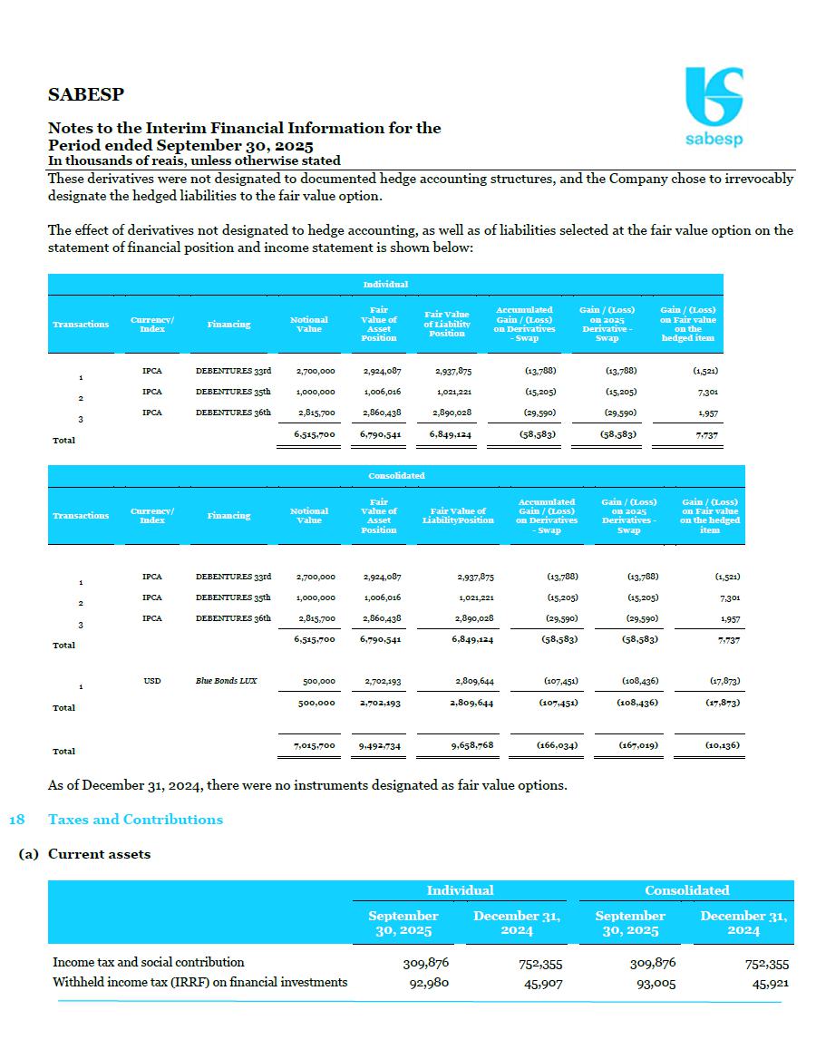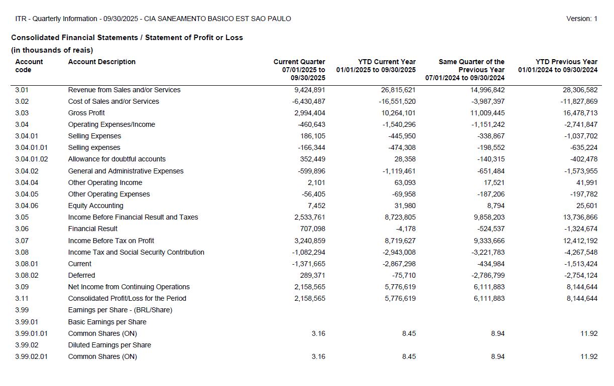 ITR - Quarterly Information - 09/30/2025 - CIA SANEAMENTO BASICO EST SAO PAULO Version: 1 Table of Contents Company Information Capital Breakdown 1 Individual Financial Statements Statement of Financial Position - Assets 2 Statement of Financial Position - Liabilities 3 Statement of Profit or Loss 4 Statement of Comprehensive Income 5 Statement of Cash Flows (Indirect Method) 6 Statement of Changes in Equity Statement of Changes in Equity - 01/01/2025 to 09/30/2025 8 Statement of Changes in Equity - 01/01/2024 to 09/30/2024 9 Statement of Value Added 10 Consolidated Financial Statements Statement of Financial Position - Assets 11 Statement of Financial Position - Liabilities 12 Statement of Profit or Loss 13 Statement of Comprehensive Income 14 Statement of Cash Flows (Indirect Method) 15 Statement of Changes in Equity Statement of Changes in Equity - 01/01/2025 to 09/30/2025 17 Statement of Changes in Equity - 01/01/2024 to 09/30/2024 18 Statement of Value Added 19 Comments on the Company’s Performance 20 Notes to the Quarterly Information 28 Reports and Statements Unqualified Report on the Special Review 94 Executive Officer’s Statement on the Financial Statements 95 Executive Officer’s Statement on the Report of Independent Registered Public Accounting Firm 96 ITR - Quarterly Information - 09/30/2025 - CIA SANEAMENTO BASICO EST SAO PAULO Version: 1 Company Information / Capital Breakdown Number of Shares Current Quarter (Units) 09/30/2025 Paid-up Capital Common 683,509,868 Preferred 1 Total 683,509,869 Treasury Shares Common 0 Preferred 0 Total 0 ITR - Quarterly Information - 09/30/2025 - CIA SANEAMENTO BASICO EST SAO PAULO Version: 1 Individual Financial Statements/ Statement of Financial Position – Assets (in thousands of reais) Account Code Account Description Current Quarter 09/30/2025 Previous Year 12/31/2024 1 Total Assets 95,982,957 80,978,272 1.01 Current Assets 17,019,835 10,598,757 1.01.01 Cash and Cash Equivalents 4,966,999 1,681,204 1.01.02 Financial Investments 6,668,814 3,694,029 1.01.03 Accounts Receivable 4,760,763 4,207,466 1.01.03.01 Trade Receivables 4,476,223 3,887,952 1.01.03.02 Other Receivables 284,540 319,514 1.01.03.02.01 Related-Party Balances 284,540 319,514 1.01.04 Inventories 28,536 10,524 1.01.06 Taxes Recoverable 425,741 800,797 1.01.08 Other Current Assets 168,982 204,737 1.01.08.03 Others 168,982 204,737 1.01.08.03.01 Restricted Cash 55,481 37,715 1.01.08.03.02 Derivative financial instruments 0 67,440 1.01.08.03.20 Other Assets 113,501 99,582 1.02 Non-Current Assets 78,963,122 70,379,515 1.02.01 Long-Term Assets 32,054,871 24,927,066 1.02.01.03 Financial Investments Valued at the Amortized Cost 0 769,057 1.02.01.04 Accounts Receivable 256,057 327,798 1.02.01.04.01 Trade Receivables 256,057 327,798 1.02.01.09 Receivables from Related Parties 882,029 908,875 1.02.01.10 Other Non-Current Assets 30,916,785 22,921,336 1.02.01.10.04 Escrow Deposits 130,781 139,222 1.02.01.10.05 Water and Basic Sanitation National Agency - ANA 2,157 1,993 1.02.01.10.06 Contract Assets 11,401,090 4,872,410 1.02.01.10.07 Financial Assets 19,348,193 17,601,626 1.02.01.10.20 Other Assets 34,564 306,085 1.02.02 Investments 413,974 262,433 1.02.02.01 Equity Interests 399,530 215,803 1.02.02.02 Investment properties 14,444 46,630 1.02.03 Property, plant, and equipment 668,987 561,548 1.02.04 Intangible assets 45,825,290 44,628,468 ITR - Quarterly Information - 09/30/2025 - CIA SANEAMENTO BASICO EST SAO PAULO Version: 1 Individual Financial Statements/ Statement of Financial Position - Liabilities (in thousands of reais) Account Code Account Description Current Quarter 09/30/2025 Previous Year 12/31/2024 2 Total Liabilities 95,982,957 80,978,272 2.01 Current Liabilities 14,434,328 11,968,321 2.01.01 Social and Labor obligations 1,120,534 1,286,193 2.01.02 Trade Payables 1,523,474 768,371 2.01.03 Tax Obligations 733,704 589,110 2.01.04 Borrowings and Financings 5,797,790 3,133,850 2.01.05 Other Obligations 3,927,261 4,644,613 2.01.05.02 Others 3,927,261 4,644,613 2.01.05.02.01 Dividends and Interest on Equity Payable 1,532 2,275,890 2.01.05.02.04 Services Payable 2,250,981 1,434,998 2.01.05.02.07 Public-Private Partnership - PPP 465,028 452,323 2.01.05.02.10 Performance Agreements 222,642 287,109 2.01.05.02.11 Deferred PIS/Cofins 74,117 0 2.01.05.02.12 Derivative financial instruments 714,842 0 2.01.05.02.20 Other Obligations 198,119 194,293 2.01.06 Provisions 1,331,565 1,546,184 2.02 Non-current Liabilities 38,838,354 32,081,897 2.02.01 Borrowings and Financings 29,258,757 22,124,447 2.02.02 Other Obligations 6,362,539 6,400,064 2.02.02.02 Others 6,362,539 6,400,064 2.02.02.02.04 Social Security Obligations 1,949,210 1,931,145 2.02.02.02.06 Public-Private Partnership - PPP 2,857,070 2,853,896 2.02.02.02.09 Deferred PIS/Cofins 1,117,146 1,117,804 2.02.02.02.10 Performance Agreements 100,608 137,441 2.02.02.02.20 Other Obligations 338,505 359,778 2.02.03 Deferred taxes 2,737,586 2,661,891 2.02.03.01 Deferred Income Tax and Social Contribution 2,737,586 2,661,891 2.02.04 Provisions 479,472 895,495 2.03 Equity 42,710,275 36,928,054 2.03.01 Paid-Up Capital 18,400,000 15,000,000 2.03.02 Capital Reserves 5,927 0 2.03.04 Profit Reserves 18,247,715 21,647,715 2.03.04.01 Legal Reserve 2,343,583 2,343,583 2.03.04.10 Investment Reserve 15,904,132 19,304,132 2.03.05 Retained Earnings/ Accumulated Losses 5,776,619 0 2.03.06 Equity Valuation Adjustments 280,014 280,339 ITR - Quarterly Information - 09/30/2025 - CIA SANEAMENTO BASICO EST SAO PAULO Version: 1 Individual Financial Statements/ Income Statement (in thousands of reais) Account Code Account Description Current Quarter 07/01/2025 to 09/30/2025 Accrued from the Current Year 01/01/2025 to 09/30/2025 Same Quarter of the Previous Year 07/01/2024 to 09/30/2024 Accrued for the Previous Year 01/01/2024 to 09/30/2024 3.01 Revenue from Sales and/or Services 9,413,305 26,784,086 14,986,700 28,278,265 3.02 Cost of Sales and/or Services -6,42