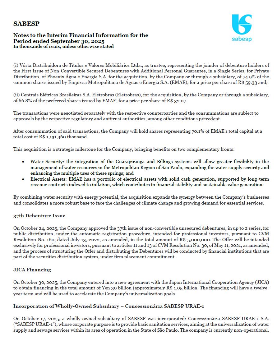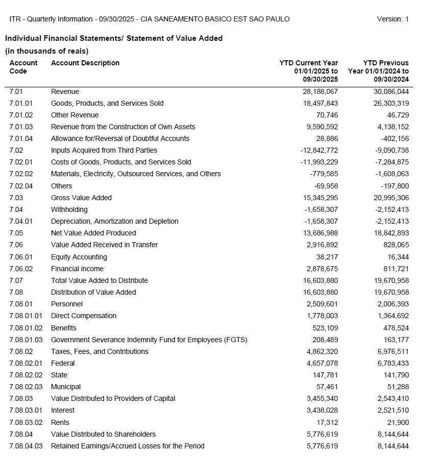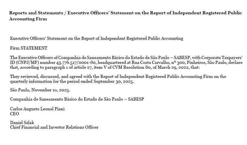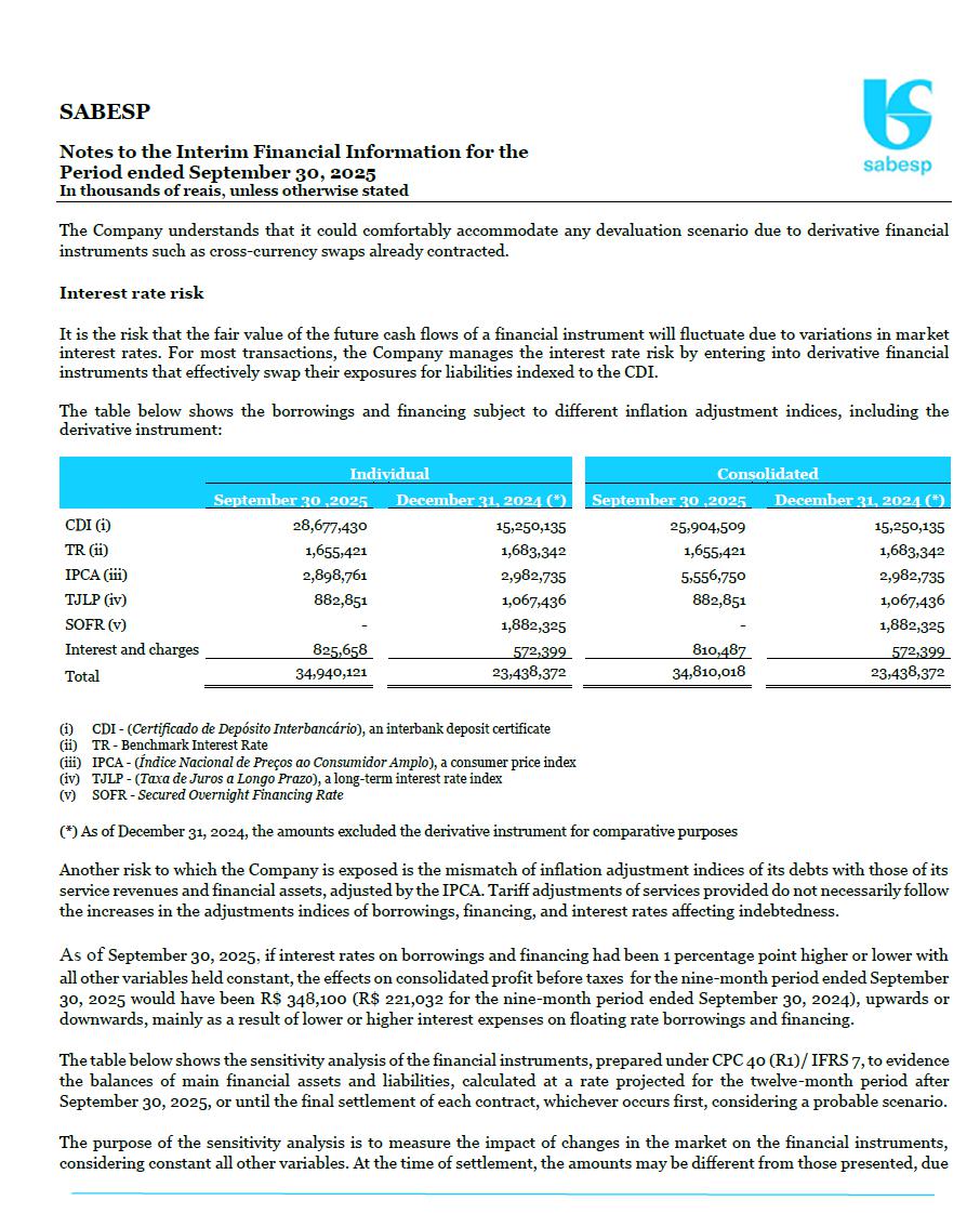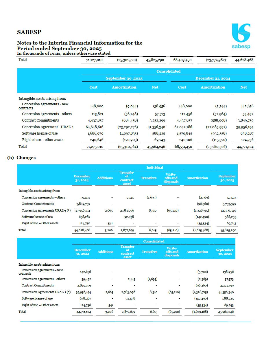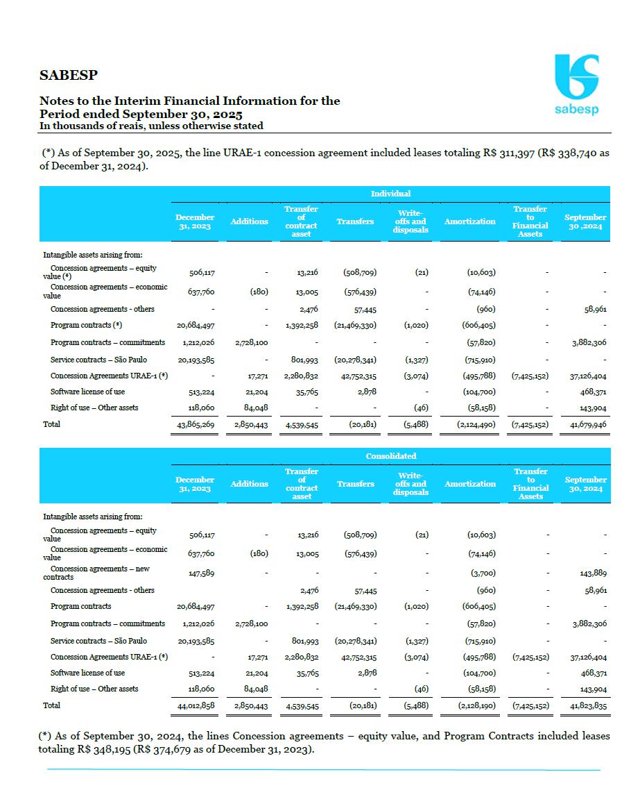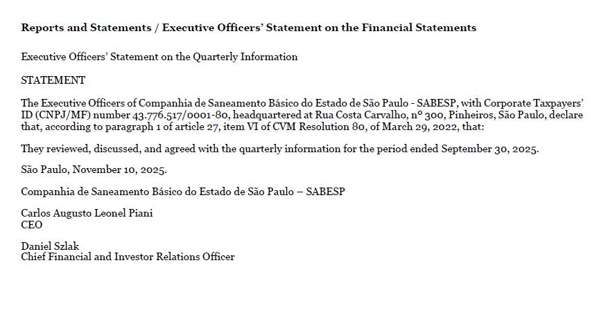 ITR - Quarterly Information - 09/30/2025 - CIA SANEAMENTO BASICO EST SAO PAULO Version: 1 Table of Contents Company Information Capital Breakdown 1 Individual Financial Statements Statement of Financial Position - Assets 2 Statement of Financial Position - Liabilities 3 Statement of Profit or Loss 4 Statement of Comprehensive Income 5 Statement of Cash Flows (Indirect Method) 6 Statement of Changes in Equity Statement of Changes in Equity - 01/01/2025 to 09/30/2025 8 Statement of Changes in Equity - 01/01/2024 to 09/30/2024 9 Statement of Value Added 10 Consolidated Financial Statements Statement of Financial Position - Assets 11 Statement of Financial Position - Liabilities 12 Statement of Profit or Loss 13 Statement of Comprehensive Income 14 Statement of Cash Flows (Indirect Method) 15 Statement of Changes in Equity Statement of Changes in Equity - 01/01/2025 to 09/30/2025 17 Statement of Changes in Equity - 01/01/2024 to 09/30/2024 18 Statement of Value Added 19 Comments on the Company’s Performance 20 Notes to the Quarterly Information 28 Reports and Statements Unqualified Report on the Special Review 94 Executive Officer’s Statement on the Financial Statements 95 Executive Officer’s Statement on the Report of Independent Registered Public Accounting Firm 96 ITR - Quarterly Information - 09/30/2025 - CIA SANEAMENTO BASICO EST SAO PAULO Version: 1 Company Information / Capital Breakdown Number of Shares Current Quarter (Units) 09/30/2025 Paid-up Capital Common 683,509,868 Preferred 1 Total 683,509,869 Treasury Shares Common 0 Preferred 0 Total 0 ITR - Quarterly Information - 09/30/2025 - CIA SANEAMENTO BASICO EST SAO PAULO Version: 1 Individual Financial Statements/ Statement of Financial Position – Assets (in thousands of reais) Account Code Account Description Current Quarter 09/30/2025 Previous Year 12/31/2024 1 Total Assets 95,982,957 80,978,272 1.01 Current Assets 17,019,835 10,598,757 1.01.01 Cash and Cash Equivalents 4,966,999 1,681,204 1.01.02 Financial Investments 6,668,814 3,694,029 1.01.03 Accounts Receivable 4,760,763 4,207,466 1.01.03.01 Trade Receivables 4,476,223 3,887,952 1.01.03.02 Other Receivables 284,540 319,514 1.01.03.02.01 Related-Party Balances 284,540 319,514 1.01.04 Inventories 28,536 10,524 1.01.06 Taxes Recoverable 425,741 800,797 1.01.08 Other Current Assets 168,982 204,737 1.01.08.03 Others 168,982 204,737 1.01.08.03.01 Restricted Cash 55,481 37,715 1.01.08.03.02 Derivative financial instruments 0 67,440 1.01.08.03.20 Other Assets 113,501 99,582 1.02 Non-Current Assets 78,963,122 70,379,515 1.02.01 Long-Term Assets 32,054,871 24,927,066 1.02.01.03 Financial Investments Valued at the Amortized Cost 0 769,057 1.02.01.04 Accounts Receivable 256,057 327,798 1.02.01.04.01 Trade Receivables 256,057 327,798 1.02.01.09 Receivables from Related Parties 882,029 908,875 1.02.01.10 Other Non-Current Assets 30,916,785 22,921,336 1.02.01.10.04 Escrow Deposits 130,781 139,222 1.02.01.10.05 Water and Basic Sanitation National Agency - ANA 2,157 1,993 1.02.01.10.06 Contract Assets 11,401,090 4,872,410 1.02.01.10.07 Financial Assets 19,348,193 17,601,626 1.02.01.10.20 Other Assets 34,564 306,085 1.02.02 Investments 413,974 262,433 1.02.02.01 Equity Interests 399,530 215,803 1.02.02.02 Investment properties 14,444 46,630 1.02.03 Property, plant, and equipment 668,987 561,548 1.02.04 Intangible assets 45,825,290 44,628,468 ITR - Quarterly Information - 09/30/2025 - CIA SANEAMENTO BASICO EST SAO PAULO Version: 1 Individual Financial Statements/ Statement of Financial Position - Liabilities (in thousands of reais) Account Code Account Description Current Quarter 09/30/2025 Previous Year 12/31/2024 2 Total Liabilities 95,982,957 80,978,272 2.01 Current Liabilities 14,434,328 11,968,321 2.01.01 Social and Labor obligations 1,120,534 1,286,193 2.01.02 Trade Payables 1,523,474 768,371 2.01.03 Tax Obligations 733,704 589,110 2.01.04 Borrowings and Financings 5,797,790 3,133,850 2.01.05 Other Obligations 3,927,261 4,644,613 2.01.05.02 Others 3,927,261 4,644,613 2.01.05.02.01 Dividends and Interest on Equity Payable 1,532 2,275,890 2.01.05.02.04 Services Payable 2,250,981 1,434,998 2.01.05.02.07 Public-Private Partnership - PPP 465,028 452,323 2.01.05.02.10 Performance Agreements 222,642 287,109 2.01.05.02.11 Deferred PIS/Cofins 74,117 0 2.01.05.02.12 Derivative financial instruments 714,842 0 2.01.05.02.20 Other Obligations 198,119 194,293 2.01.06 Provisions 1,331,565 1,546,184 2.02 Non-current Liabilities 38,838,354 32,081,897 2.02.01 Borrowings and Financings 29,258,757 22,124,447 2.02.02 Other Obligations 6,362,539 6,400,064 2.02.02.02 Others 6,362,539 6,400,064 2.02.02.02.04 Social Security Obligations 1,949,210 1,931,145 2.02.02.02.06 Public-Private Partnership - PPP 2,857,070 2,853,896 2.02.02.02.09 Deferred PIS/Cofins 1,117,146 1,117,804 2.02.02.02.10 Performance Agreements 100,608 137,441 2.02.02.02.20 Other Obligations 338,505 359,778 2.02.03 Deferred taxes 2,737,586 2,661,891 2.02.03.01 Deferred Income Tax and Social Contribution 2,737,586 2,661,891 2.02.04 Provisions 479,472 895,495 2.03 Equity 42,710,275 36,928,054 2.03.01 Paid-Up Capital 18,400,000 15,000,000 2.03.02 Capital Reserves 5,927 0 2.03.04 Profit Reserves 18,247,715 21,647,715 2.03.04.01 Legal Reserve 2,343,583 2,343,583 2.03.04.10 Investment Reserve 15,904,132 19,304,132 2.03.05 Retained Earnings/ Accumulated Losses 5,776,619 0 2.03.06 Equity Valuation Adjustments 280,014 280,339 ITR - Quarterly Information - 09/30/2025 - CIA SANEAMENTO BASICO EST SAO PAULO Version: 1 Individual Financial Statements/ Income Statement (in thousands of reais) Account Code Account Description Current Quarter 07/01/2025 to 09/30/2025 Accrued from the Current Year 01/01/2025 to 09/30/2025 Same Quarter of the Previous Year 07/01/2024 to 09/30/2024 Accrued for the Previous Year 01/01/2024 to 09/30/2024 3.01 Revenue from Sales and/or Services 9,413,305 26,784,086 14,986,700 28,278,265 3.02 Cost of Sales and/or Services -6,42