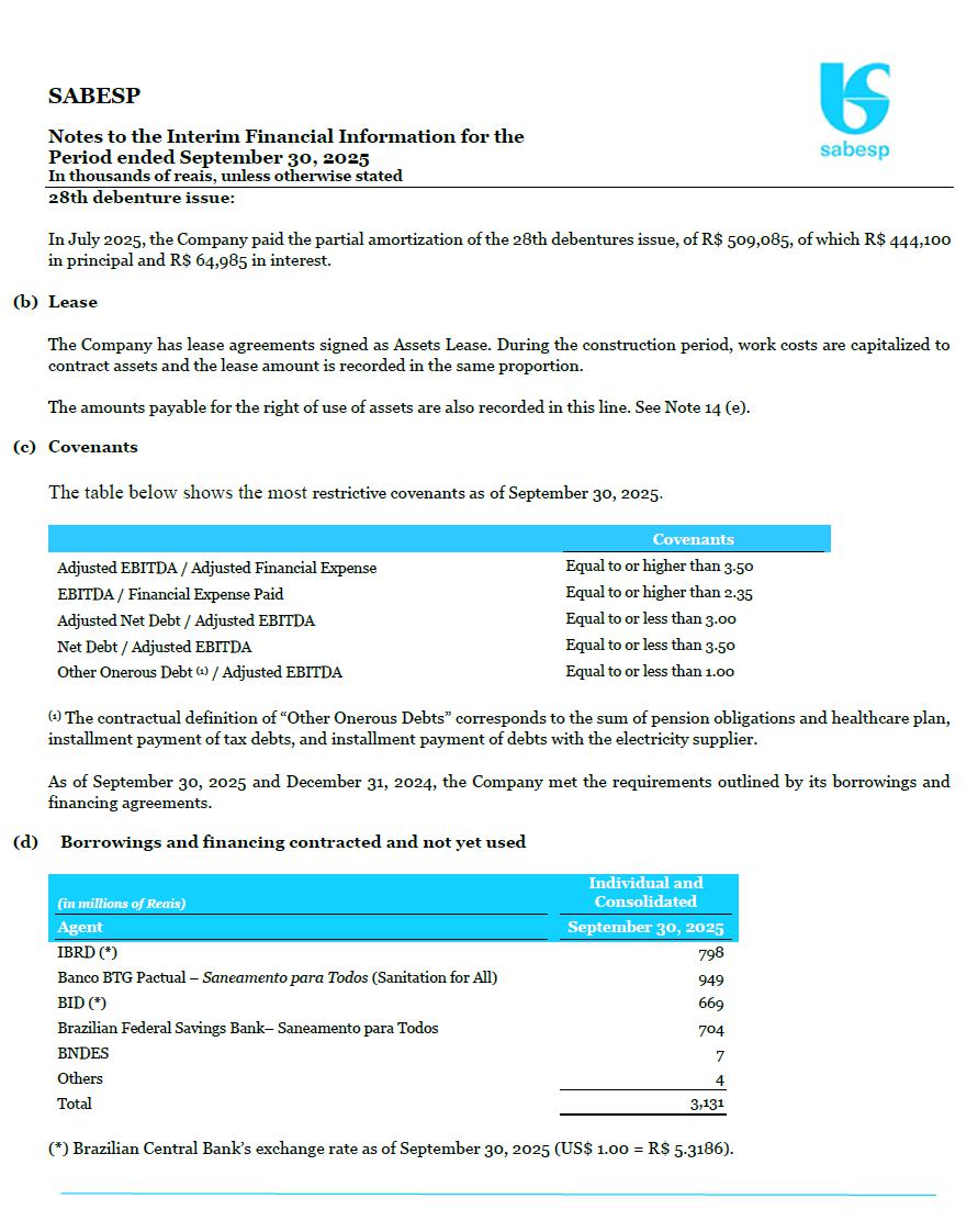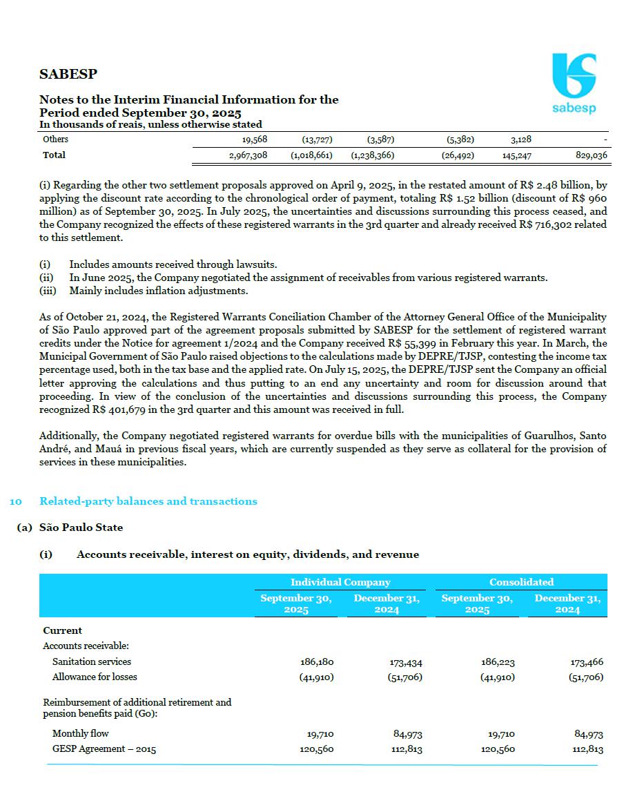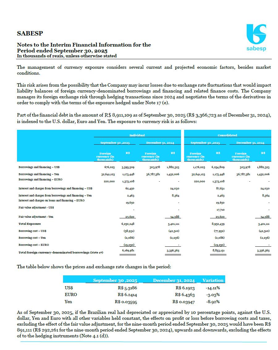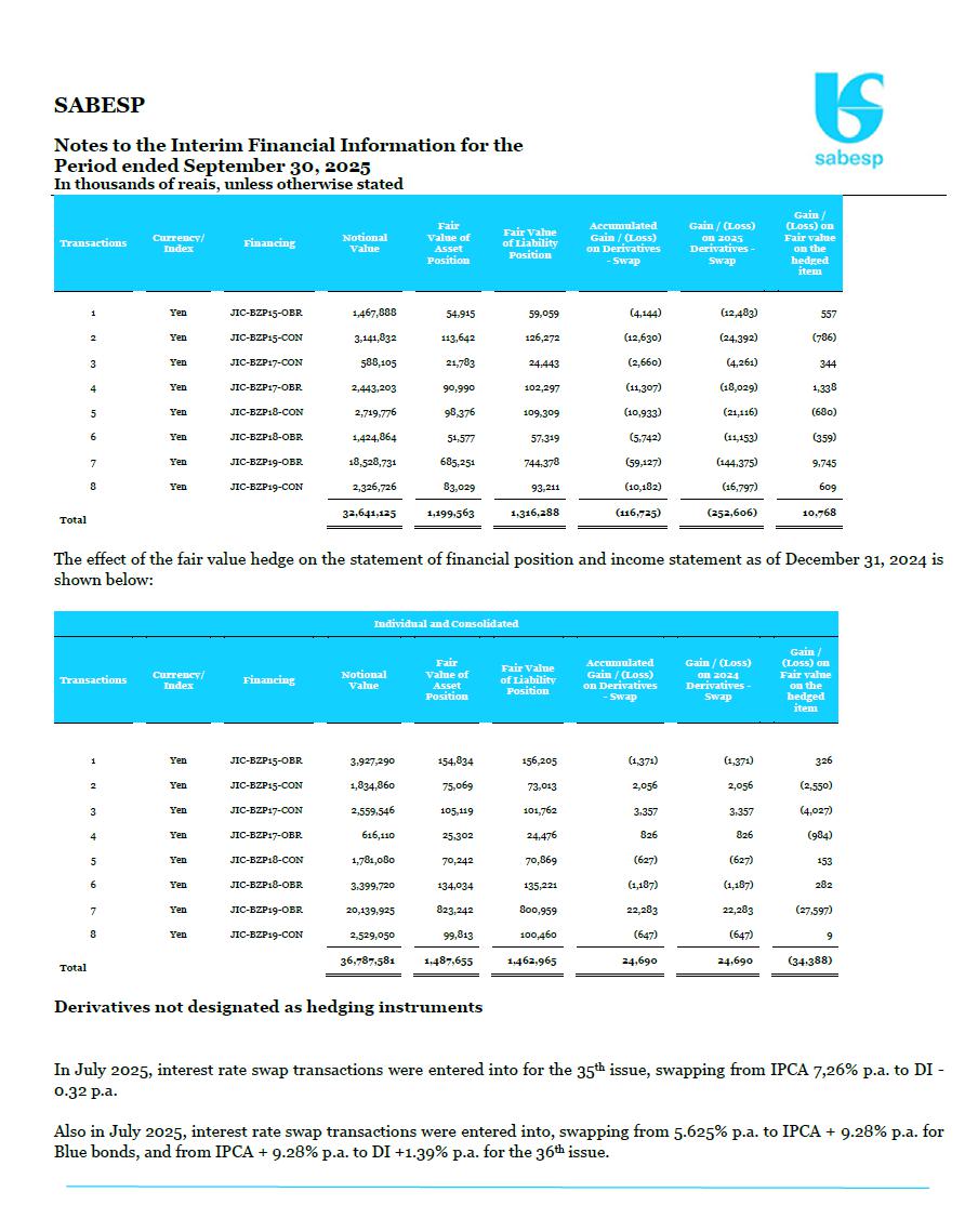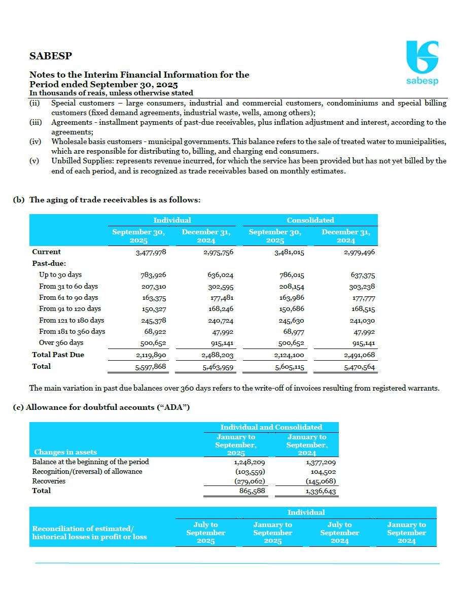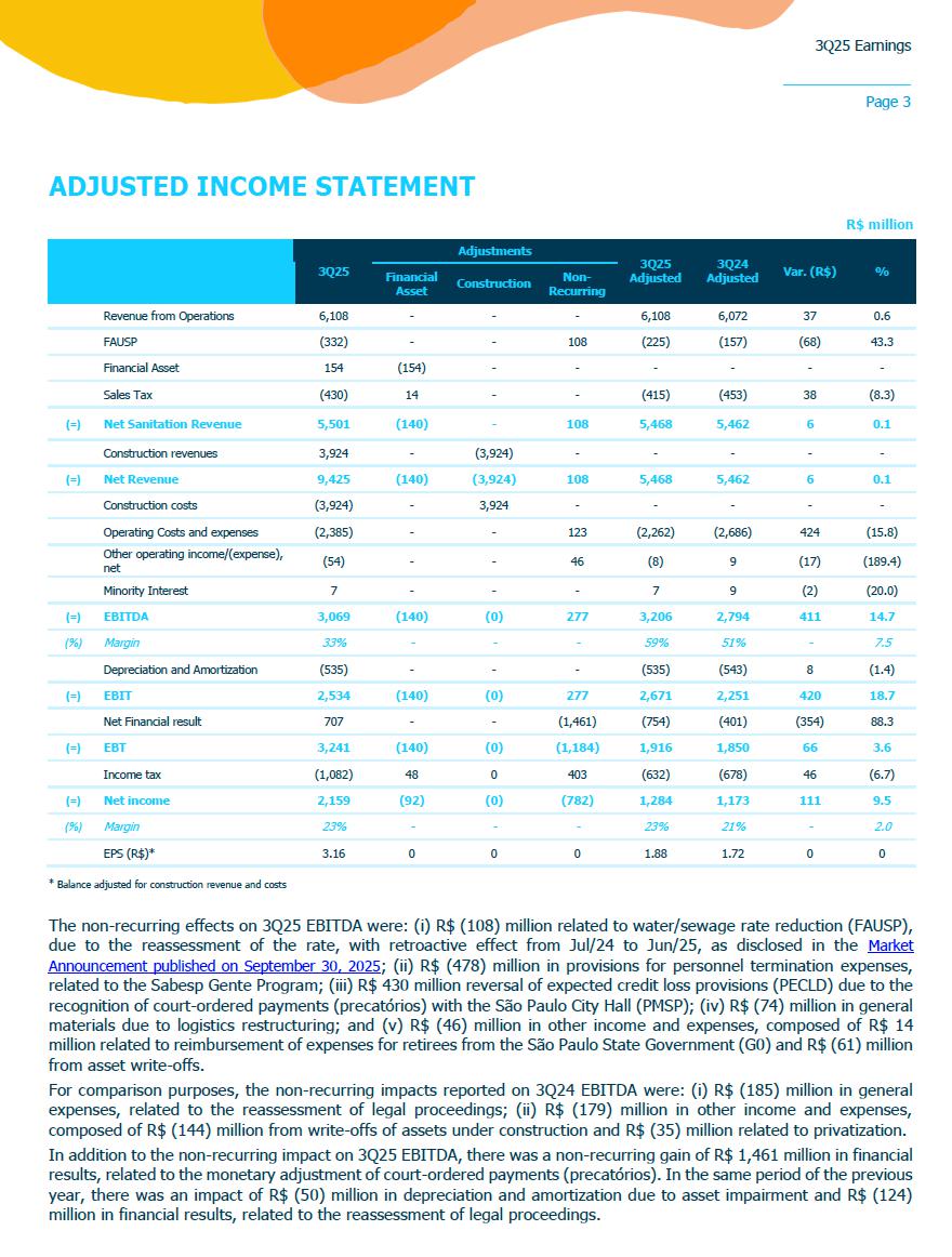ITR - Quarterly Information - 09/30/2025 - CIA SANEAMENTO BASICO EST SAO PAULO Version: 1 Table of Contents Company Information Capital Breakdown 1 Individual Financial Statements Statement of Financial Position - Assets 2 Statement of Financial Position - Liabilities 3 Statement of Profit or Loss 4 Statement of Comprehensive Income 5 Statement of Cash Flows (Indirect Method) 6 Statement of Changes in Equity Statement of Changes in Equity - 01/01/2025 to 09/30/2025 8 Statement of Changes in Equity - 01/01/2024 to 09/30/2024 9 Statement of Value Added 10 Consolidated Financial Statements Statement of Financial Position - Assets 11 Statement of Financial Position - Liabilities 12 Statement of Profit or Loss 13 Statement of Comprehensive Income 14 Statement of Cash Flows (Indirect Method) 15 Statement of Changes in Equity Statement of Changes in Equity - 01/01/2025 to 09/30/2025 17 Statement of Changes in Equity - 01/01/2024 to 09/30/2024 18 Statement of Value Added 19 Comments on the Company’s Performance 20 Notes to the Quarterly Information 28 Reports and Statements Unqualified Report on the Special Review 94 Executive Officer’s Statement on the Financial Statements 95 Executive Officer’s Statement on the Report of Independent Registered Public Accounting Firm 96 ITR - Quarterly Information - 09/30/2025 - CIA SANEAMENTO BASICO EST SAO PAULO Version: 1 Company Information / Capital Breakdown Number of Shares Current Quarter (Units) 09/30/2025 Paid-up Capital Common 683,509,868 Preferred 1 Total 683,509,869 Treasury Shares Common 0 Preferred 0 Total 0 ITR - Quarterly Information - 09/30/2025 - CIA SANEAMENTO BASICO EST SAO PAULO Version: 1 Individual Financial Statements/ Statement of Financial Position – Assets (in thousands of reais) Account Code Account Description Current Quarter 09/30/2025 Previous Year 12/31/2024 1 Total Assets 95,982,957 80,978,272 1.01 Current Assets 17,019,835 10,598,757 1.01.01 Cash and Cash Equivalents 4,966,999 1,681,204 1.01.02 Financial Investments 6,668,814 3,694,029 1.01.03 Accounts Receivable 4,760,763 4,207,466 1.01.03.01 Trade Receivables 4,476,223 3,887,952 1.01.03.02 Other Receivables 284,540 319,514 1.01.03.02.01 Related-Party Balances 284,540 319,514 1.01.04 Inventories 28,536 10,524 1.01.06 Taxes Recoverable 425,741 800,797 1.01.08 Other Current Assets 168,982 204,737 1.01.08.03 Others 168,982 204,737 1.01.08.03.01 Restricted Cash 55,481 37,715 1.01.08.03.02 Derivative financial instruments 0 67,440 1.01.08.03.20 Other Assets 113,501 99,582 1.02 Non-Current Assets 78,963,122 70,379,515 1.02.01 Long-Term Assets 32,054,871 24,927,066 1.02.01.03 Financial Investments Valued at the Amortized Cost 0 769,057 1.02.01.04 Accounts Receivable 256,057 327,798 1.02.01.04.01 Trade Receivables 256,057 327,798 1.02.01.09 Receivables from Related Parties 882,029 908,875 1.02.01.10 Other Non-Current Assets 30,916,785 22,921,336 1.02.01.10.04 Escrow Deposits 130,781 139,222 1.02.01.10.05 Water and Basic Sanitation National Agency - ANA 2,157 1,993 1.02.01.10.06 Contract Assets 11,401,090 4,872,410 1.02.01.10.07 Financial Assets 19,348,193 17,601,626 1.02.01.10.20 Other Assets 34,564 306,085 1.02.02 Investments 413,974 262,433 1.02.02.01 Equity Interests 399,530 215,803 1.02.02.02 Investment properties 14,444 46,630 1.02.03 Property, plant, and equipment 668,987 561,548 1.02.04 Intangible assets 45,825,290 44,628,468 ITR - Quarterly Information - 09/30/2025 - CIA SANEAMENTO BASICO EST SAO PAULO Version: 1 Individual Financial Statements/ Statement of Financial Position - Liabilities (in thousands of reais) Account Code Account Description Current Quarter 09/30/2025 Previous Year 12/31/2024 2 Total Liabilities 95,982,957 80,978,272 2.01 Current Liabilities 14,434,328 11,968,321 2.01.01 Social and Labor obligations 1,120,534 1,286,193 2.01.02 Trade Payables 1,523,474 768,371 2.01.03 Tax Obligations 733,704 589,110 2.01.04 Borrowings and Financings 5,797,790 3,133,850 2.01.05 Other Obligations 3,927,261 4,644,613 2.01.05.02 Others 3,927,261 4,644,613 2.01.05.02.01 Dividends and Interest on Equity Payable 1,532 2,275,890 2.01.05.02.04 Services Payable 2,250,981 1,434,998 2.01.05.02.07 Public-Private Partnership - PPP 465,028 452,323 2.01.05.02.10 Performance Agreements 222,642 287,109 2.01.05.02.11 Deferred PIS/Cofins 74,117 0 2.01.05.02.12 Derivative financial instruments 714,842 0 2.01.05.02.20 Other Obligations 198,119 194,293 2.01.06 Provisions 1,331,565 1,546,184 2.02 Non-current Liabilities 38,838,354 32,081,897 2.02.01 Borrowings and Financings 29,258,757 22,124,447 2.02.02 Other Obligations 6,362,539 6,400,064 2.02.02.02 Others 6,362,539 6,400,064 2.02.02.02.04 Social Security Obligations 1,949,210 1,931,145 2.02.02.02.06 Public-Private Partnership - PPP 2,857,070 2,853,896 2.02.02.02.09 Deferred PIS/Cofins 1,117,146 1,117,804 2.02.02.02.10 Performance Agreements 100,608 137,441 2.02.02.02.20 Other Obligations 338,505 359,778 2.02.03 Deferred taxes 2,737,586 2,661,891 2.02.03.01 Deferred Income Tax and Social Contribution 2,737,586 2,661,891 2.02.04 Provisions 479,472 895,495 2.03 Equity 42,710,275 36,928,054 2.03.01 Paid-Up Capital 18,400,000 15,000,000 2.03.02 Capital Reserves 5,927 0 2.03.04 Profit Reserves 18,247,715 21,647,715 2.03.04.01 Legal Reserve 2,343,583 2,343,583 2.03.04.10 Investment Reserve 15,904,132 19,304,132 2.03.05 Retained Earnings/ Accumulated Losses 5,776,619 0 2.03.06 Equity Valuation Adjustments 280,014 280,339 ITR - Quarterly Information - 09/30/2025 - CIA SANEAMENTO BASICO EST SAO PAULO Version: 1 Individual Financial Statements/ Income Statement (in thousands of reais) Account Code Account Description Current Quarter 07/01/2025 to 09/30/2025 Accrued from the Current Year 01/01/2025 to 09/30/2025 Same Quarter of the Previous Year 07/01/2024 to 09/30/2024 Accrued for the Previous Year 01/01/2024 to 09/30/2024 3.01 Revenue from Sales and/or Services 9,413,305 26,784,086 14,986,700 28,278,265 3.02 Cost of Sales and/or Services -6,42