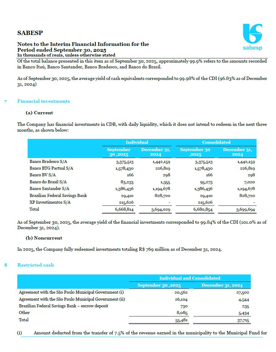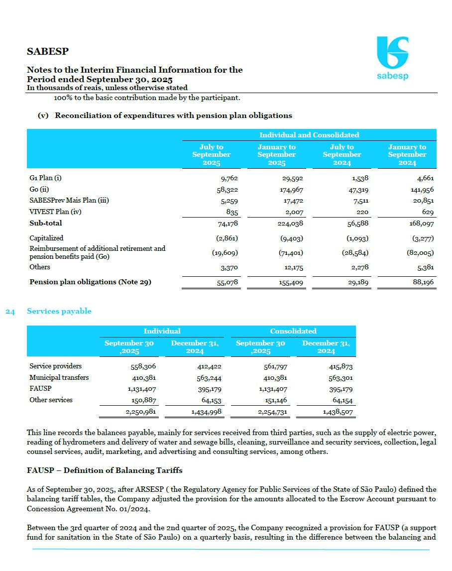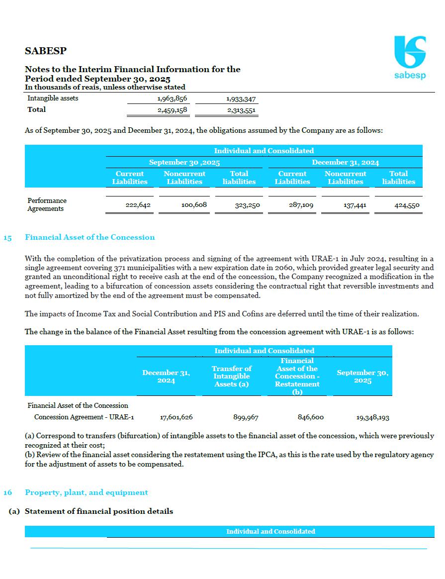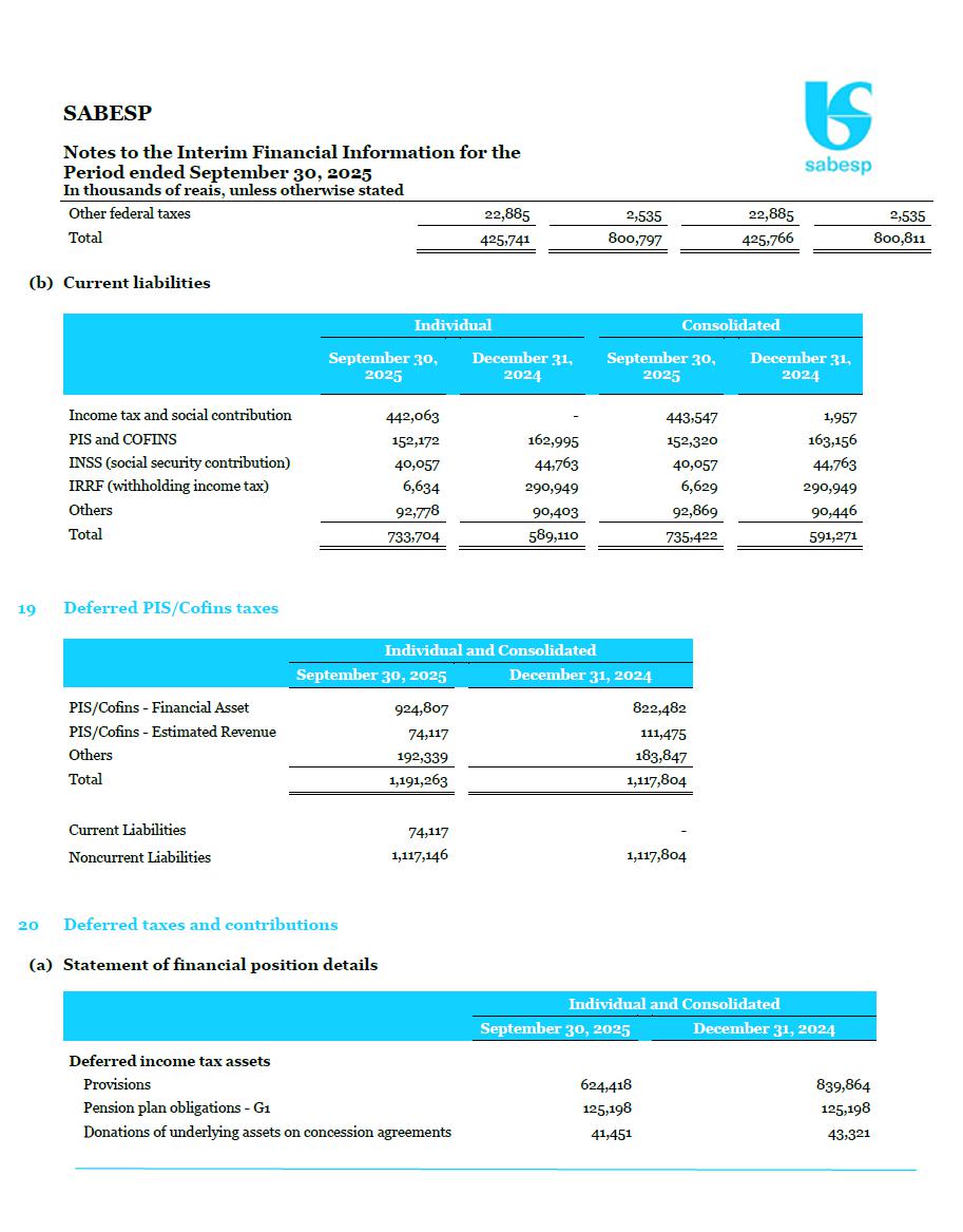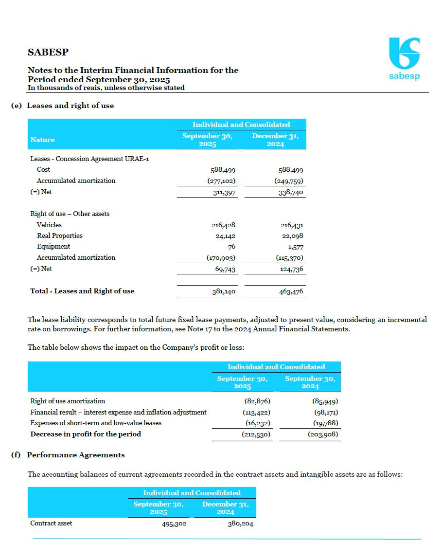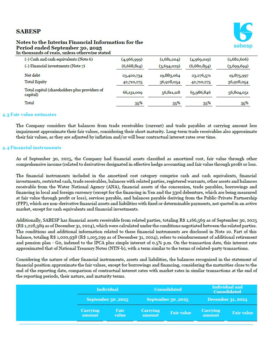 ITR - Quarterly Information - 09/30/2025 - CIA SANEAMENTO BASICO EST SAO PAULO Version: 1 Table of Contents Company Information Capital Breakdown 1 Individual Financial Statements Statement of Financial Position - Assets 2 Statement of Financial Position - Liabilities 3 Statement of Profit or Loss 4 Statement of Comprehensive Income 5 Statement of Cash Flows (Indirect Method) 6 Statement of Changes in Equity Statement of Changes in Equity - 01/01/2025 to 09/30/2025 8 Statement of Changes in Equity - 01/01/2024 to 09/30/2024 9 Statement of Value Added 10 Consolidated Financial Statements Statement of Financial Position - Assets 11 Statement of Financial Position - Liabilities 12 Statement of Profit or Loss 13 Statement of Comprehensive Income 14 Statement of Cash Flows (Indirect Method) 15 Statement of Changes in Equity Statement of Changes in Equity - 01/01/2025 to 09/30/2025 17 Statement of Changes in Equity - 01/01/2024 to 09/30/2024 18 Statement of Value Added 19 Comments on the Company’s Performance 20 Notes to the Quarterly Information 28 Reports and Statements Unqualified Report on the Special Review 94 Executive Officer’s Statement on the Financial Statements 95 Executive Officer’s Statement on the Report of Independent Registered Public Accounting Firm 96 ITR - Quarterly Information - 09/30/2025 - CIA SANEAMENTO BASICO EST SAO PAULO Version: 1 Company Information / Capital Breakdown Number of Shares Current Quarter (Units) 09/30/2025 Paid-up Capital Common 683,509,868 Preferred 1 Total 683,509,869 Treasury Shares Common 0 Preferred 0 Total 0 ITR - Quarterly Information - 09/30/2025 - CIA SANEAMENTO BASICO EST SAO PAULO Version: 1 Individual Financial Statements/ Statement of Financial Position – Assets (in thousands of reais) Account Code Account Description Current Quarter 09/30/2025 Previous Year 12/31/2024 1 Total Assets 95,982,957 80,978,272 1.01 Current Assets 17,019,835 10,598,757 1.01.01 Cash and Cash Equivalents 4,966,999 1,681,204 1.01.02 Financial Investments 6,668,814 3,694,029 1.01.03 Accounts Receivable 4,760,763 4,207,466 1.01.03.01 Trade Receivables 4,476,223 3,887,952 1.01.03.02 Other Receivables 284,540 319,514 1.01.03.02.01 Related-Party Balances 284,540 319,514 1.01.04 Inventories 28,536 10,524 1.01.06 Taxes Recoverable 425,741 800,797 1.01.08 Other Current Assets 168,982 204,737 1.01.08.03 Others 168,982 204,737 1.01.08.03.01 Restricted Cash 55,481 37,715 1.01.08.03.02 Derivative financial instruments 0 67,440 1.01.08.03.20 Other Assets 113,501 99,582 1.02 Non-Current Assets 78,963,122 70,379,515 1.02.01 Long-Term Assets 32,054,871 24,927,066 1.02.01.03 Financial Investments Valued at the Amortized Cost 0 769,057 1.02.01.04 Accounts Receivable 256,057 327,798 1.02.01.04.01 Trade Receivables 256,057 327,798 1.02.01.09 Receivables from Related Parties 882,029 908,875 1.02.01.10 Other Non-Current Assets 30,916,785 22,921,336 1.02.01.10.04 Escrow Deposits 130,781 139,222 1.02.01.10.05 Water and Basic Sanitation National Agency - ANA 2,157 1,993 1.02.01.10.06 Contract Assets 11,401,090 4,872,410 1.02.01.10.07 Financial Assets 19,348,193 17,601,626 1.02.01.10.20 Other Assets 34,564 306,085 1.02.02 Investments 413,974 262,433 1.02.02.01 Equity Interests 399,530 215,803 1.02.02.02 Investment properties 14,444 46,630 1.02.03 Property, plant, and equipment 668,987 561,548 1.02.04 Intangible assets 45,825,290 44,628,468 ITR - Quarterly Information - 09/30/2025 - CIA SANEAMENTO BASICO EST SAO PAULO Version: 1 Individual Financial Statements/ Statement of Financial Position - Liabilities (in thousands of reais) Account Code Account Description Current Quarter 09/30/2025 Previous Year 12/31/2024 2 Total Liabilities 95,982,957 80,978,272 2.01 Current Liabilities 14,434,328 11,968,321 2.01.01 Social and Labor obligations 1,120,534 1,286,193 2.01.02 Trade Payables 1,523,474 768,371 2.01.03 Tax Obligations 733,704 589,110 2.01.04 Borrowings and Financings 5,797,790 3,133,850 2.01.05 Other Obligations 3,927,261 4,644,613 2.01.05.02 Others 3,927,261 4,644,613 2.01.05.02.01 Dividends and Interest on Equity Payable 1,532 2,275,890 2.01.05.02.04 Services Payable 2,250,981 1,434,998 2.01.05.02.07 Public-Private Partnership - PPP 465,028 452,323 2.01.05.02.10 Performance Agreements 222,642 287,109 2.01.05.02.11 Deferred PIS/Cofins 74,117 0 2.01.05.02.12 Derivative financial instruments 714,842 0 2.01.05.02.20 Other Obligations 198,119 194,293 2.01.06 Provisions 1,331,565 1,546,184 2.02 Non-current Liabilities 38,838,354 32,081,897 2.02.01 Borrowings and Financings 29,258,757 22,124,447 2.02.02 Other Obligations 6,362,539 6,400,064 2.02.02.02 Others 6,362,539 6,400,064 2.02.02.02.04 Social Security Obligations 1,949,210 1,931,145 2.02.02.02.06 Public-Private Partnership - PPP 2,857,070 2,853,896 2.02.02.02.09 Deferred PIS/Cofins 1,117,146 1,117,804 2.02.02.02.10 Performance Agreements 100,608 137,441 2.02.02.02.20 Other Obligations 338,505 359,778 2.02.03 Deferred taxes 2,737,586 2,661,891 2.02.03.01 Deferred Income Tax and Social Contribution 2,737,586 2,661,891 2.02.04 Provisions 479,472 895,495 2.03 Equity 42,710,275 36,928,054 2.03.01 Paid-Up Capital 18,400,000 15,000,000 2.03.02 Capital Reserves 5,927 0 2.03.04 Profit Reserves 18,247,715 21,647,715 2.03.04.01 Legal Reserve 2,343,583 2,343,583 2.03.04.10 Investment Reserve 15,904,132 19,304,132 2.03.05 Retained Earnings/ Accumulated Losses 5,776,619 0 2.03.06 Equity Valuation Adjustments 280,014 280,339 ITR - Quarterly Information - 09/30/2025 - CIA SANEAMENTO BASICO EST SAO PAULO Version: 1 Individual Financial Statements/ Income Statement (in thousands of reais) Account Code Account Description Current Quarter 07/01/2025 to 09/30/2025 Accrued from the Current Year 01/01/2025 to 09/30/2025 Same Quarter of the Previous Year 07/01/2024 to 09/30/2024 Accrued for the Previous Year 01/01/2024 to 09/30/2024 3.01 Revenue from Sales and/or Services 9,413,305 26,784,086 14,986,700 28,278,265 3.02 Cost of Sales and/or Services -6,42