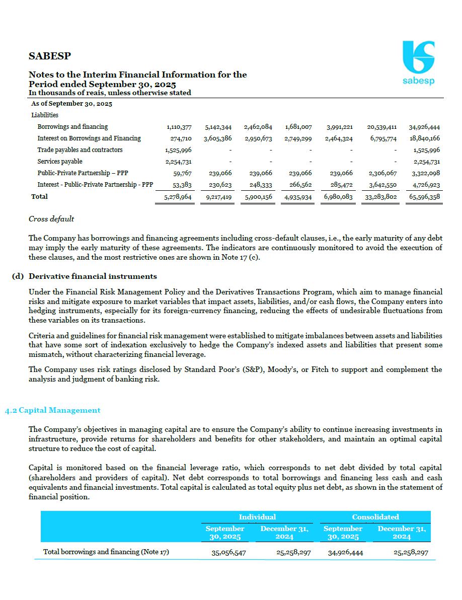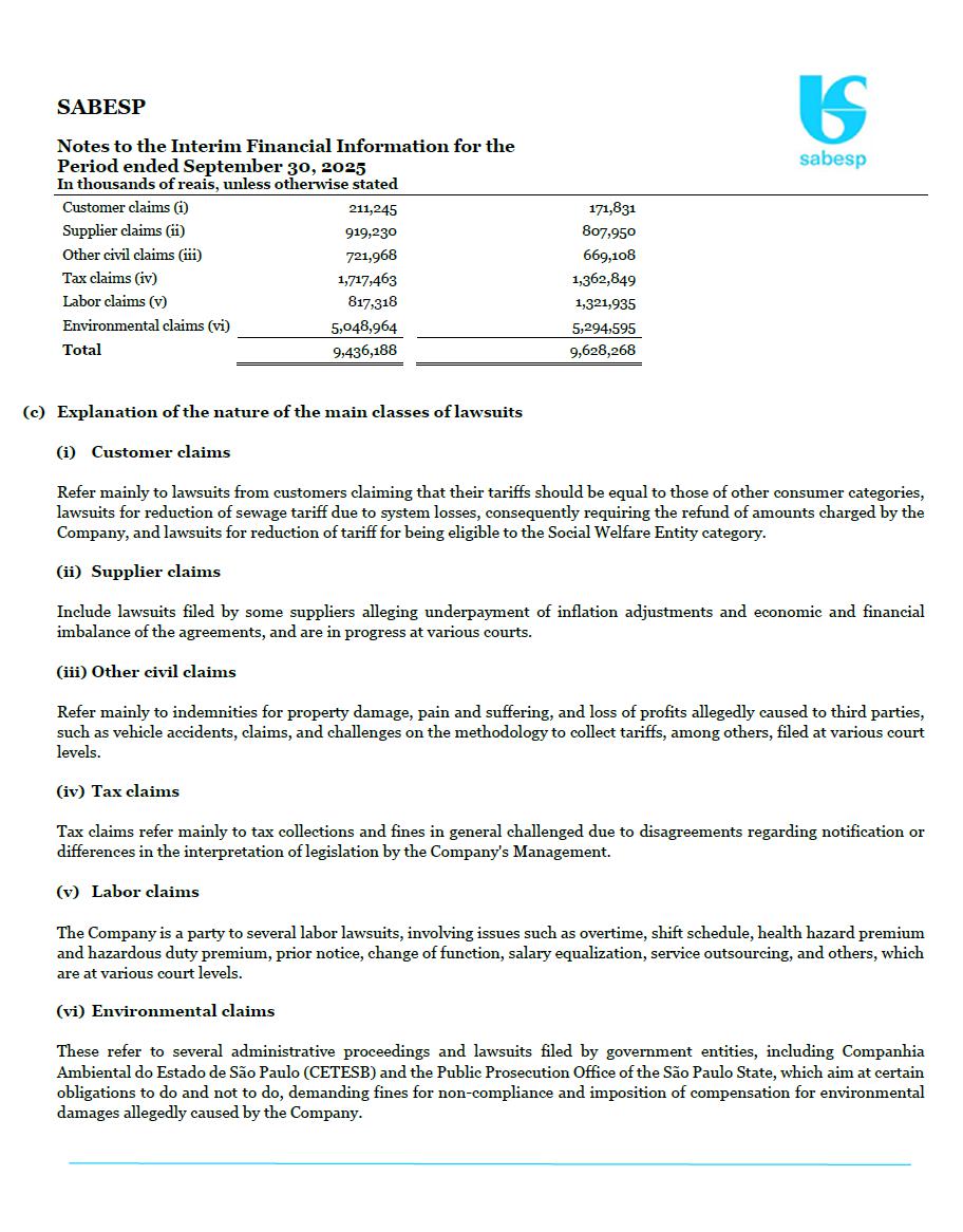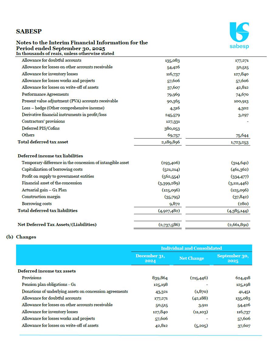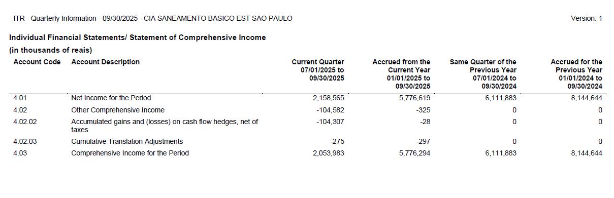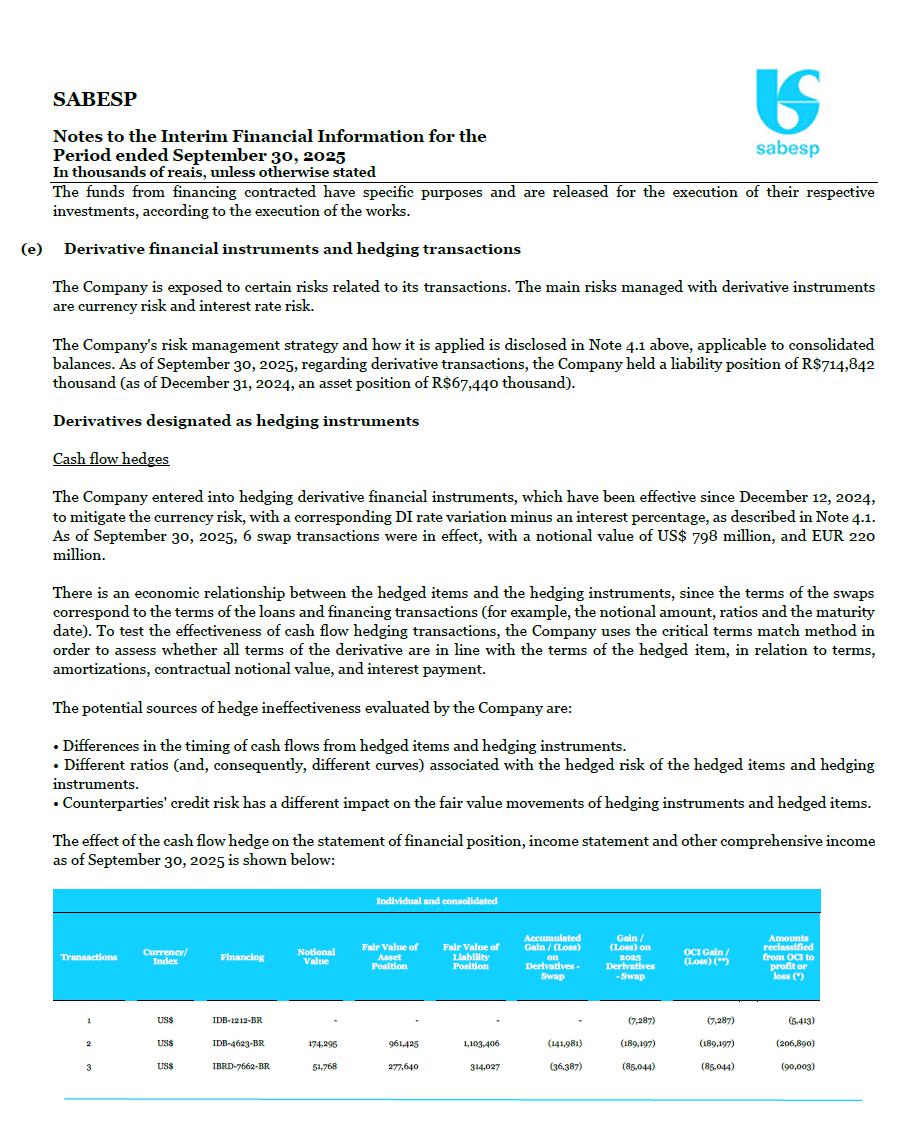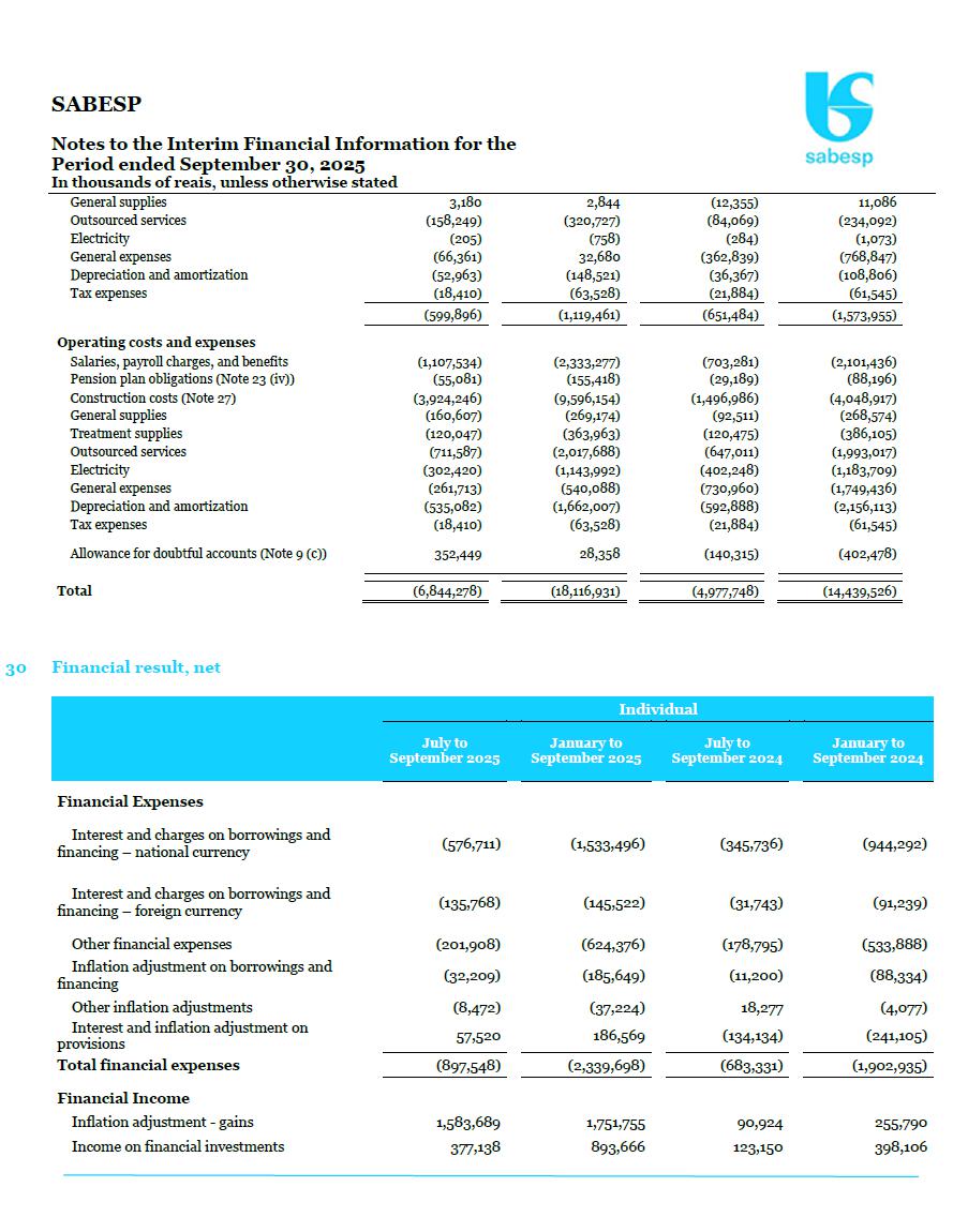 ITR - Quarterly Information - 09/30/2025 - CIA SANEAMENTO BASICO EST SAO PAULO Version: 1 Table of Contents Company Information Capital Breakdown 1 Individual Financial Statements Statement of Financial Position - Assets 2 Statement of Financial Position - Liabilities 3 Statement of Profit or Loss 4 Statement of Comprehensive Income 5 Statement of Cash Flows (Indirect Method) 6 Statement of Changes in Equity Statement of Changes in Equity - 01/01/2025 to 09/30/2025 8 Statement of Changes in Equity - 01/01/2024 to 09/30/2024 9 Statement of Value Added 10 Consolidated Financial Statements Statement of Financial Position - Assets 11 Statement of Financial Position - Liabilities 12 Statement of Profit or Loss 13 Statement of Comprehensive Income 14 Statement of Cash Flows (Indirect Method) 15 Statement of Changes in Equity Statement of Changes in Equity - 01/01/2025 to 09/30/2025 17 Statement of Changes in Equity - 01/01/2024 to 09/30/2024 18 Statement of Value Added 19 Comments on the Company’s Performance 20 Notes to the Quarterly Information 28 Reports and Statements Unqualified Report on the Special Review 94 Executive Officer’s Statement on the Financial Statements 95 Executive Officer’s Statement on the Report of Independent Registered Public Accounting Firm 96 ITR - Quarterly Information - 09/30/2025 - CIA SANEAMENTO BASICO EST SAO PAULO Version: 1 Company Information / Capital Breakdown Number of Shares Current Quarter (Units) 09/30/2025 Paid-up Capital Common 683,509,868 Preferred 1 Total 683,509,869 Treasury Shares Common 0 Preferred 0 Total 0 ITR - Quarterly Information - 09/30/2025 - CIA SANEAMENTO BASICO EST SAO PAULO Version: 1 Individual Financial Statements/ Statement of Financial Position – Assets (in thousands of reais) Account Code Account Description Current Quarter 09/30/2025 Previous Year 12/31/2024 1 Total Assets 95,982,957 80,978,272 1.01 Current Assets 17,019,835 10,598,757 1.01.01 Cash and Cash Equivalents 4,966,999 1,681,204 1.01.02 Financial Investments 6,668,814 3,694,029 1.01.03 Accounts Receivable 4,760,763 4,207,466 1.01.03.01 Trade Receivables 4,476,223 3,887,952 1.01.03.02 Other Receivables 284,540 319,514 1.01.03.02.01 Related-Party Balances 284,540 319,514 1.01.04 Inventories 28,536 10,524 1.01.06 Taxes Recoverable 425,741 800,797 1.01.08 Other Current Assets 168,982 204,737 1.01.08.03 Others 168,982 204,737 1.01.08.03.01 Restricted Cash 55,481 37,715 1.01.08.03.02 Derivative financial instruments 0 67,440 1.01.08.03.20 Other Assets 113,501 99,582 1.02 Non-Current Assets 78,963,122 70,379,515 1.02.01 Long-Term Assets 32,054,871 24,927,066 1.02.01.03 Financial Investments Valued at the Amortized Cost 0 769,057 1.02.01.04 Accounts Receivable 256,057 327,798 1.02.01.04.01 Trade Receivables 256,057 327,798 1.02.01.09 Receivables from Related Parties 882,029 908,875 1.02.01.10 Other Non-Current Assets 30,916,785 22,921,336 1.02.01.10.04 Escrow Deposits 130,781 139,222 1.02.01.10.05 Water and Basic Sanitation National Agency - ANA 2,157 1,993 1.02.01.10.06 Contract Assets 11,401,090 4,872,410 1.02.01.10.07 Financial Assets 19,348,193 17,601,626 1.02.01.10.20 Other Assets 34,564 306,085 1.02.02 Investments 413,974 262,433 1.02.02.01 Equity Interests 399,530 215,803 1.02.02.02 Investment properties 14,444 46,630 1.02.03 Property, plant, and equipment 668,987 561,548 1.02.04 Intangible assets 45,825,290 44,628,468 ITR - Quarterly Information - 09/30/2025 - CIA SANEAMENTO BASICO EST SAO PAULO Version: 1 Individual Financial Statements/ Statement of Financial Position - Liabilities (in thousands of reais) Account Code Account Description Current Quarter 09/30/2025 Previous Year 12/31/2024 2 Total Liabilities 95,982,957 80,978,272 2.01 Current Liabilities 14,434,328 11,968,321 2.01.01 Social and Labor obligations 1,120,534 1,286,193 2.01.02 Trade Payables 1,523,474 768,371 2.01.03 Tax Obligations 733,704 589,110 2.01.04 Borrowings and Financings 5,797,790 3,133,850 2.01.05 Other Obligations 3,927,261 4,644,613 2.01.05.02 Others 3,927,261 4,644,613 2.01.05.02.01 Dividends and Interest on Equity Payable 1,532 2,275,890 2.01.05.02.04 Services Payable 2,250,981 1,434,998 2.01.05.02.07 Public-Private Partnership - PPP 465,028 452,323 2.01.05.02.10 Performance Agreements 222,642 287,109 2.01.05.02.11 Deferred PIS/Cofins 74,117 0 2.01.05.02.12 Derivative financial instruments 714,842 0 2.01.05.02.20 Other Obligations 198,119 194,293 2.01.06 Provisions 1,331,565 1,546,184 2.02 Non-current Liabilities 38,838,354 32,081,897 2.02.01 Borrowings and Financings 29,258,757 22,124,447 2.02.02 Other Obligations 6,362,539 6,400,064 2.02.02.02 Others 6,362,539 6,400,064 2.02.02.02.04 Social Security Obligations 1,949,210 1,931,145 2.02.02.02.06 Public-Private Partnership - PPP 2,857,070 2,853,896 2.02.02.02.09 Deferred PIS/Cofins 1,117,146 1,117,804 2.02.02.02.10 Performance Agreements 100,608 137,441 2.02.02.02.20 Other Obligations 338,505 359,778 2.02.03 Deferred taxes 2,737,586 2,661,891 2.02.03.01 Deferred Income Tax and Social Contribution 2,737,586 2,661,891 2.02.04 Provisions 479,472 895,495 2.03 Equity 42,710,275 36,928,054 2.03.01 Paid-Up Capital 18,400,000 15,000,000 2.03.02 Capital Reserves 5,927 0 2.03.04 Profit Reserves 18,247,715 21,647,715 2.03.04.01 Legal Reserve 2,343,583 2,343,583 2.03.04.10 Investment Reserve 15,904,132 19,304,132 2.03.05 Retained Earnings/ Accumulated Losses 5,776,619 0 2.03.06 Equity Valuation Adjustments 280,014 280,339 ITR - Quarterly Information - 09/30/2025 - CIA SANEAMENTO BASICO EST SAO PAULO Version: 1 Individual Financial Statements/ Income Statement (in thousands of reais) Account Code Account Description Current Quarter 07/01/2025 to 09/30/2025 Accrued from the Current Year 01/01/2025 to 09/30/2025 Same Quarter of the Previous Year 07/01/2024 to 09/30/2024 Accrued for the Previous Year 01/01/2024 to 09/30/2024 3.01 Revenue from Sales and/or Services 9,413,305 26,784,086 14,986,700 28,278,265 3.02 Cost of Sales and/or Services -6,42