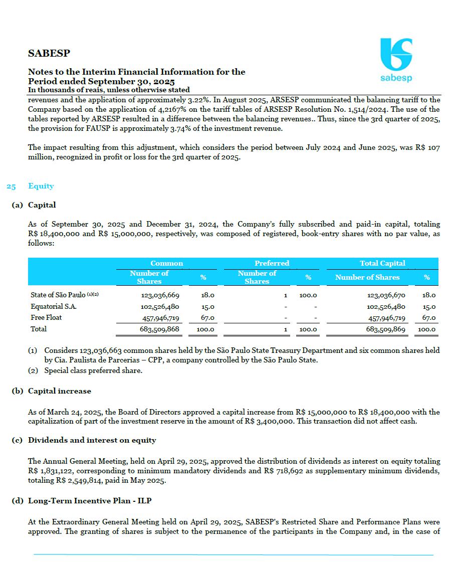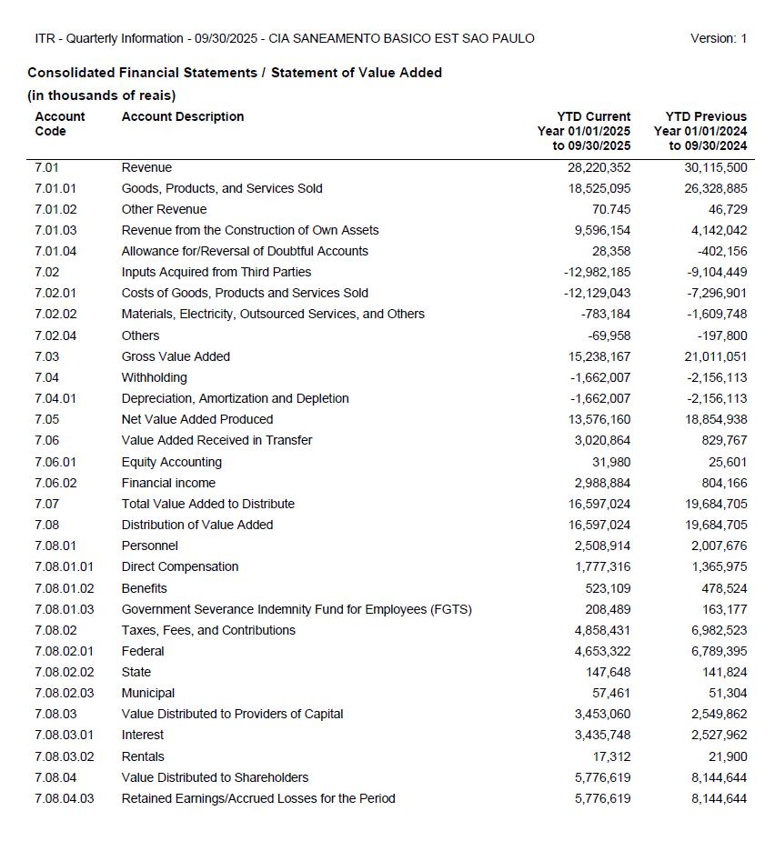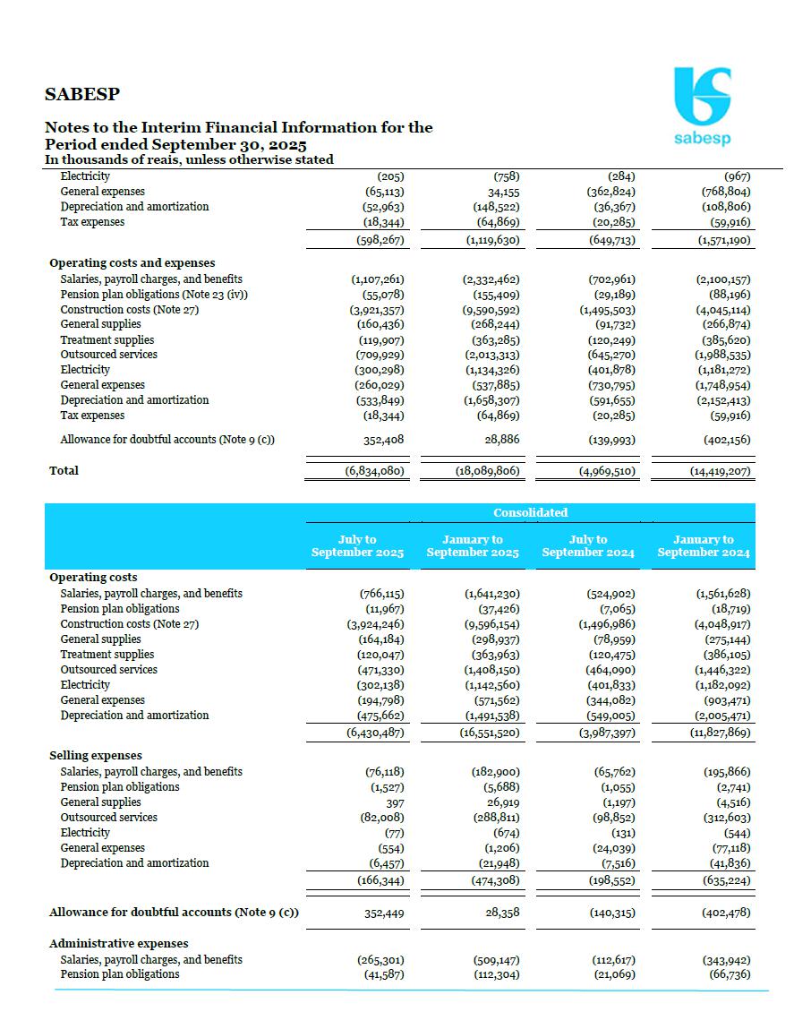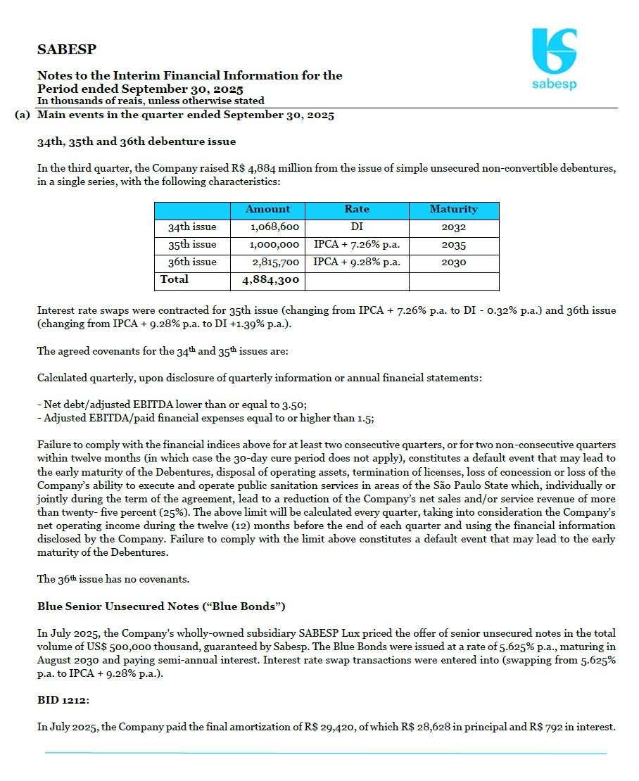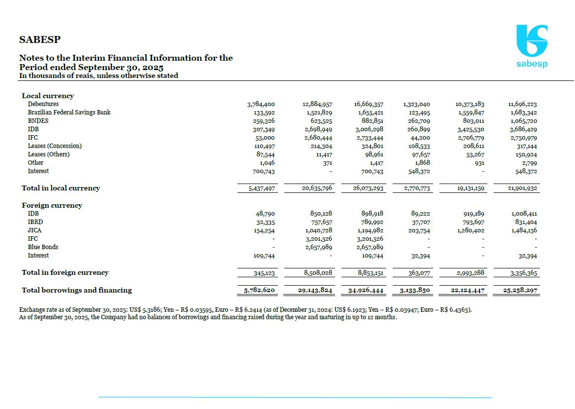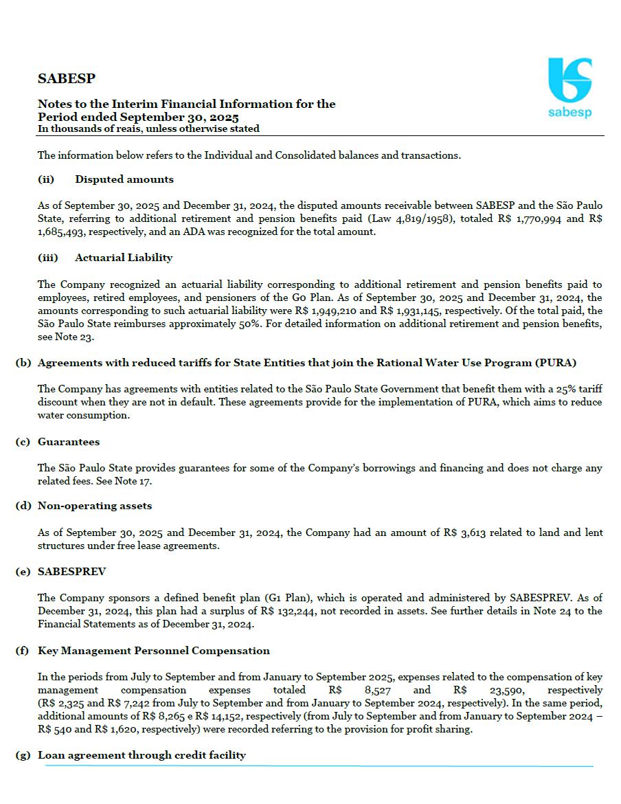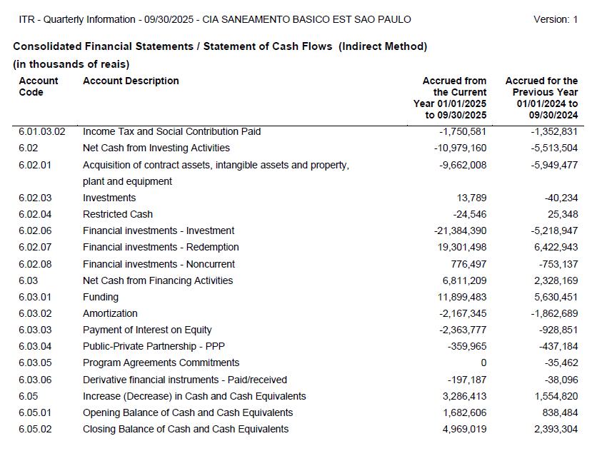 ITR - Quarterly Information - 09/30/2025 - CIA SANEAMENTO BASICO EST SAO PAULO Version: 1 Table of Contents Company Information Capital Breakdown 1 Individual Financial Statements Statement of Financial Position - Assets 2 Statement of Financial Position - Liabilities 3 Statement of Profit or Loss 4 Statement of Comprehensive Income 5 Statement of Cash Flows (Indirect Method) 6 Statement of Changes in Equity Statement of Changes in Equity - 01/01/2025 to 09/30/2025 8 Statement of Changes in Equity - 01/01/2024 to 09/30/2024 9 Statement of Value Added 10 Consolidated Financial Statements Statement of Financial Position - Assets 11 Statement of Financial Position - Liabilities 12 Statement of Profit or Loss 13 Statement of Comprehensive Income 14 Statement of Cash Flows (Indirect Method) 15 Statement of Changes in Equity Statement of Changes in Equity - 01/01/2025 to 09/30/2025 17 Statement of Changes in Equity - 01/01/2024 to 09/30/2024 18 Statement of Value Added 19 Comments on the Company’s Performance 20 Notes to the Quarterly Information 28 Reports and Statements Unqualified Report on the Special Review 94 Executive Officer’s Statement on the Financial Statements 95 Executive Officer’s Statement on the Report of Independent Registered Public Accounting Firm 96 ITR - Quarterly Information - 09/30/2025 - CIA SANEAMENTO BASICO EST SAO PAULO Version: 1 Company Information / Capital Breakdown Number of Shares Current Quarter (Units) 09/30/2025 Paid-up Capital Common 683,509,868 Preferred 1 Total 683,509,869 Treasury Shares Common 0 Preferred 0 Total 0 ITR - Quarterly Information - 09/30/2025 - CIA SANEAMENTO BASICO EST SAO PAULO Version: 1 Individual Financial Statements/ Statement of Financial Position – Assets (in thousands of reais) Account Code Account Description Current Quarter 09/30/2025 Previous Year 12/31/2024 1 Total Assets 95,982,957 80,978,272 1.01 Current Assets 17,019,835 10,598,757 1.01.01 Cash and Cash Equivalents 4,966,999 1,681,204 1.01.02 Financial Investments 6,668,814 3,694,029 1.01.03 Accounts Receivable 4,760,763 4,207,466 1.01.03.01 Trade Receivables 4,476,223 3,887,952 1.01.03.02 Other Receivables 284,540 319,514 1.01.03.02.01 Related-Party Balances 284,540 319,514 1.01.04 Inventories 28,536 10,524 1.01.06 Taxes Recoverable 425,741 800,797 1.01.08 Other Current Assets 168,982 204,737 1.01.08.03 Others 168,982 204,737 1.01.08.03.01 Restricted Cash 55,481 37,715 1.01.08.03.02 Derivative financial instruments 0 67,440 1.01.08.03.20 Other Assets 113,501 99,582 1.02 Non-Current Assets 78,963,122 70,379,515 1.02.01 Long-Term Assets 32,054,871 24,927,066 1.02.01.03 Financial Investments Valued at the Amortized Cost 0 769,057 1.02.01.04 Accounts Receivable 256,057 327,798 1.02.01.04.01 Trade Receivables 256,057 327,798 1.02.01.09 Receivables from Related Parties 882,029 908,875 1.02.01.10 Other Non-Current Assets 30,916,785 22,921,336 1.02.01.10.04 Escrow Deposits 130,781 139,222 1.02.01.10.05 Water and Basic Sanitation National Agency - ANA 2,157 1,993 1.02.01.10.06 Contract Assets 11,401,090 4,872,410 1.02.01.10.07 Financial Assets 19,348,193 17,601,626 1.02.01.10.20 Other Assets 34,564 306,085 1.02.02 Investments 413,974 262,433 1.02.02.01 Equity Interests 399,530 215,803 1.02.02.02 Investment properties 14,444 46,630 1.02.03 Property, plant, and equipment 668,987 561,548 1.02.04 Intangible assets 45,825,290 44,628,468 ITR - Quarterly Information - 09/30/2025 - CIA SANEAMENTO BASICO EST SAO PAULO Version: 1 Individual Financial Statements/ Statement of Financial Position - Liabilities (in thousands of reais) Account Code Account Description Current Quarter 09/30/2025 Previous Year 12/31/2024 2 Total Liabilities 95,982,957 80,978,272 2.01 Current Liabilities 14,434,328 11,968,321 2.01.01 Social and Labor obligations 1,120,534 1,286,193 2.01.02 Trade Payables 1,523,474 768,371 2.01.03 Tax Obligations 733,704 589,110 2.01.04 Borrowings and Financings 5,797,790 3,133,850 2.01.05 Other Obligations 3,927,261 4,644,613 2.01.05.02 Others 3,927,261 4,644,613 2.01.05.02.01 Dividends and Interest on Equity Payable 1,532 2,275,890 2.01.05.02.04 Services Payable 2,250,981 1,434,998 2.01.05.02.07 Public-Private Partnership - PPP 465,028 452,323 2.01.05.02.10 Performance Agreements 222,642 287,109 2.01.05.02.11 Deferred PIS/Cofins 74,117 0 2.01.05.02.12 Derivative financial instruments 714,842 0 2.01.05.02.20 Other Obligations 198,119 194,293 2.01.06 Provisions 1,331,565 1,546,184 2.02 Non-current Liabilities 38,838,354 32,081,897 2.02.01 Borrowings and Financings 29,258,757 22,124,447 2.02.02 Other Obligations 6,362,539 6,400,064 2.02.02.02 Others 6,362,539 6,400,064 2.02.02.02.04 Social Security Obligations 1,949,210 1,931,145 2.02.02.02.06 Public-Private Partnership - PPP 2,857,070 2,853,896 2.02.02.02.09 Deferred PIS/Cofins 1,117,146 1,117,804 2.02.02.02.10 Performance Agreements 100,608 137,441 2.02.02.02.20 Other Obligations 338,505 359,778 2.02.03 Deferred taxes 2,737,586 2,661,891 2.02.03.01 Deferred Income Tax and Social Contribution 2,737,586 2,661,891 2.02.04 Provisions 479,472 895,495 2.03 Equity 42,710,275 36,928,054 2.03.01 Paid-Up Capital 18,400,000 15,000,000 2.03.02 Capital Reserves 5,927 0 2.03.04 Profit Reserves 18,247,715 21,647,715 2.03.04.01 Legal Reserve 2,343,583 2,343,583 2.03.04.10 Investment Reserve 15,904,132 19,304,132 2.03.05 Retained Earnings/ Accumulated Losses 5,776,619 0 2.03.06 Equity Valuation Adjustments 280,014 280,339 ITR - Quarterly Information - 09/30/2025 - CIA SANEAMENTO BASICO EST SAO PAULO Version: 1 Individual Financial Statements/ Income Statement (in thousands of reais) Account Code Account Description Current Quarter 07/01/2025 to 09/30/2025 Accrued from the Current Year 01/01/2025 to 09/30/2025 Same Quarter of the Previous Year 07/01/2024 to 09/30/2024 Accrued for the Previous Year 01/01/2024 to 09/30/2024 3.01 Revenue from Sales and/or Services 9,413,305 26,784,086 14,986,700 28,278,265 3.02 Cost of Sales and/or Services -6,42