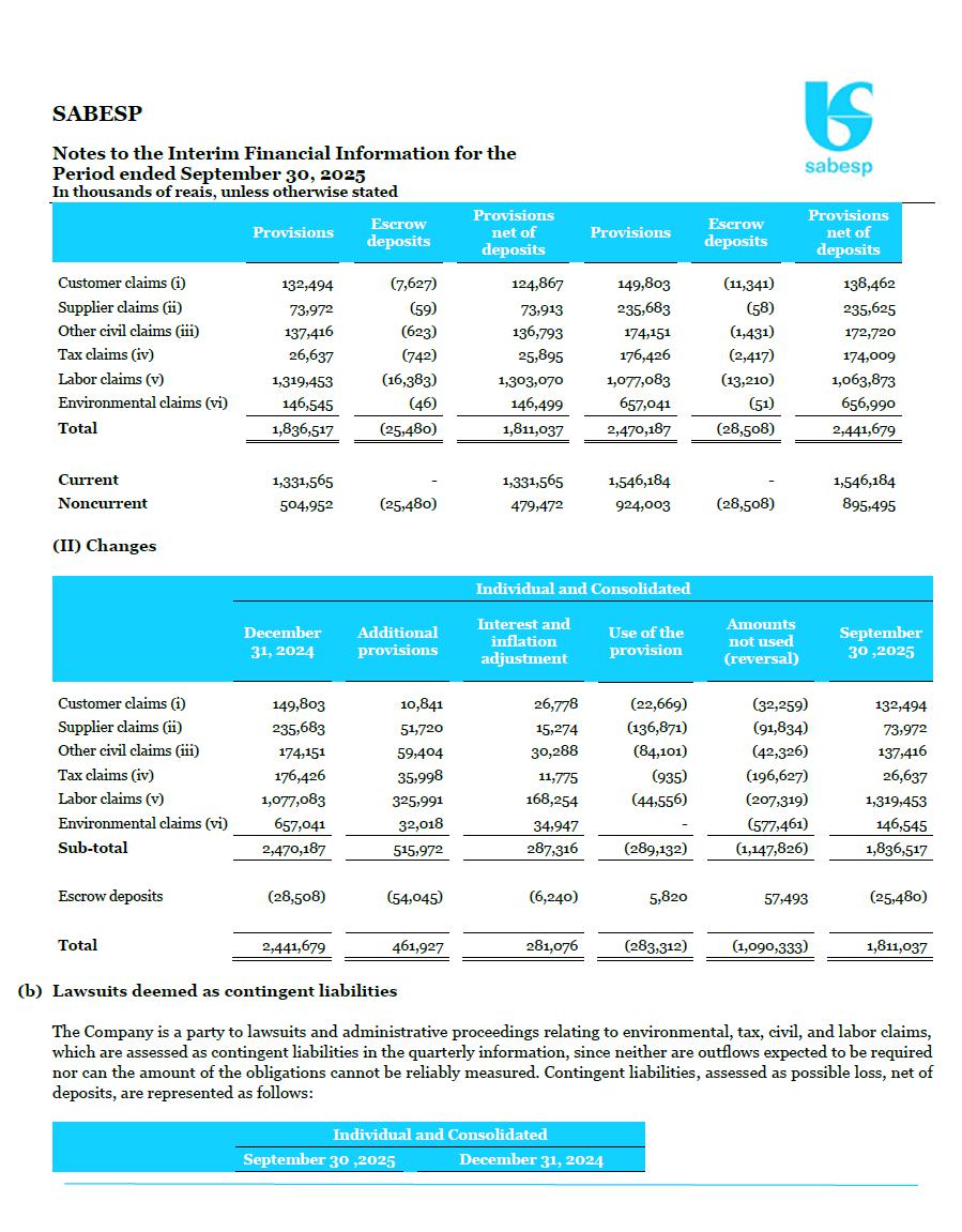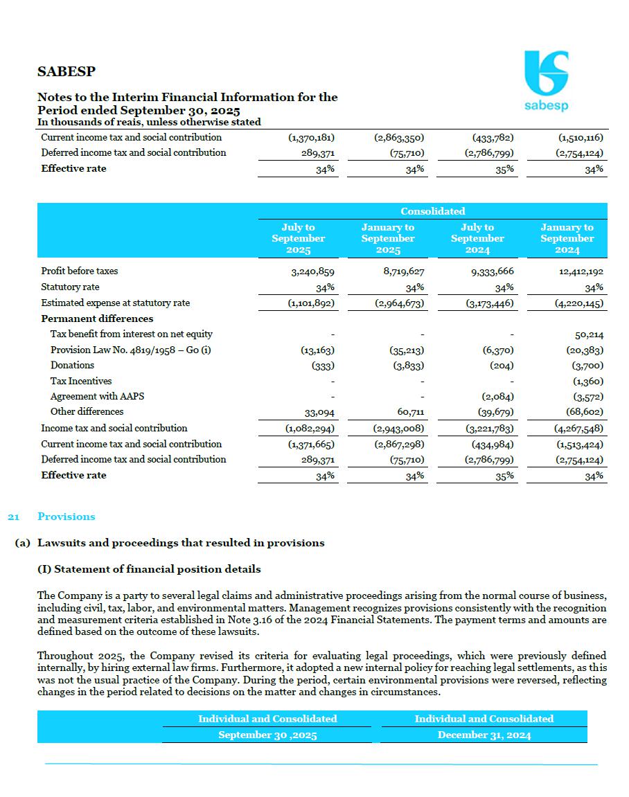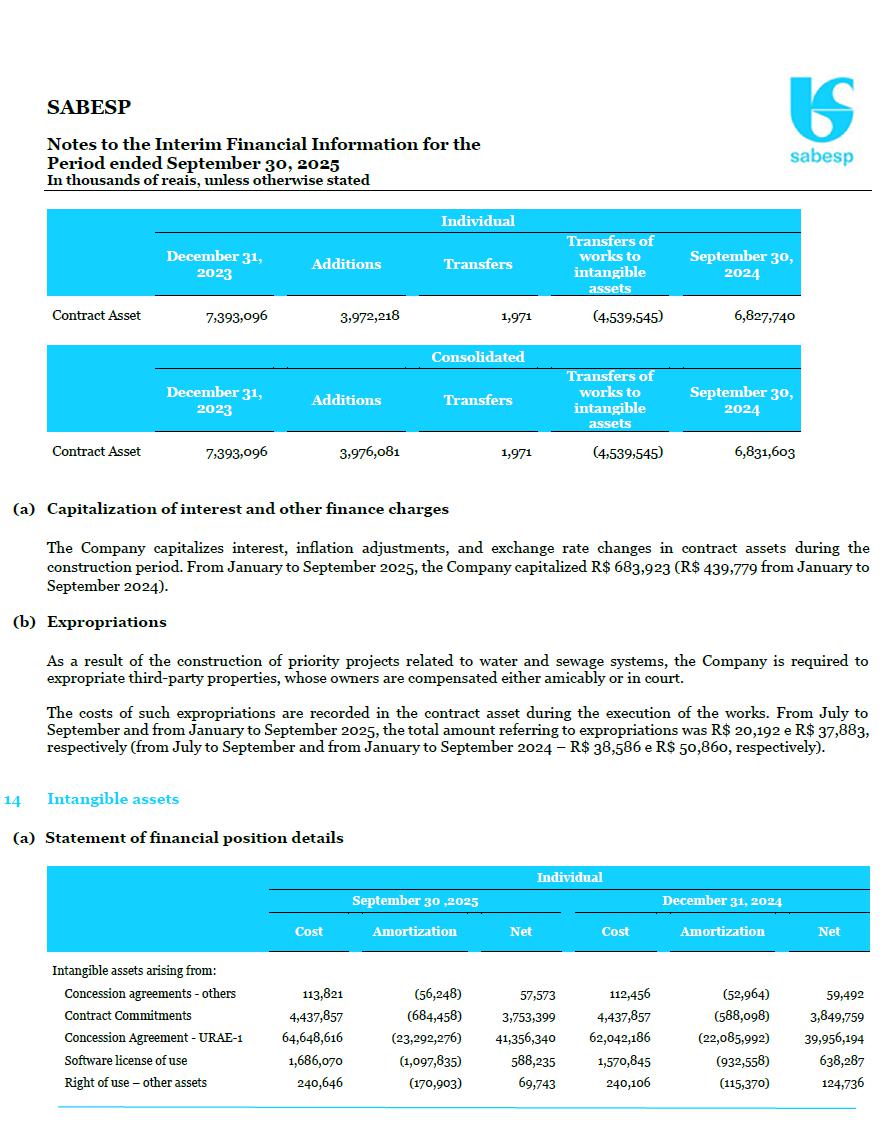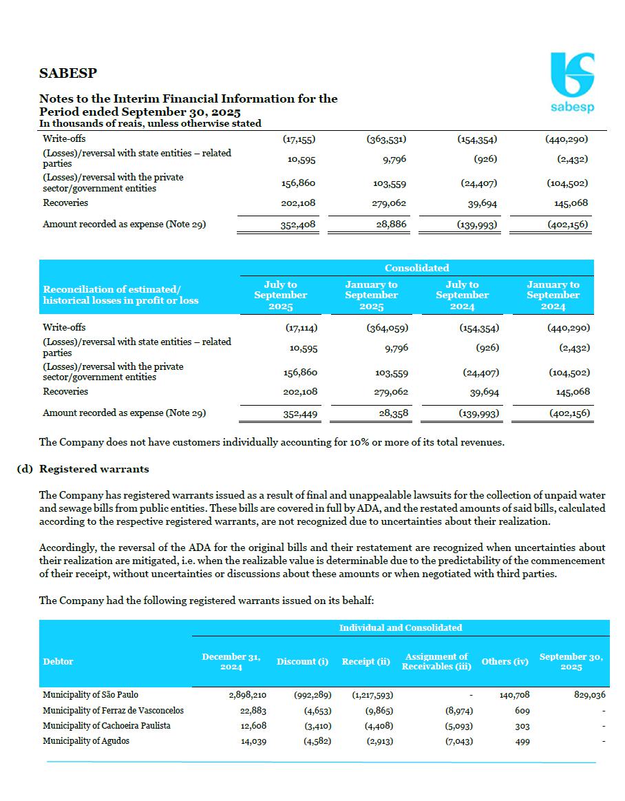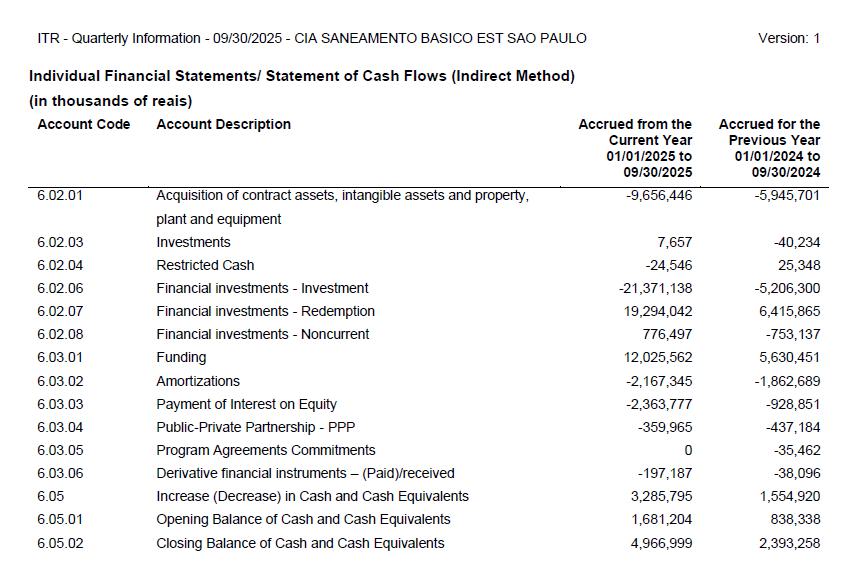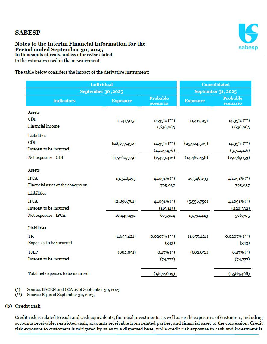 ITR - Quarterly Information - 09/30/2025 - CIA SANEAMENTO BASICO EST SAO PAULO Version: 1 Table of Contents Company Information Capital Breakdown 1 Individual Financial Statements Statement of Financial Position - Assets 2 Statement of Financial Position - Liabilities 3 Statement of Profit or Loss 4 Statement of Comprehensive Income 5 Statement of Cash Flows (Indirect Method) 6 Statement of Changes in Equity Statement of Changes in Equity - 01/01/2025 to 09/30/2025 8 Statement of Changes in Equity - 01/01/2024 to 09/30/2024 9 Statement of Value Added 10 Consolidated Financial Statements Statement of Financial Position - Assets 11 Statement of Financial Position - Liabilities 12 Statement of Profit or Loss 13 Statement of Comprehensive Income 14 Statement of Cash Flows (Indirect Method) 15 Statement of Changes in Equity Statement of Changes in Equity - 01/01/2025 to 09/30/2025 17 Statement of Changes in Equity - 01/01/2024 to 09/30/2024 18 Statement of Value Added 19 Comments on the Company’s Performance 20 Notes to the Quarterly Information 28 Reports and Statements Unqualified Report on the Special Review 94 Executive Officer’s Statement on the Financial Statements 95 Executive Officer’s Statement on the Report of Independent Registered Public Accounting Firm 96 ITR - Quarterly Information - 09/30/2025 - CIA SANEAMENTO BASICO EST SAO PAULO Version: 1 Company Information / Capital Breakdown Number of Shares Current Quarter (Units) 09/30/2025 Paid-up Capital Common 683,509,868 Preferred 1 Total 683,509,869 Treasury Shares Common 0 Preferred 0 Total 0 ITR - Quarterly Information - 09/30/2025 - CIA SANEAMENTO BASICO EST SAO PAULO Version: 1 Individual Financial Statements/ Statement of Financial Position – Assets (in thousands of reais) Account Code Account Description Current Quarter 09/30/2025 Previous Year 12/31/2024 1 Total Assets 95,982,957 80,978,272 1.01 Current Assets 17,019,835 10,598,757 1.01.01 Cash and Cash Equivalents 4,966,999 1,681,204 1.01.02 Financial Investments 6,668,814 3,694,029 1.01.03 Accounts Receivable 4,760,763 4,207,466 1.01.03.01 Trade Receivables 4,476,223 3,887,952 1.01.03.02 Other Receivables 284,540 319,514 1.01.03.02.01 Related-Party Balances 284,540 319,514 1.01.04 Inventories 28,536 10,524 1.01.06 Taxes Recoverable 425,741 800,797 1.01.08 Other Current Assets 168,982 204,737 1.01.08.03 Others 168,982 204,737 1.01.08.03.01 Restricted Cash 55,481 37,715 1.01.08.03.02 Derivative financial instruments 0 67,440 1.01.08.03.20 Other Assets 113,501 99,582 1.02 Non-Current Assets 78,963,122 70,379,515 1.02.01 Long-Term Assets 32,054,871 24,927,066 1.02.01.03 Financial Investments Valued at the Amortized Cost 0 769,057 1.02.01.04 Accounts Receivable 256,057 327,798 1.02.01.04.01 Trade Receivables 256,057 327,798 1.02.01.09 Receivables from Related Parties 882,029 908,875 1.02.01.10 Other Non-Current Assets 30,916,785 22,921,336 1.02.01.10.04 Escrow Deposits 130,781 139,222 1.02.01.10.05 Water and Basic Sanitation National Agency - ANA 2,157 1,993 1.02.01.10.06 Contract Assets 11,401,090 4,872,410 1.02.01.10.07 Financial Assets 19,348,193 17,601,626 1.02.01.10.20 Other Assets 34,564 306,085 1.02.02 Investments 413,974 262,433 1.02.02.01 Equity Interests 399,530 215,803 1.02.02.02 Investment properties 14,444 46,630 1.02.03 Property, plant, and equipment 668,987 561,548 1.02.04 Intangible assets 45,825,290 44,628,468 ITR - Quarterly Information - 09/30/2025 - CIA SANEAMENTO BASICO EST SAO PAULO Version: 1 Individual Financial Statements/ Statement of Financial Position - Liabilities (in thousands of reais) Account Code Account Description Current Quarter 09/30/2025 Previous Year 12/31/2024 2 Total Liabilities 95,982,957 80,978,272 2.01 Current Liabilities 14,434,328 11,968,321 2.01.01 Social and Labor obligations 1,120,534 1,286,193 2.01.02 Trade Payables 1,523,474 768,371 2.01.03 Tax Obligations 733,704 589,110 2.01.04 Borrowings and Financings 5,797,790 3,133,850 2.01.05 Other Obligations 3,927,261 4,644,613 2.01.05.02 Others 3,927,261 4,644,613 2.01.05.02.01 Dividends and Interest on Equity Payable 1,532 2,275,890 2.01.05.02.04 Services Payable 2,250,981 1,434,998 2.01.05.02.07 Public-Private Partnership - PPP 465,028 452,323 2.01.05.02.10 Performance Agreements 222,642 287,109 2.01.05.02.11 Deferred PIS/Cofins 74,117 0 2.01.05.02.12 Derivative financial instruments 714,842 0 2.01.05.02.20 Other Obligations 198,119 194,293 2.01.06 Provisions 1,331,565 1,546,184 2.02 Non-current Liabilities 38,838,354 32,081,897 2.02.01 Borrowings and Financings 29,258,757 22,124,447 2.02.02 Other Obligations 6,362,539 6,400,064 2.02.02.02 Others 6,362,539 6,400,064 2.02.02.02.04 Social Security Obligations 1,949,210 1,931,145 2.02.02.02.06 Public-Private Partnership - PPP 2,857,070 2,853,896 2.02.02.02.09 Deferred PIS/Cofins 1,117,146 1,117,804 2.02.02.02.10 Performance Agreements 100,608 137,441 2.02.02.02.20 Other Obligations 338,505 359,778 2.02.03 Deferred taxes 2,737,586 2,661,891 2.02.03.01 Deferred Income Tax and Social Contribution 2,737,586 2,661,891 2.02.04 Provisions 479,472 895,495 2.03 Equity 42,710,275 36,928,054 2.03.01 Paid-Up Capital 18,400,000 15,000,000 2.03.02 Capital Reserves 5,927 0 2.03.04 Profit Reserves 18,247,715 21,647,715 2.03.04.01 Legal Reserve 2,343,583 2,343,583 2.03.04.10 Investment Reserve 15,904,132 19,304,132 2.03.05 Retained Earnings/ Accumulated Losses 5,776,619 0 2.03.06 Equity Valuation Adjustments 280,014 280,339 ITR - Quarterly Information - 09/30/2025 - CIA SANEAMENTO BASICO EST SAO PAULO Version: 1 Individual Financial Statements/ Income Statement (in thousands of reais) Account Code Account Description Current Quarter 07/01/2025 to 09/30/2025 Accrued from the Current Year 01/01/2025 to 09/30/2025 Same Quarter of the Previous Year 07/01/2024 to 09/30/2024 Accrued for the Previous Year 01/01/2024 to 09/30/2024 3.01 Revenue from Sales and/or Services 9,413,305 26,784,086 14,986,700 28,278,265 3.02 Cost of Sales and/or Services -6,42
