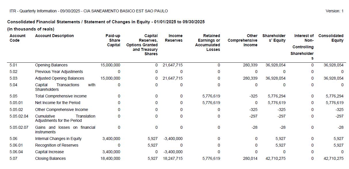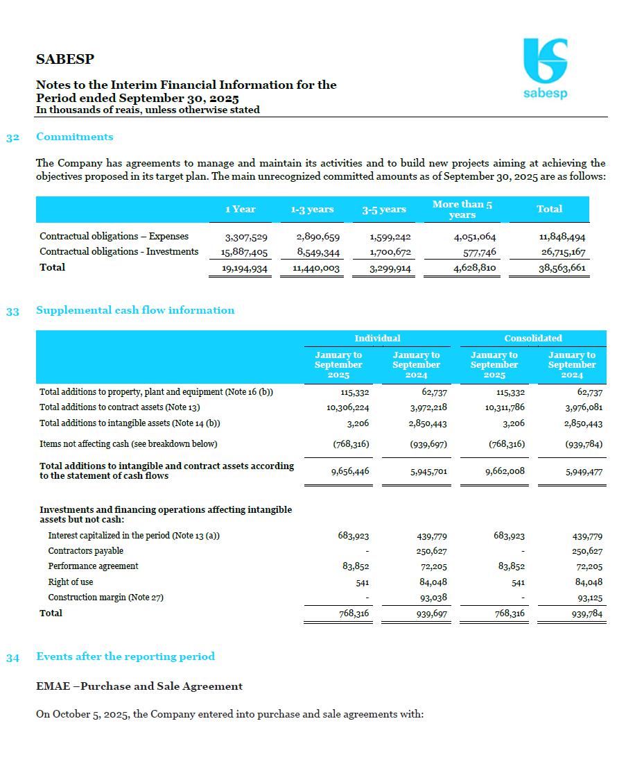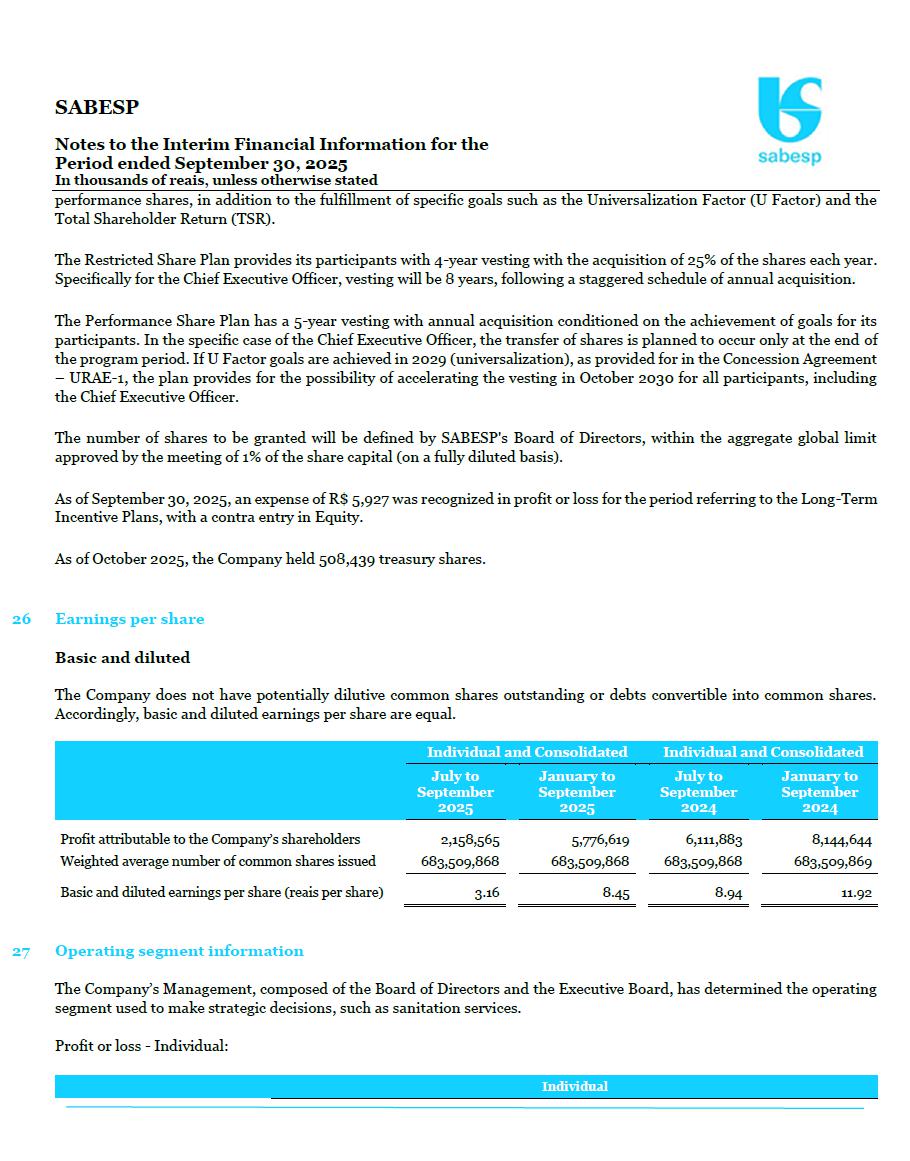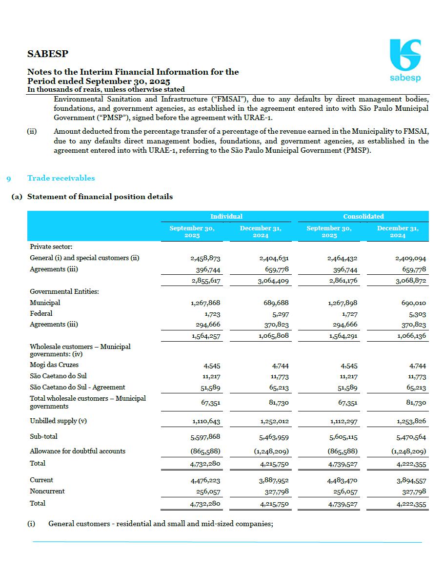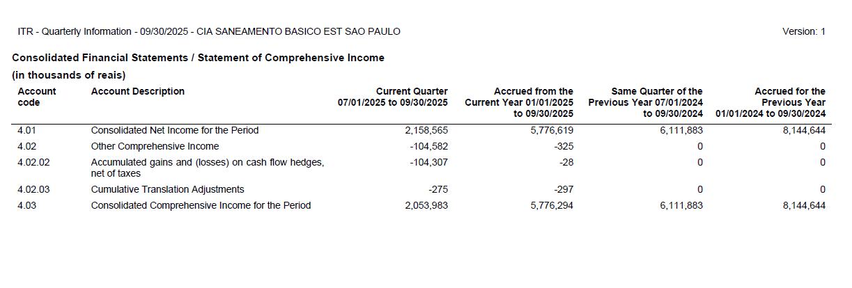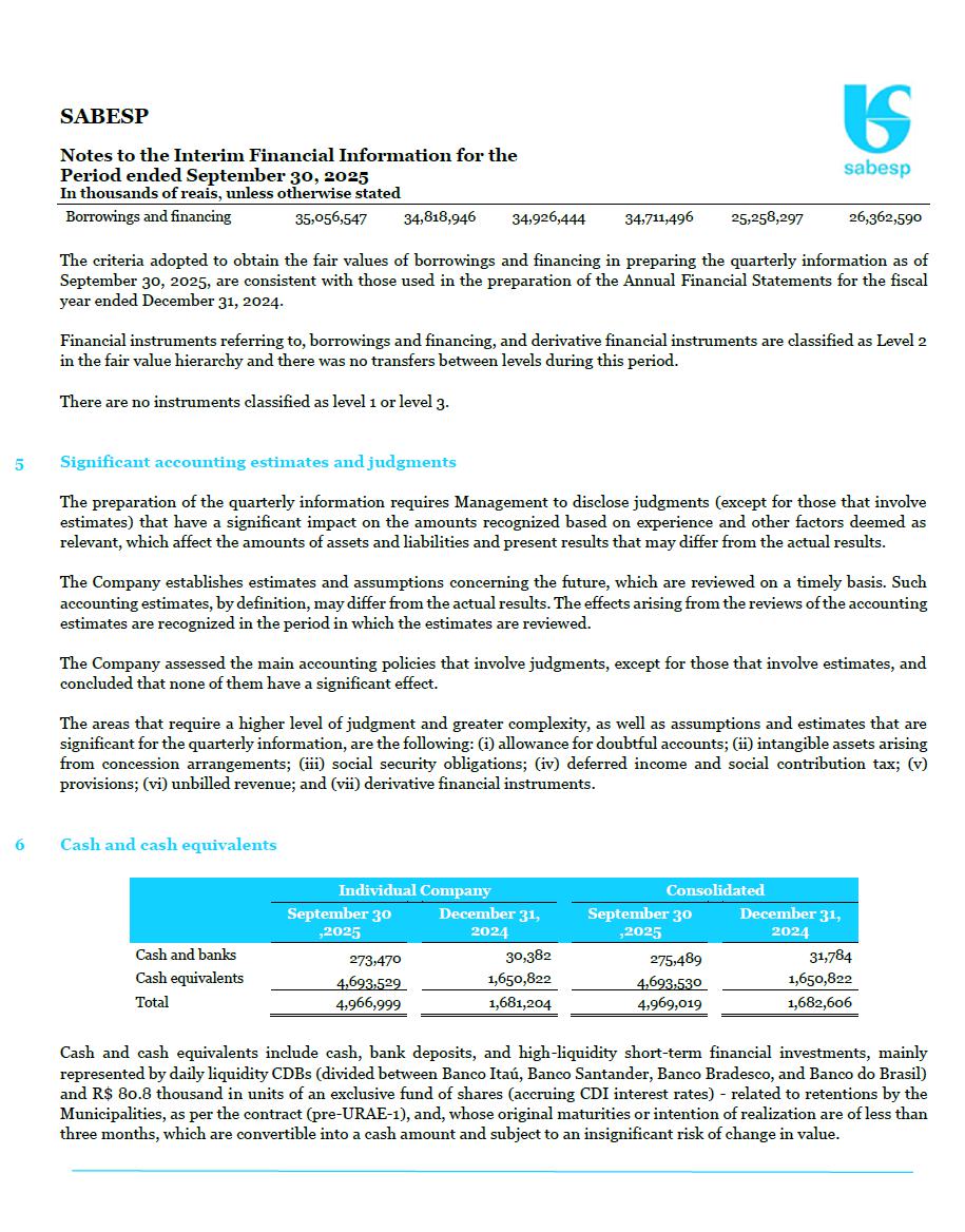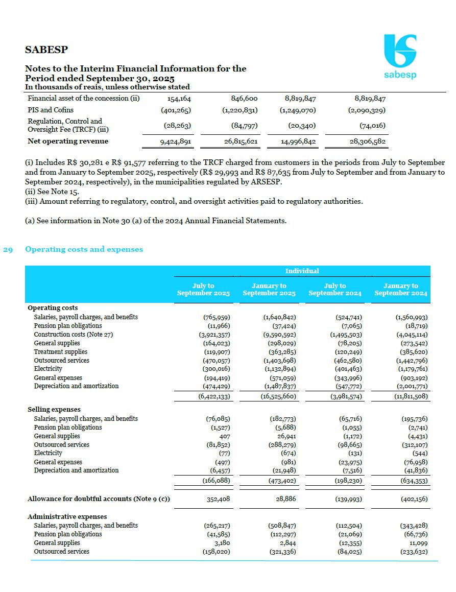 ITR - Quarterly Information - 09/30/2025 - CIA SANEAMENTO BASICO EST SAO PAULO Version: 1 Table of Contents Company Information Capital Breakdown 1 Individual Financial Statements Statement of Financial Position - Assets 2 Statement of Financial Position - Liabilities 3 Statement of Profit or Loss 4 Statement of Comprehensive Income 5 Statement of Cash Flows (Indirect Method) 6 Statement of Changes in Equity Statement of Changes in Equity - 01/01/2025 to 09/30/2025 8 Statement of Changes in Equity - 01/01/2024 to 09/30/2024 9 Statement of Value Added 10 Consolidated Financial Statements Statement of Financial Position - Assets 11 Statement of Financial Position - Liabilities 12 Statement of Profit or Loss 13 Statement of Comprehensive Income 14 Statement of Cash Flows (Indirect Method) 15 Statement of Changes in Equity Statement of Changes in Equity - 01/01/2025 to 09/30/2025 17 Statement of Changes in Equity - 01/01/2024 to 09/30/2024 18 Statement of Value Added 19 Comments on the Company’s Performance 20 Notes to the Quarterly Information 28 Reports and Statements Unqualified Report on the Special Review 94 Executive Officer’s Statement on the Financial Statements 95 Executive Officer’s Statement on the Report of Independent Registered Public Accounting Firm 96 ITR - Quarterly Information - 09/30/2025 - CIA SANEAMENTO BASICO EST SAO PAULO Version: 1 Company Information / Capital Breakdown Number of Shares Current Quarter (Units) 09/30/2025 Paid-up Capital Common 683,509,868 Preferred 1 Total 683,509,869 Treasury Shares Common 0 Preferred 0 Total 0 ITR - Quarterly Information - 09/30/2025 - CIA SANEAMENTO BASICO EST SAO PAULO Version: 1 Individual Financial Statements/ Statement of Financial Position – Assets (in thousands of reais) Account Code Account Description Current Quarter 09/30/2025 Previous Year 12/31/2024 1 Total Assets 95,982,957 80,978,272 1.01 Current Assets 17,019,835 10,598,757 1.01.01 Cash and Cash Equivalents 4,966,999 1,681,204 1.01.02 Financial Investments 6,668,814 3,694,029 1.01.03 Accounts Receivable 4,760,763 4,207,466 1.01.03.01 Trade Receivables 4,476,223 3,887,952 1.01.03.02 Other Receivables 284,540 319,514 1.01.03.02.01 Related-Party Balances 284,540 319,514 1.01.04 Inventories 28,536 10,524 1.01.06 Taxes Recoverable 425,741 800,797 1.01.08 Other Current Assets 168,982 204,737 1.01.08.03 Others 168,982 204,737 1.01.08.03.01 Restricted Cash 55,481 37,715 1.01.08.03.02 Derivative financial instruments 0 67,440 1.01.08.03.20 Other Assets 113,501 99,582 1.02 Non-Current Assets 78,963,122 70,379,515 1.02.01 Long-Term Assets 32,054,871 24,927,066 1.02.01.03 Financial Investments Valued at the Amortized Cost 0 769,057 1.02.01.04 Accounts Receivable 256,057 327,798 1.02.01.04.01 Trade Receivables 256,057 327,798 1.02.01.09 Receivables from Related Parties 882,029 908,875 1.02.01.10 Other Non-Current Assets 30,916,785 22,921,336 1.02.01.10.04 Escrow Deposits 130,781 139,222 1.02.01.10.05 Water and Basic Sanitation National Agency - ANA 2,157 1,993 1.02.01.10.06 Contract Assets 11,401,090 4,872,410 1.02.01.10.07 Financial Assets 19,348,193 17,601,626 1.02.01.10.20 Other Assets 34,564 306,085 1.02.02 Investments 413,974 262,433 1.02.02.01 Equity Interests 399,530 215,803 1.02.02.02 Investment properties 14,444 46,630 1.02.03 Property, plant, and equipment 668,987 561,548 1.02.04 Intangible assets 45,825,290 44,628,468 ITR - Quarterly Information - 09/30/2025 - CIA SANEAMENTO BASICO EST SAO PAULO Version: 1 Individual Financial Statements/ Statement of Financial Position - Liabilities (in thousands of reais) Account Code Account Description Current Quarter 09/30/2025 Previous Year 12/31/2024 2 Total Liabilities 95,982,957 80,978,272 2.01 Current Liabilities 14,434,328 11,968,321 2.01.01 Social and Labor obligations 1,120,534 1,286,193 2.01.02 Trade Payables 1,523,474 768,371 2.01.03 Tax Obligations 733,704 589,110 2.01.04 Borrowings and Financings 5,797,790 3,133,850 2.01.05 Other Obligations 3,927,261 4,644,613 2.01.05.02 Others 3,927,261 4,644,613 2.01.05.02.01 Dividends and Interest on Equity Payable 1,532 2,275,890 2.01.05.02.04 Services Payable 2,250,981 1,434,998 2.01.05.02.07 Public-Private Partnership - PPP 465,028 452,323 2.01.05.02.10 Performance Agreements 222,642 287,109 2.01.05.02.11 Deferred PIS/Cofins 74,117 0 2.01.05.02.12 Derivative financial instruments 714,842 0 2.01.05.02.20 Other Obligations 198,119 194,293 2.01.06 Provisions 1,331,565 1,546,184 2.02 Non-current Liabilities 38,838,354 32,081,897 2.02.01 Borrowings and Financings 29,258,757 22,124,447 2.02.02 Other Obligations 6,362,539 6,400,064 2.02.02.02 Others 6,362,539 6,400,064 2.02.02.02.04 Social Security Obligations 1,949,210 1,931,145 2.02.02.02.06 Public-Private Partnership - PPP 2,857,070 2,853,896 2.02.02.02.09 Deferred PIS/Cofins 1,117,146 1,117,804 2.02.02.02.10 Performance Agreements 100,608 137,441 2.02.02.02.20 Other Obligations 338,505 359,778 2.02.03 Deferred taxes 2,737,586 2,661,891 2.02.03.01 Deferred Income Tax and Social Contribution 2,737,586 2,661,891 2.02.04 Provisions 479,472 895,495 2.03 Equity 42,710,275 36,928,054 2.03.01 Paid-Up Capital 18,400,000 15,000,000 2.03.02 Capital Reserves 5,927 0 2.03.04 Profit Reserves 18,247,715 21,647,715 2.03.04.01 Legal Reserve 2,343,583 2,343,583 2.03.04.10 Investment Reserve 15,904,132 19,304,132 2.03.05 Retained Earnings/ Accumulated Losses 5,776,619 0 2.03.06 Equity Valuation Adjustments 280,014 280,339 ITR - Quarterly Information - 09/30/2025 - CIA SANEAMENTO BASICO EST SAO PAULO Version: 1 Individual Financial Statements/ Income Statement (in thousands of reais) Account Code Account Description Current Quarter 07/01/2025 to 09/30/2025 Accrued from the Current Year 01/01/2025 to 09/30/2025 Same Quarter of the Previous Year 07/01/2024 to 09/30/2024 Accrued for the Previous Year 01/01/2024 to 09/30/2024 3.01 Revenue from Sales and/or Services 9,413,305 26,784,086 14,986,700 28,278,265 3.02 Cost of Sales and/or Services -6,42